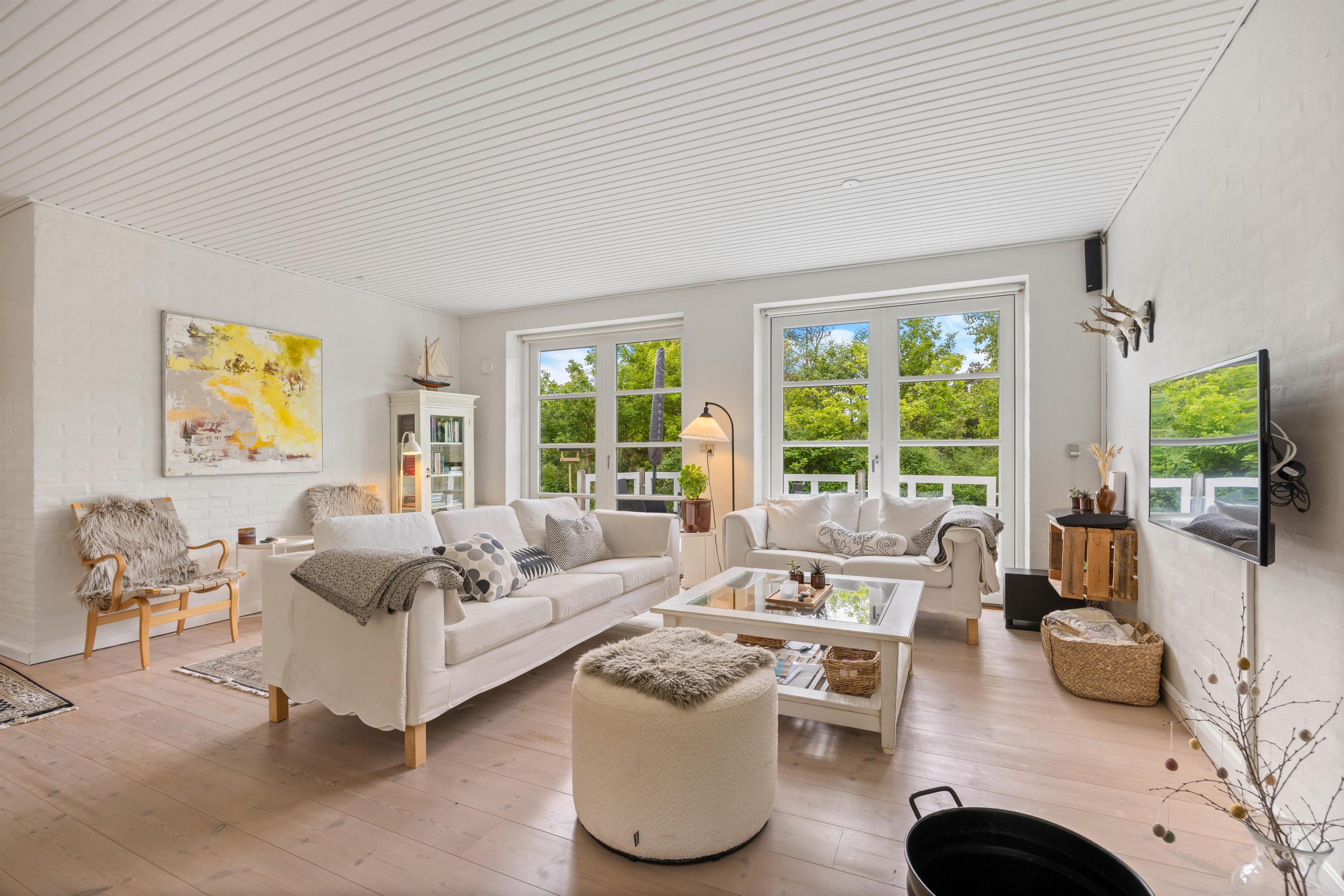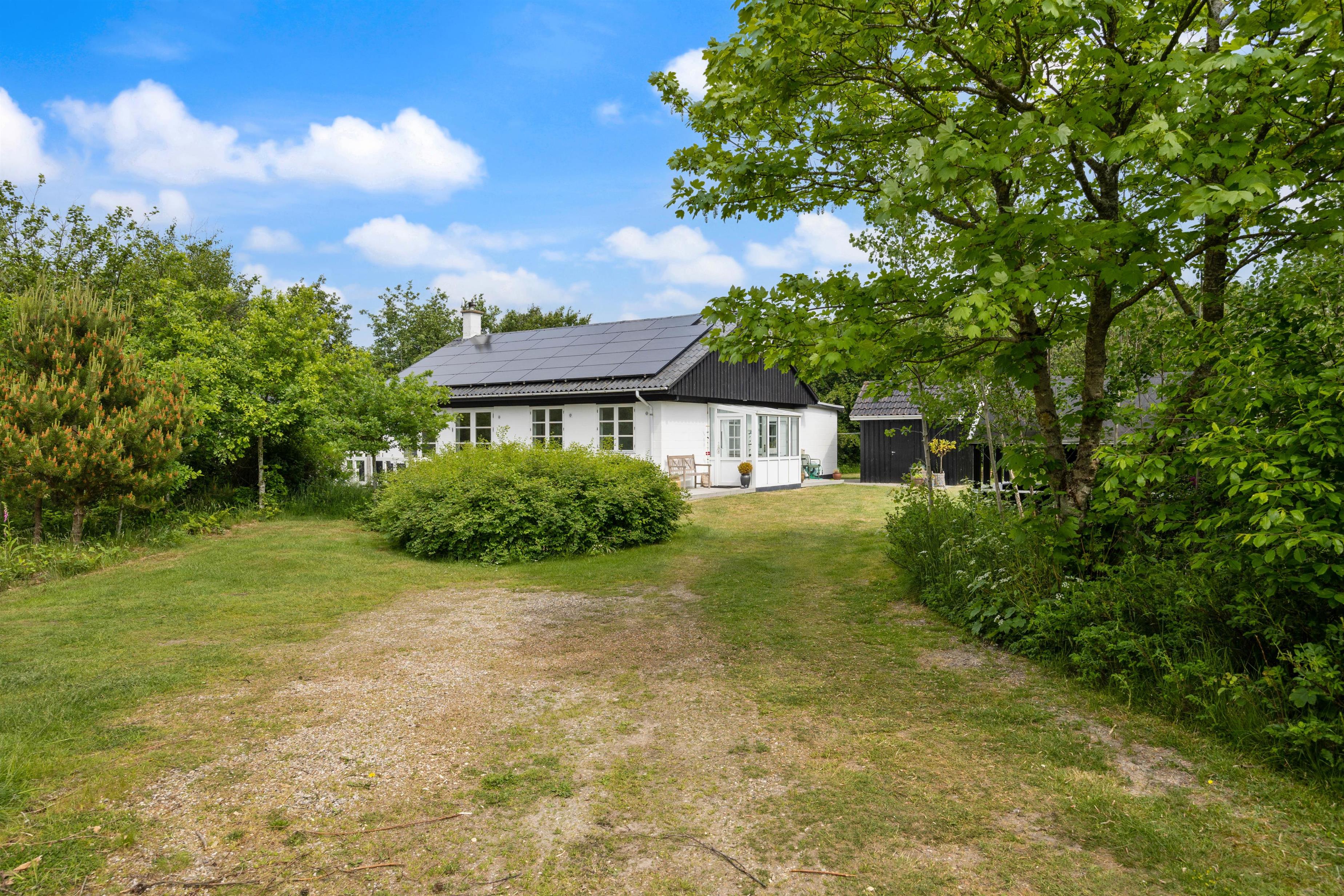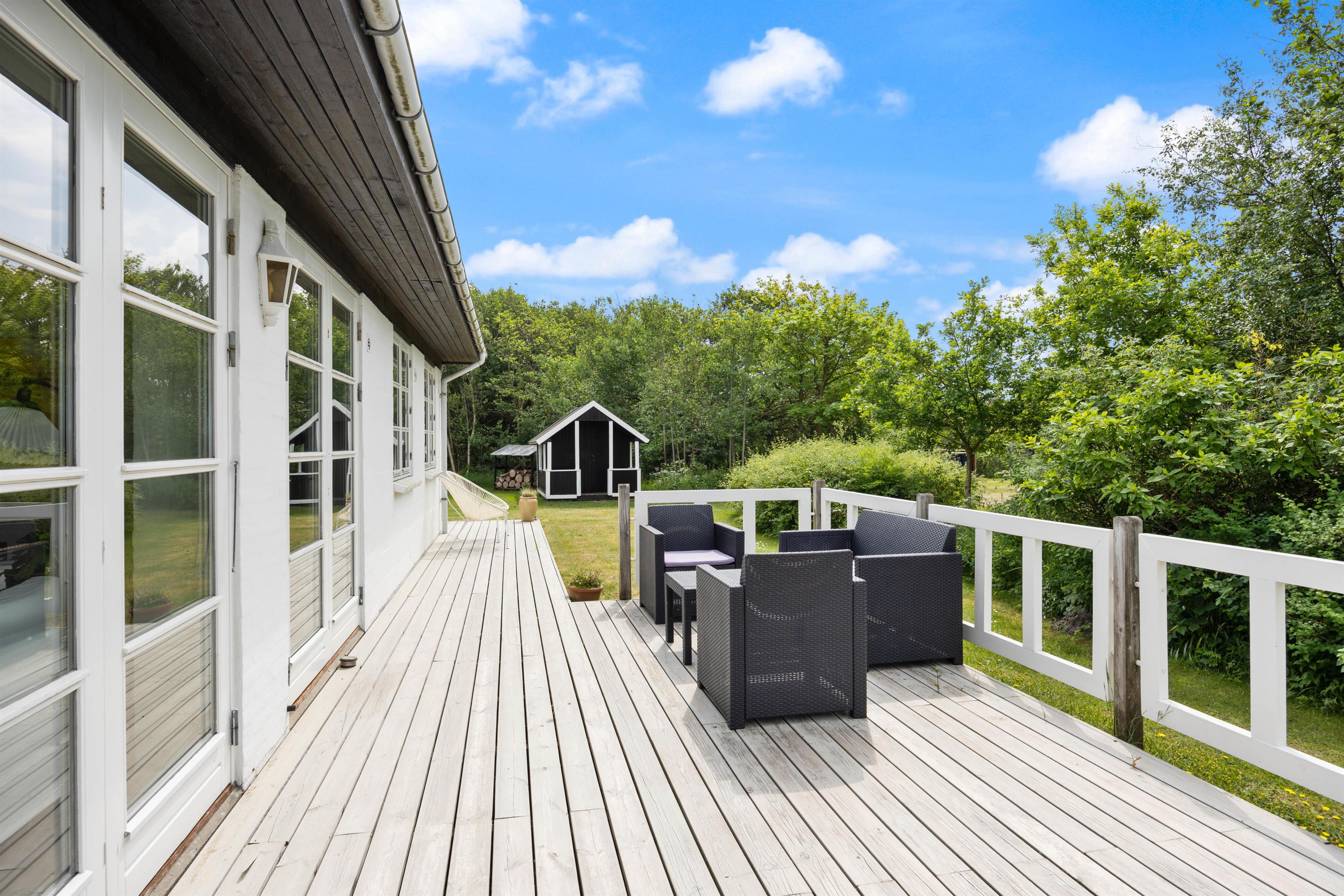 Det hvide sommerhus stråler i solens skær, mens de grønne træer i baggrunden omfavner grunden og strækker sig mod den blå himmel. Med fuglesang og bladenes rislen som det eneste, der bryder stilheden, er den fredfyldte sommerhusferie garanteret.