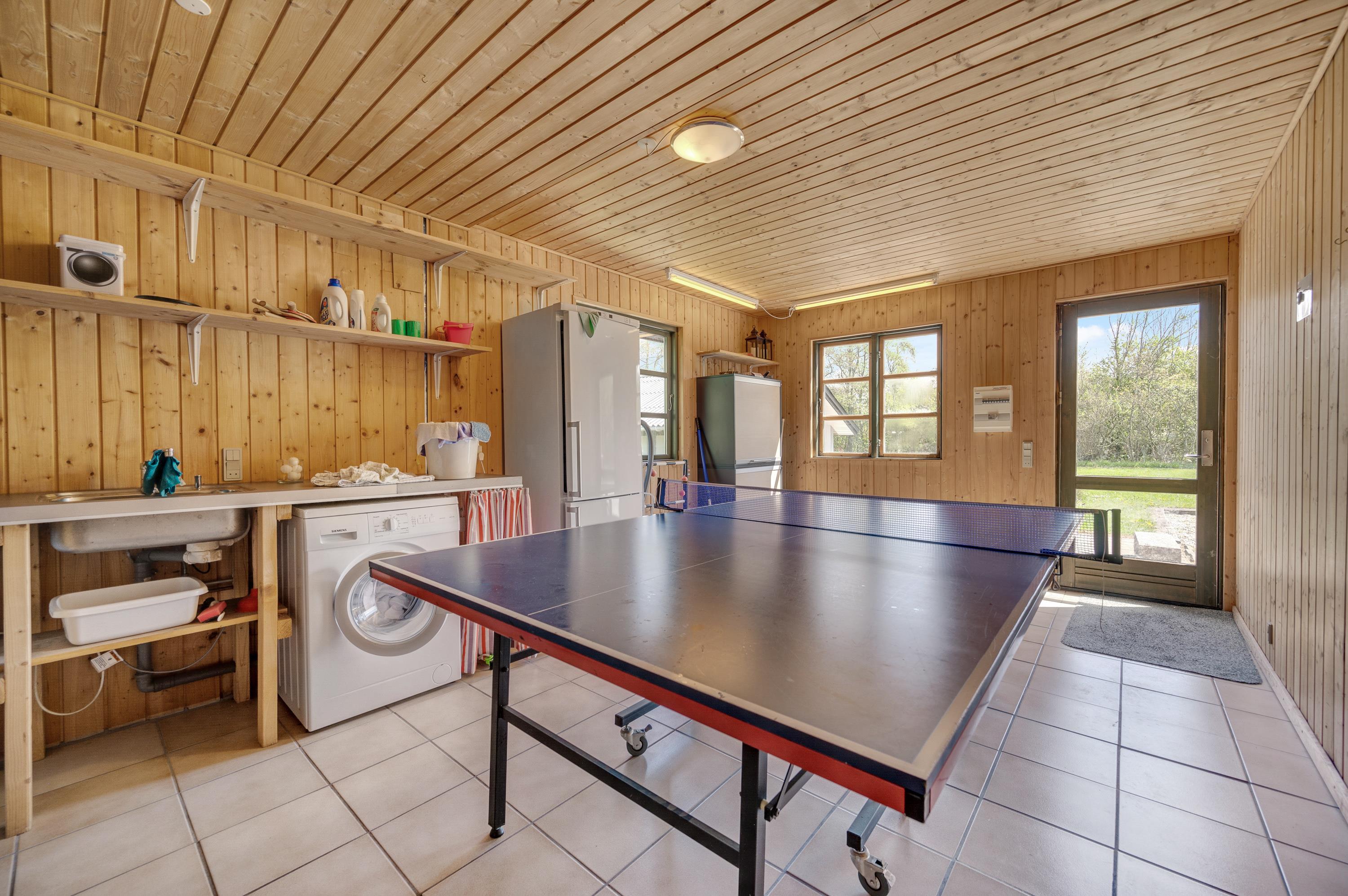 I sommerhusets garage er der tænkt praktisk og sjovt. Den er delt op i to funktionelle områder: I den ene del er der plads til parkering af bil og cykler, og i den anden finder I et aktivitetsrum med bordtennisbord, hvor I kan udfordre hinanden i underholdende kampe hele ferien igennem.