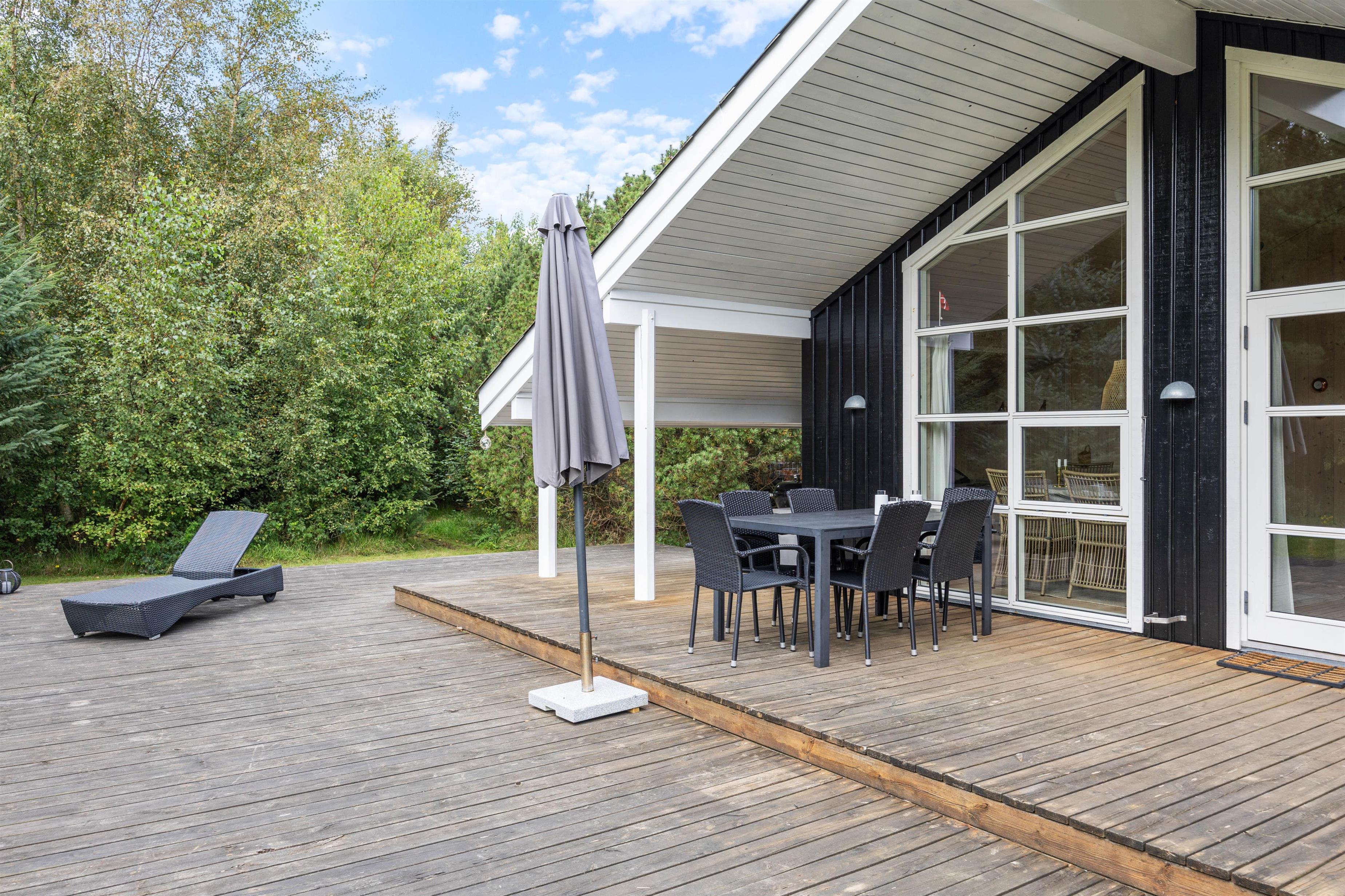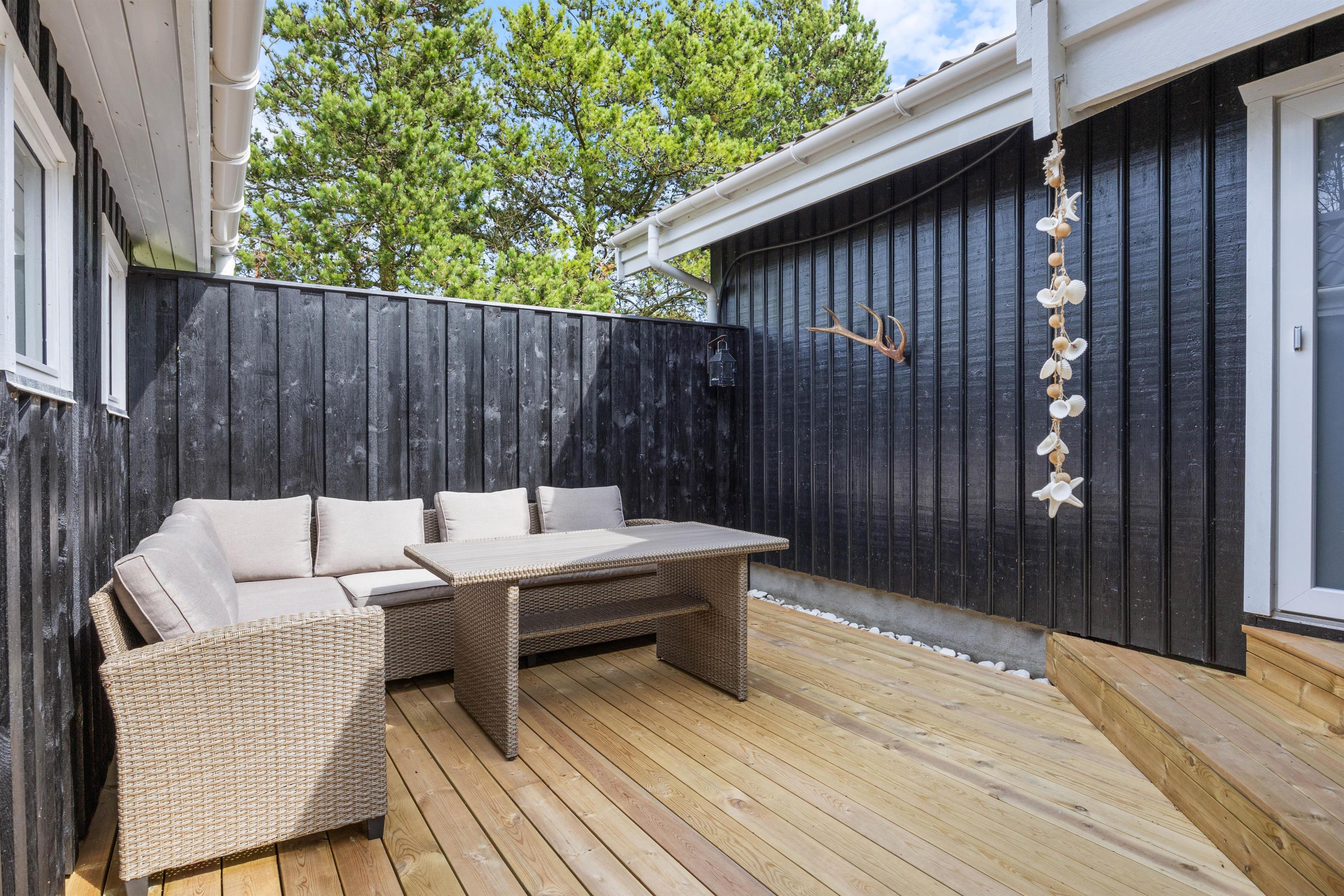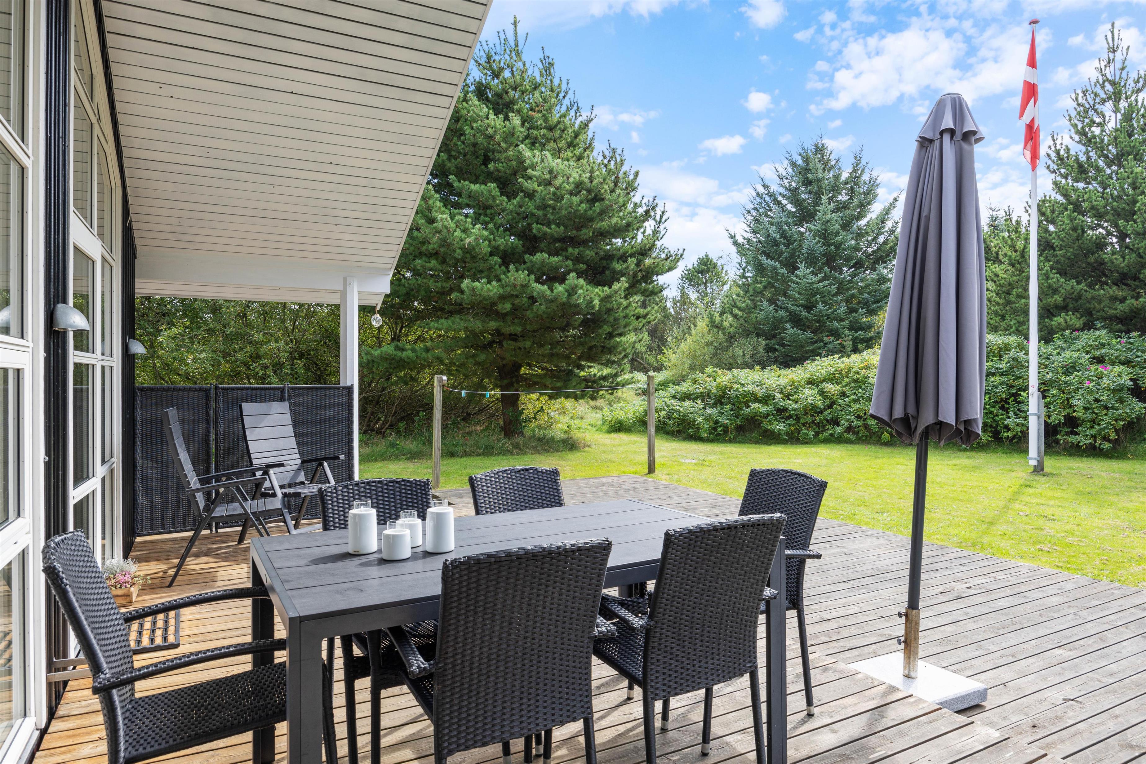 Omgivelserne på Klitrosevej er ideelle for familieferien. Her er der masser af udendørsrum, hvor både børn og voksne kan slå sig løs. Den dejlige naturgrund består af en stor, grøn plæne, der ligger belejligt omgivet af træer og buske. Det afskærmer grunden, så I føler det som om, I befinder jer i jeres eget lille ferieparadis.