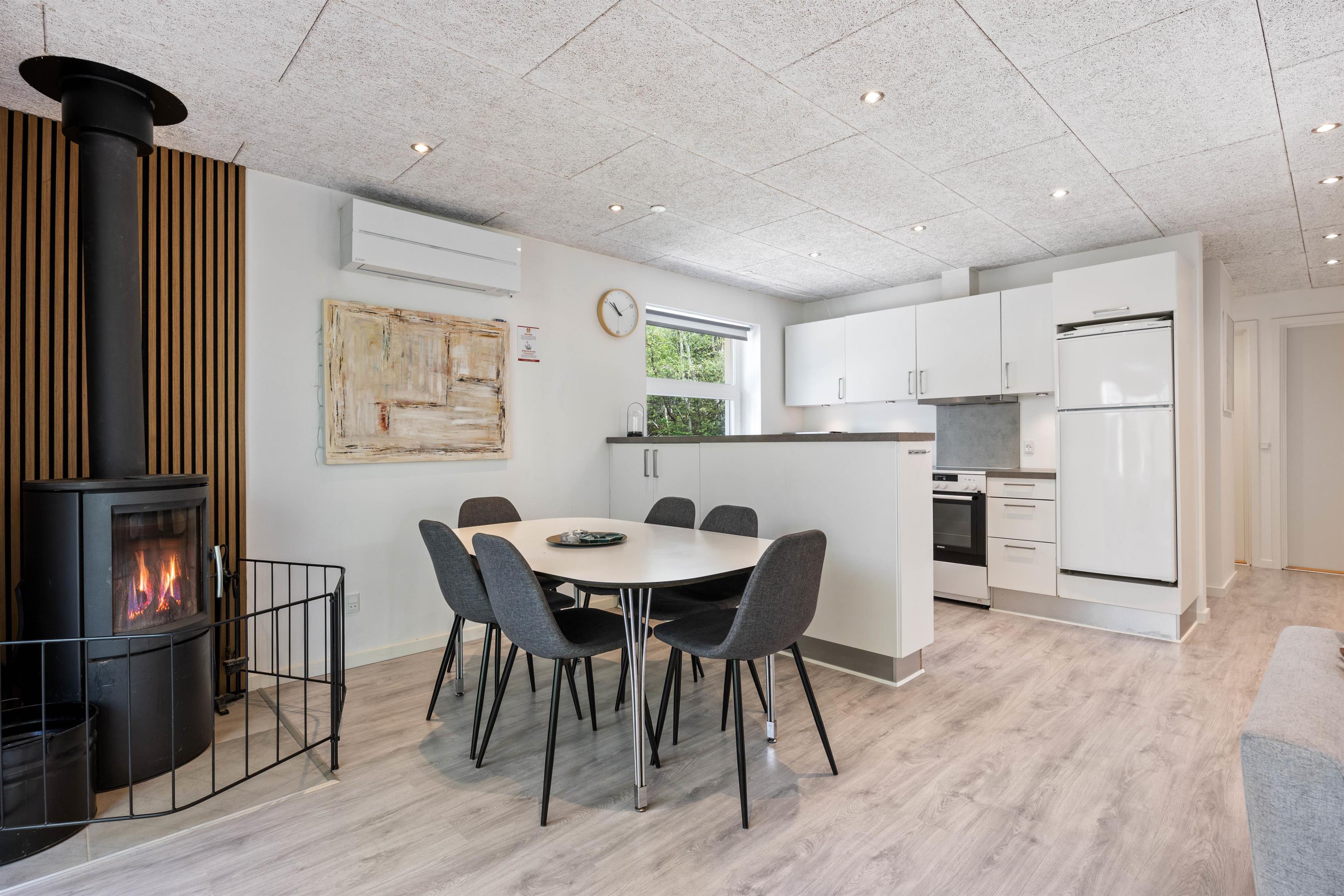 Når du træder ind i sommerhuset, vil du straks bemærke det lyse og moderne køkken, som er indrettet med stil. Det er en fryd at lave mad her, og det er et perfekt sted at samles omkring madlavningen. I stuen finder du en dejlig hyggekrog med brændeovne, der både sikrer varme og hygge på kølige aftener. Forestil dig at sidde foran flammerne og slappe af efter en dag med udendørs aktiviteter. Det er den perfekte atmosfære at skabe gode minder i.
