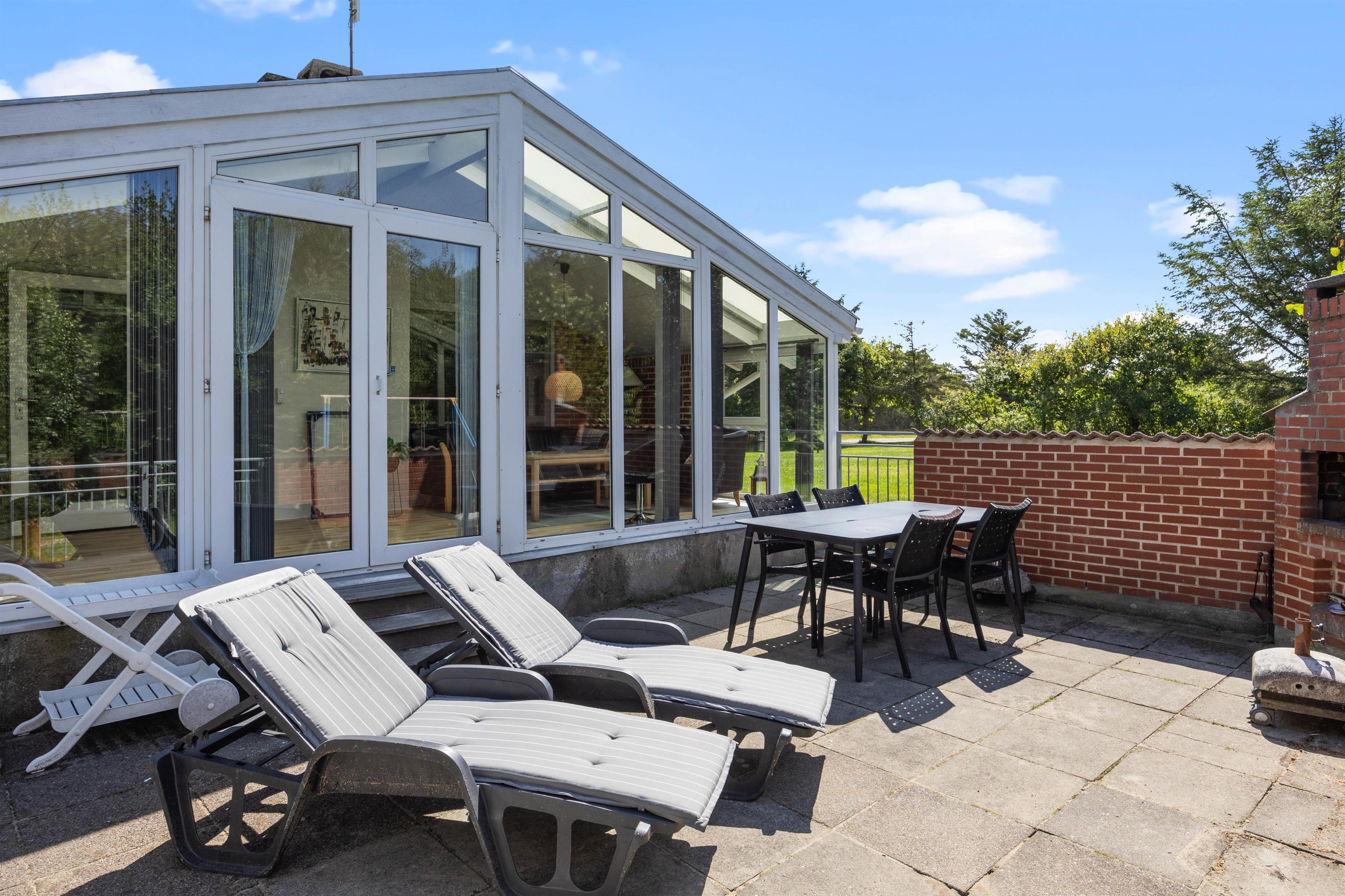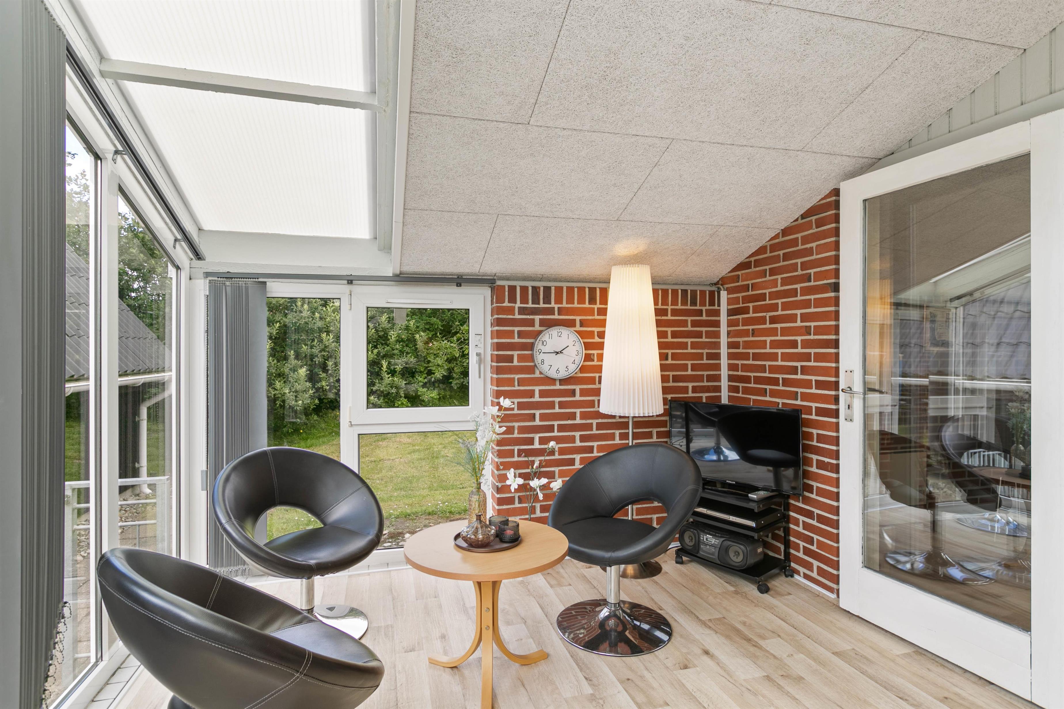 I feriehusets vestlige ende er der tilbygget en skøn udestue, så I året rundt kan nyde udsigten til den omkringliggende natur. På de grå og regnfulde dage findes der næppe noget hyggeligere end at sidde i udestuen med en friskbrygget kop kaffe, mens regnen trommer på ruden.