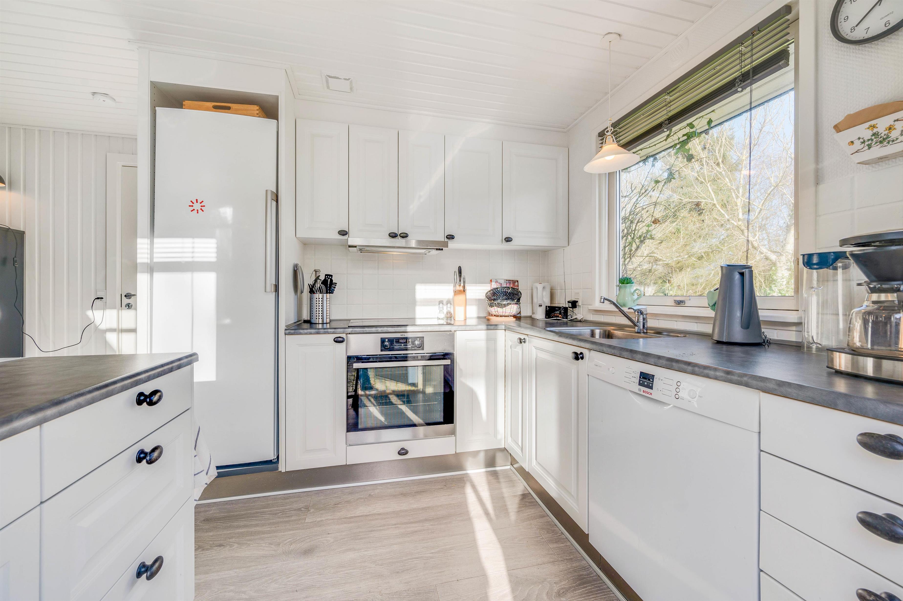 Feriehusets køkken og stue ligger i forlængelse af hinanden, og I har her mulighed for at være sammen om madlavningen eller samles om en god film i fjernsyet samtidig med, at I nyder varmen fra den knitrende brændeovn.