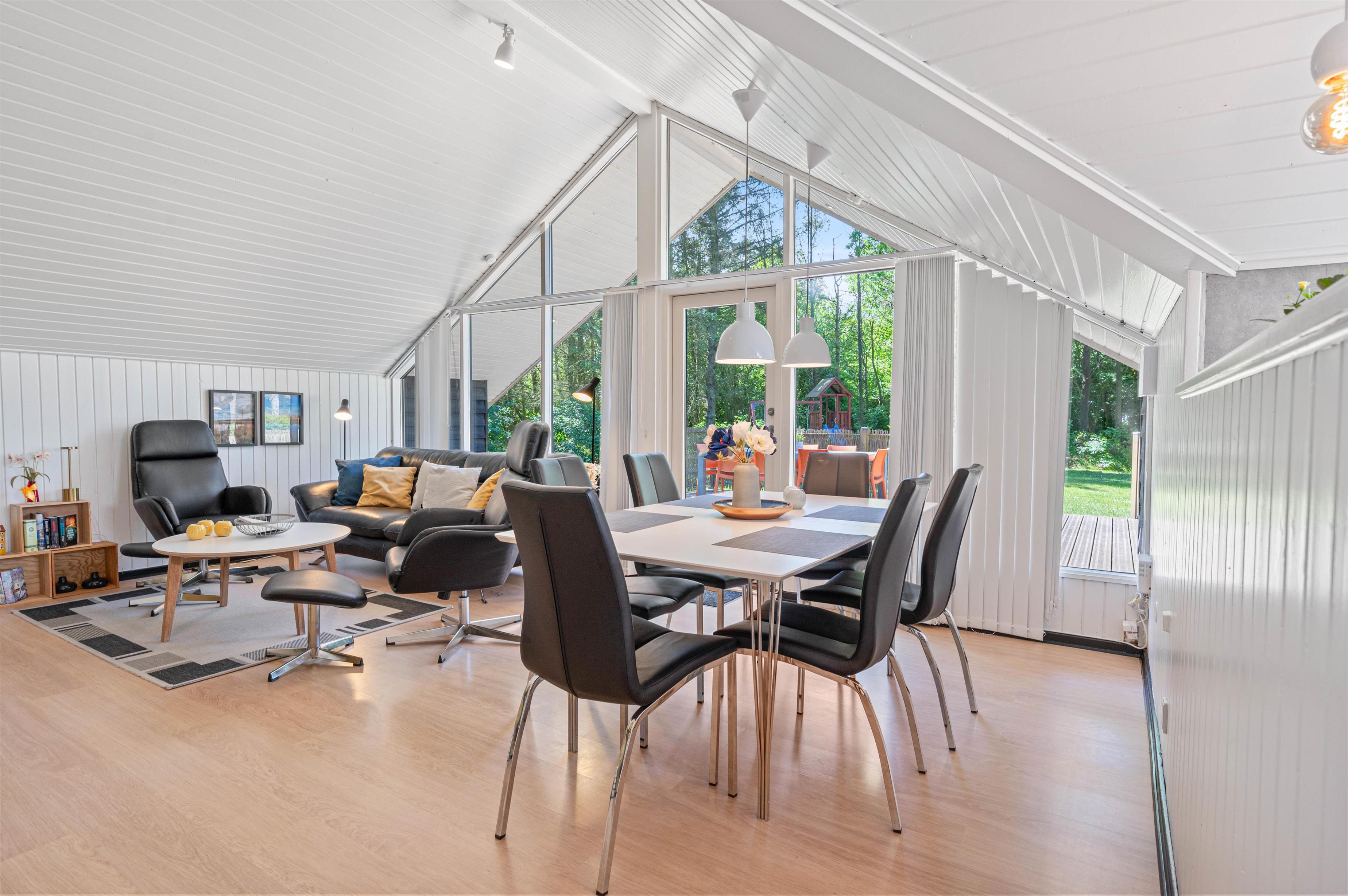 Den åbne opholdsstue har store panoramavinduer, hvor den dejlige udsigt til naturskønne omgivelser og solopgangen “kommer helt ind i sommerhuset”.