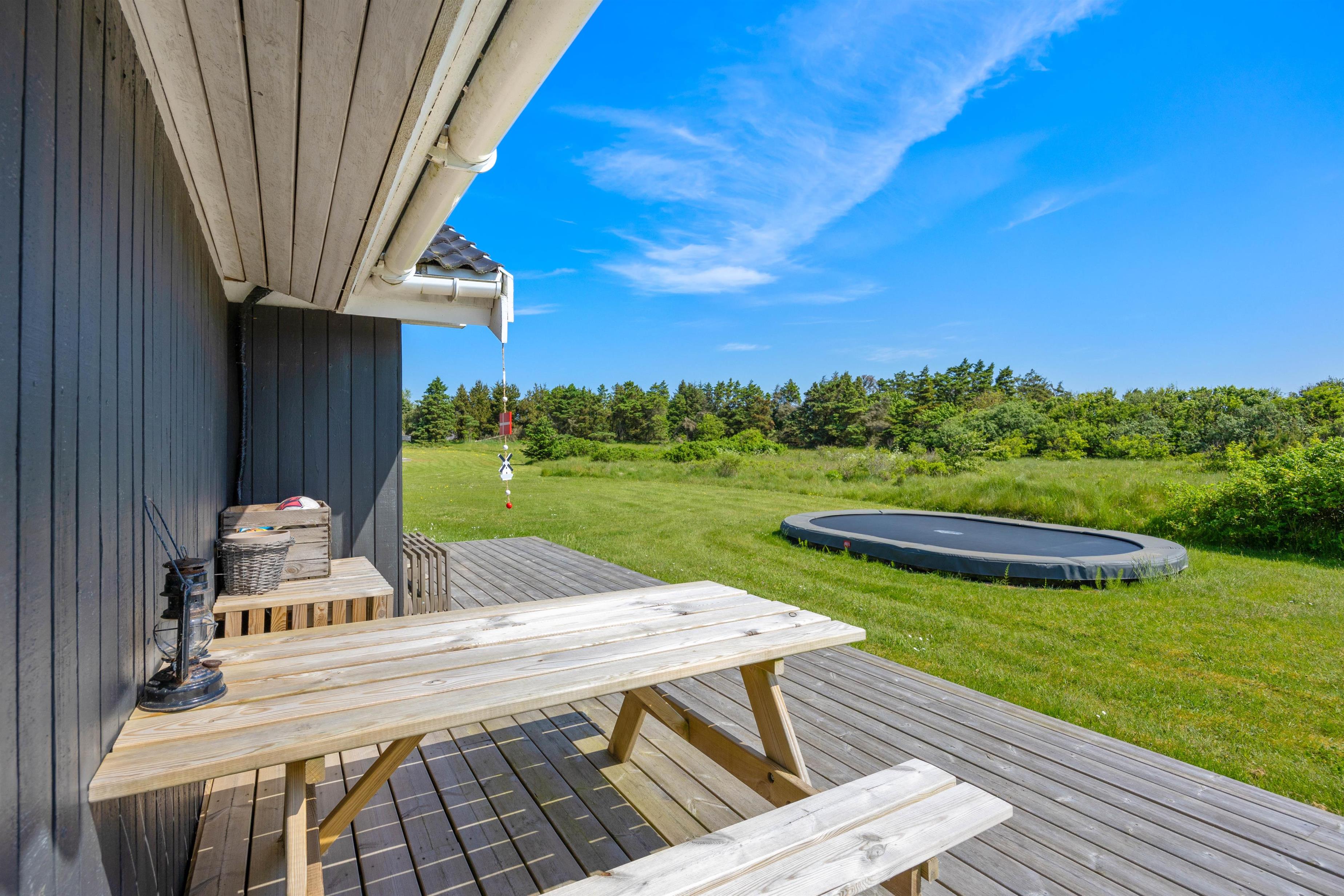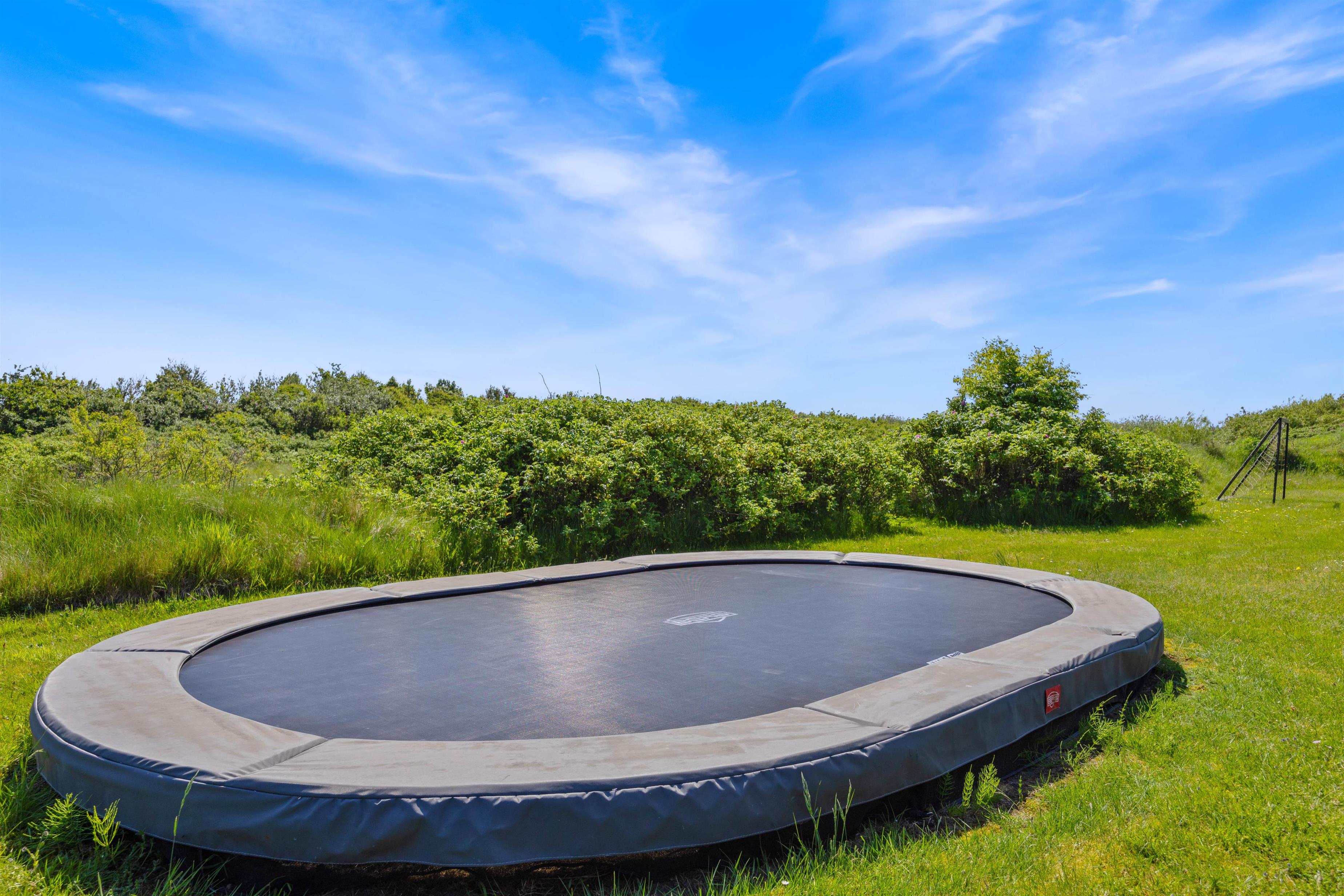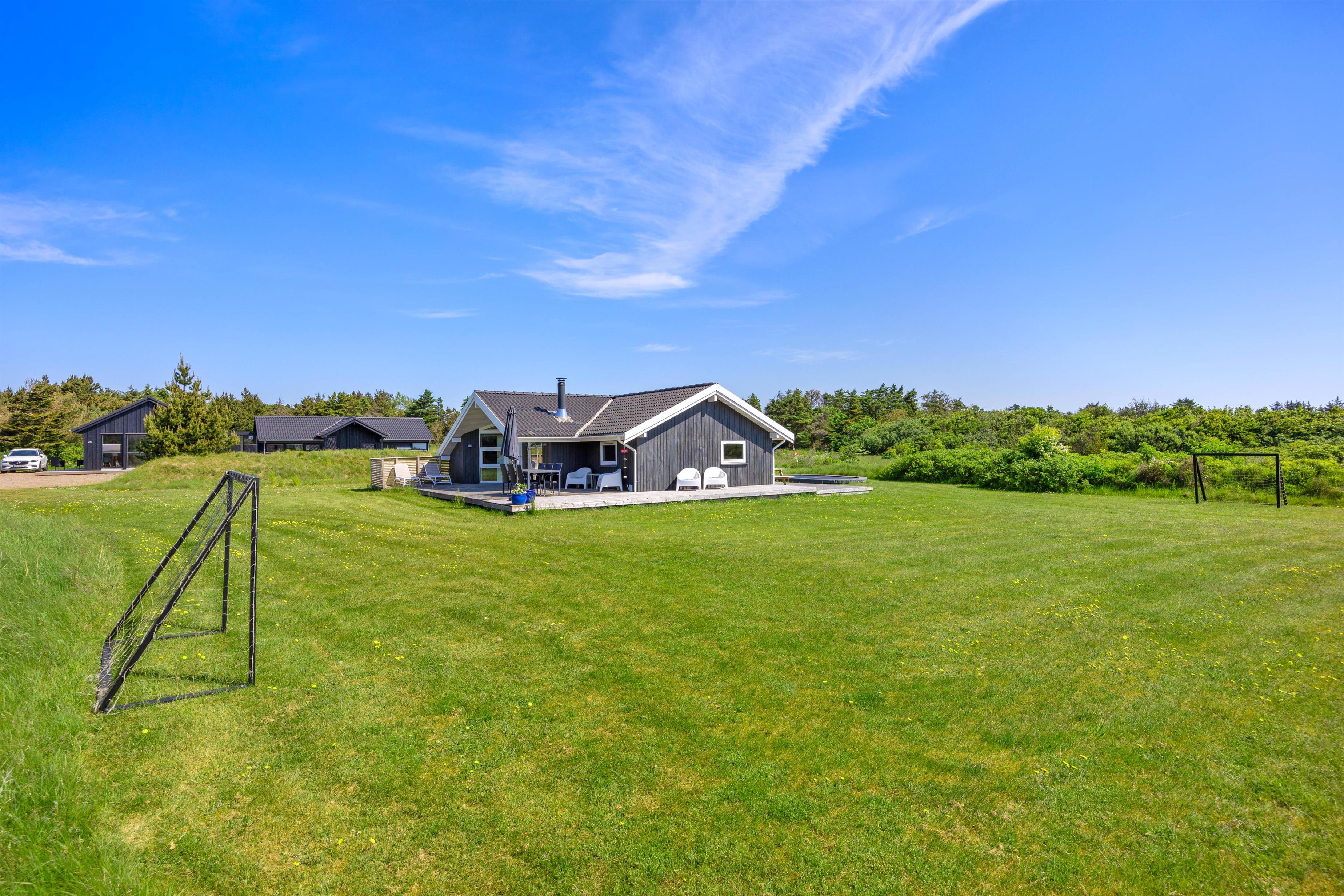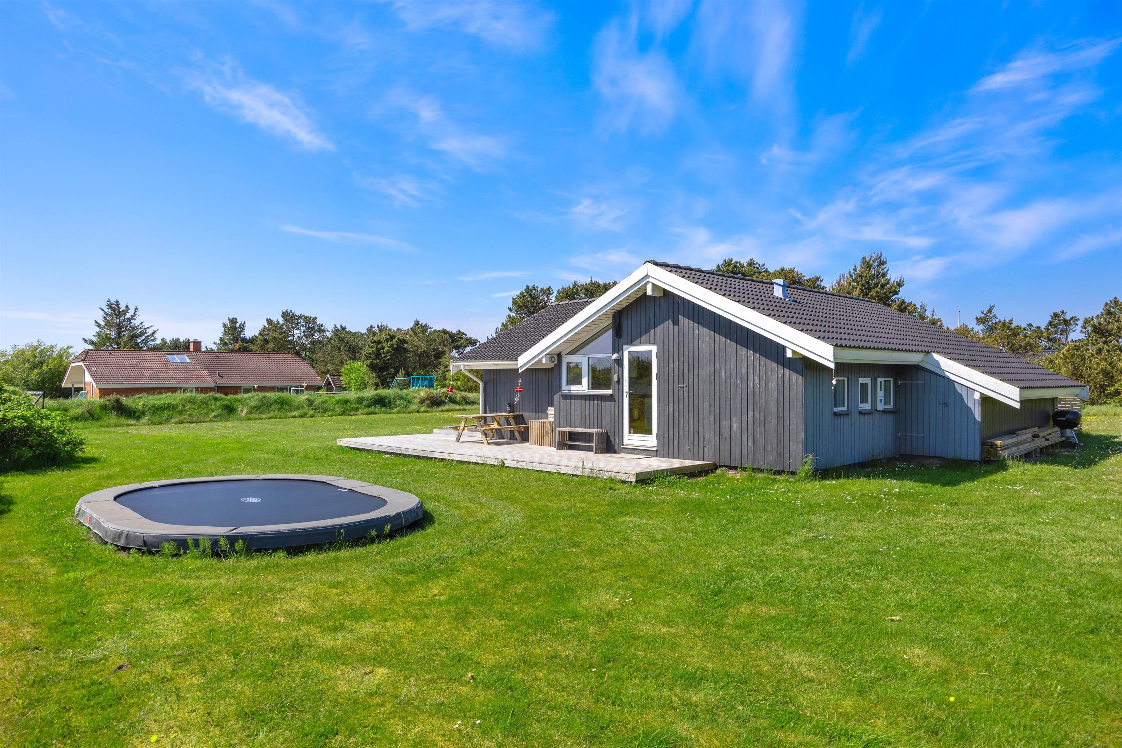Feriehuset på Sivsangervej 27 i Lodberg Hede ligger på en græsplæne og naturgrund på ca. 2347 m2 og giver derfor børn og hund masser af plads til at lege og løbe rundt på. Feriehusets terrasse er delvist overdækket, så alle kan finde deres yndlingsplads, og der er mulighed for at sidde i solen hele dagen. Mens I gør jer det behageligt på terrassen, kan børnene boltre sig på trampolinen eller benytte sig af fodboldmålene, og spille en kamp. Om aftenen kan I runde ferien af med en lækker grillaften, på husets terrasse.