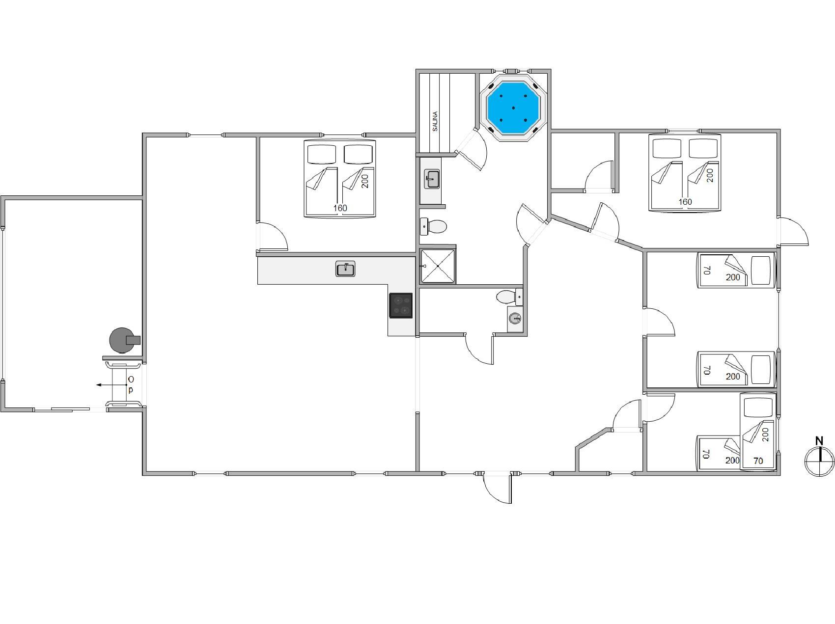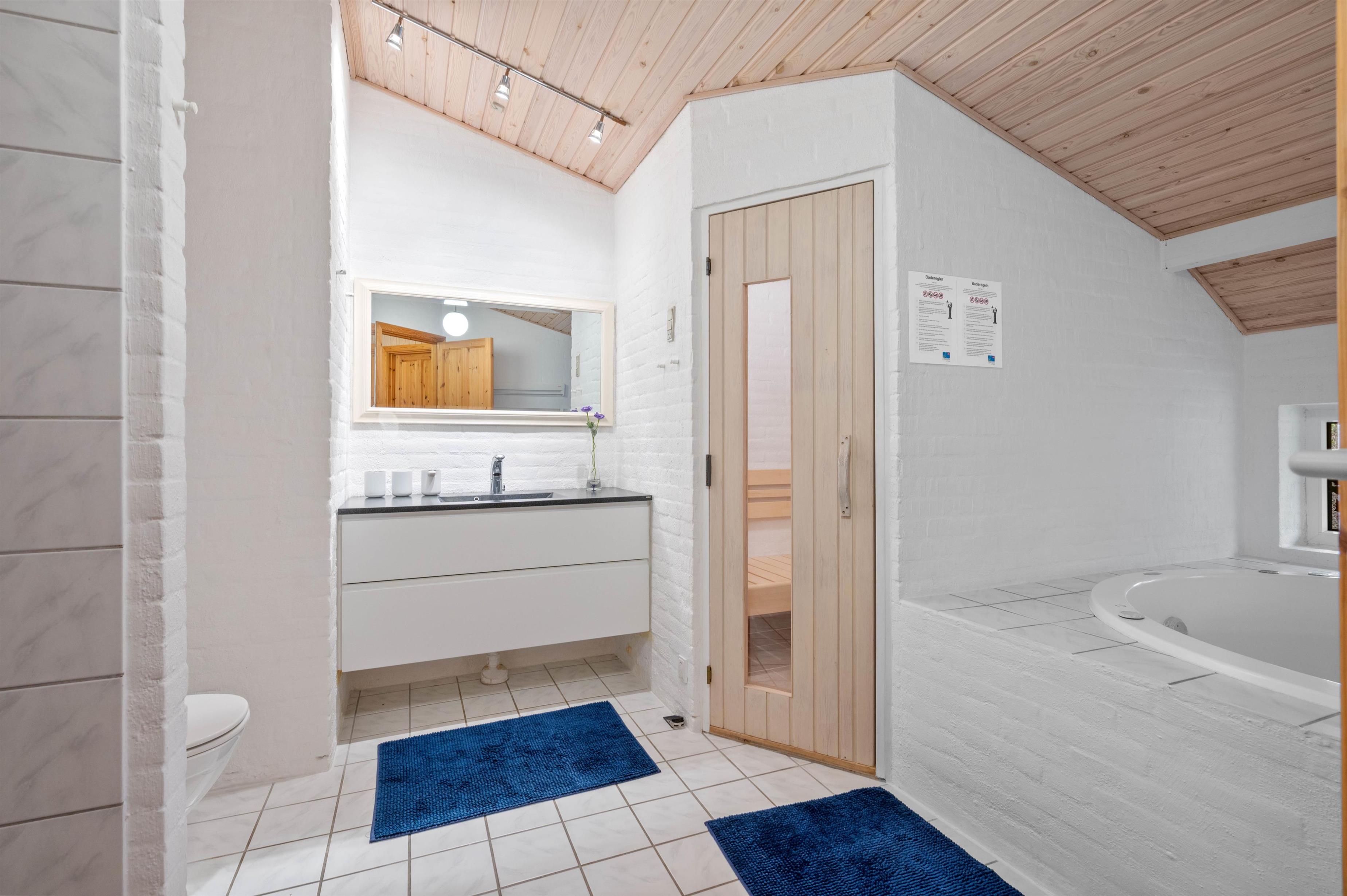 Huset råder over 4 værelser, hvoraf 2 er udstyret med dobbeltsenge, mens 2 er indrettet med enkeltsenge. I har derfor masser af plads at gøre godt med, når sengepladserne skal fordeles. Derudover finder I 1 mindre toilet med tørretumbler og vaskemaskine samt 1 stort badeværelse, hvor der ikke alene er bruseniche og gulvvarme, men også spabad og sauna.