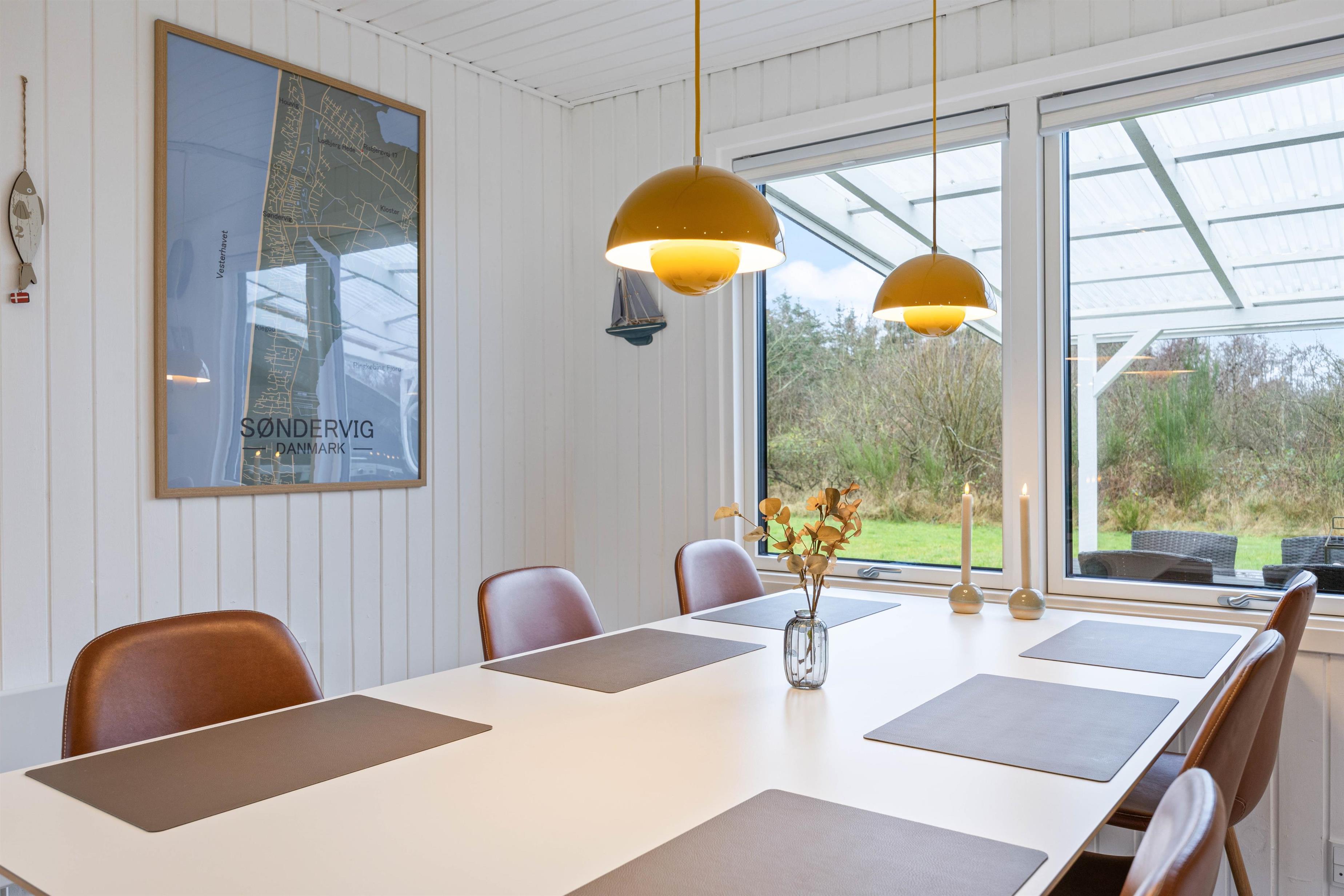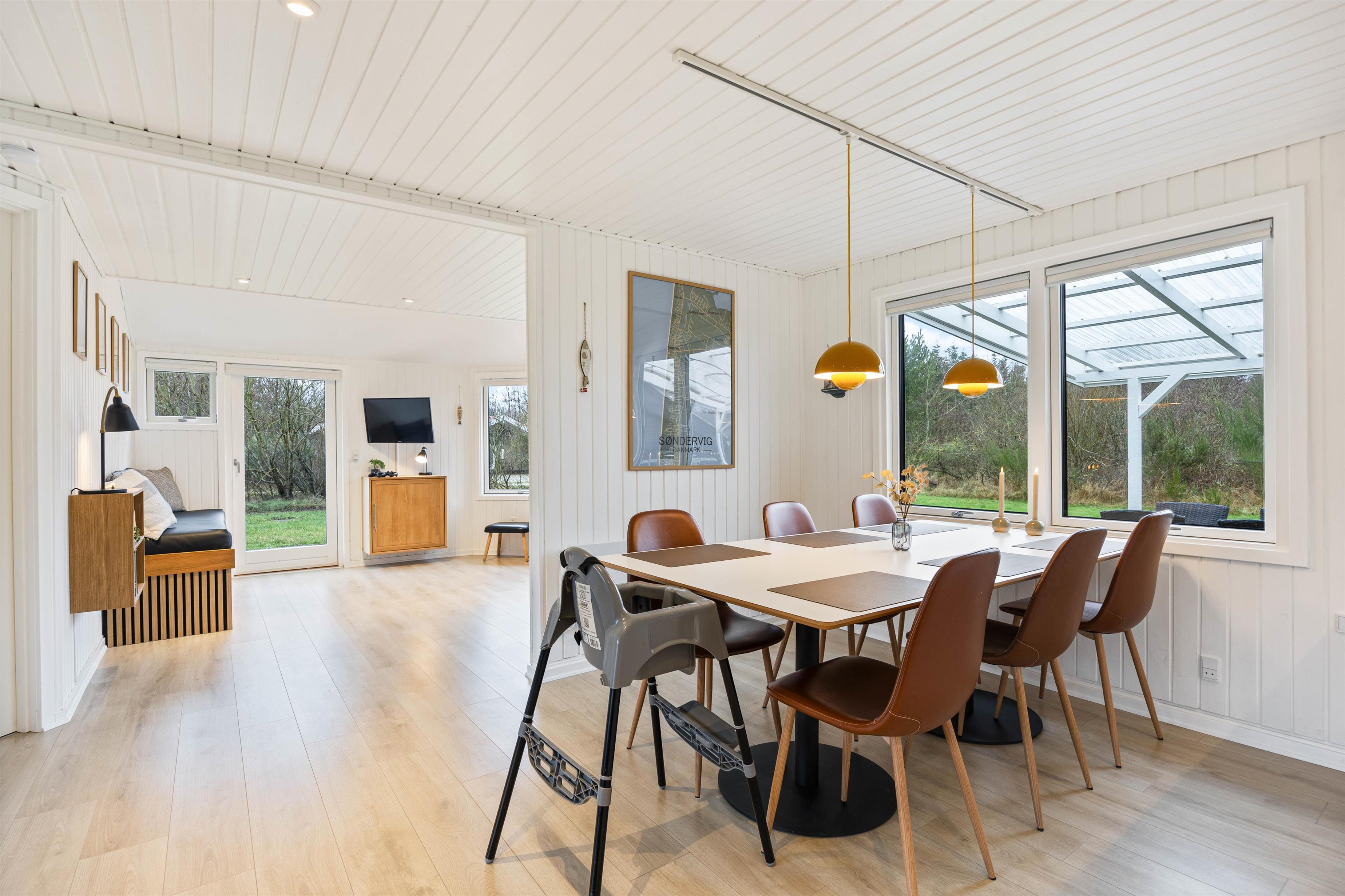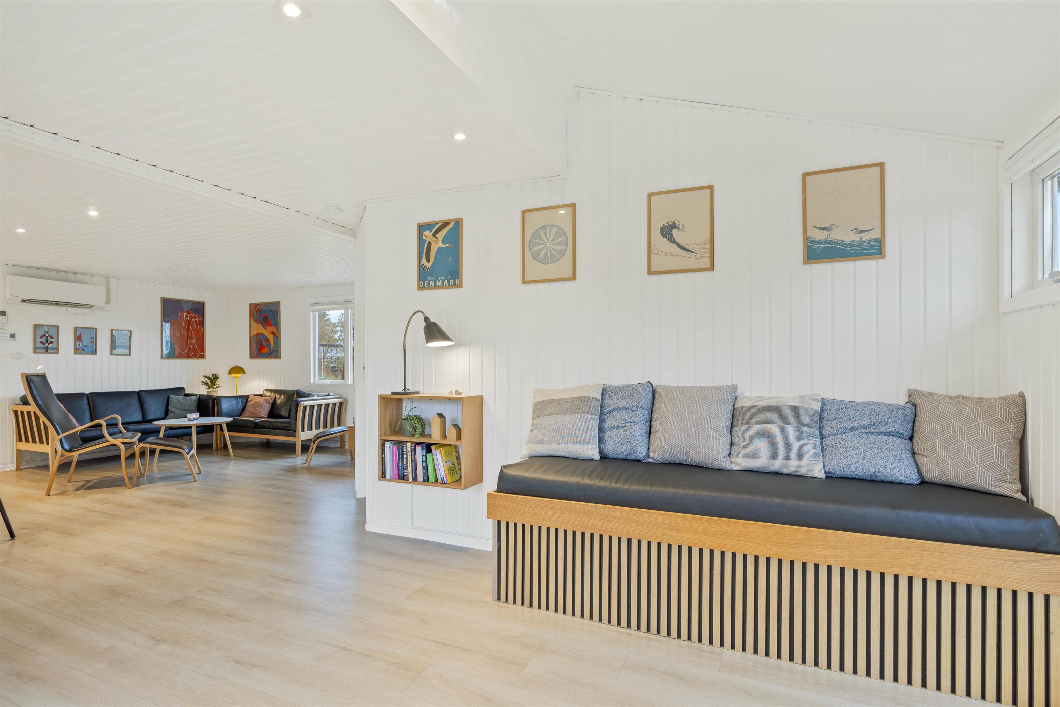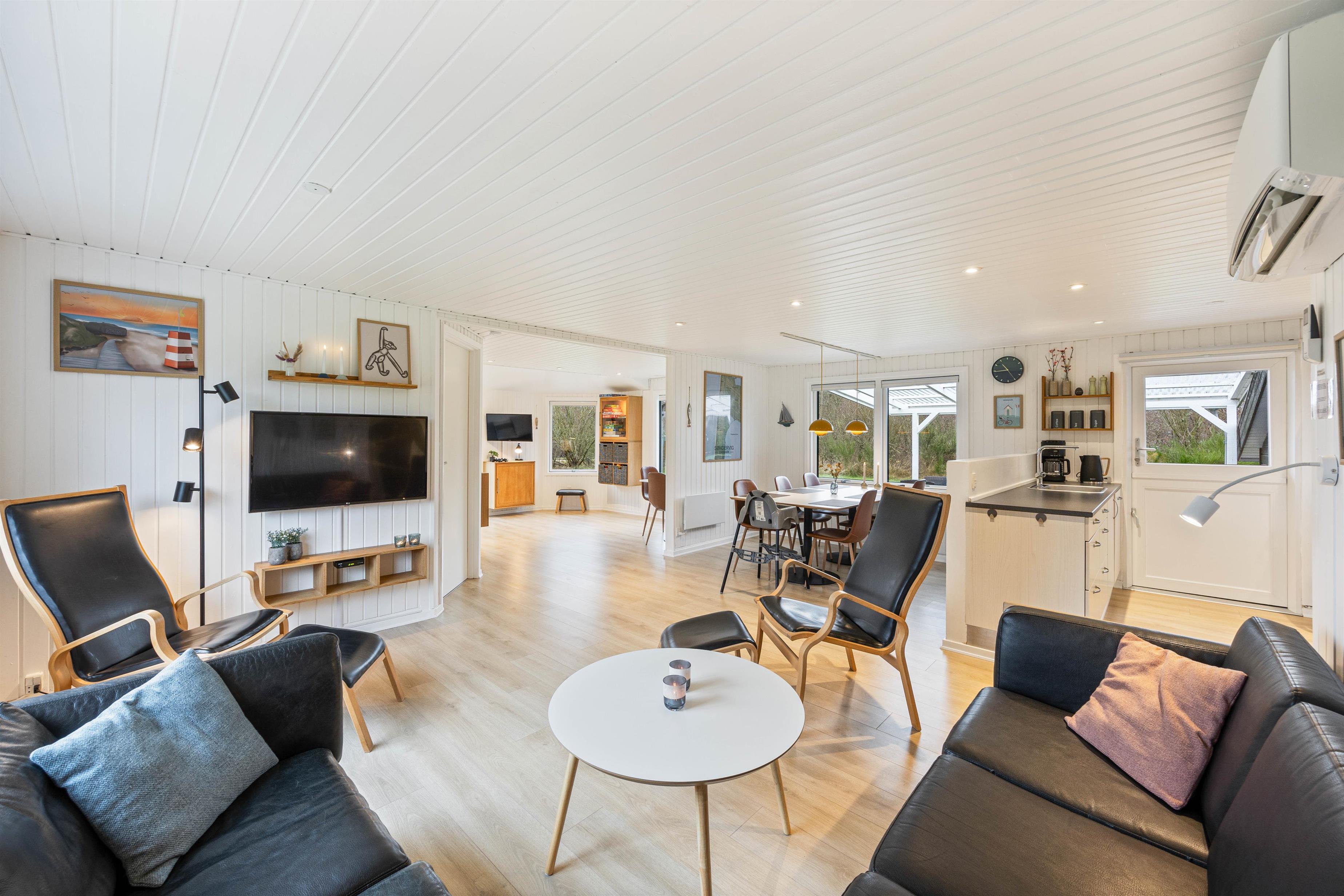 Indenfor på Risbjergvej 17 bliver I mødt af en dejlig lys og moderne indretning, hvor stuerne og køkken er i direkte åben forbindelse med køkkenet. Således kan alle følge med i madlavningen eller planlægningen af feriens kommende planer. Ferieboligen har alle de nødvendige moderne faciliteter der skal til for at lette opgaverne på ferien. Der er vaskemaskine til fri afbenyttelse, så I kan få vasket jeres tøj undervejs og opvaskemaskinen vil klare opvasken for jer, så I kan nyde ferien. Der er 2 fjernsyn i sommerhuset, det ene er uden tv-kanaler og kan eksempelvis kun bruges til Playstation 4 eller andre af jeres egne medbragte spillekonsoller.