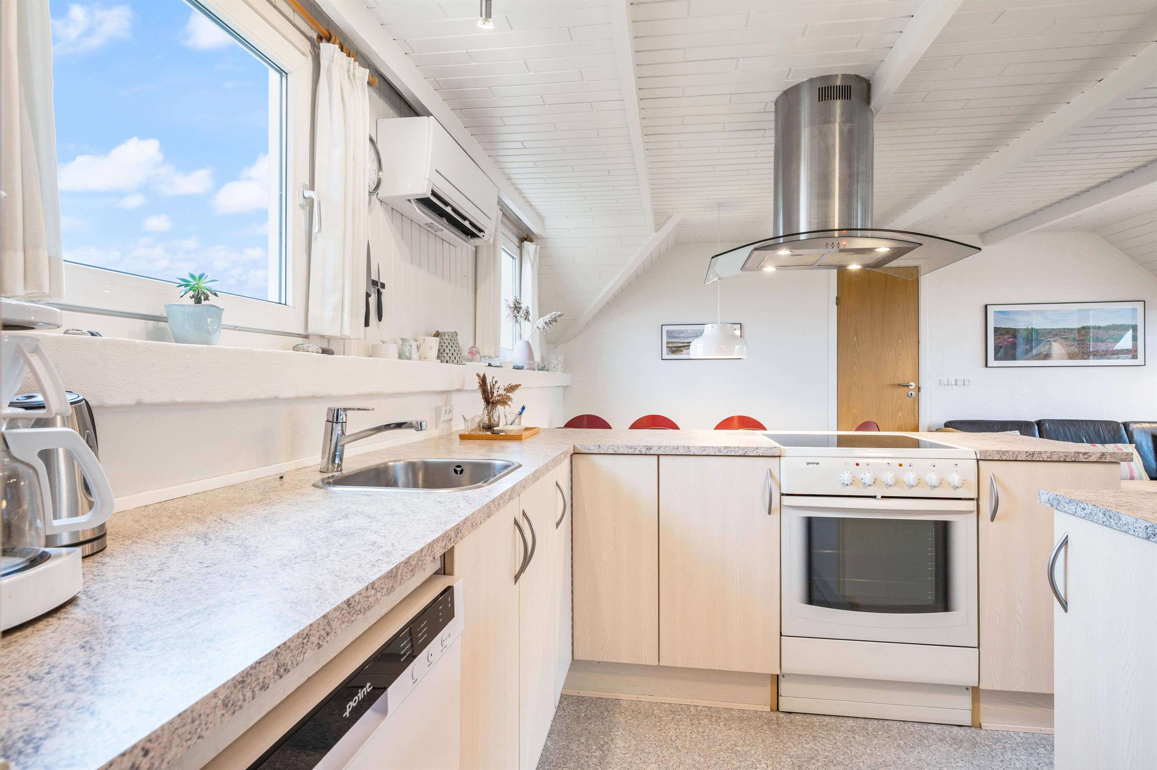 I vil opleve, at der er en dejlig, lys stemning i opholdsrummet, hvilket skyldes de store vinduespartier, der vender ud mod den flotte udsigt. Lyset vælder ind ad vinduerne, og jeres øjne vil uden tvivl blive trukket i retning mod horisonten. Her kan I betragte naturen helt tæt på og nyde synet af vindens dans med marehalmen, de farverige farveklatter af cerise i hybenbuskene og det smukke stedsegrønne, der omkranser grunden. Og vil I skrue endnu mere op for stemningen, smider I en kævle i brændeovnen og lytter til den hypnotiserende knitren fra knuderne.