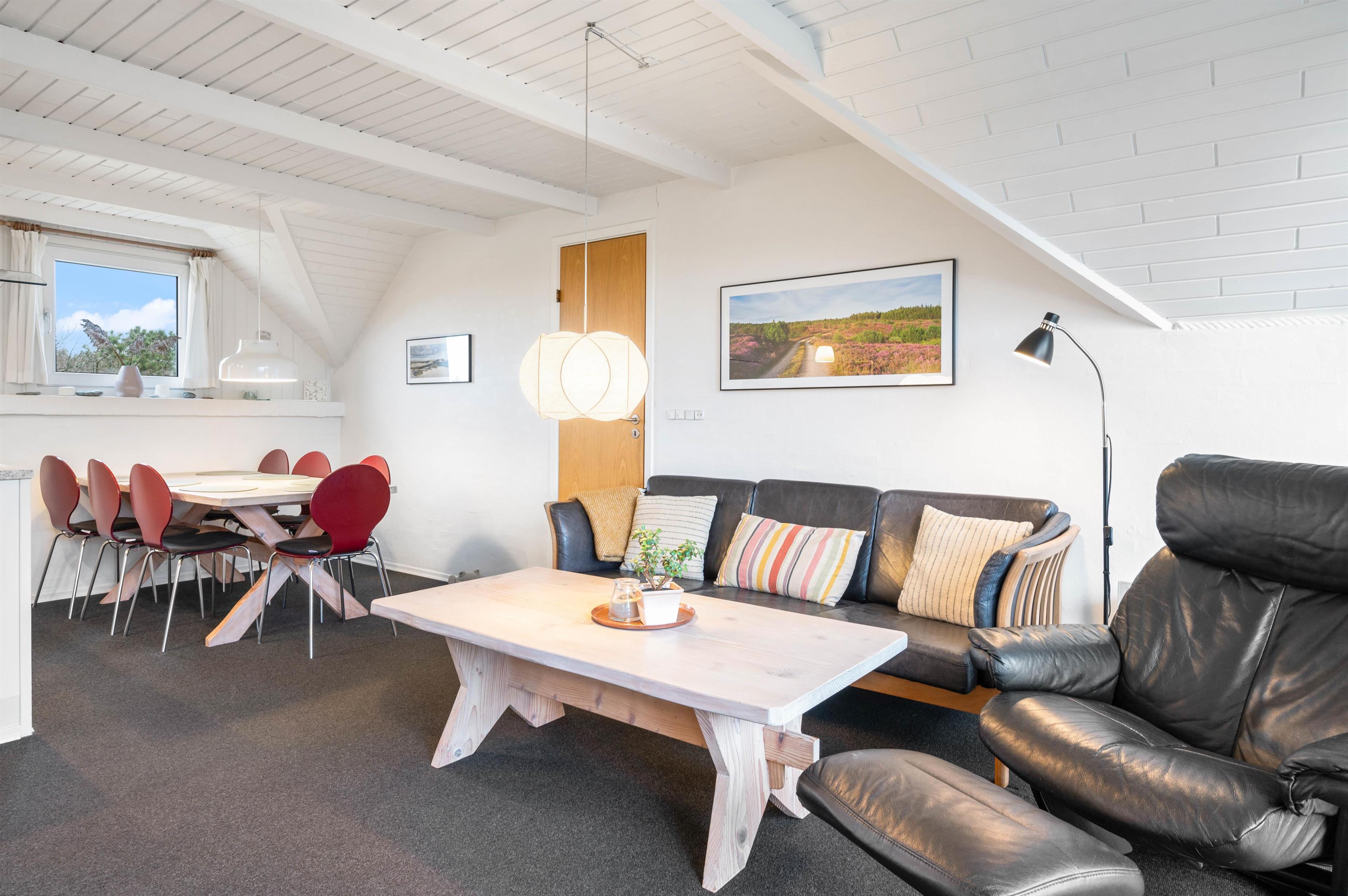 Det hyggelige opholdsrum er det naturlige midtpunkt i sommerhuset. Det er indrettet med både køkken, spisekrog og et behageligt sofaområde med lædermøbler, hvor I kan slå jer ned foran tv’et eller sidde med en god bog.