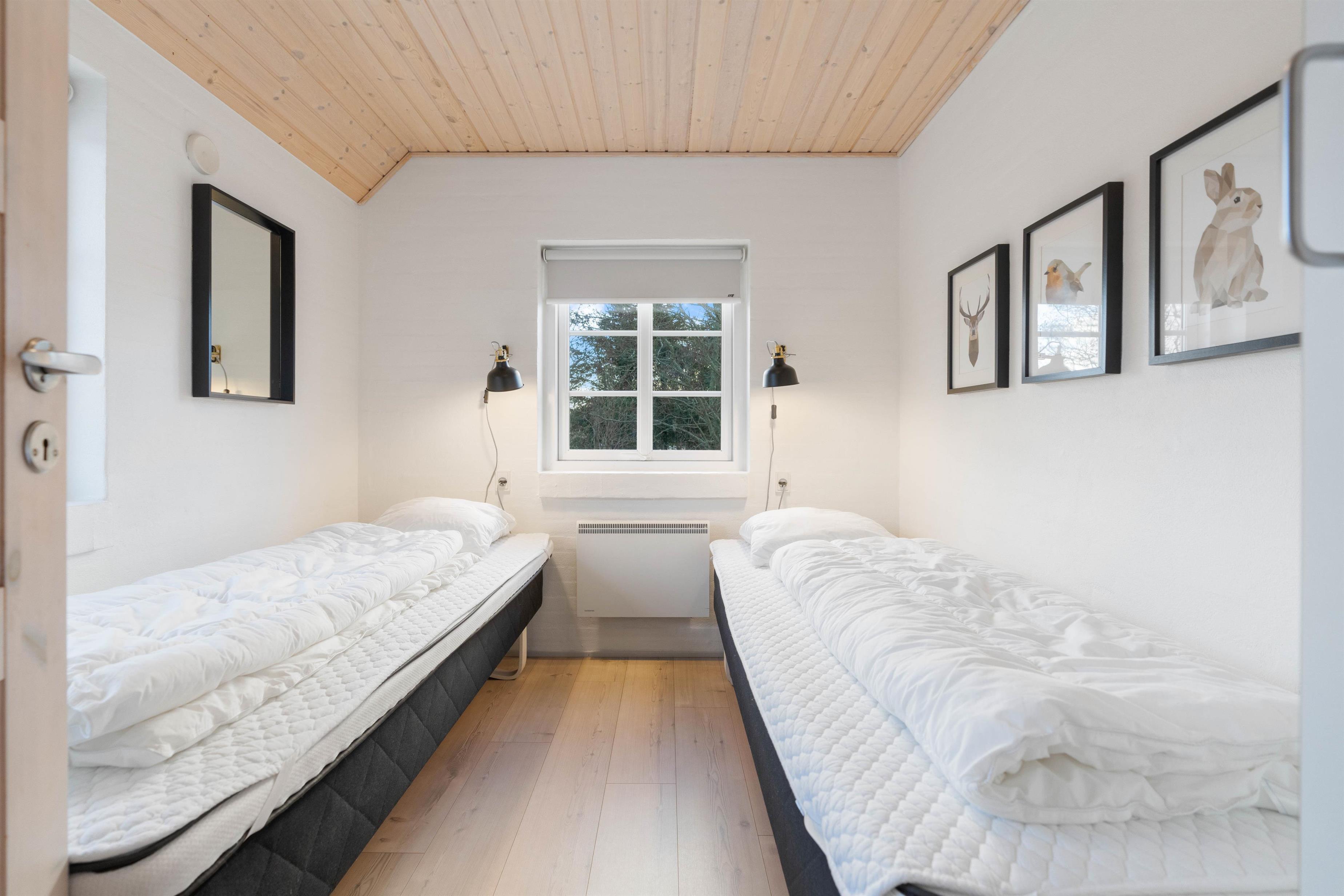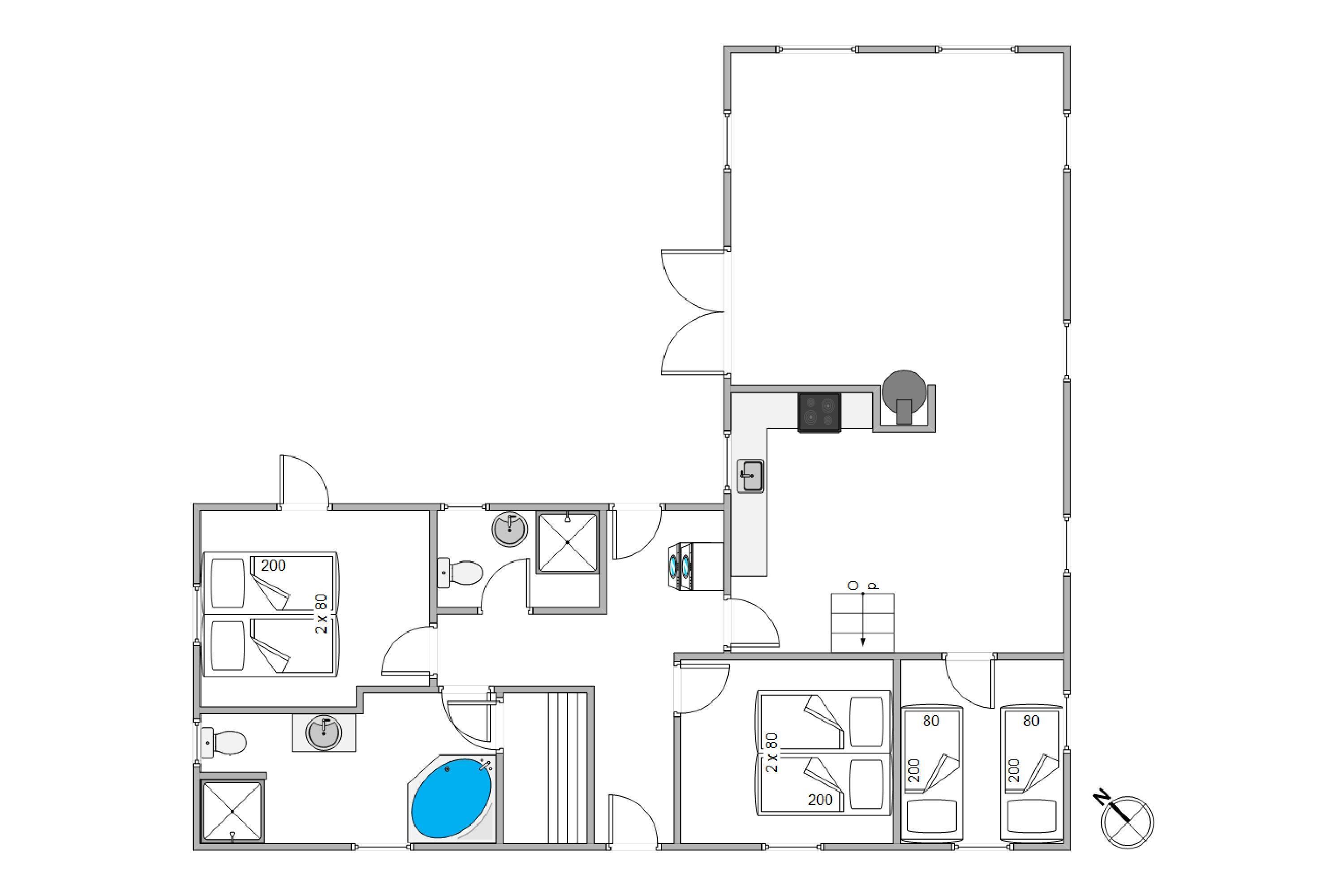Sommerhuset på Løvsangervej 13 indeholder 3 soverum, heraf 1 er med dobbeltseng og de 2 andre er med enkeltsenge. Der er to dejlige badeværelser der begge er udstyret med gulvvarme, som sikrer lune fødder på køligere dage. Det ene badeværelse har spa og sauna, hvor I kan hygge jer og få ladet batterierne op til ferien.