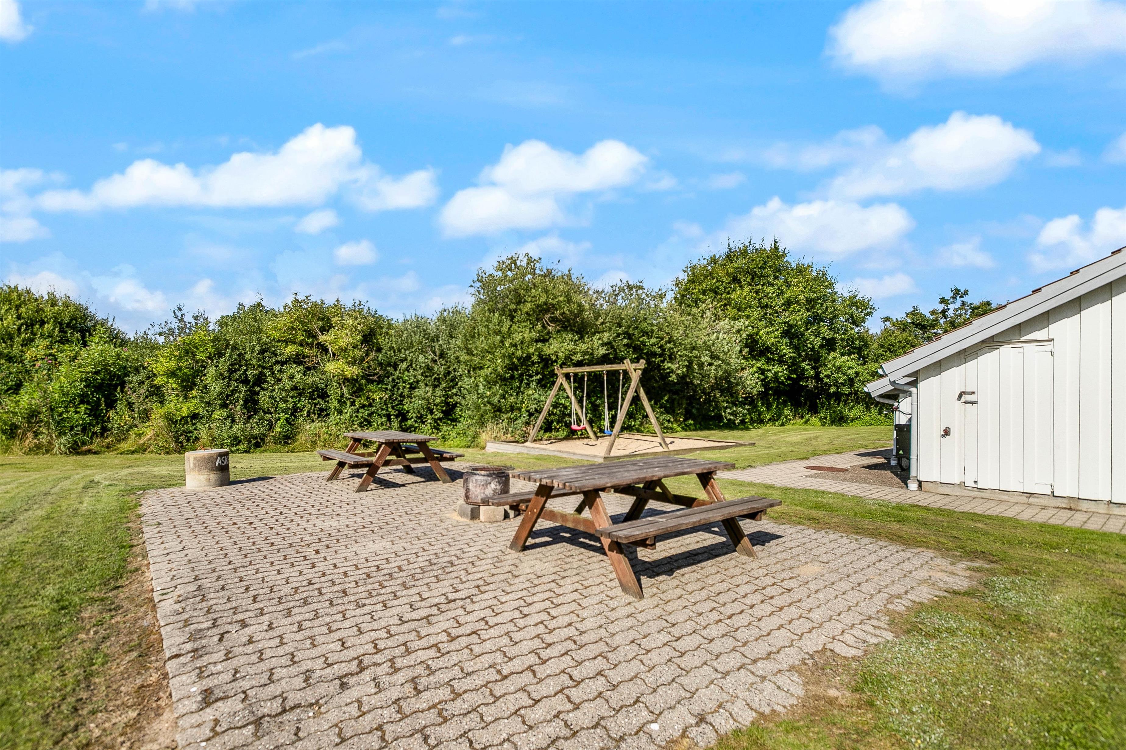 Dette sommerhus er perfekt til familieferier, da det er beliggende på en fredelig plænegrund, som er godt afskærmet af træer næsten hele vejen rundt. Derfor er gode muligheder for leg og boldspil på græsplænen, og de voksne kan nemt følge med i børnenes leg fra terrassen. Der er også et fodboldmål. På grunden er der også et gyngestativ og en sandkasse til de små samt et bålsted, som kan udnyttes til hyggelige aftner med snobrød eller skumfiduser. Terrassen går hele vejen rundt om huset, men er størst mod øst, syd, og mod sydvest, hvor den også er delvist lukket. Så her er det muligt at tilbringe hyggelige dage og grillaftener med familie og venner.