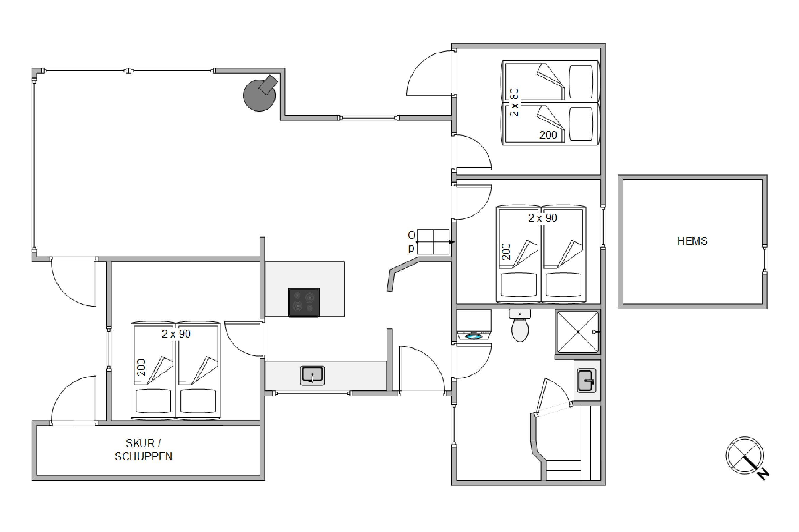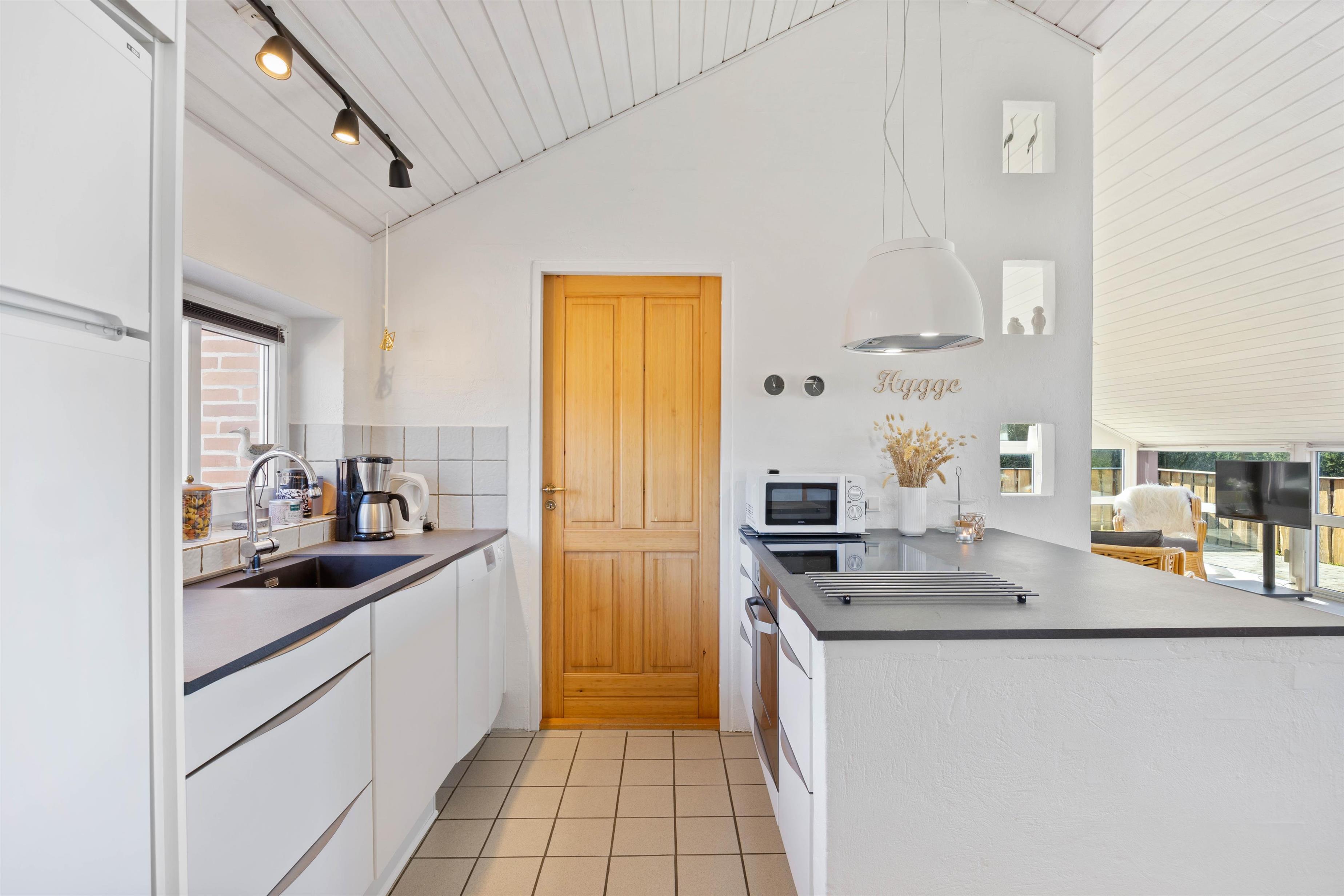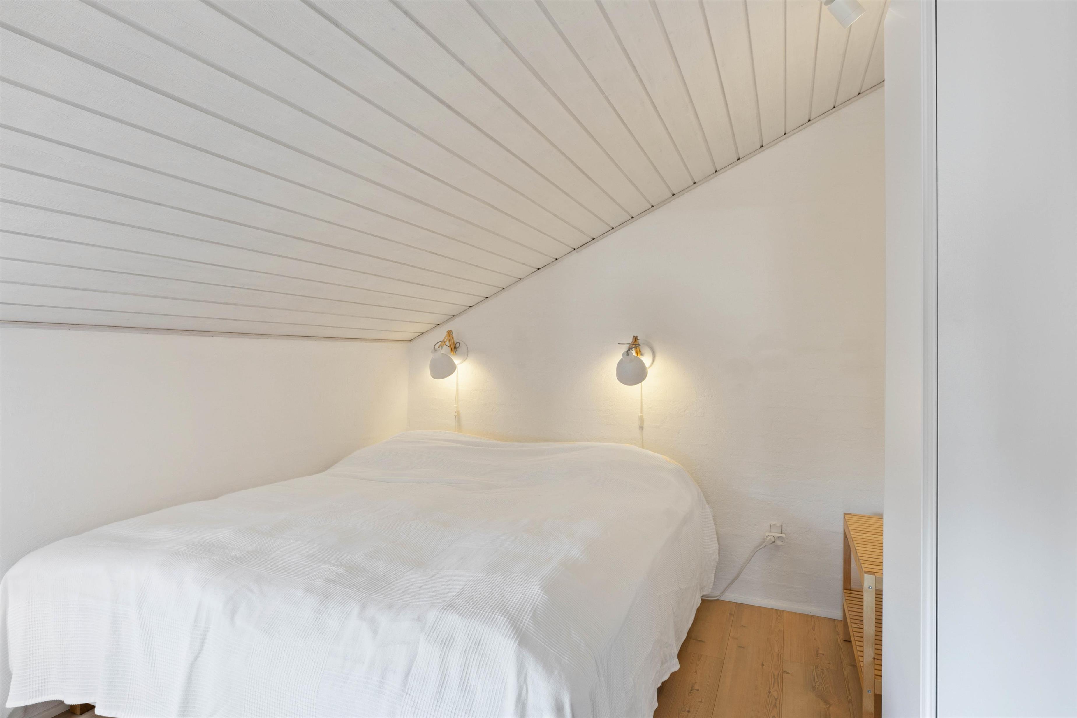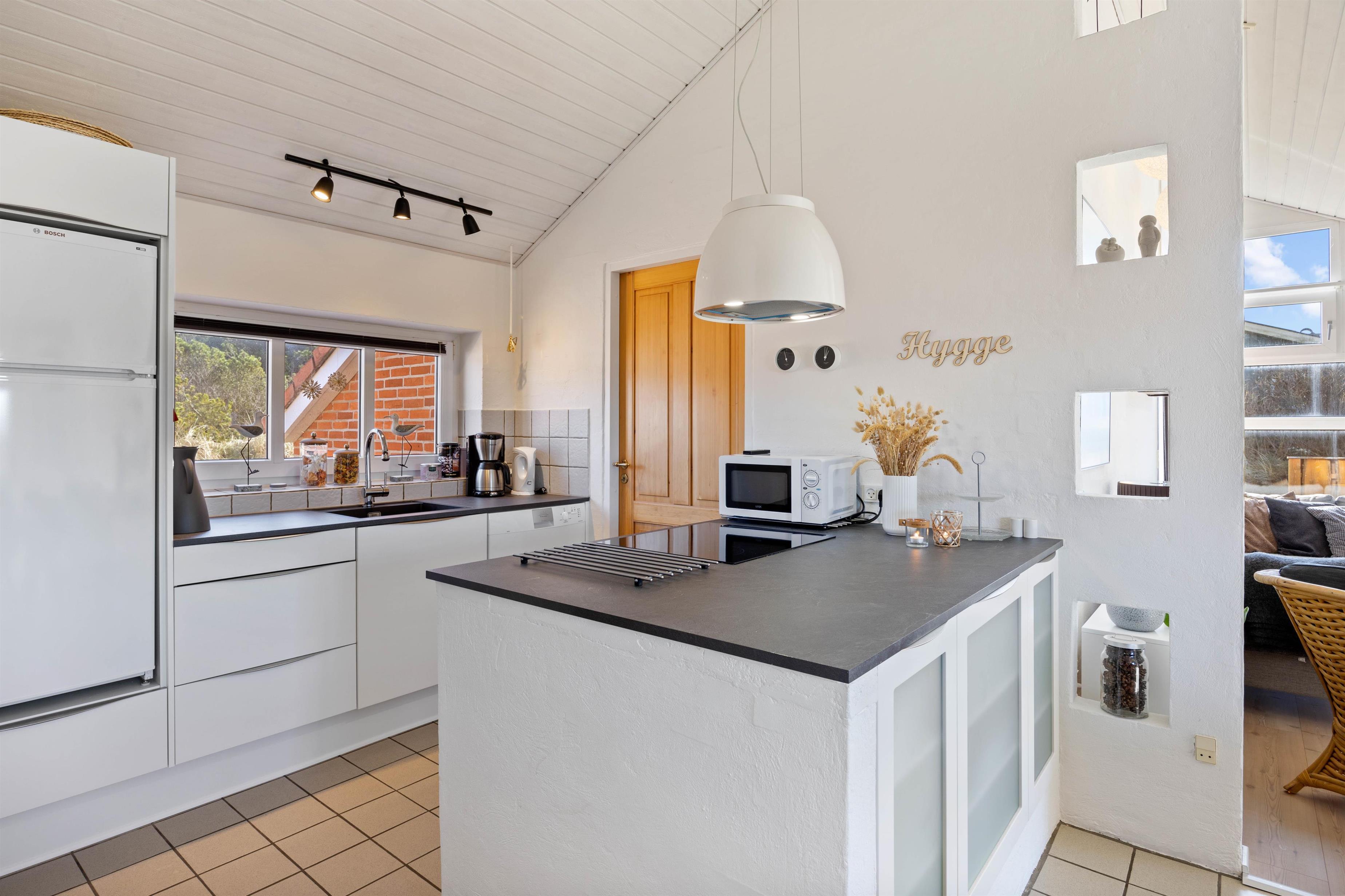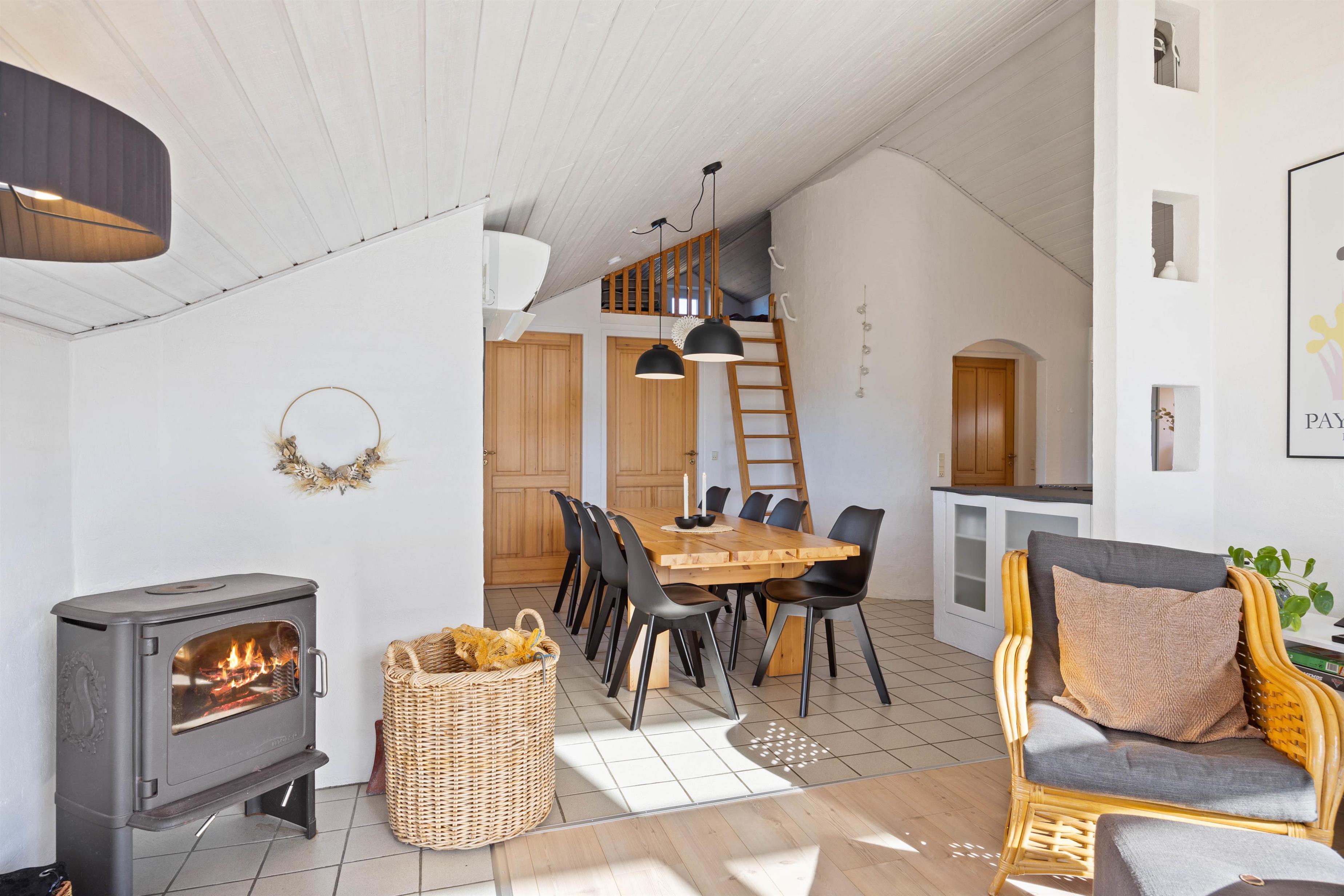 Køkken, stue og spiseplads ligger i åben forbindelse og udgør tilsammen alrummet, der er sommerhusets hjerte, hvor I kan samle hele ferieflokken til hyggelige feriestunder, mens brændeovnen knitrer i baggrunden og fuldender feriestemningen. Fra alrummet har I desuden adgang til en hems, som feriens yngste gæster helt sikkert vil elske.