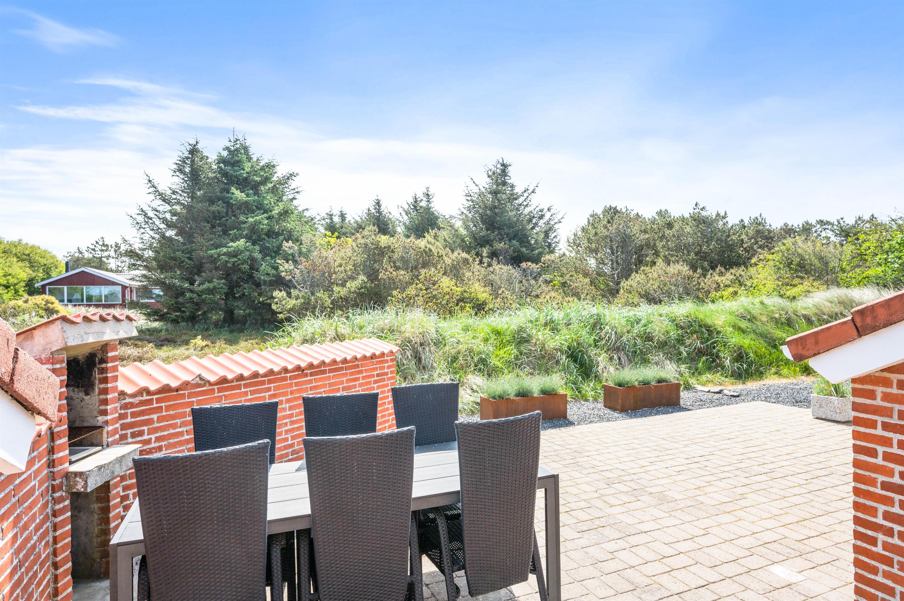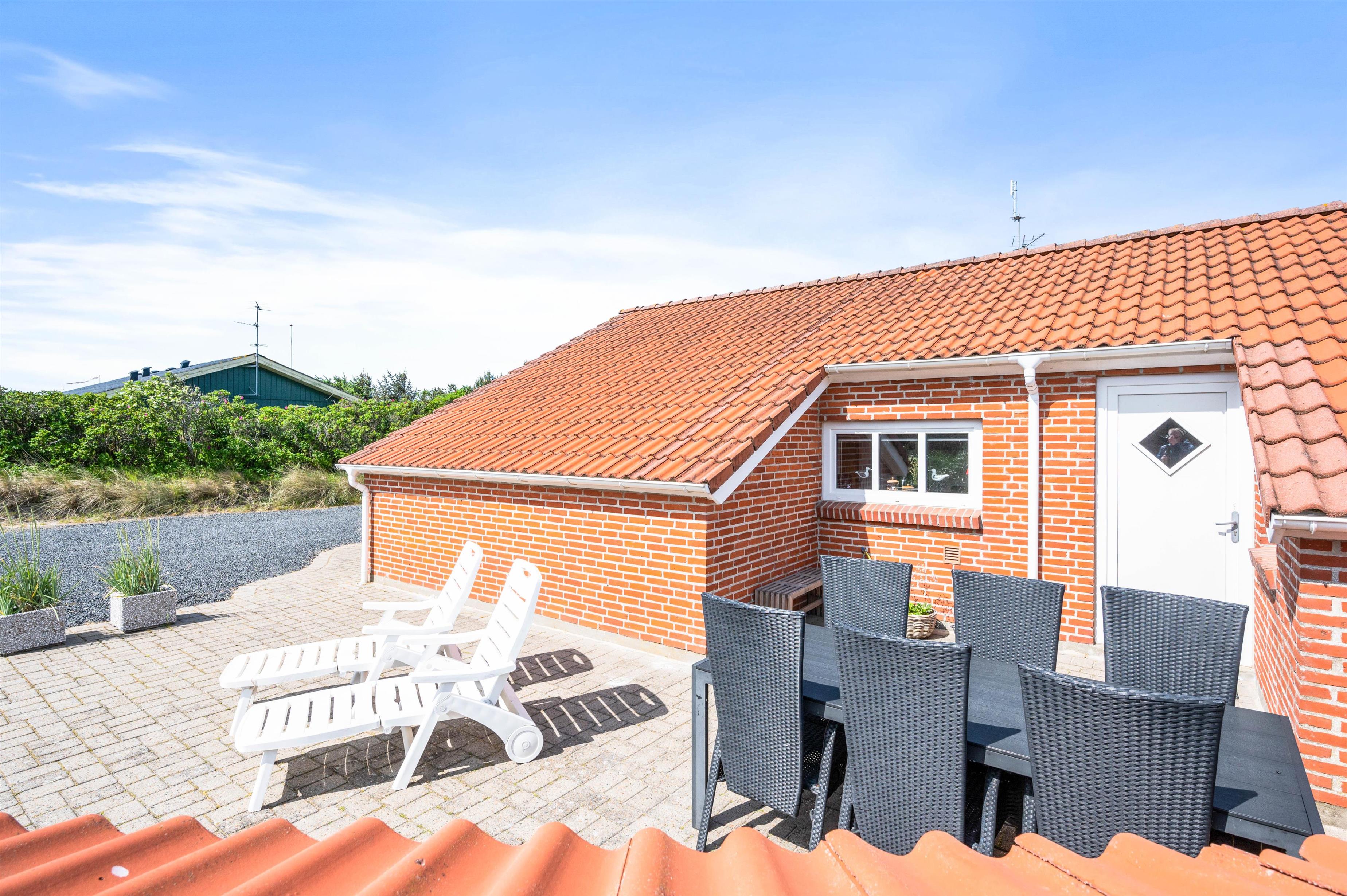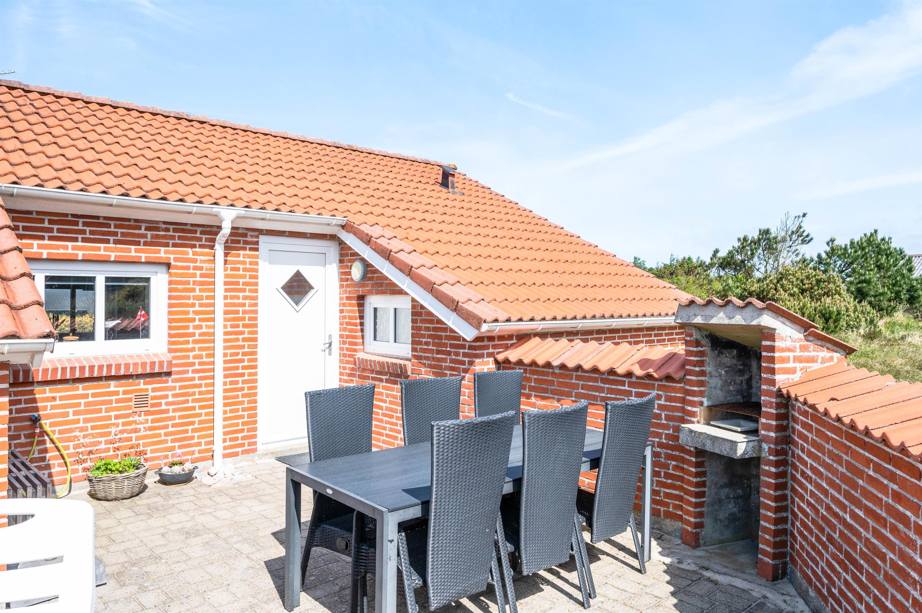 Udendørs venter jer en stor terrasse, der løber omkring det meste af sommerhuset. Her kan I altså nyde sol det meste af dagen, og med havemøbler og liggestole til rådighed kan I finde jer til rette på en god plads på terrassen. Om aftenen kan I tilberede aftensmaden på grillen og nyde ferien på terrassen.