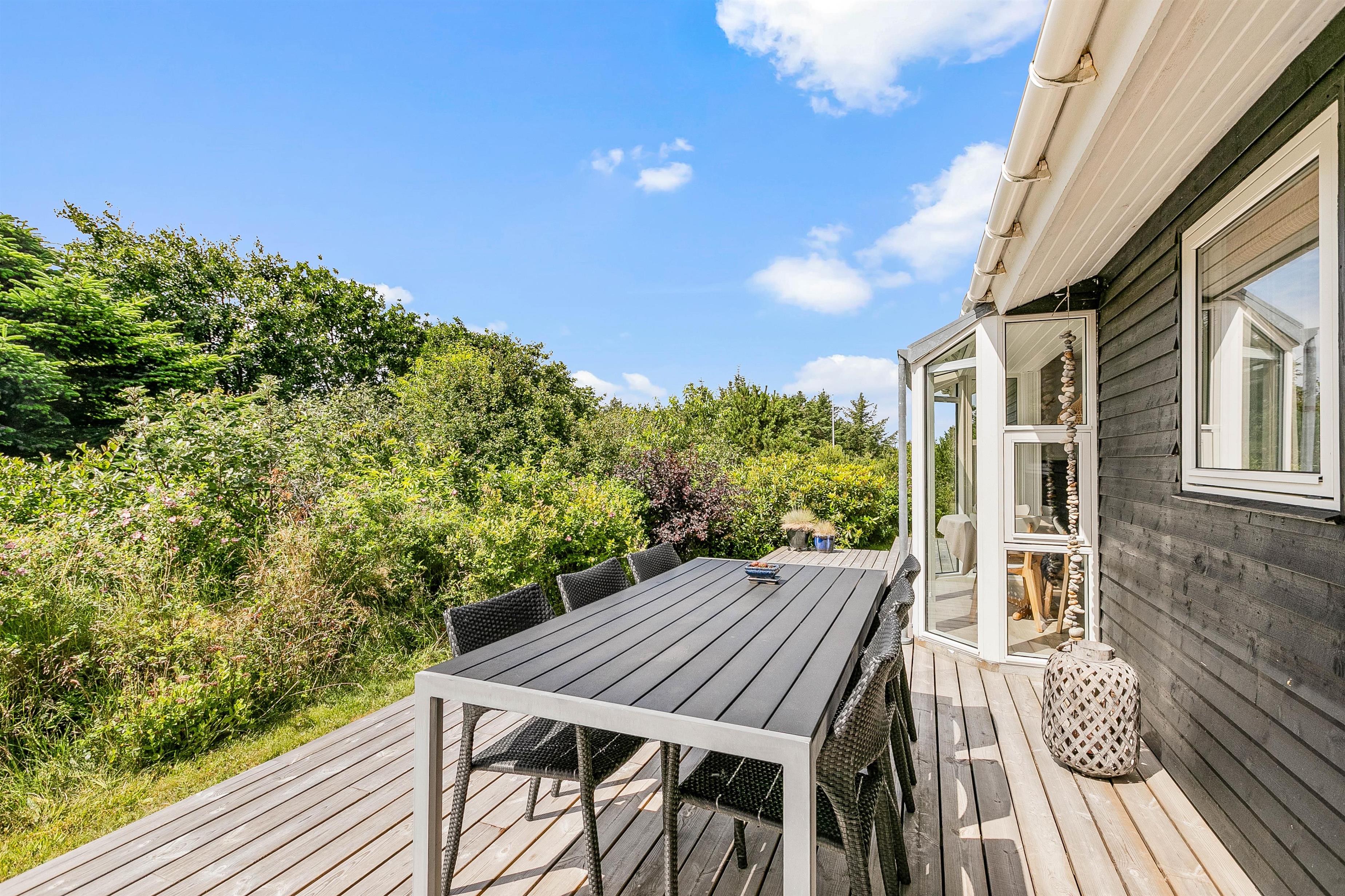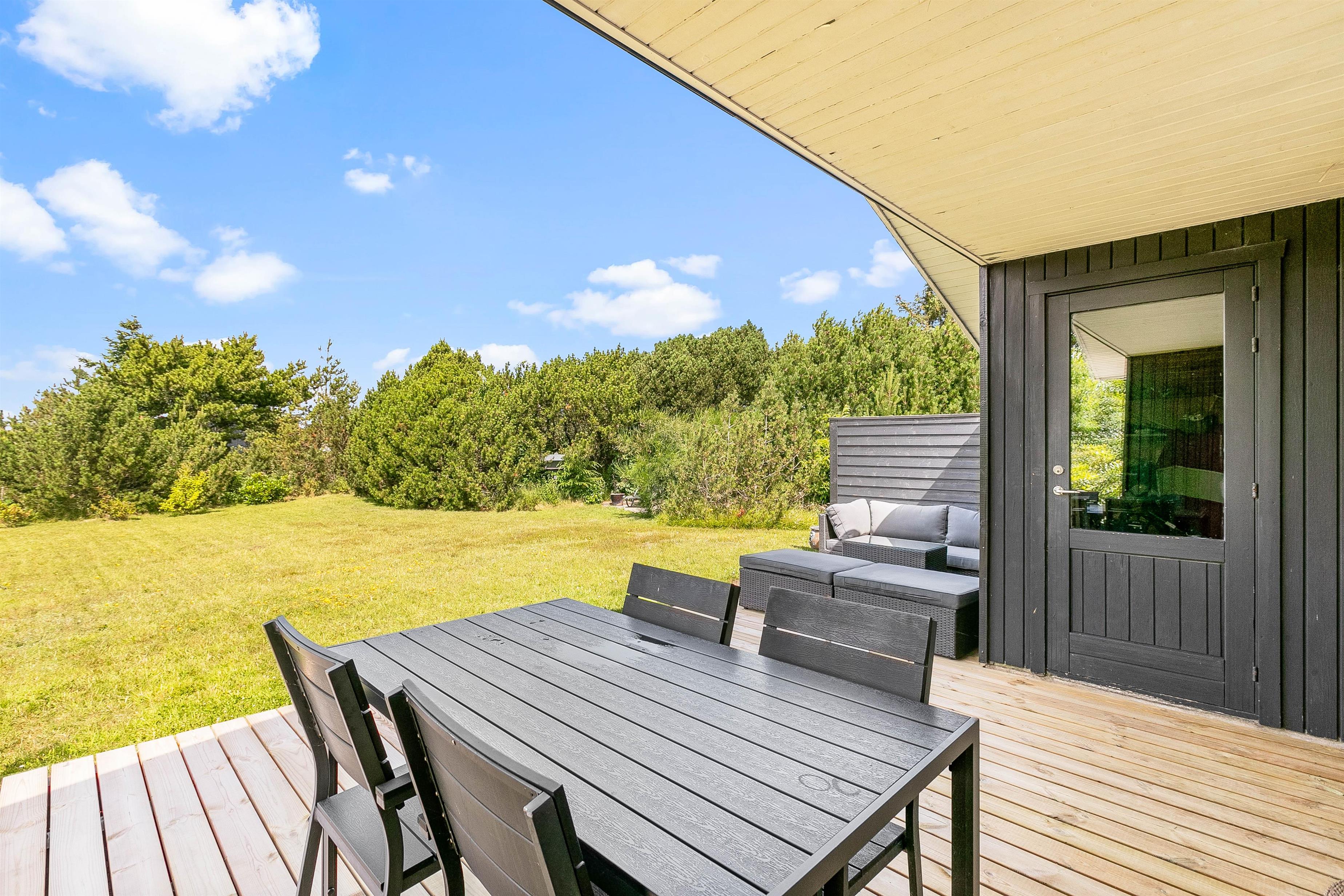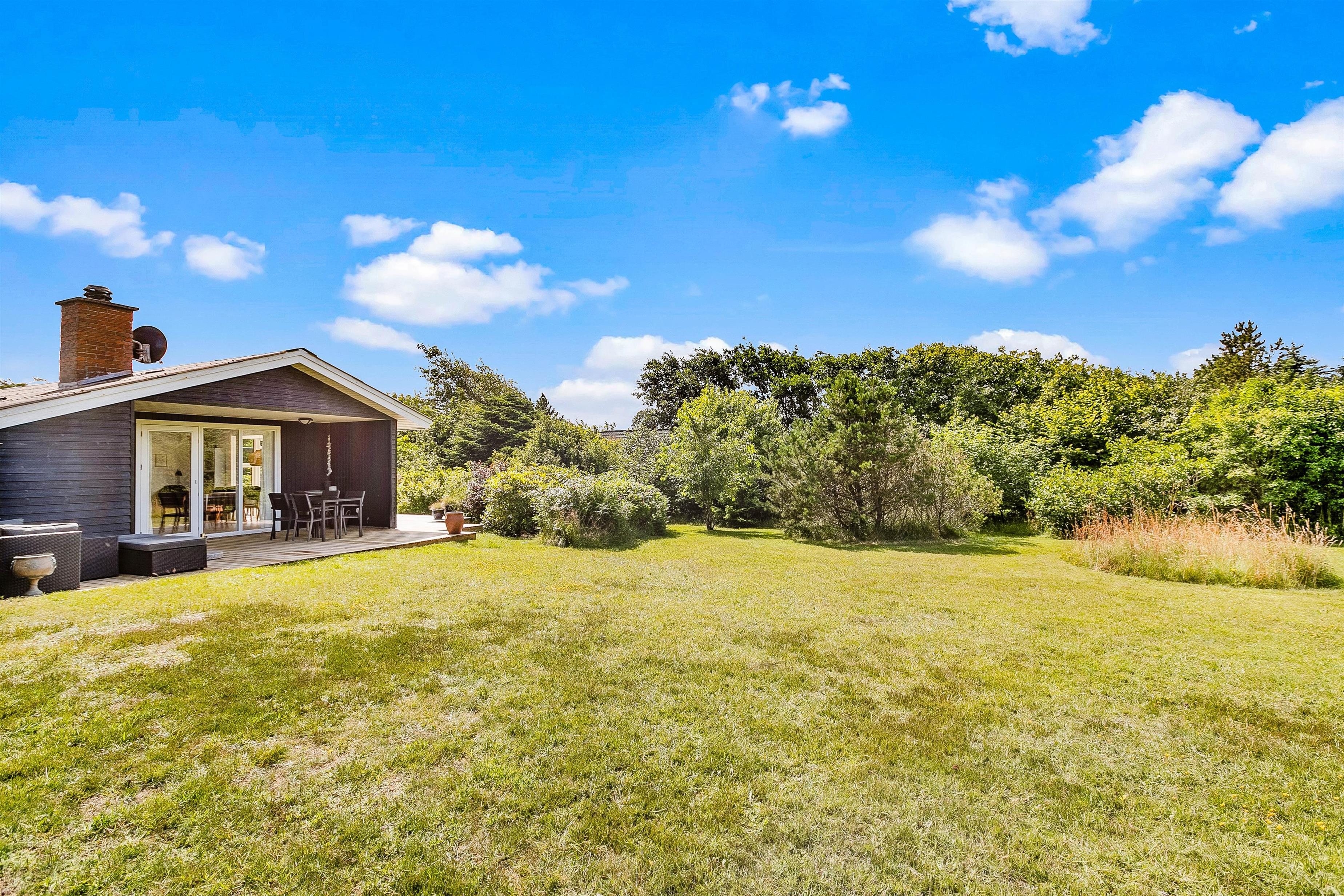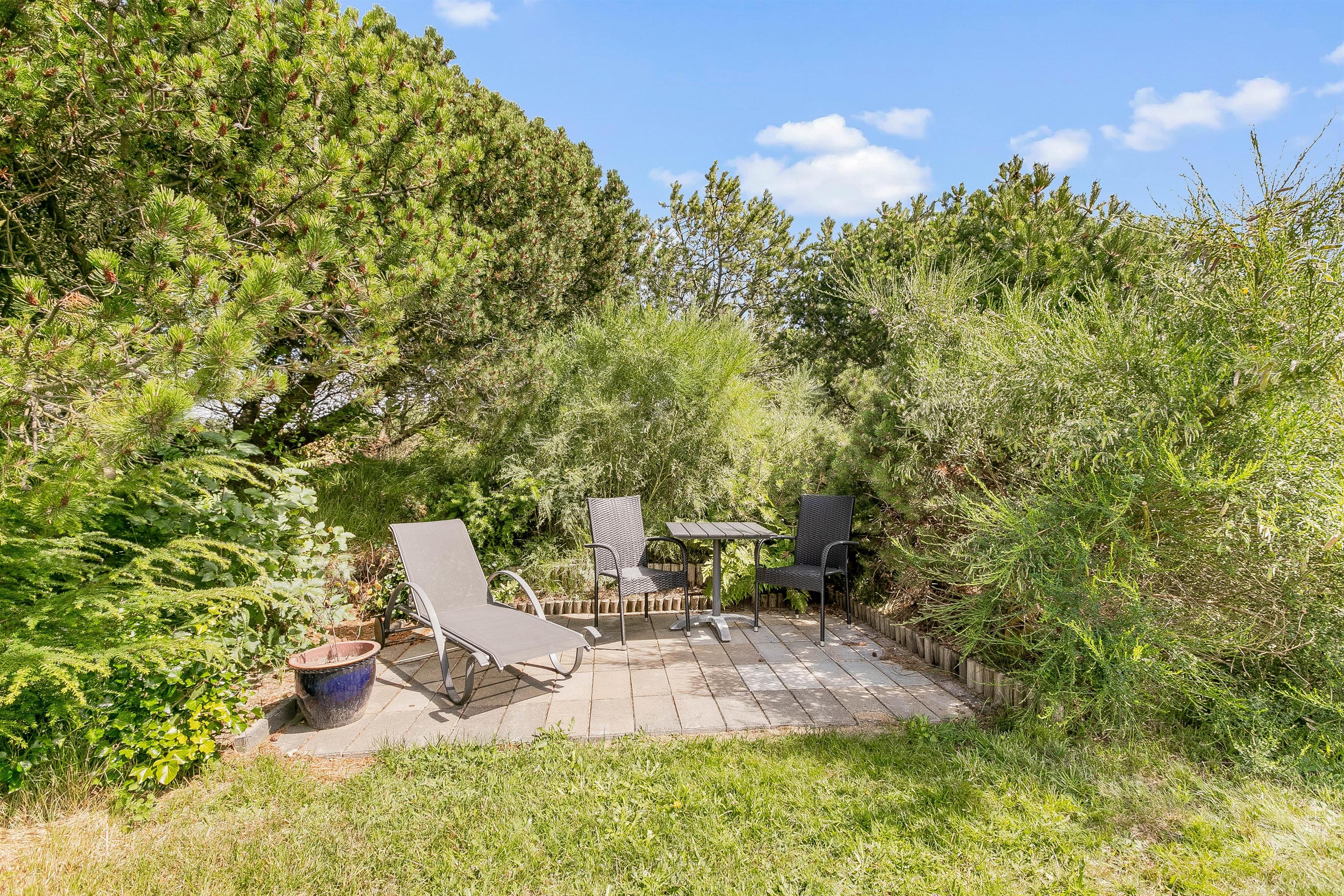 På grunden til feriehuset kan I have masser af privatliv, da feriehuset er indrammet af både træer og buske rundt om.