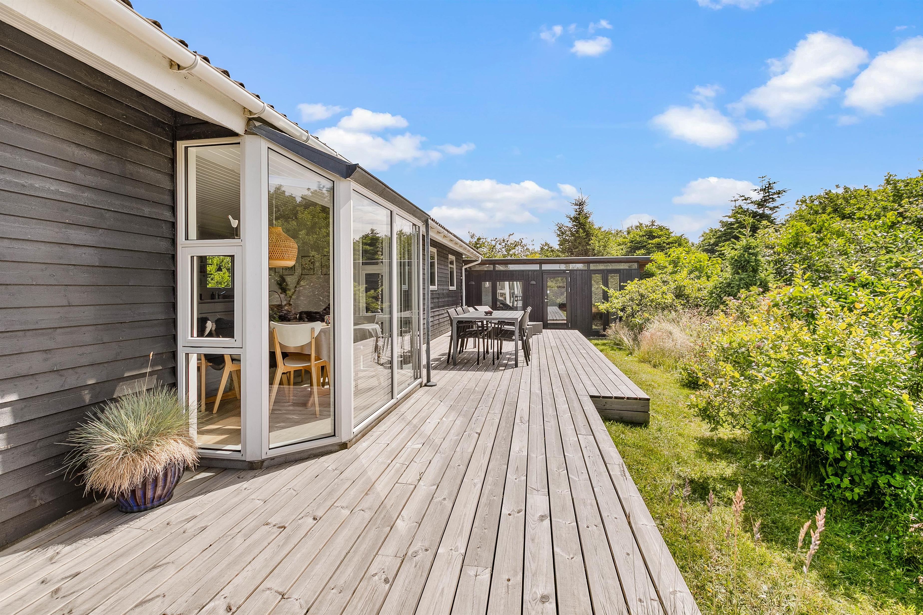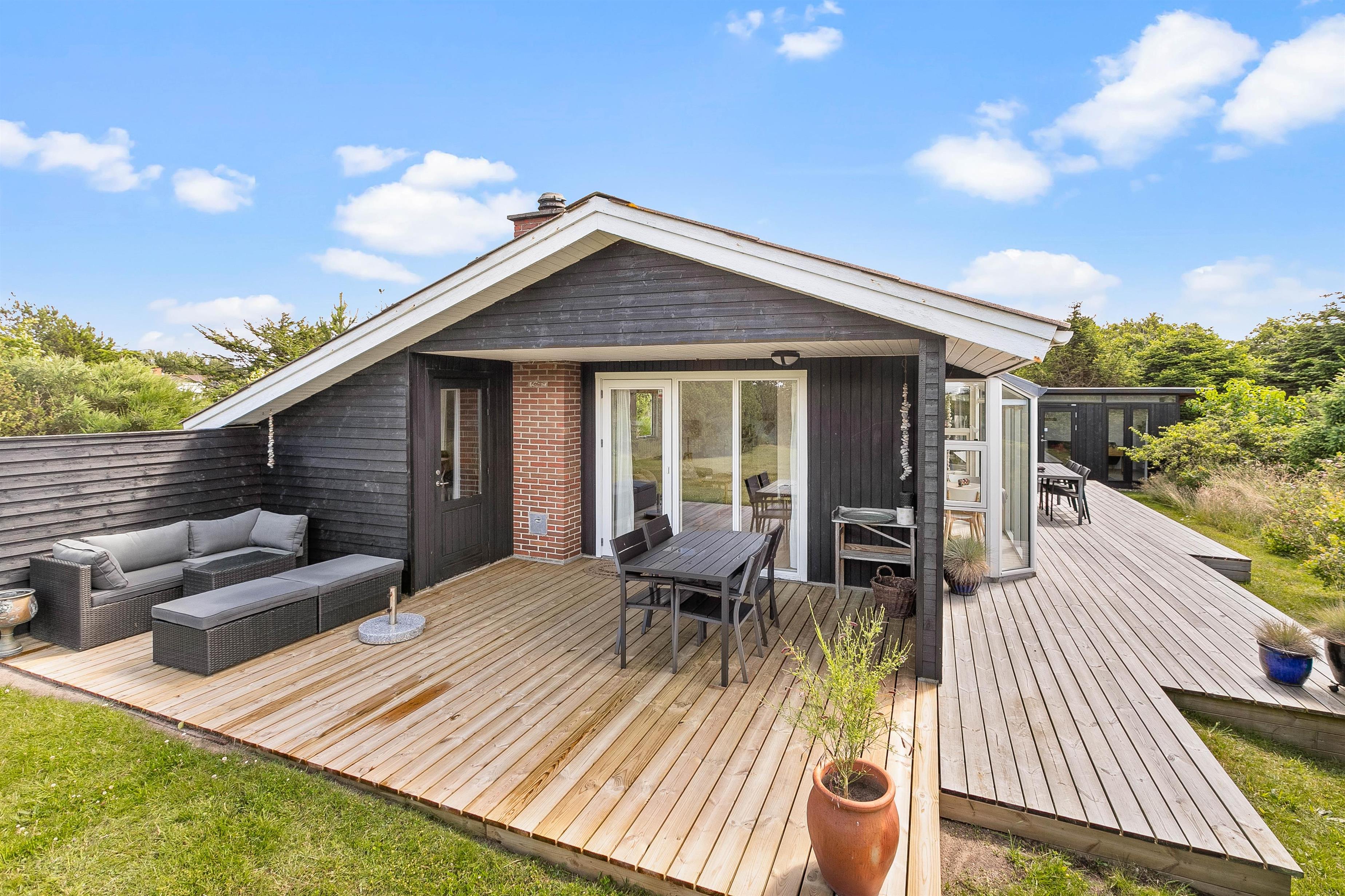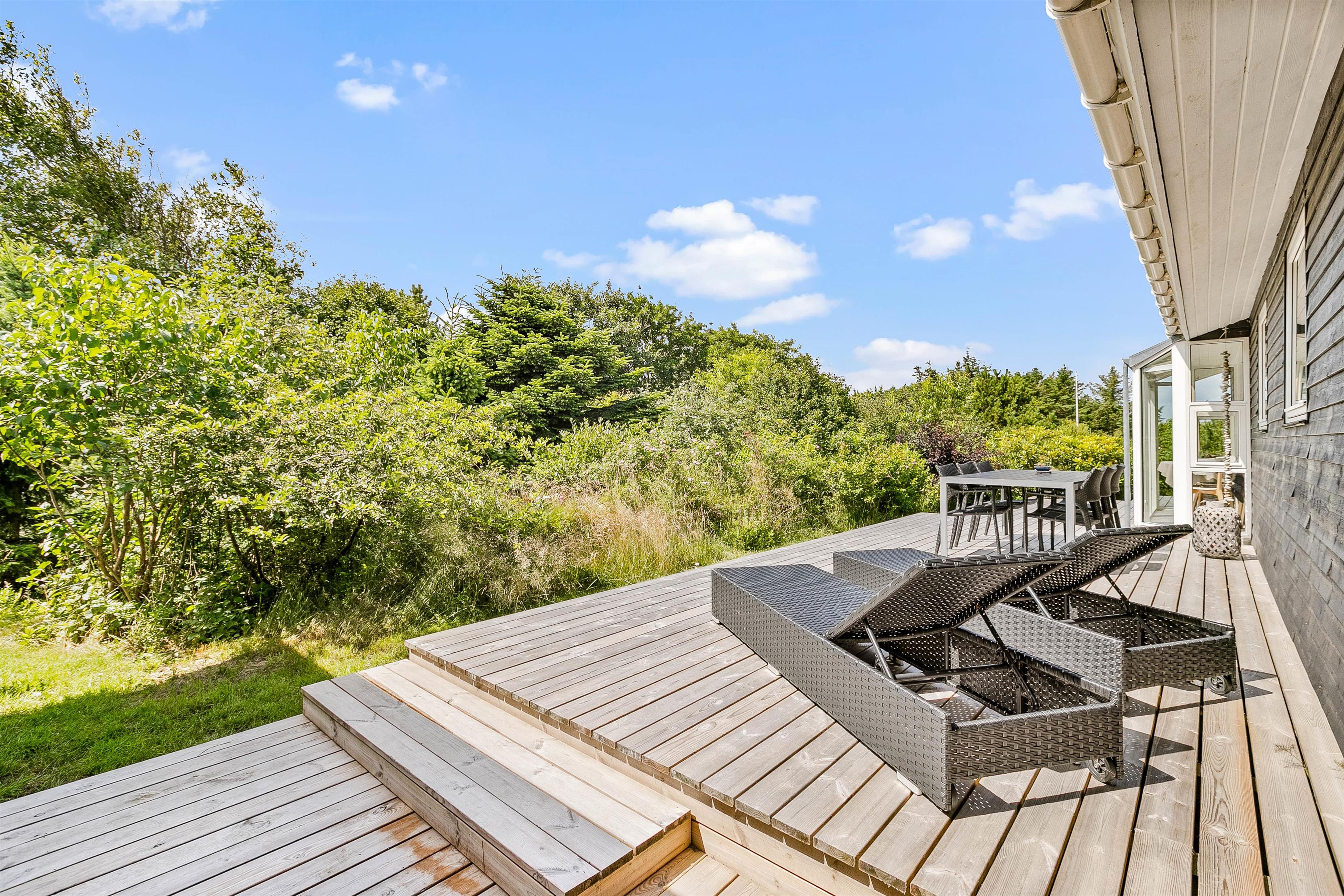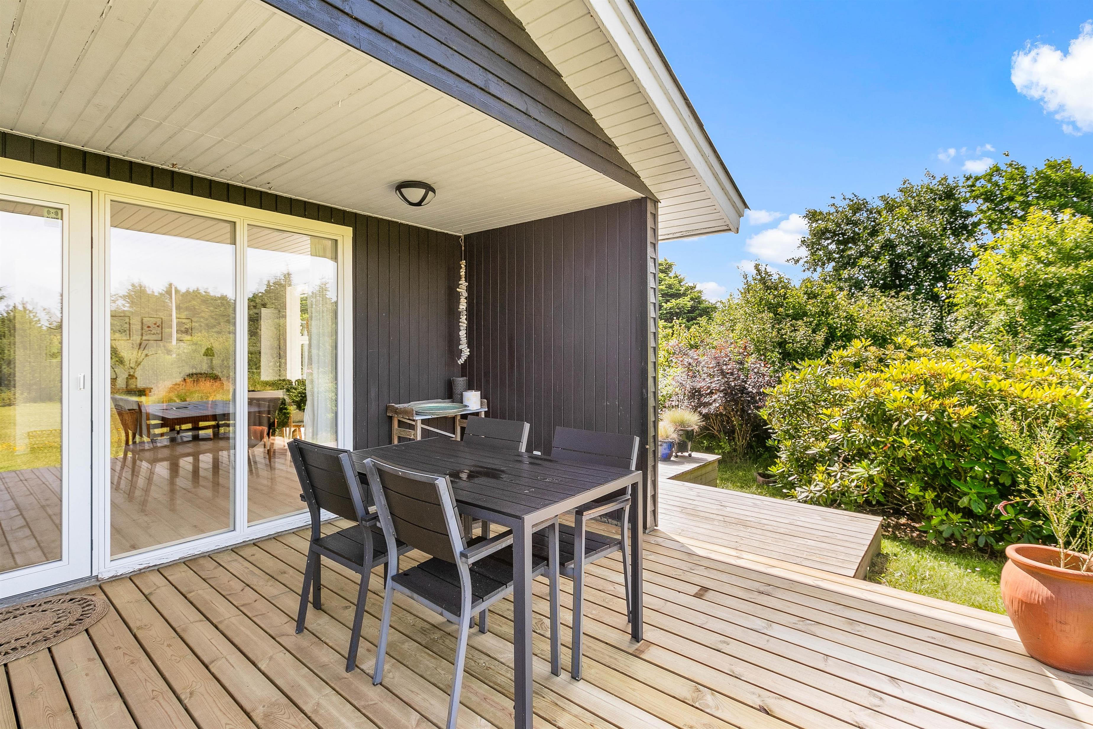 På grunden til feriehuset kan I have masser af privatliv, da feriehuset er indrammet af både træer og buske rundt om.