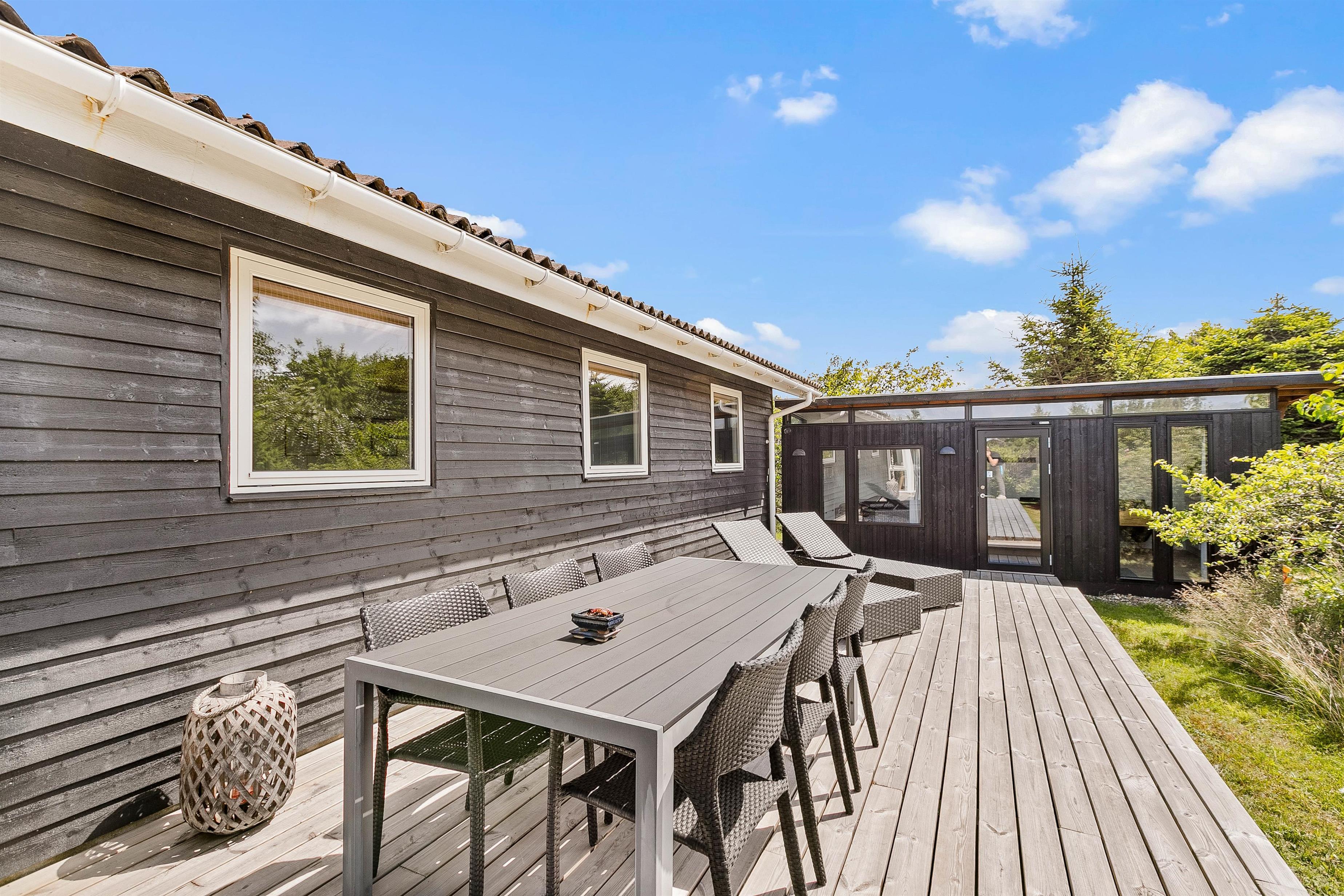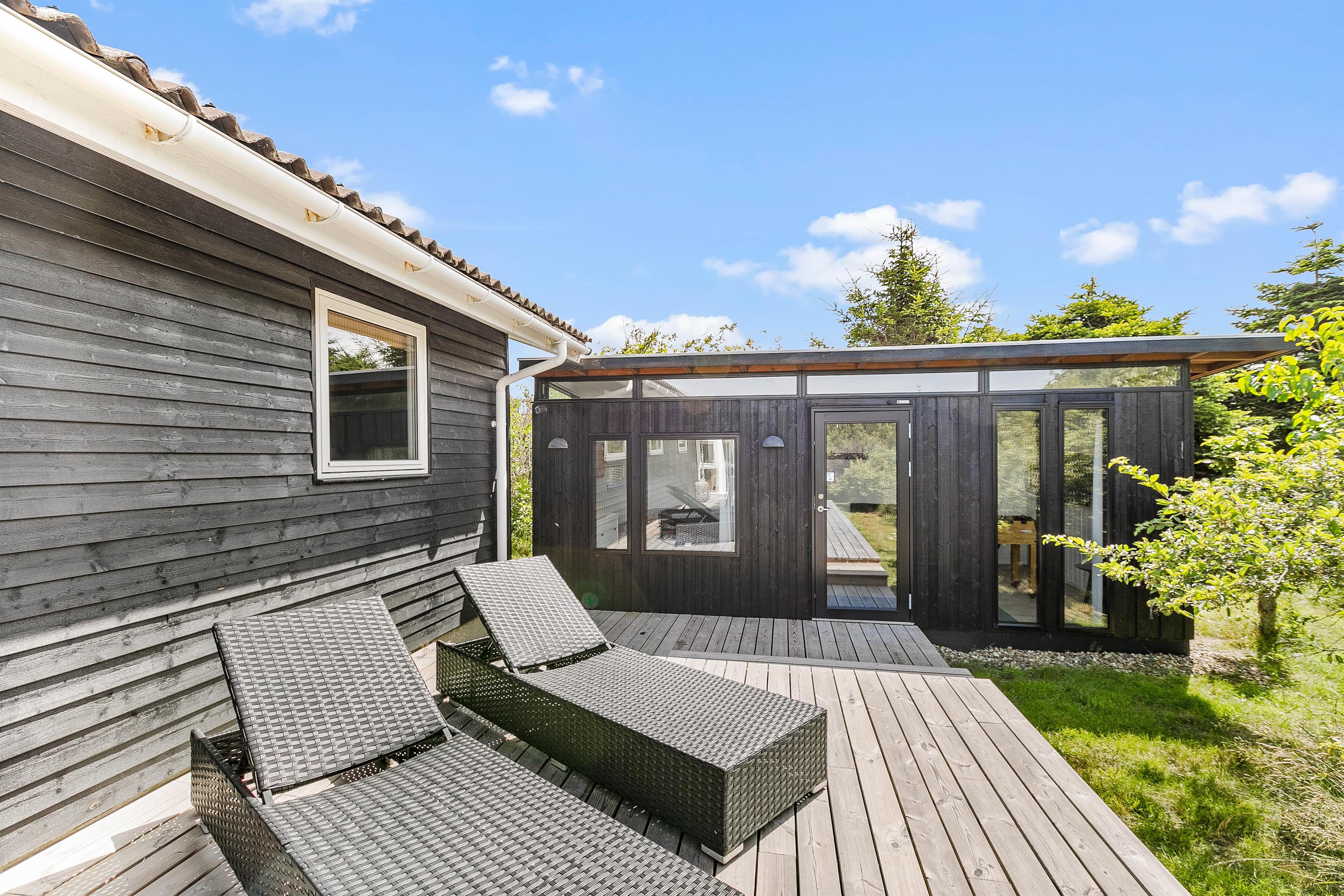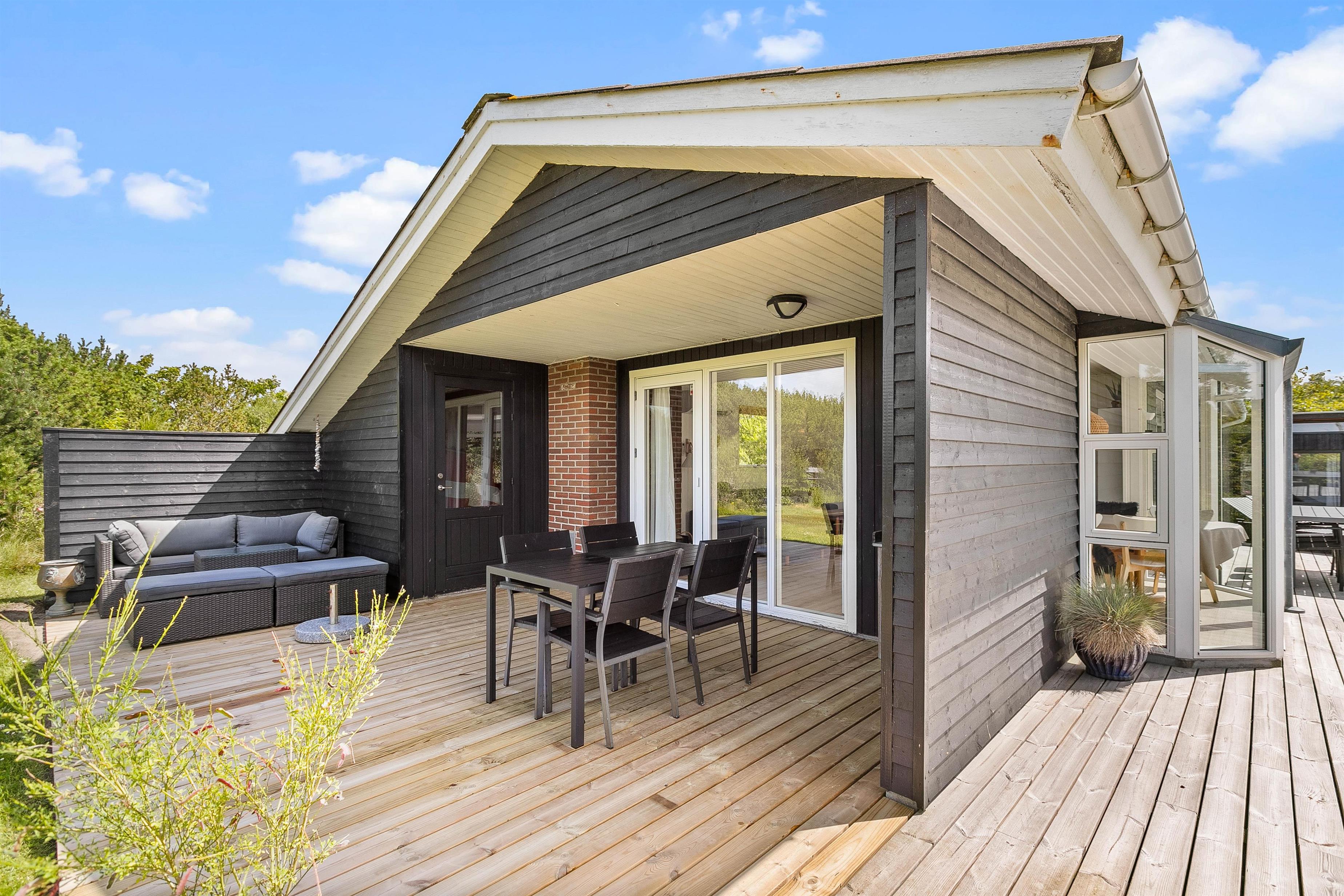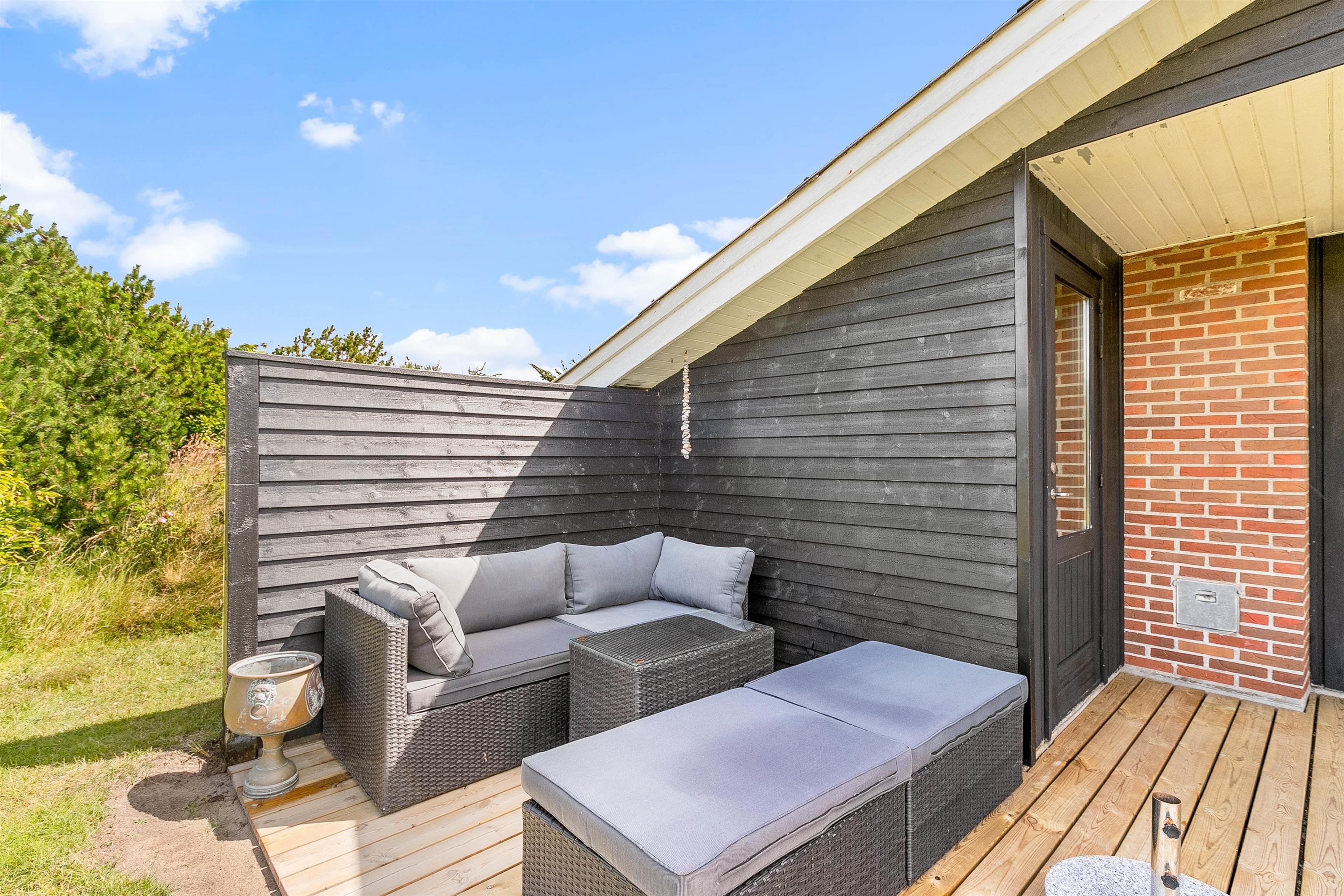 Det skønne feriehus beliggende på Lodbjerg Hede har et dejligt udeareal med bl.a. en lækker træterrasse og flere små terrasser, der giver god mulighed for at finde en hyggeplet i solen. Ydermere kan I tilberede et lækkert måltid på den tilhørende grill, slappe af i havemøblerne og nyde et koldt glas vin eller alt sammen samtidig med at børnene får brændt krudt af på den naturskønne grund.