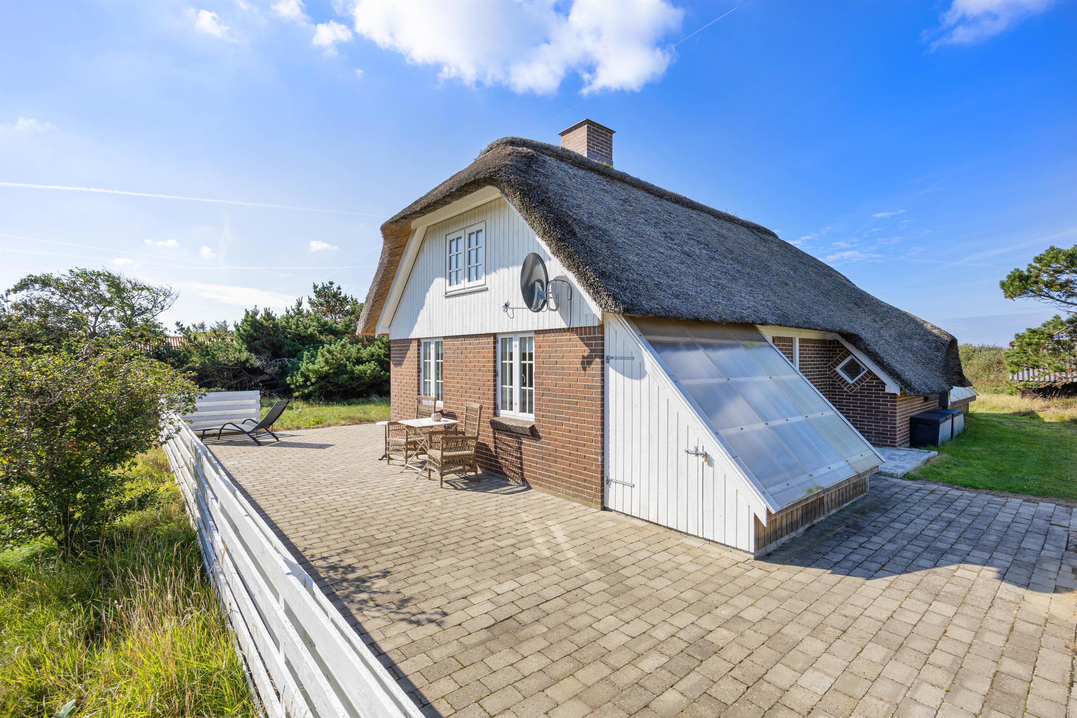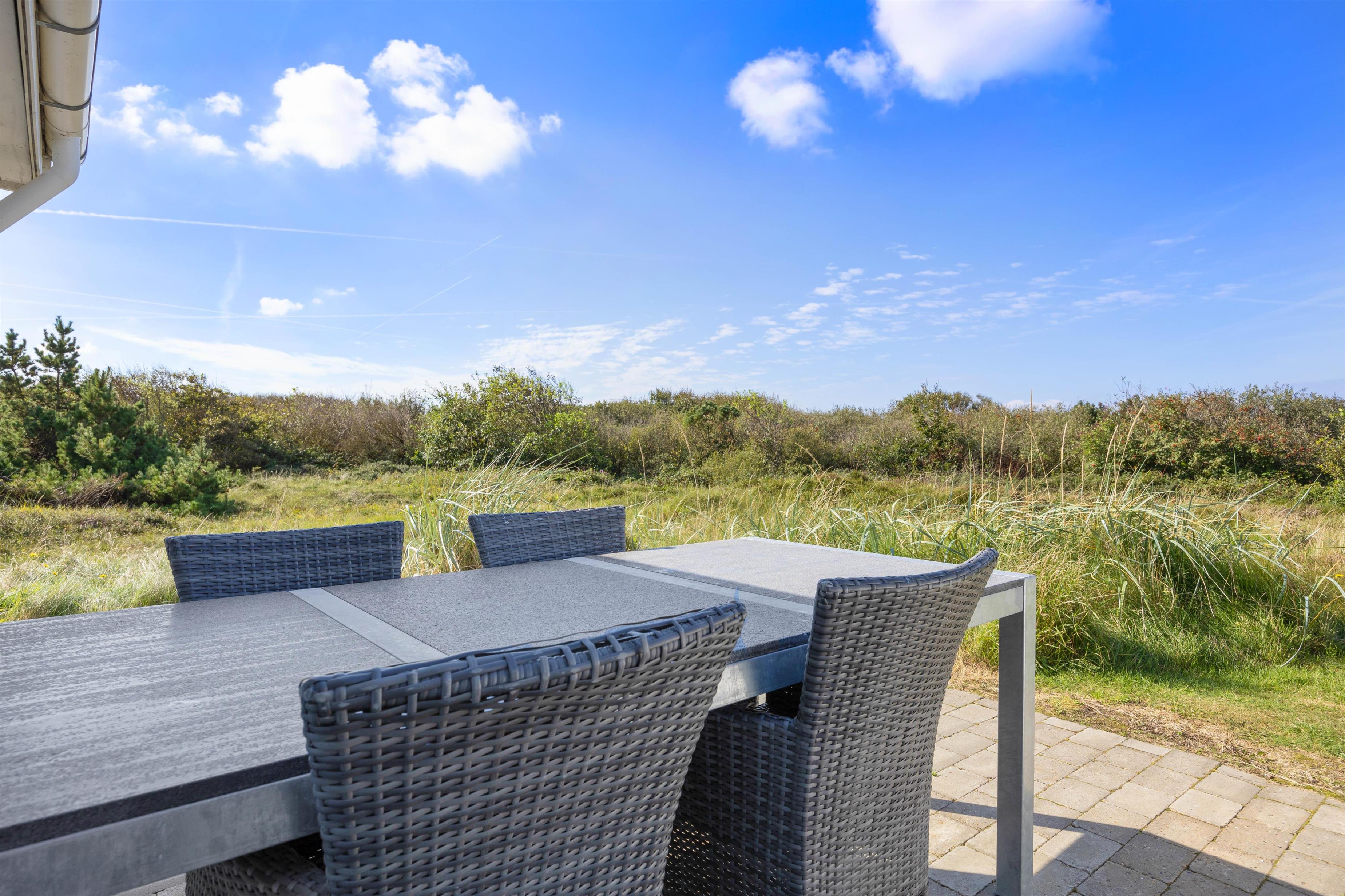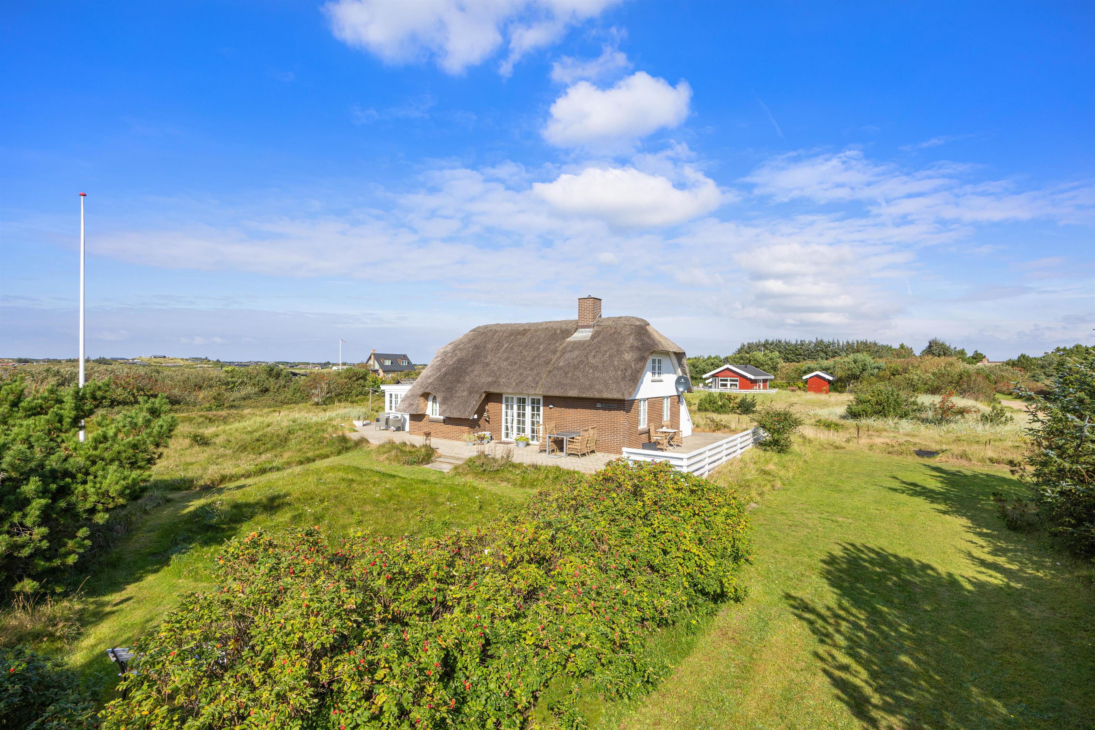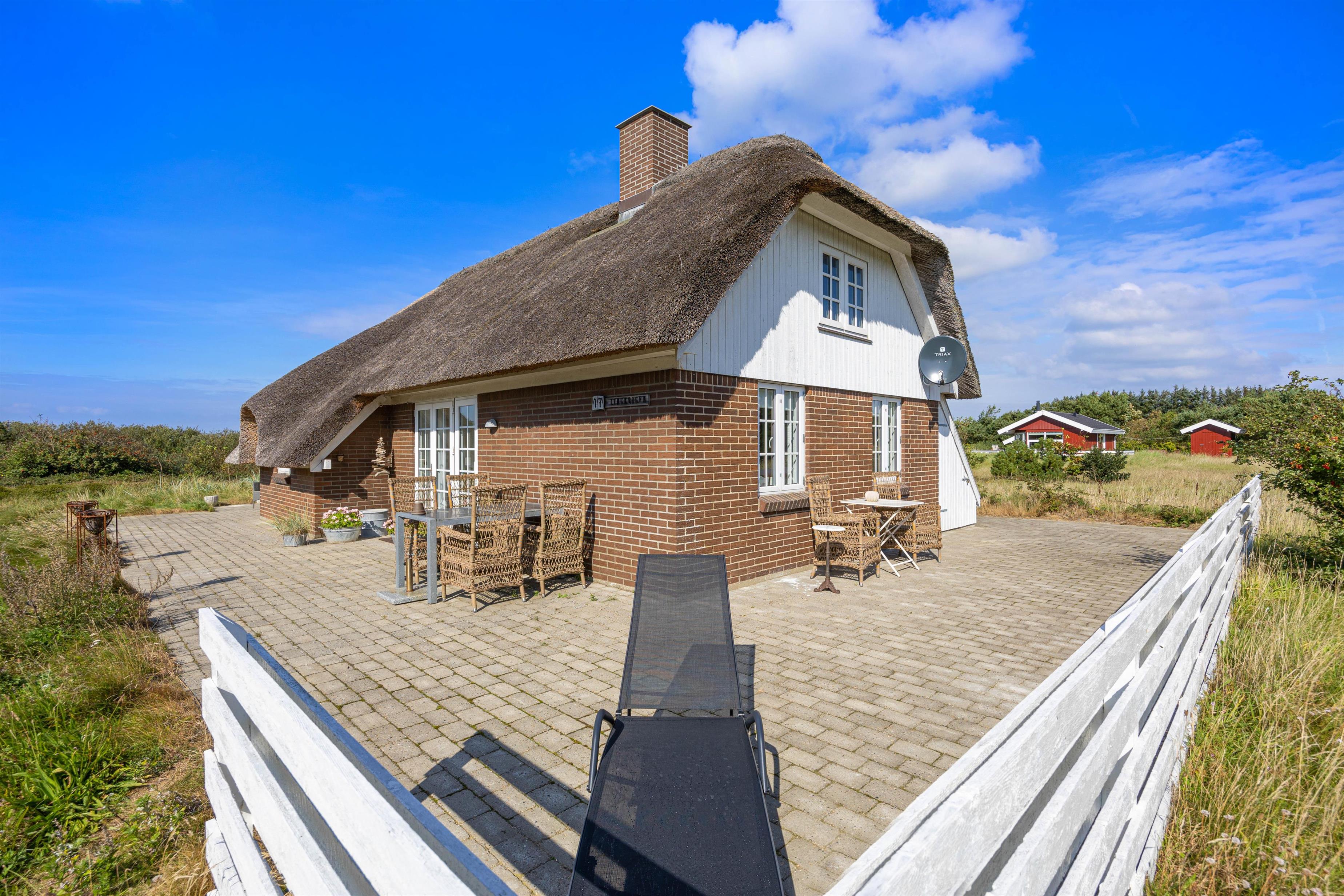 Den 2002 m2 store grund ligger midt i naturen på Lodberg Hede. Nyd solnedgangen over Søndervigs klitter på stenterrassen, der går hele vejen rundt om feriehuset, så I kan følge solen i løbet af dagen.