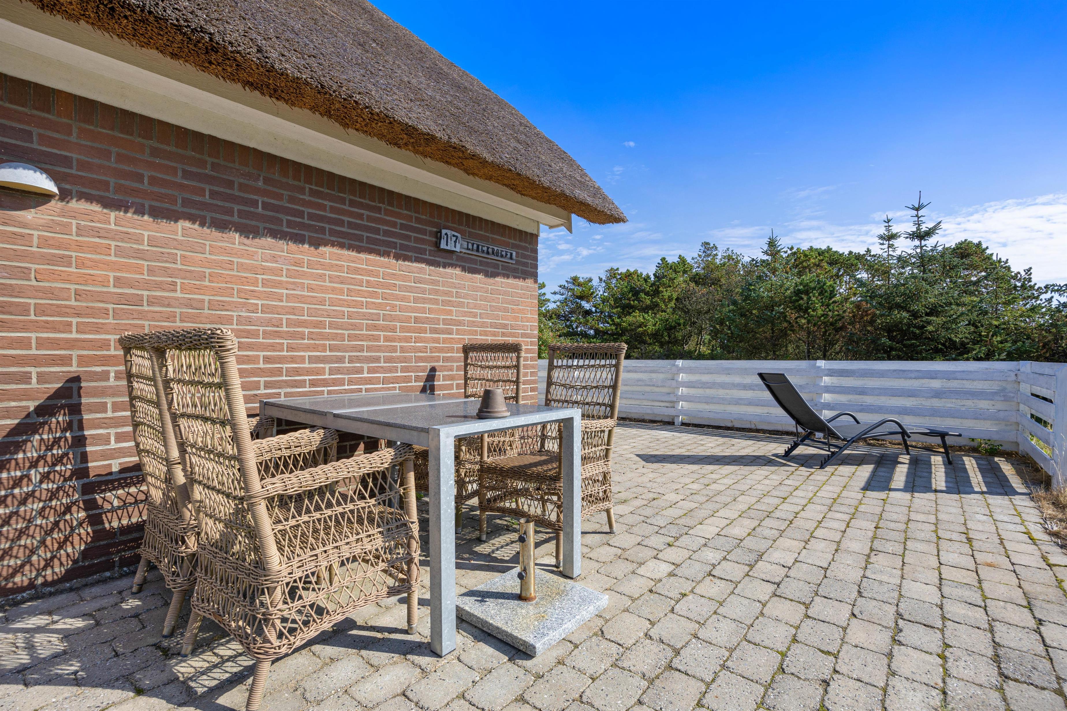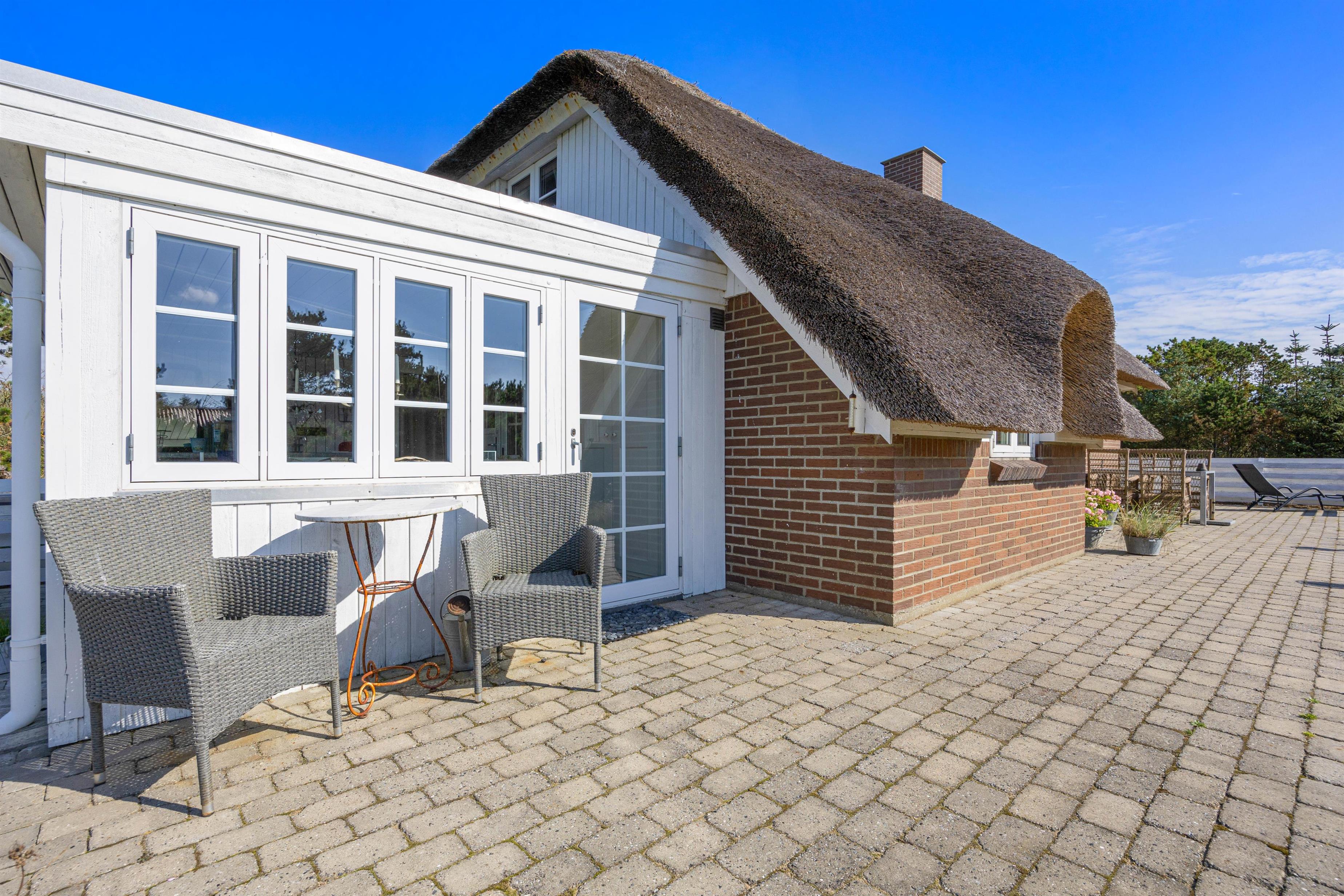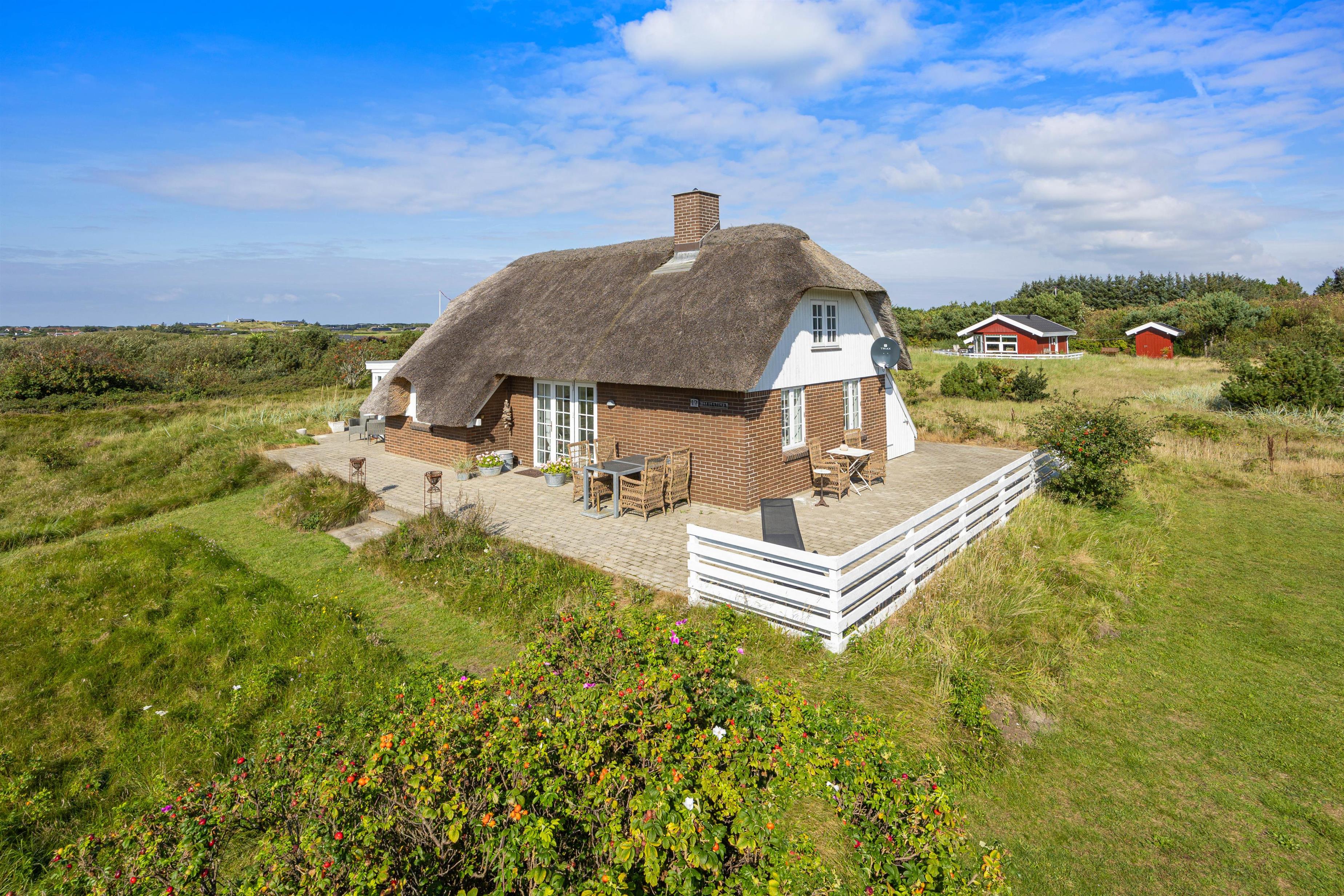 Den 2002 m2 store grund ligger midt i naturen på Lodberg Hede. Nyd solnedgangen over Søndervigs klitter på stenterrassen, der går hele vejen rundt om feriehuset, så I kan følge solen i løbet af dagen.