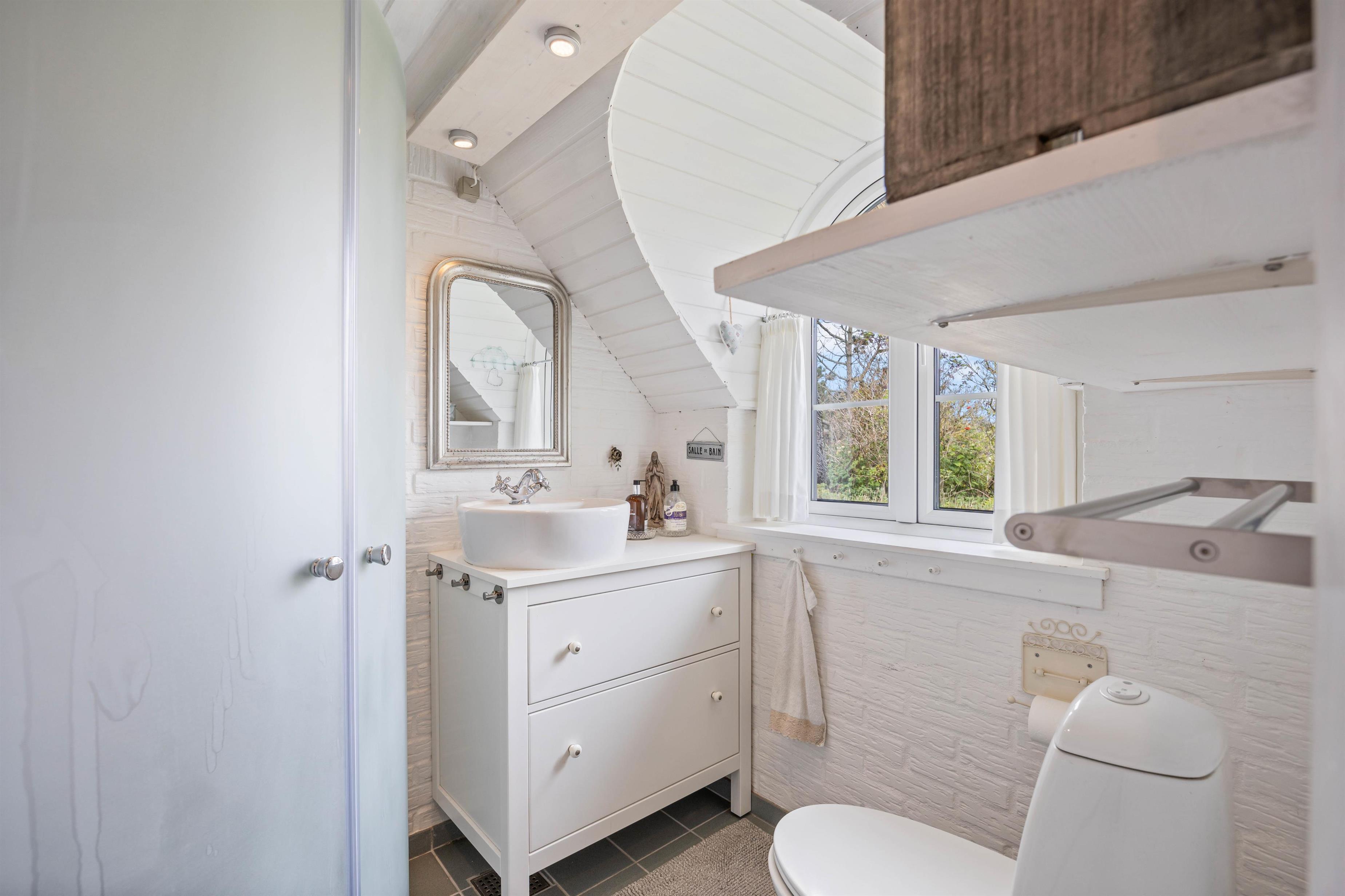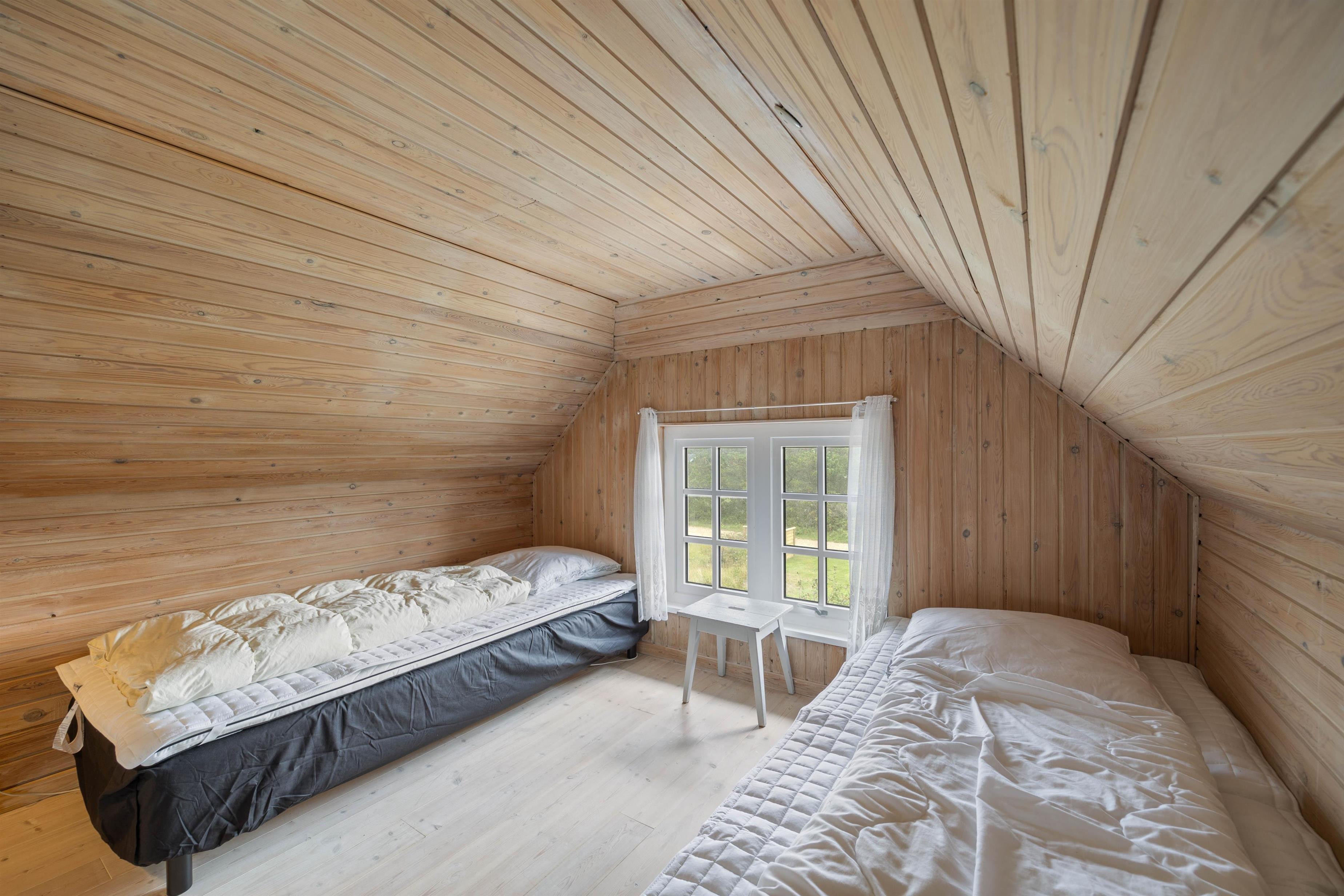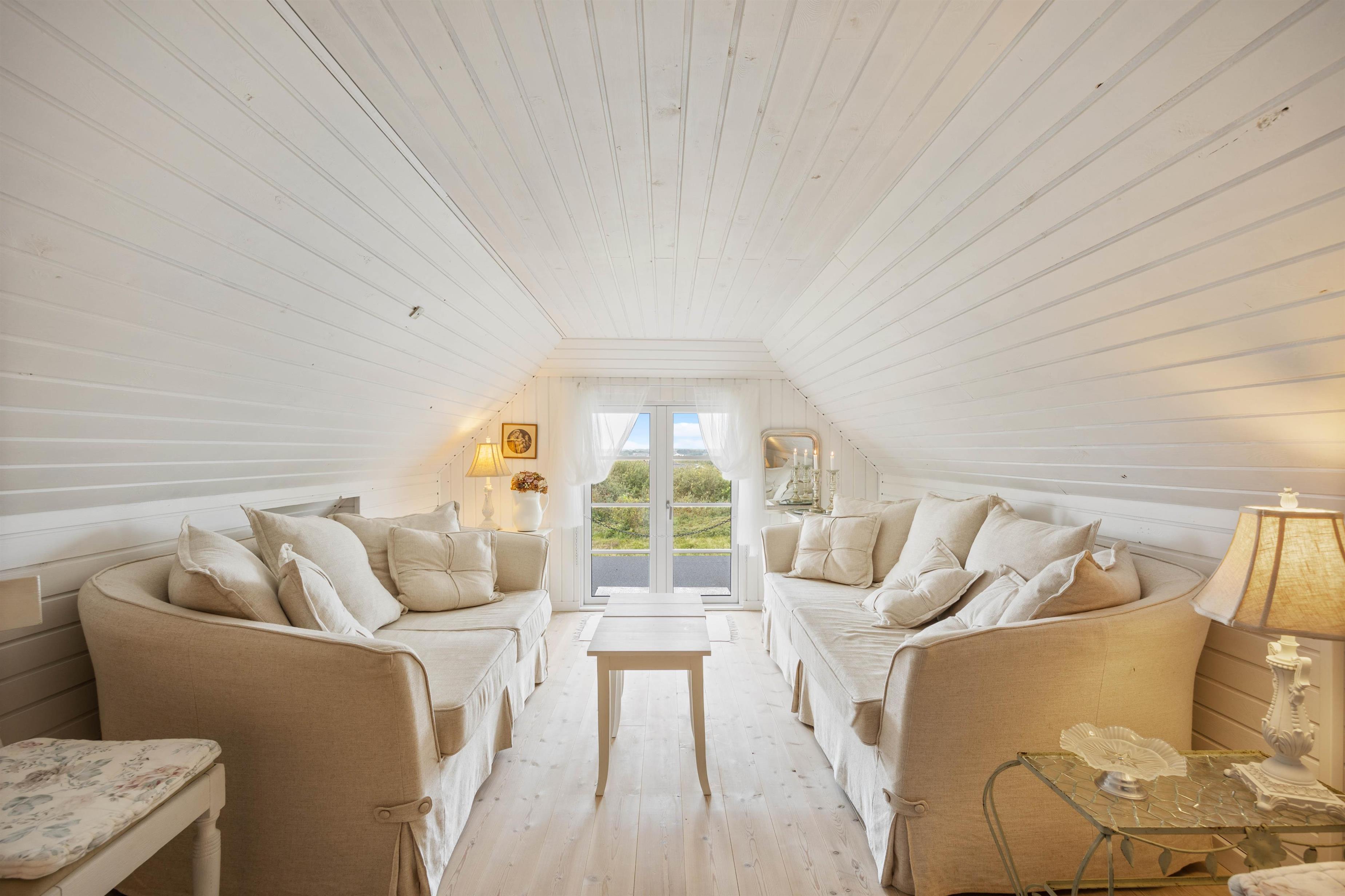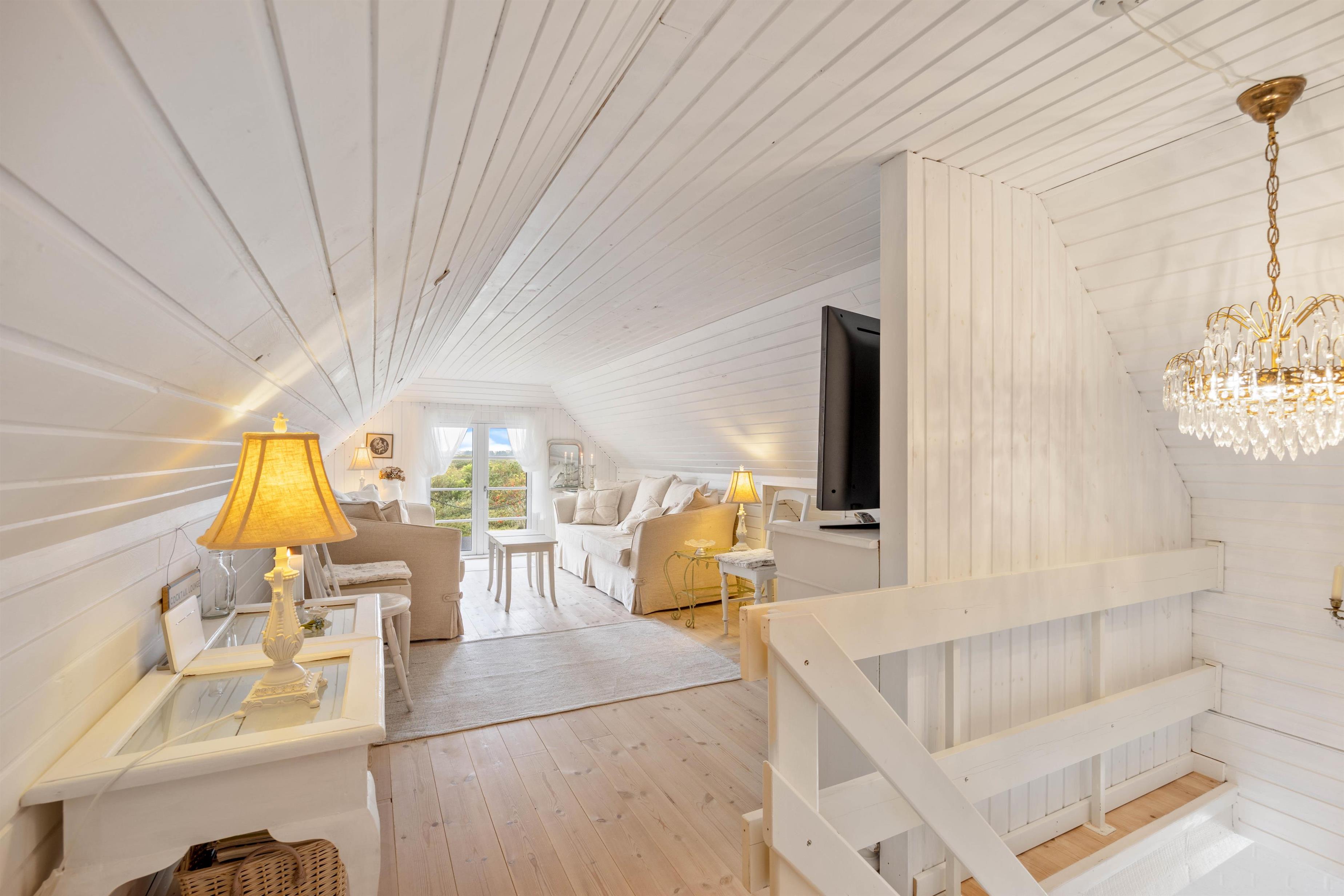 På øverste etage venter stuen med et fladskærms-tv. Der er installeret en varmepumpe, så I kan opvarme feriehuset på en energibesparende måde, og der er vaskemaskine og tørretumbler til rådighed, så I ikke løber tør for rent tøj.