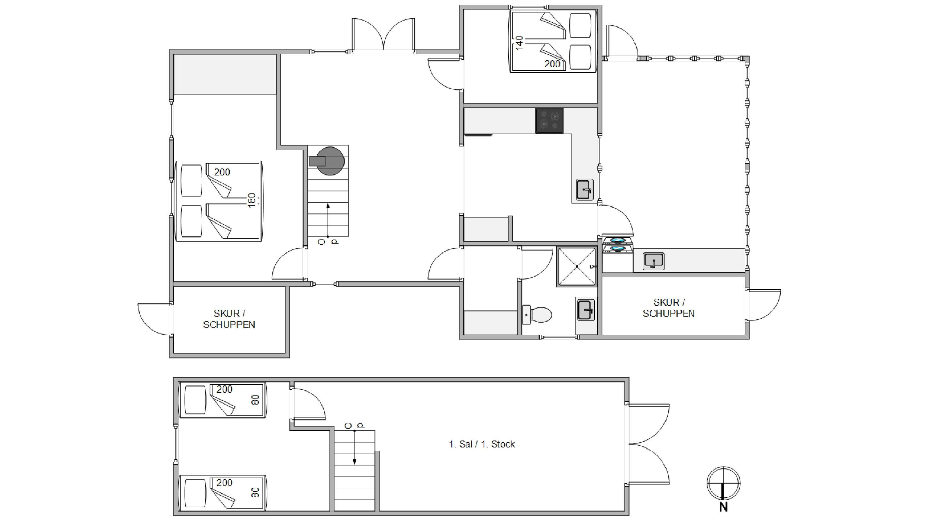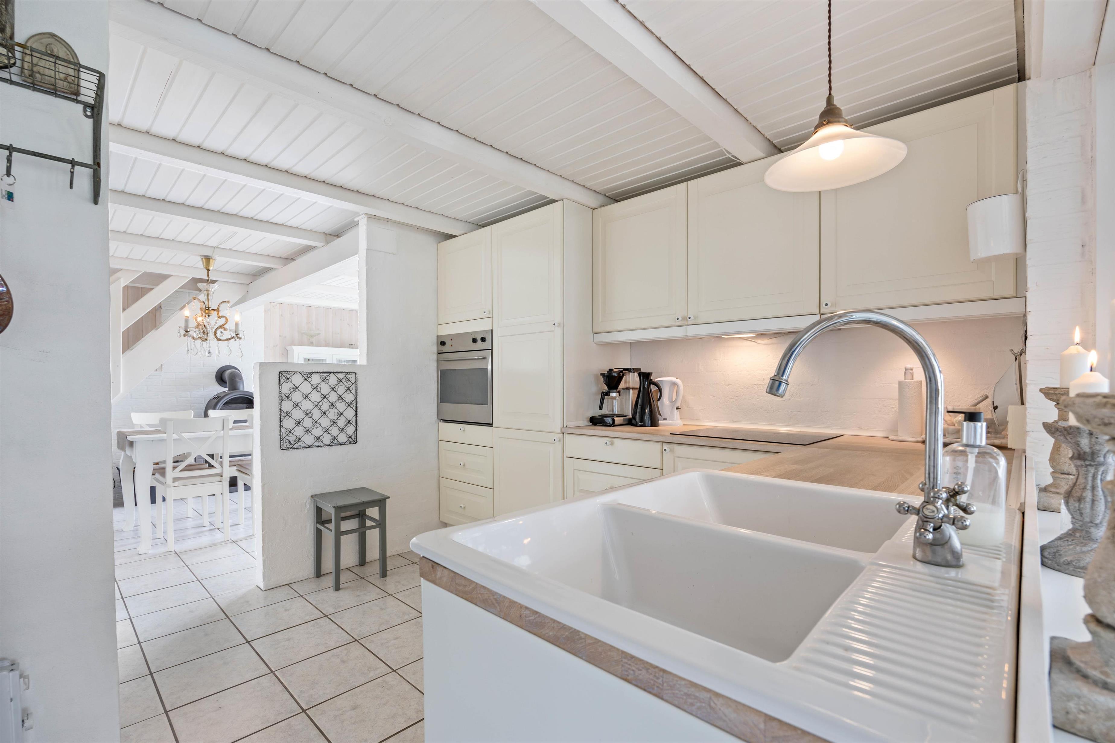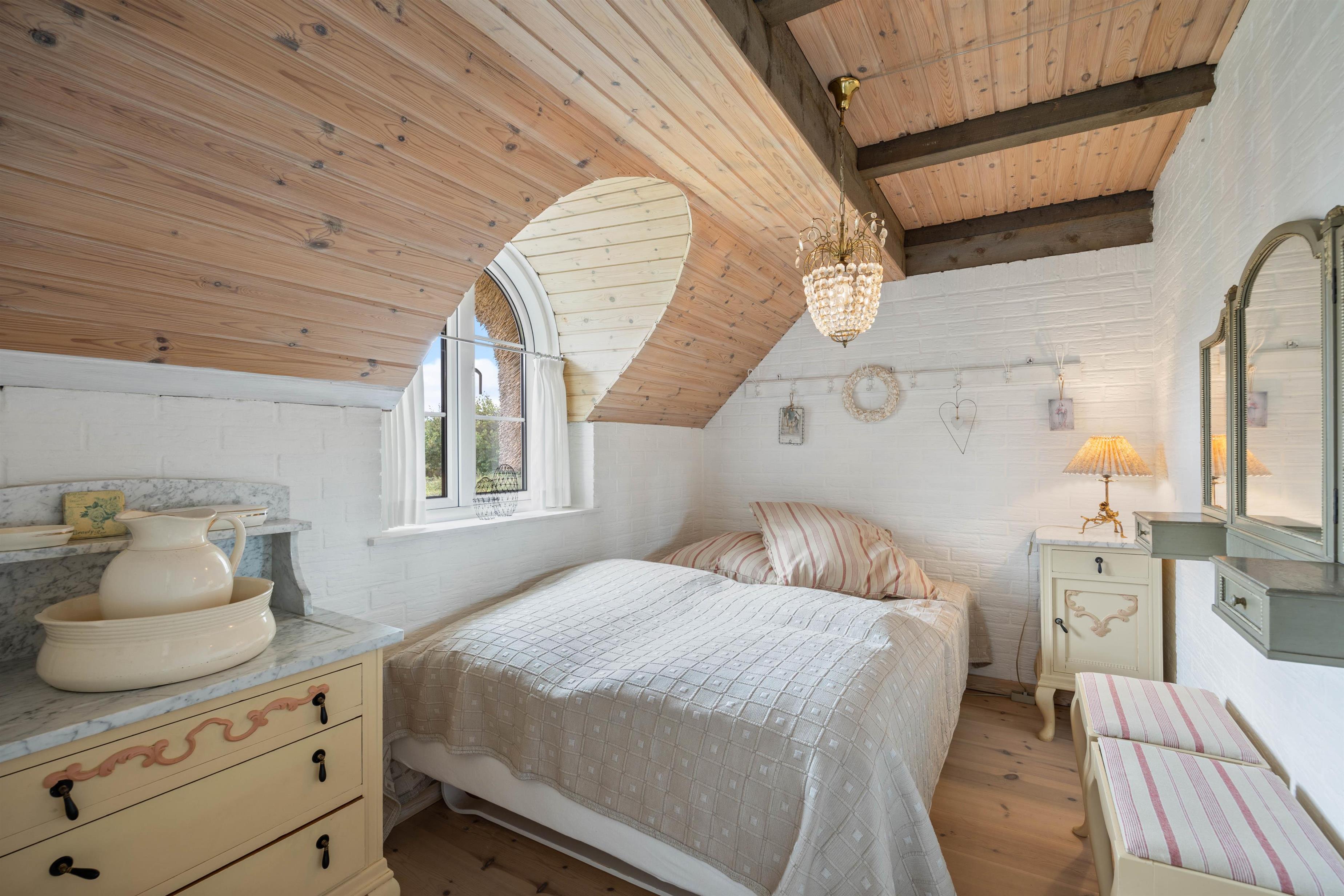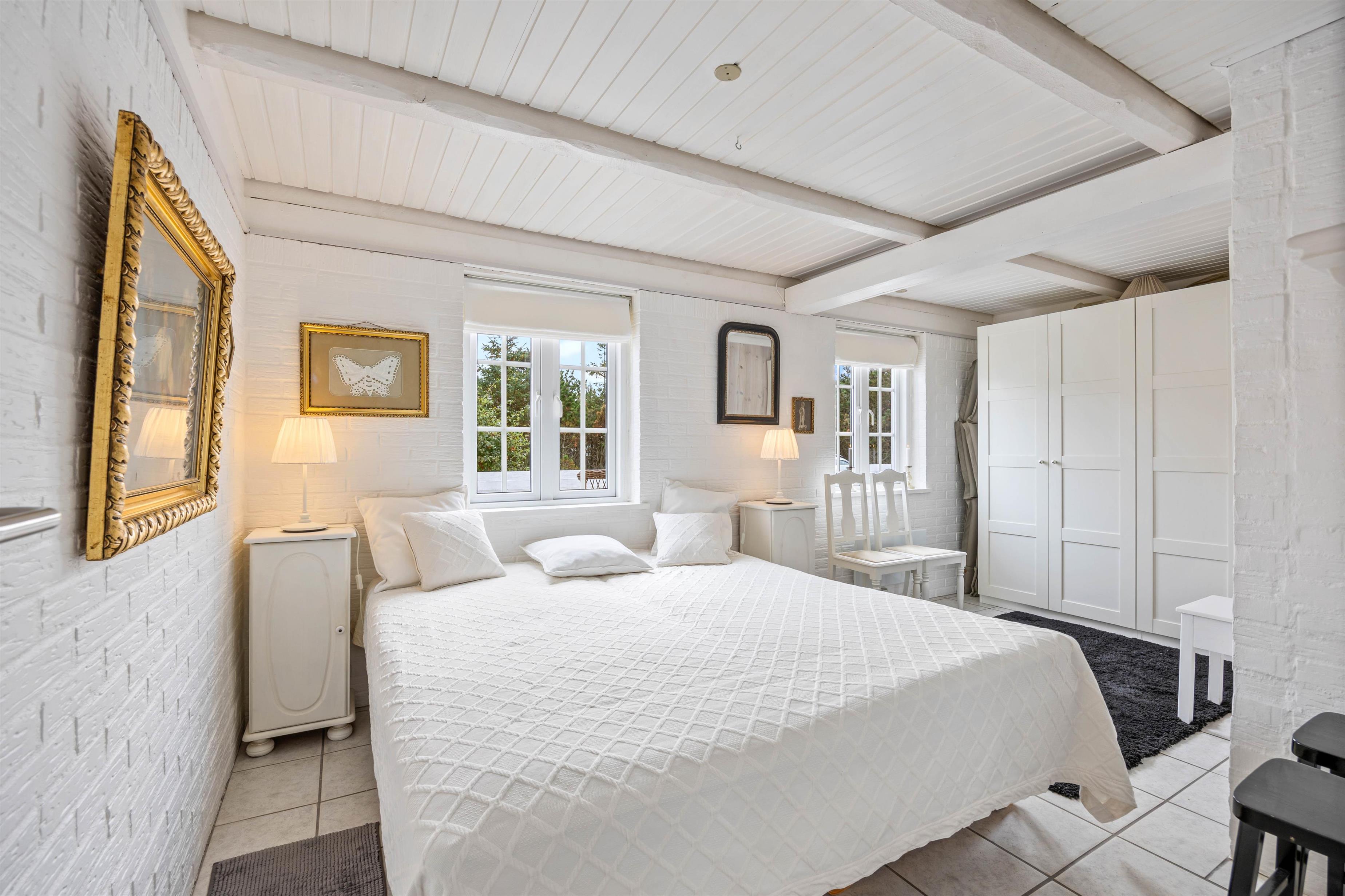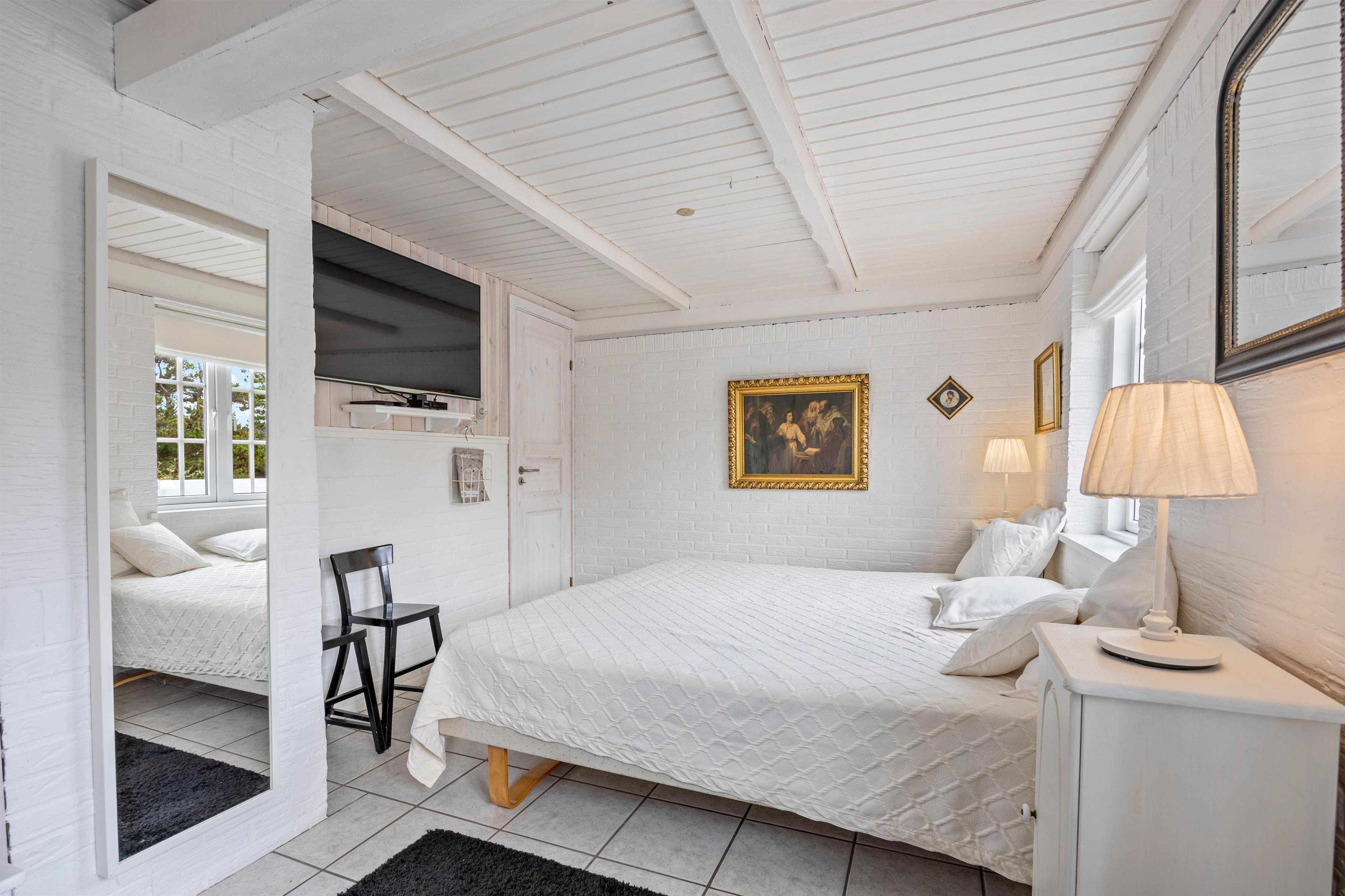 På øverste etage venter stuen med et fladskærms-tv. Der er installeret en varmepumpe, så I kan opvarme feriehuset på en energibesparende måde, og der er vaskemaskine og tørretumbler til rådighed, så I ikke løber tør for rent tøj.