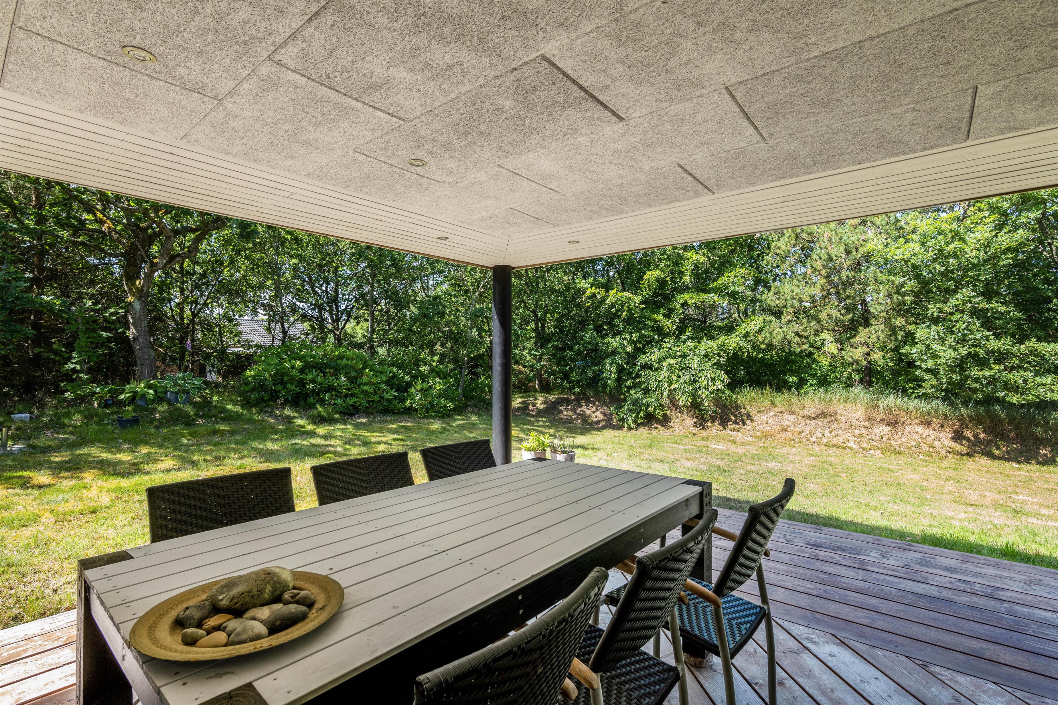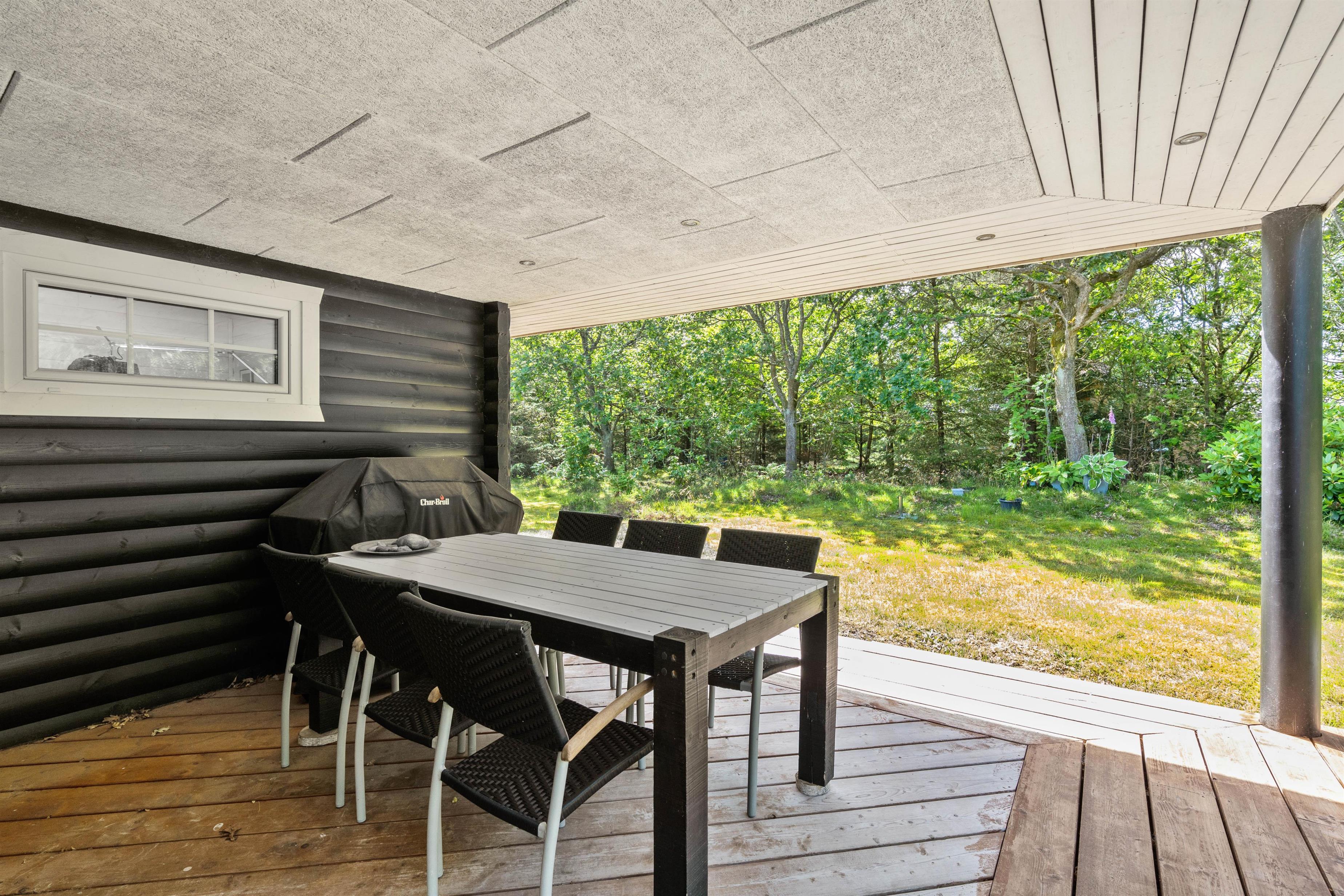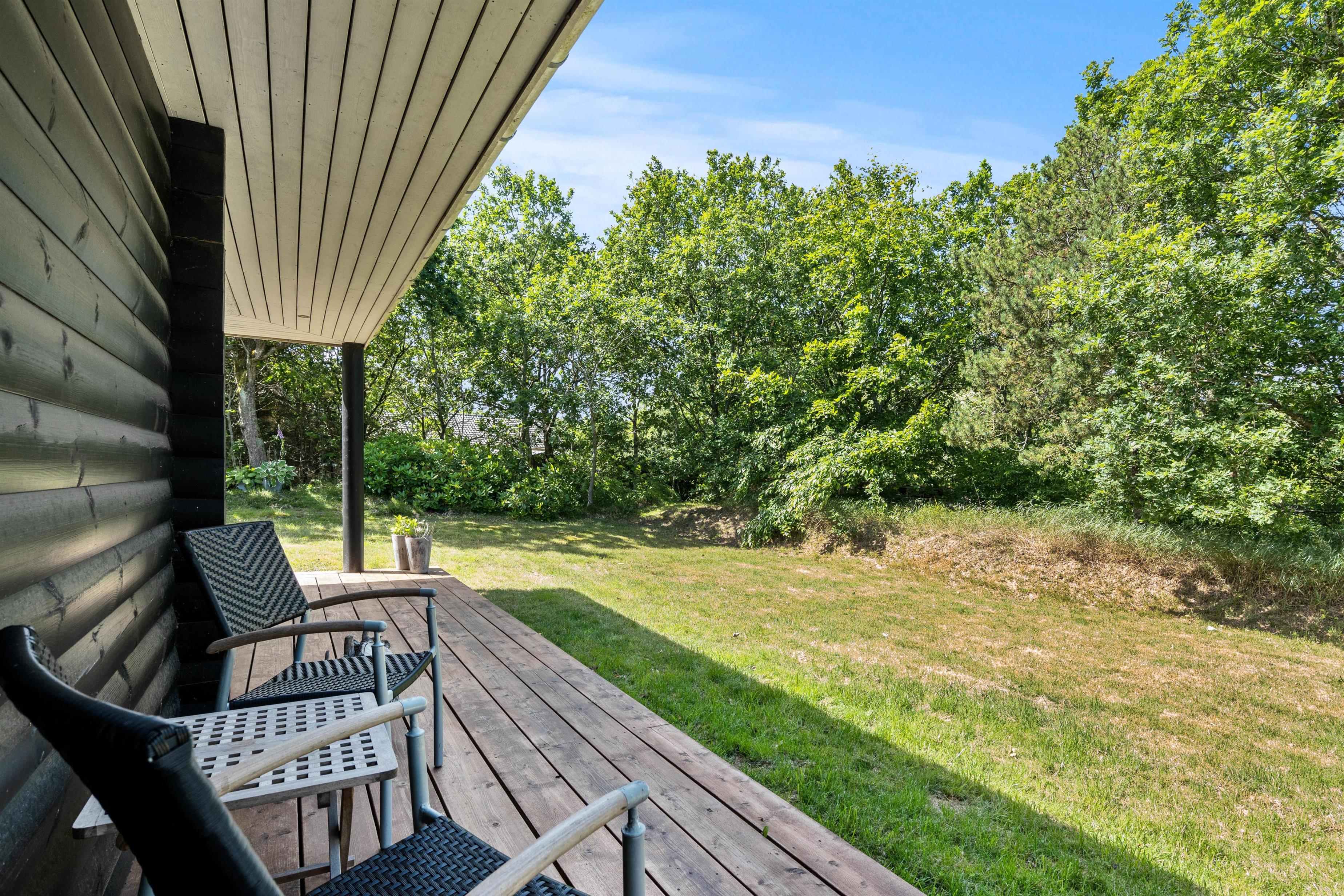 Omkring det meste af feriehuset løber en delvist overdækket og afskærmet træterrasse, som I kan tilbringe de varme feriedage på. Her kan I læne jer tilbage i havemøbler og liggestole, mens I kan nyde synet af den omkringliggende natur.