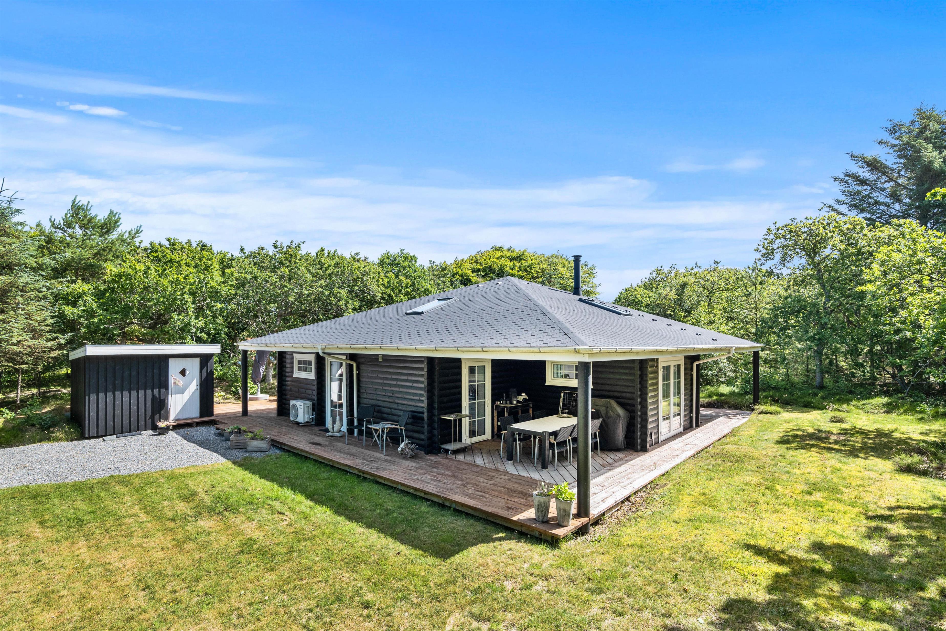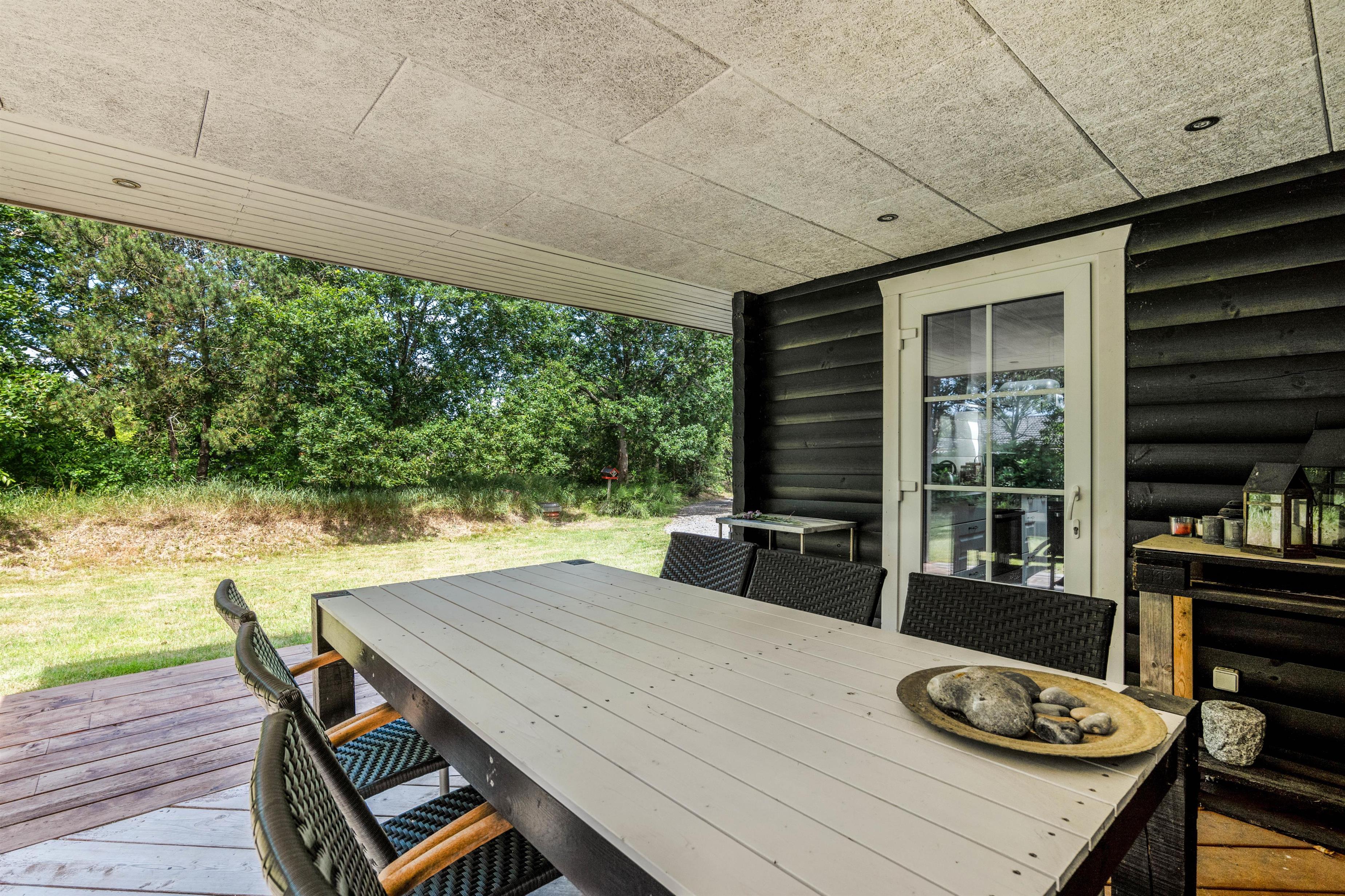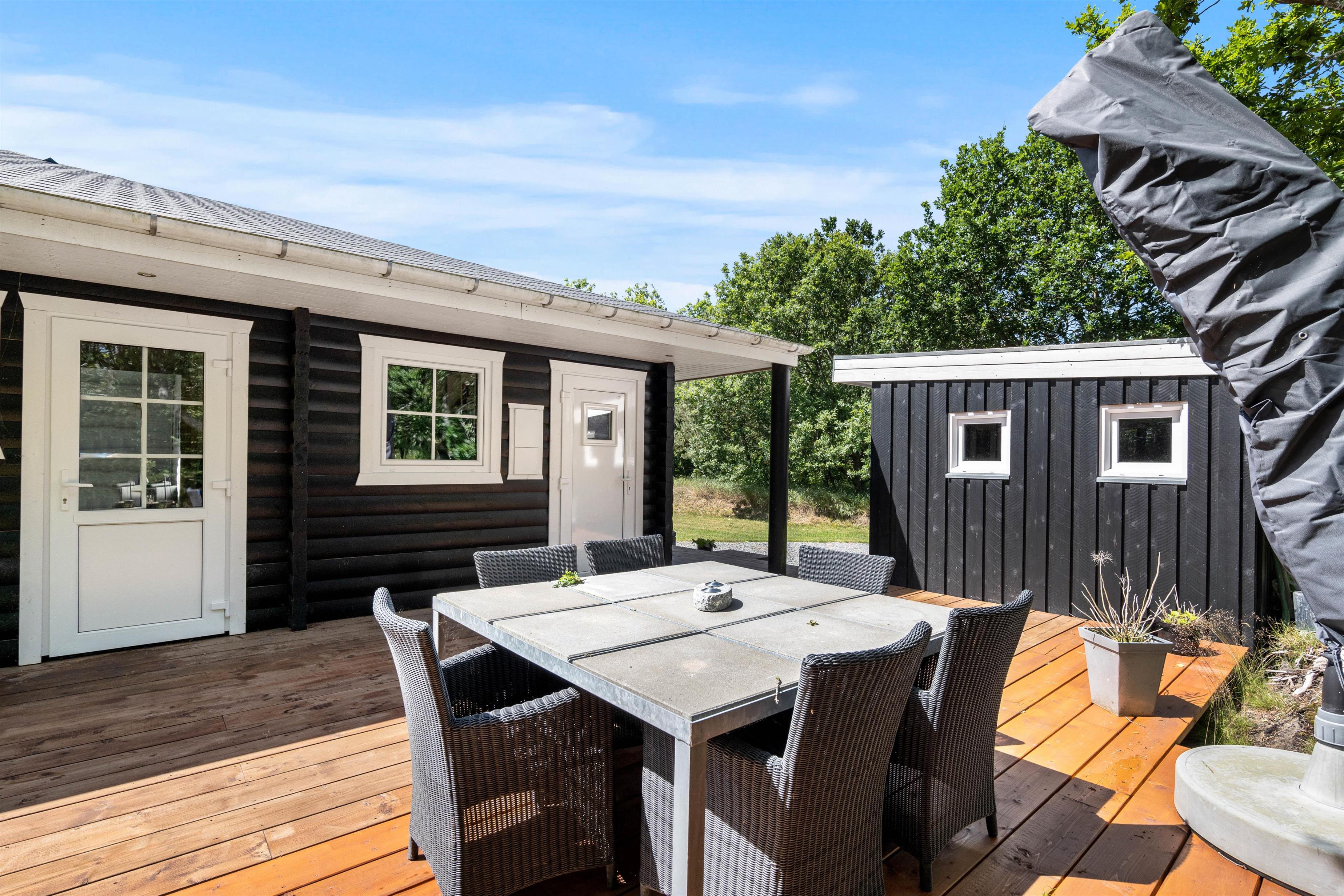 Omkring det meste af feriehuset løber en delvist overdækket og afskærmet træterrasse, som I kan tilbringe de varme feriedage på. Her kan I læne jer tilbage i havemøbler og liggestole, mens I kan nyde synet af den omkringliggende natur.