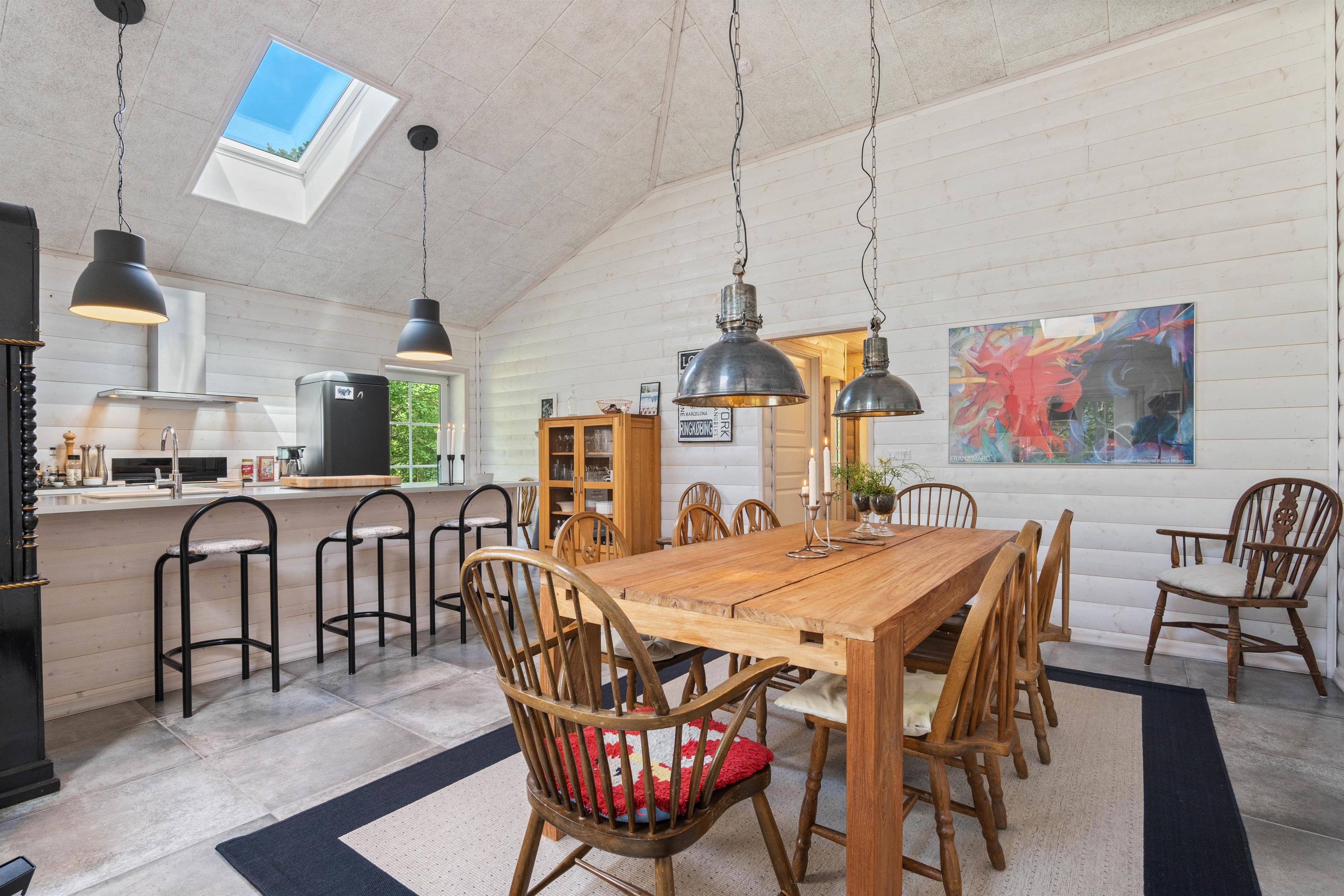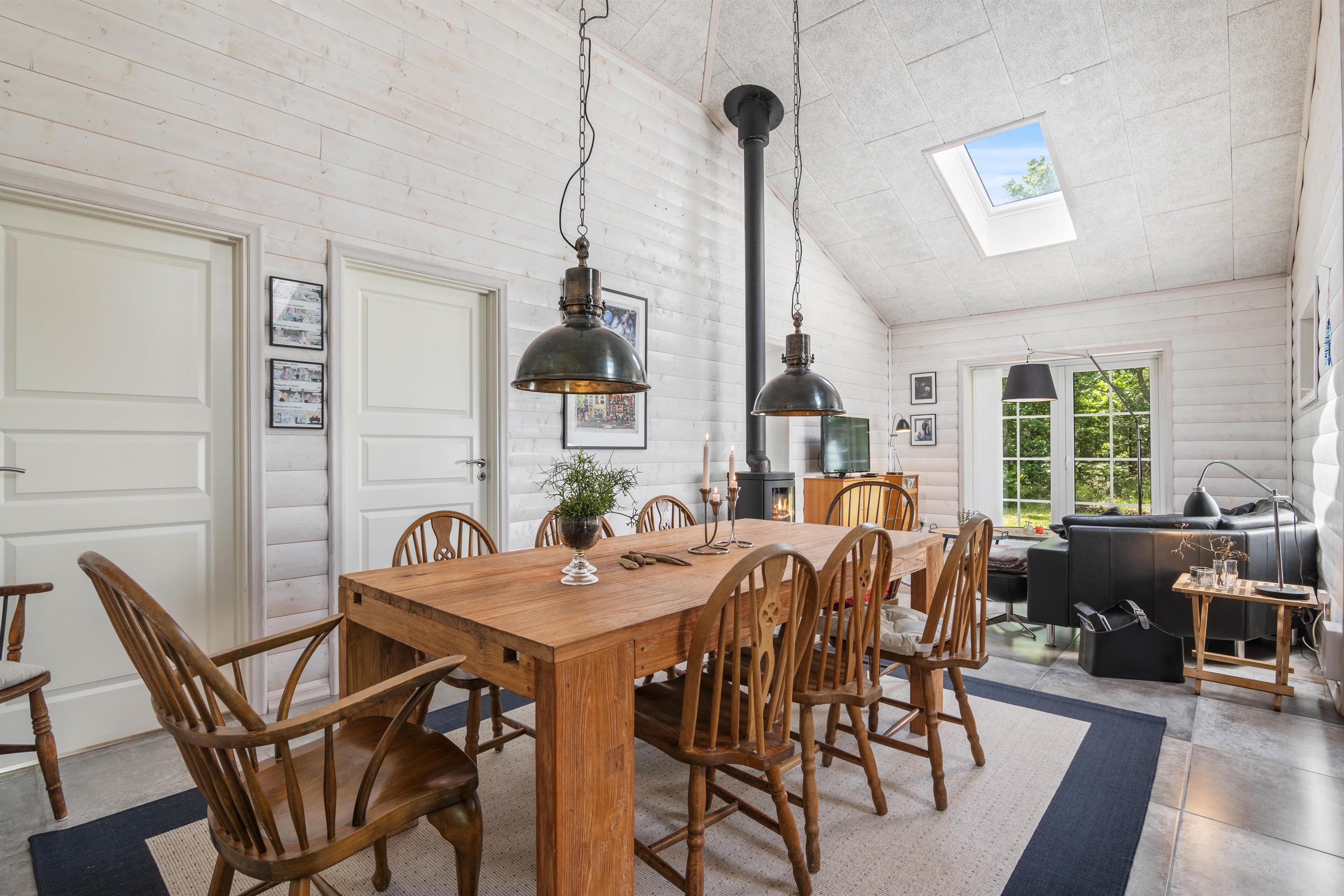 Køkken, stue og spiseplads er forenet i alrummet, som udgør feriehusets hjerte. Her kan I tilbringe hyggelige feriestunder med at lave mad, spille spil og se film. Imens I har gang i hyggelige ferieaktiviteter i alrummet, sørger brændeovnen for at fuldende feriestemningen. Desuden er der også gulvvarme i alrummet.