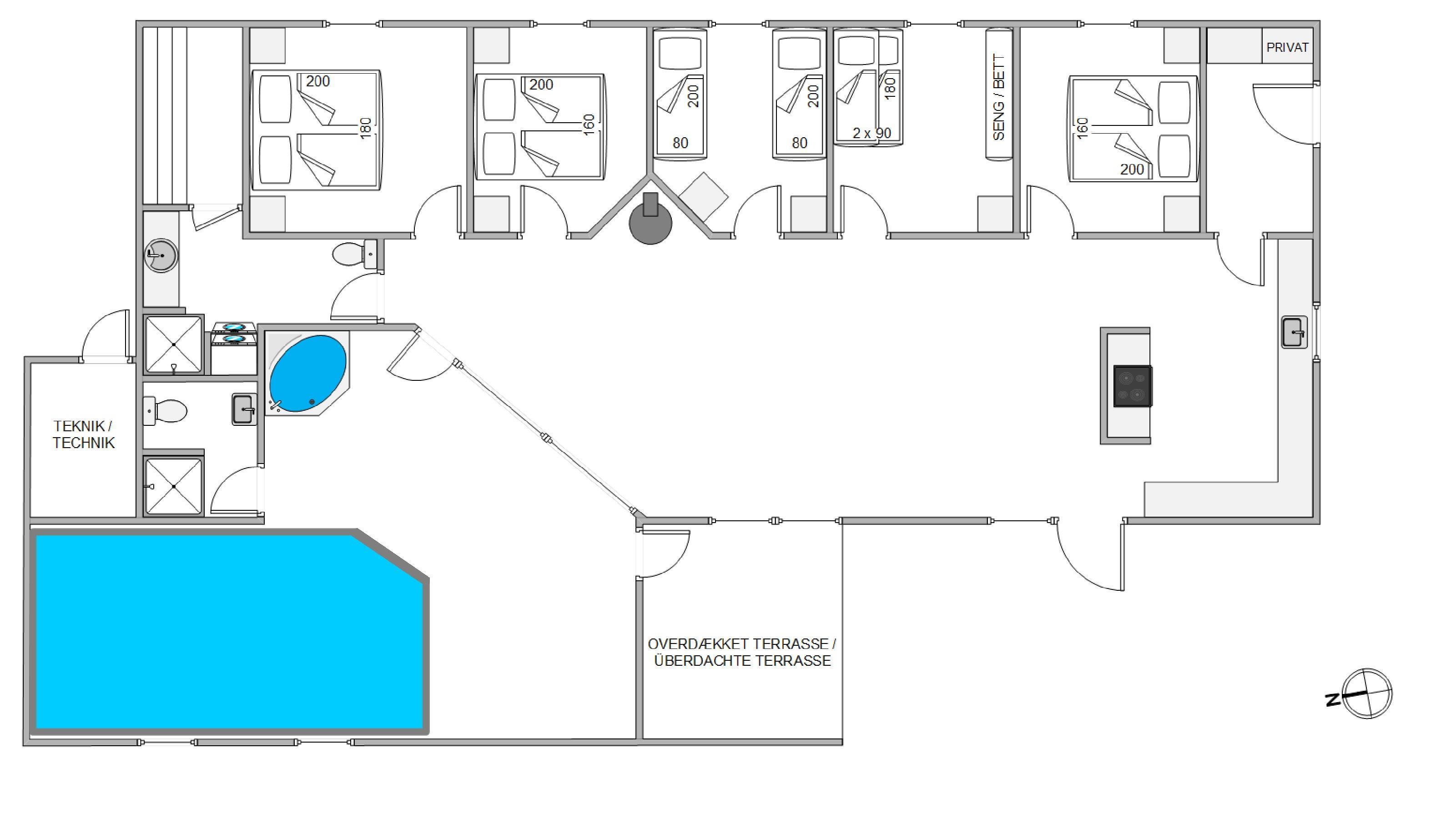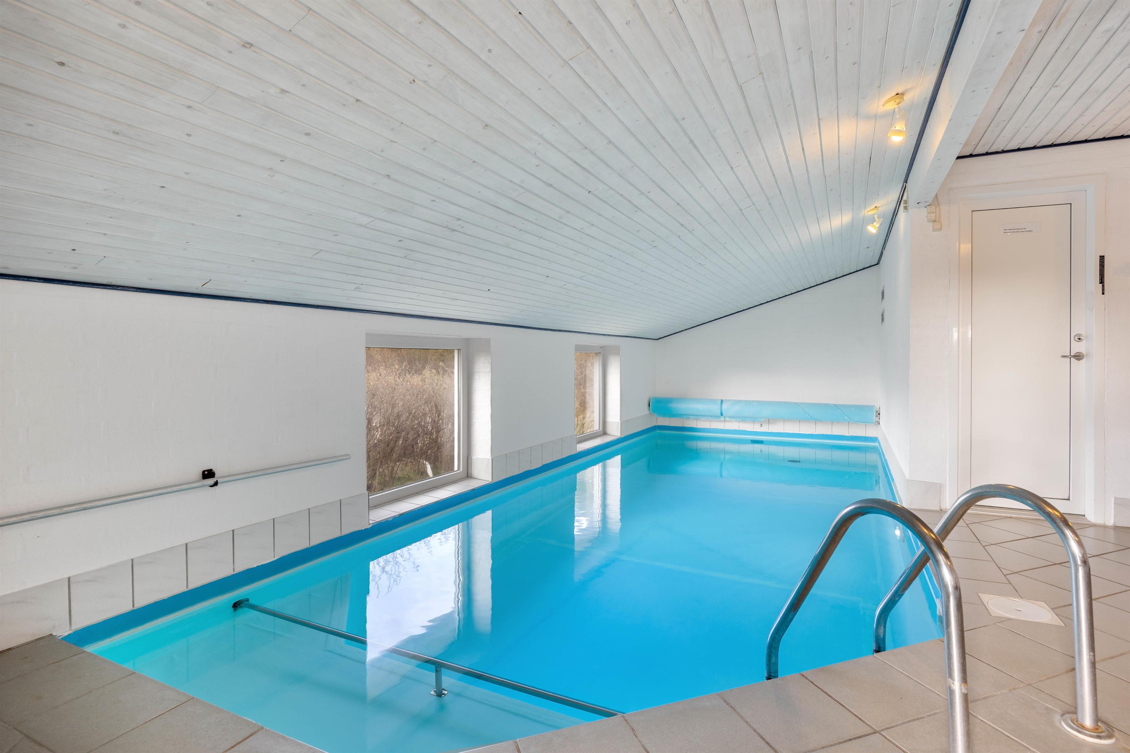 Der er et separat rum med pool og spaområde. Her ligges der op til at være sammen, have det sjovt i poolen eller nyde en afslappende tur i spabadet. Poolen har et lille område med 30 cm dybt, vand som giver frihed for de mindste. Resten af poolen er 120 cm. dyb. Dette sommerhus er det oplagte valg til jer, som ønsker at være aktive sammen og lade jer underholde af de fantastiske muligheder med et skønt vandområde.