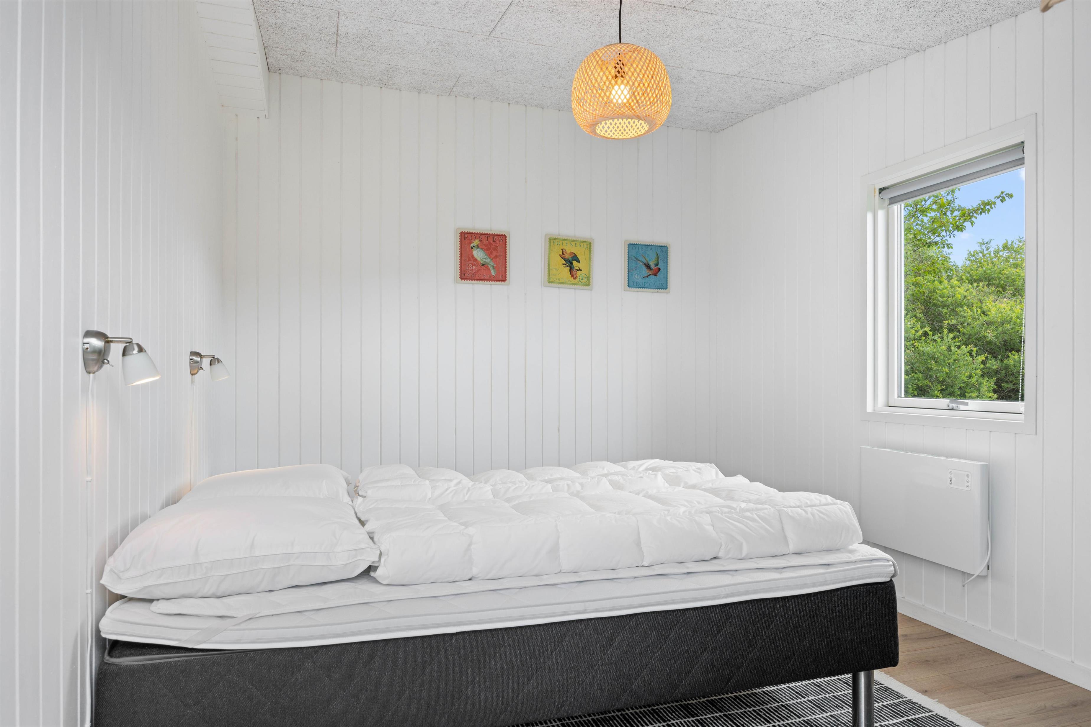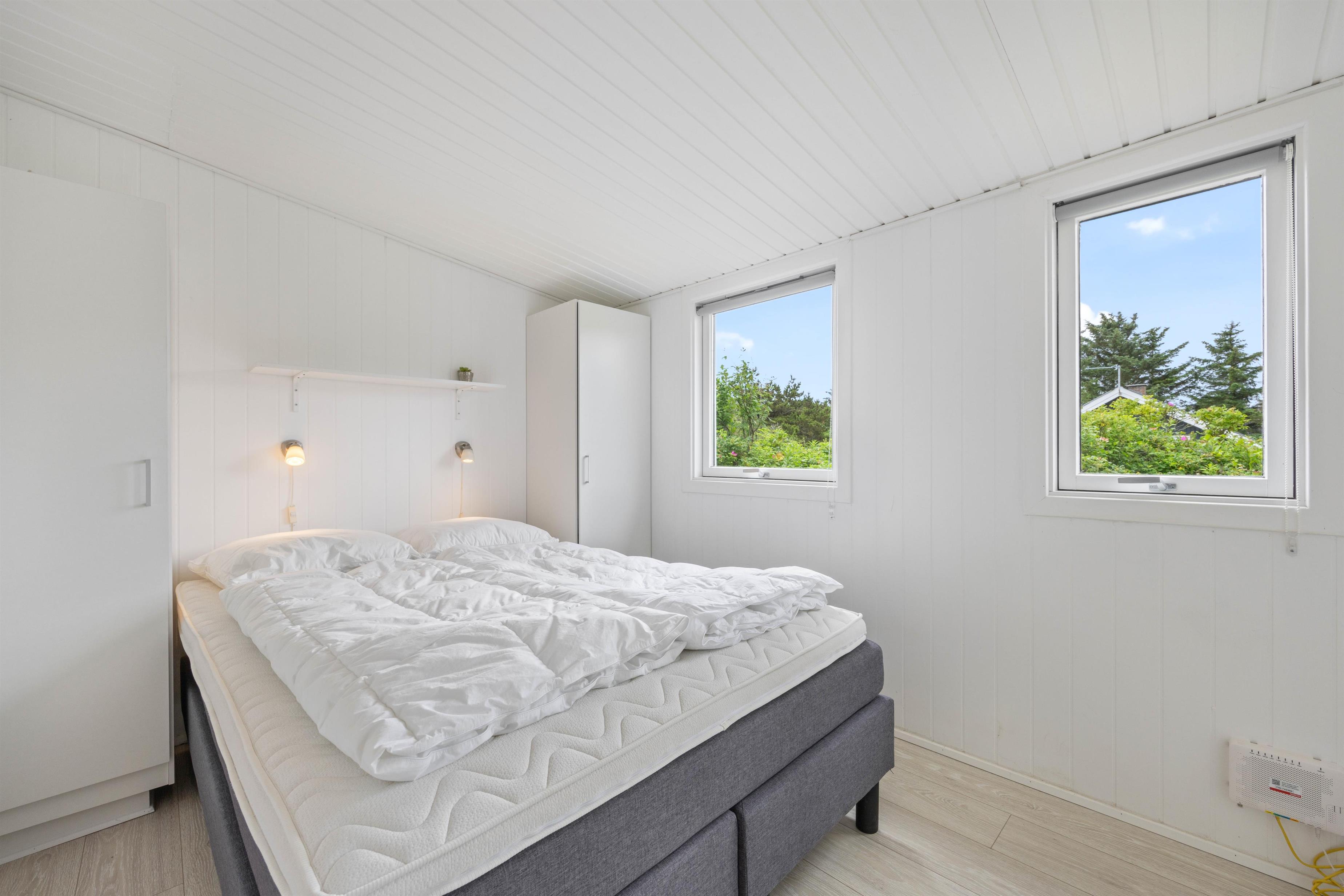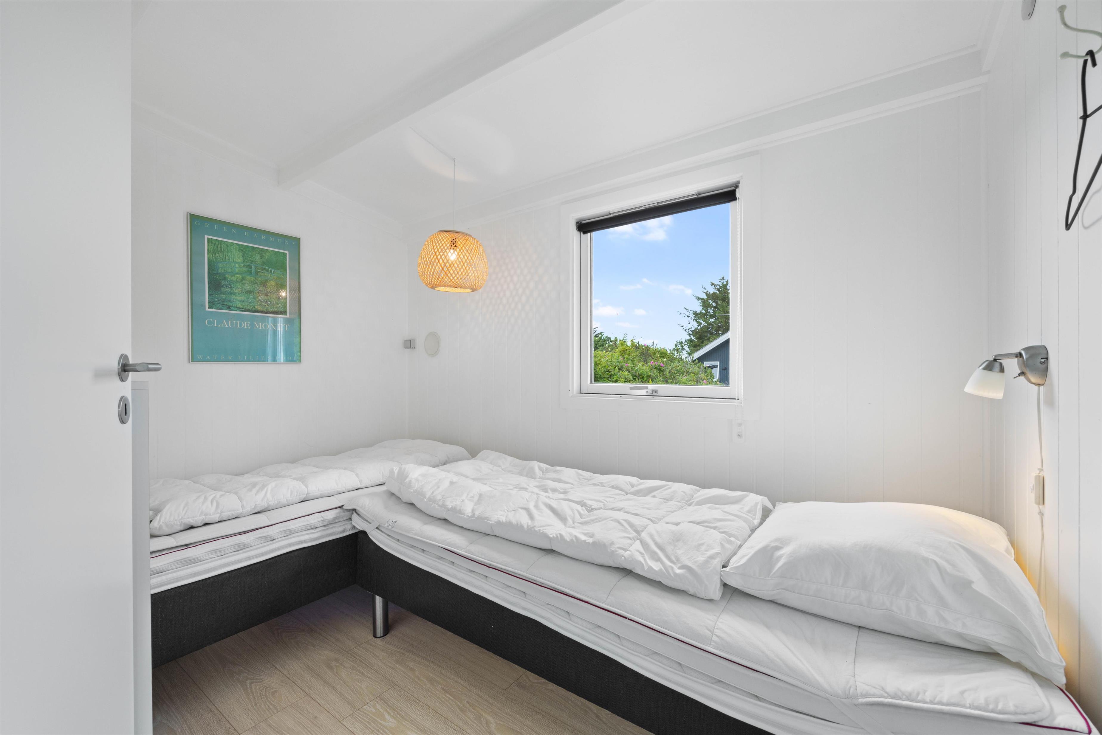 Lige så snart I træder ind i dette 48 kvadratmeter sommerhus, vil I straks føle jer hjemme. Her er lyst og venligt indrettet med mulighed for kvalitetstid. Om aftenen når I har brug for at lade batterierne op, kan I dele de 3 værelser imellem jer. Så I kan få en god nats søvn, og være friske og veloplagte til en ny god feriedag. 2 af soveværelserne er indrettet med en dobbeltseng, og det sidste soveværelse er indrettet med to enkeltsenge.