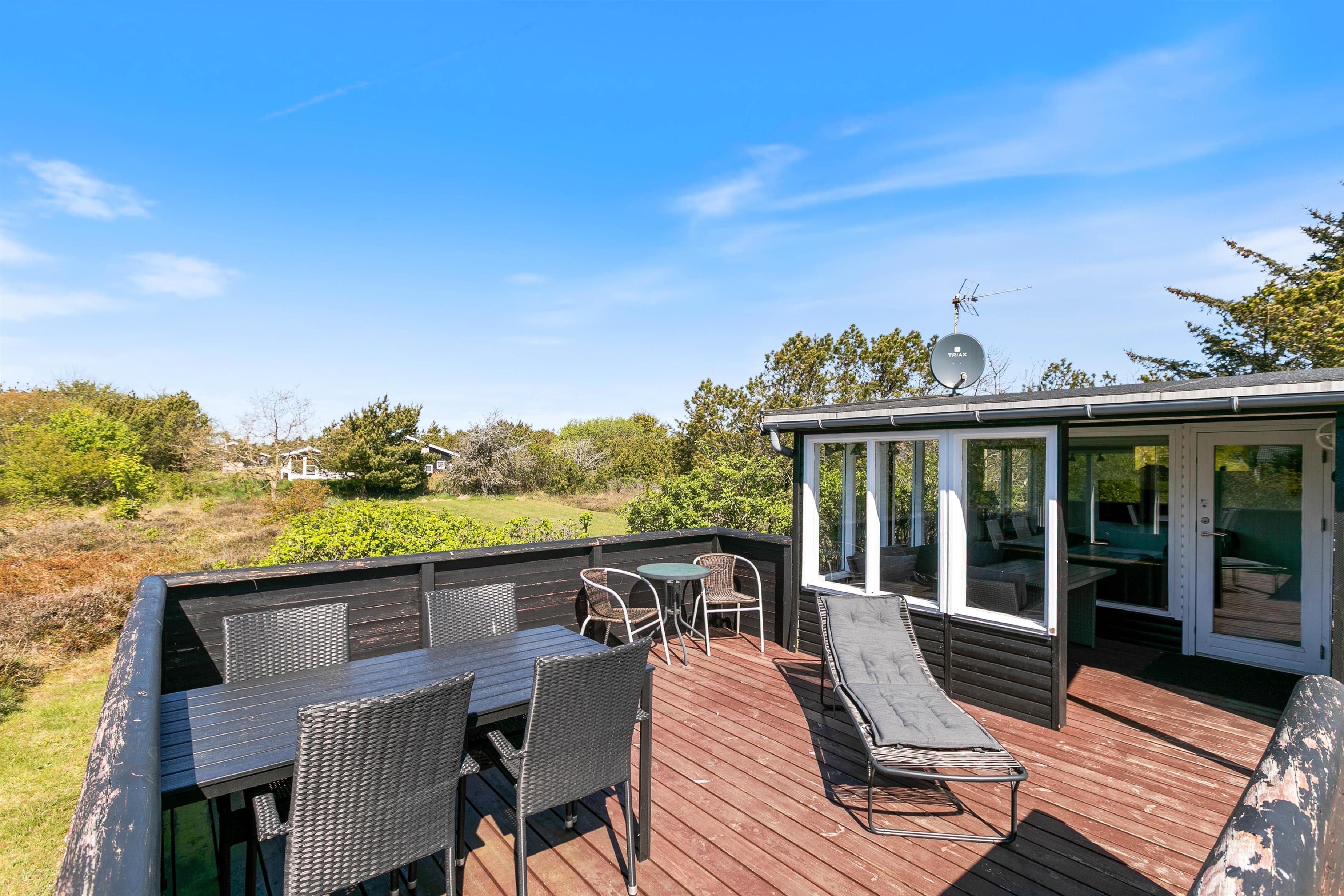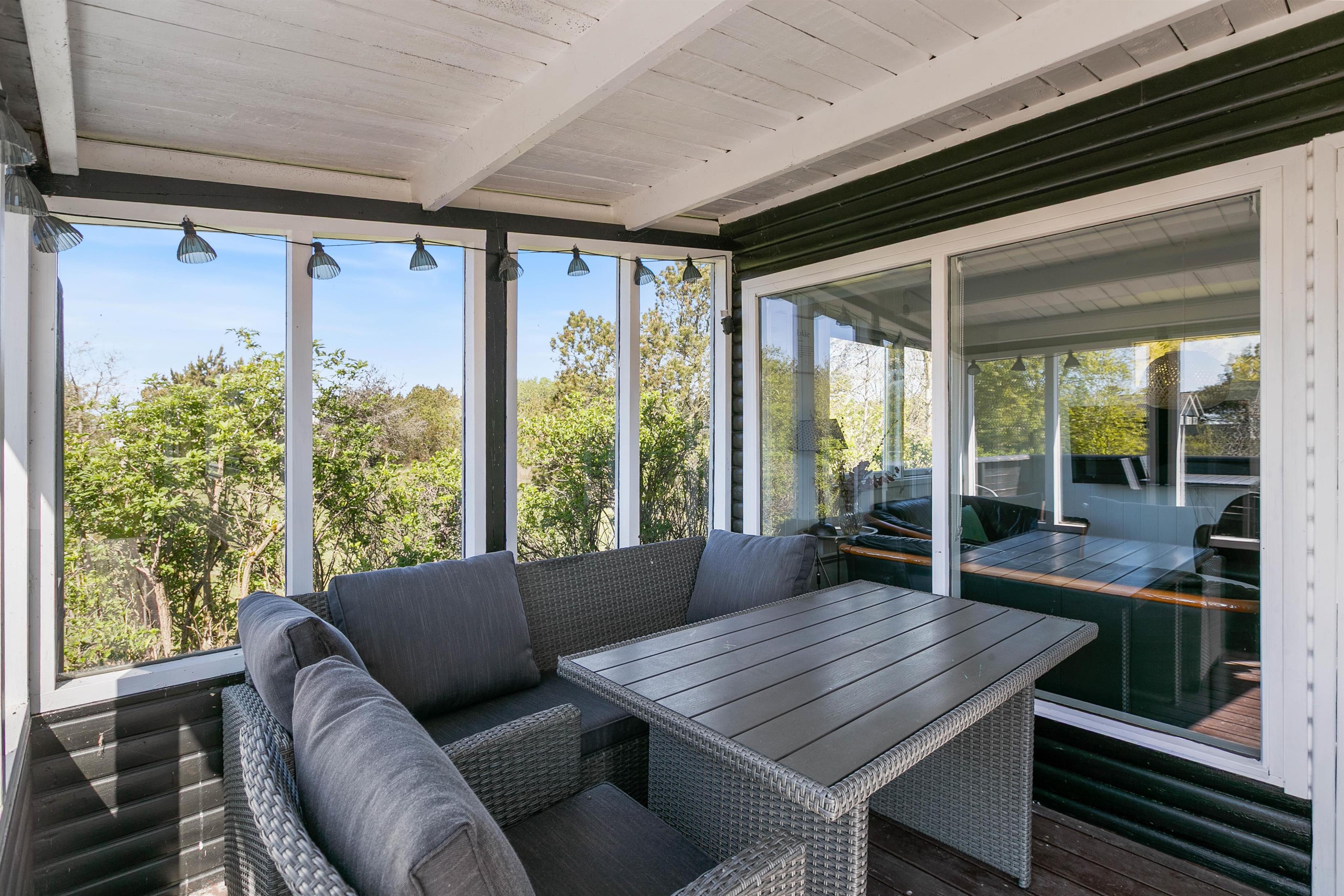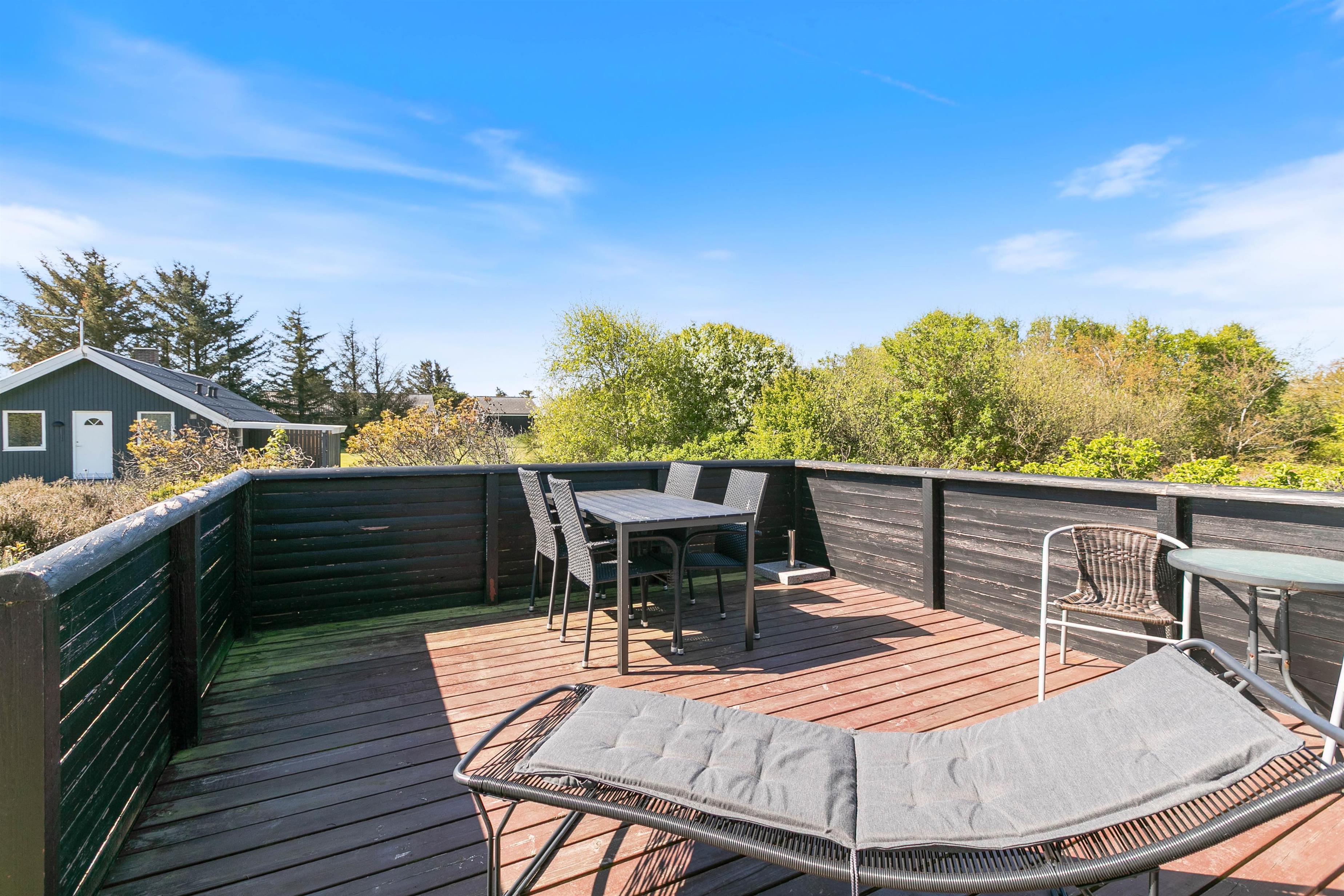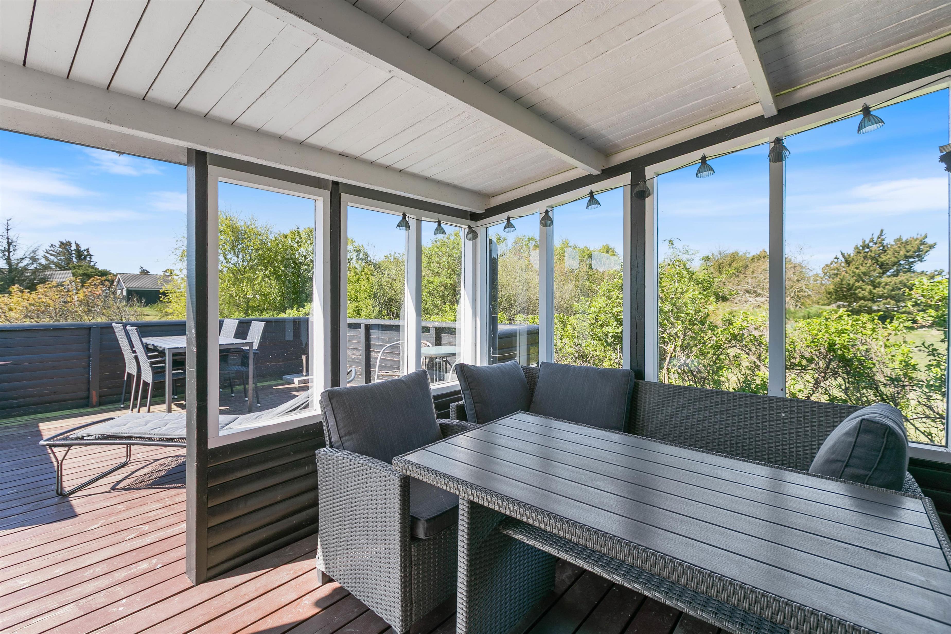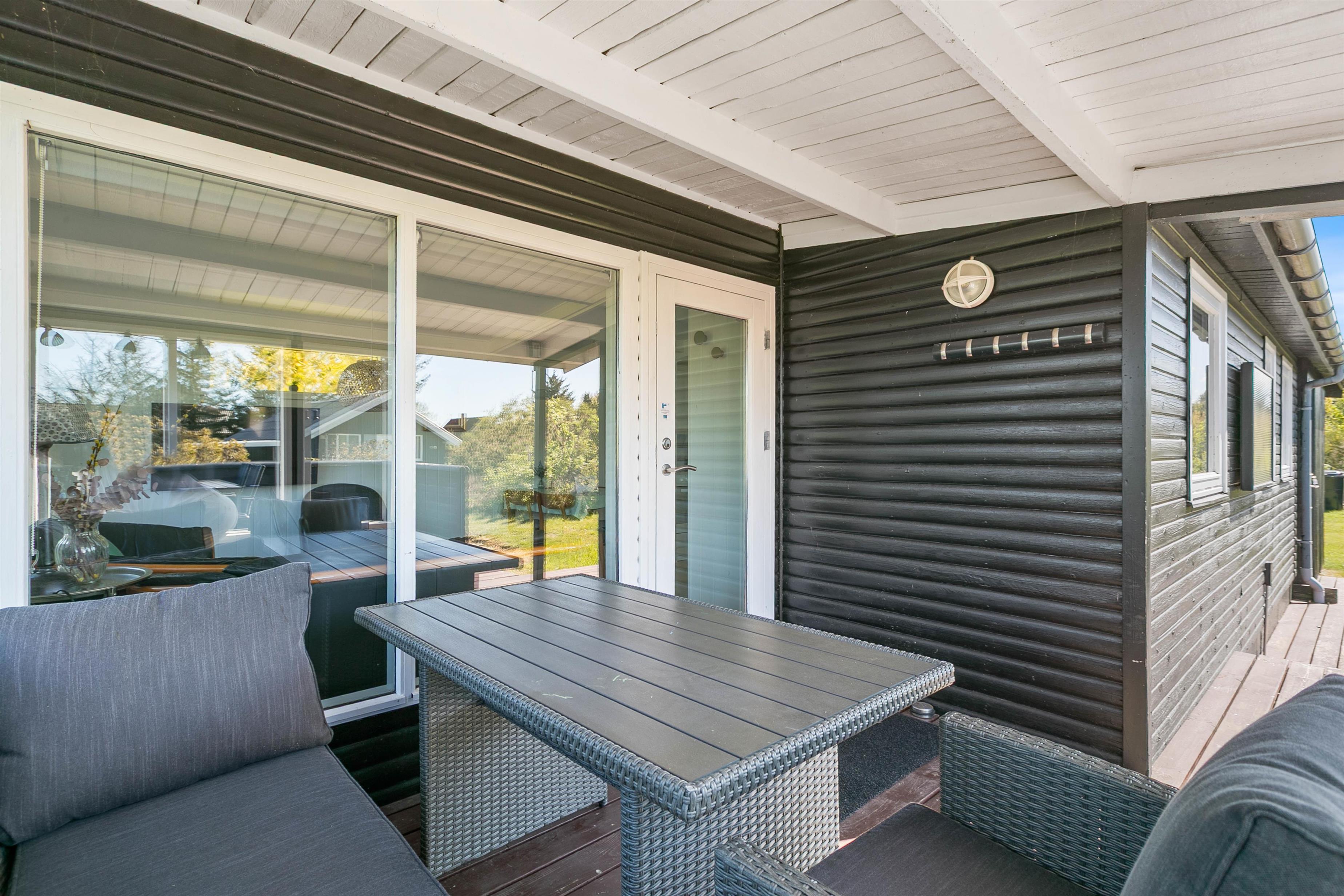 På de varmere feriedage er det oplagt at trække ud på sommerhusets tilhørende terrasse. Terrassen er delt op i 2 afdelinger, hvoraf den ene er overdækket, afskærmet og næsten helt lukket. Den anden del er afskærmet og lukket men under åben himmel, så I kan nyde det dejlige vejr. I kan med fordel slå parasollen op og nye et godt tilberedt mål over grillen i skyggen.