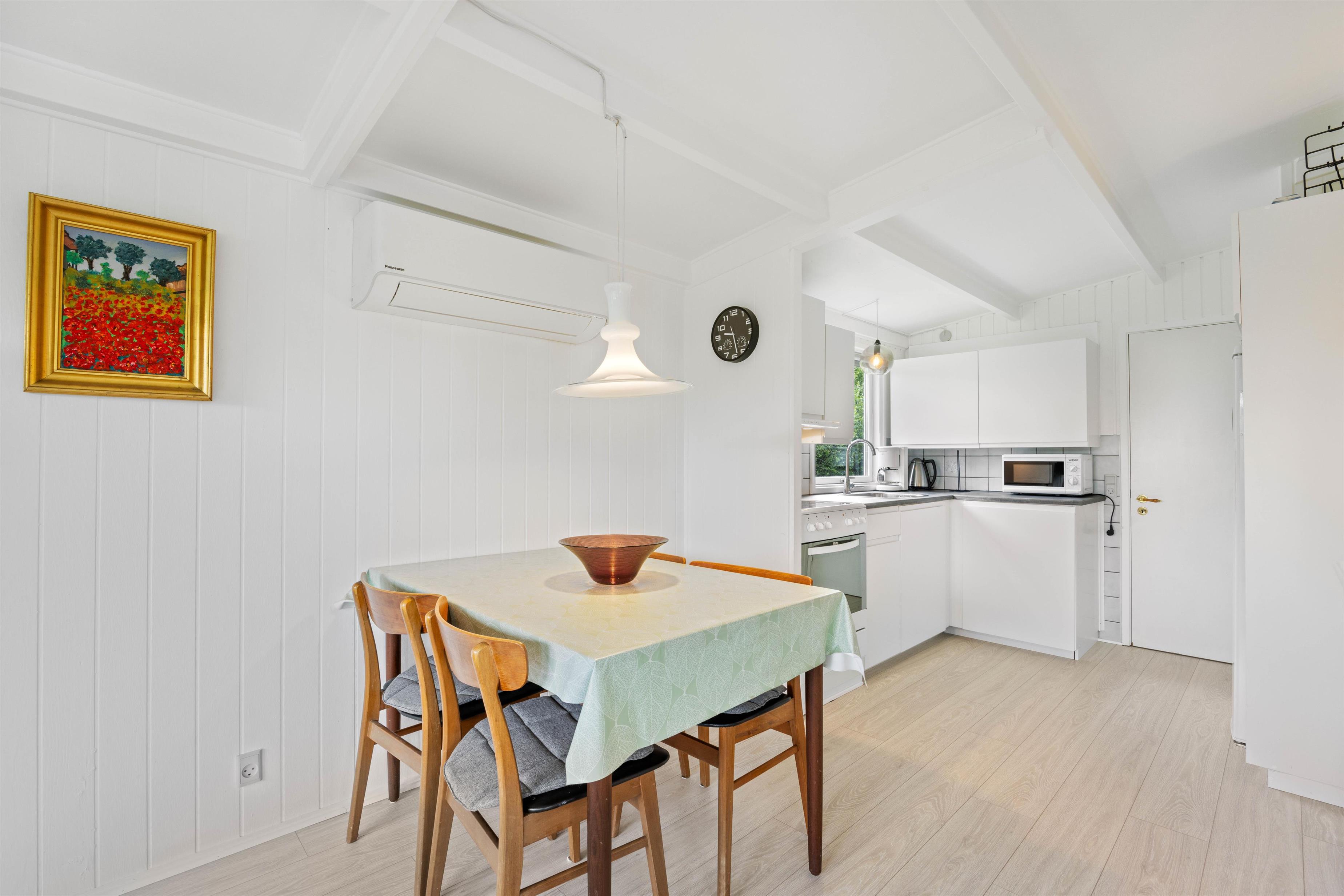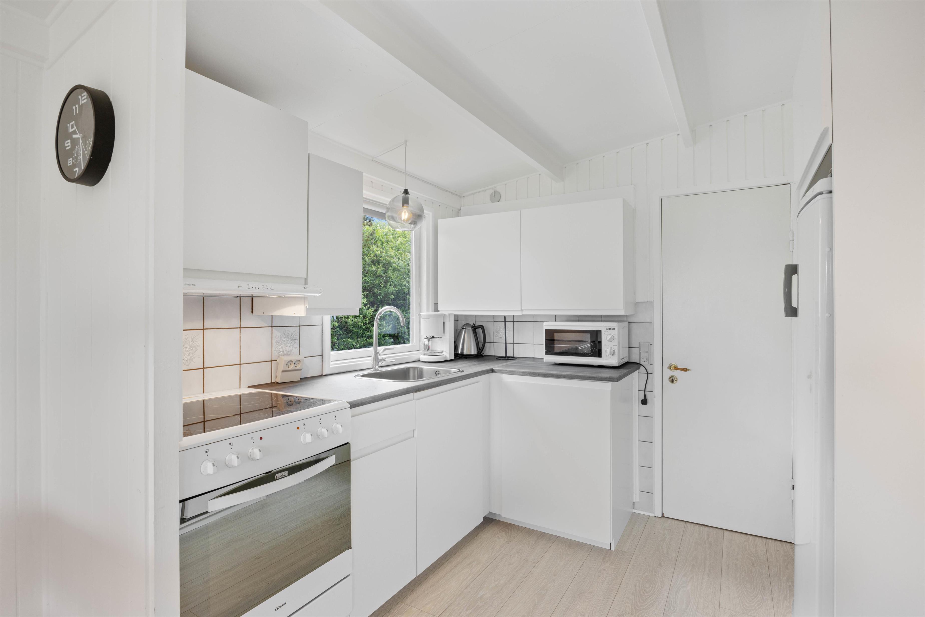 Køkkenet ligger i åben forbindelse med stuen, så her har I rig mulighed for at være sammen, uanset om nogle står og tilbereder et lækkert måltid mad, og andre sidder i stuen, og planlægger feriens næste aktiviteter.