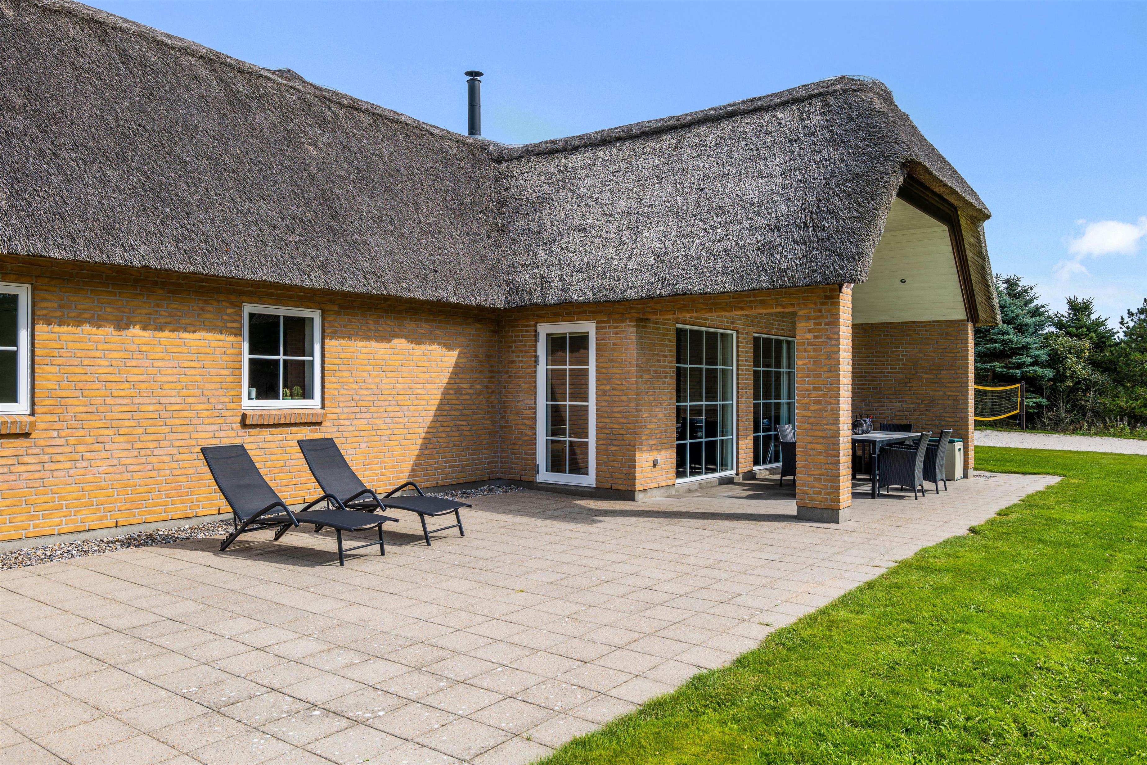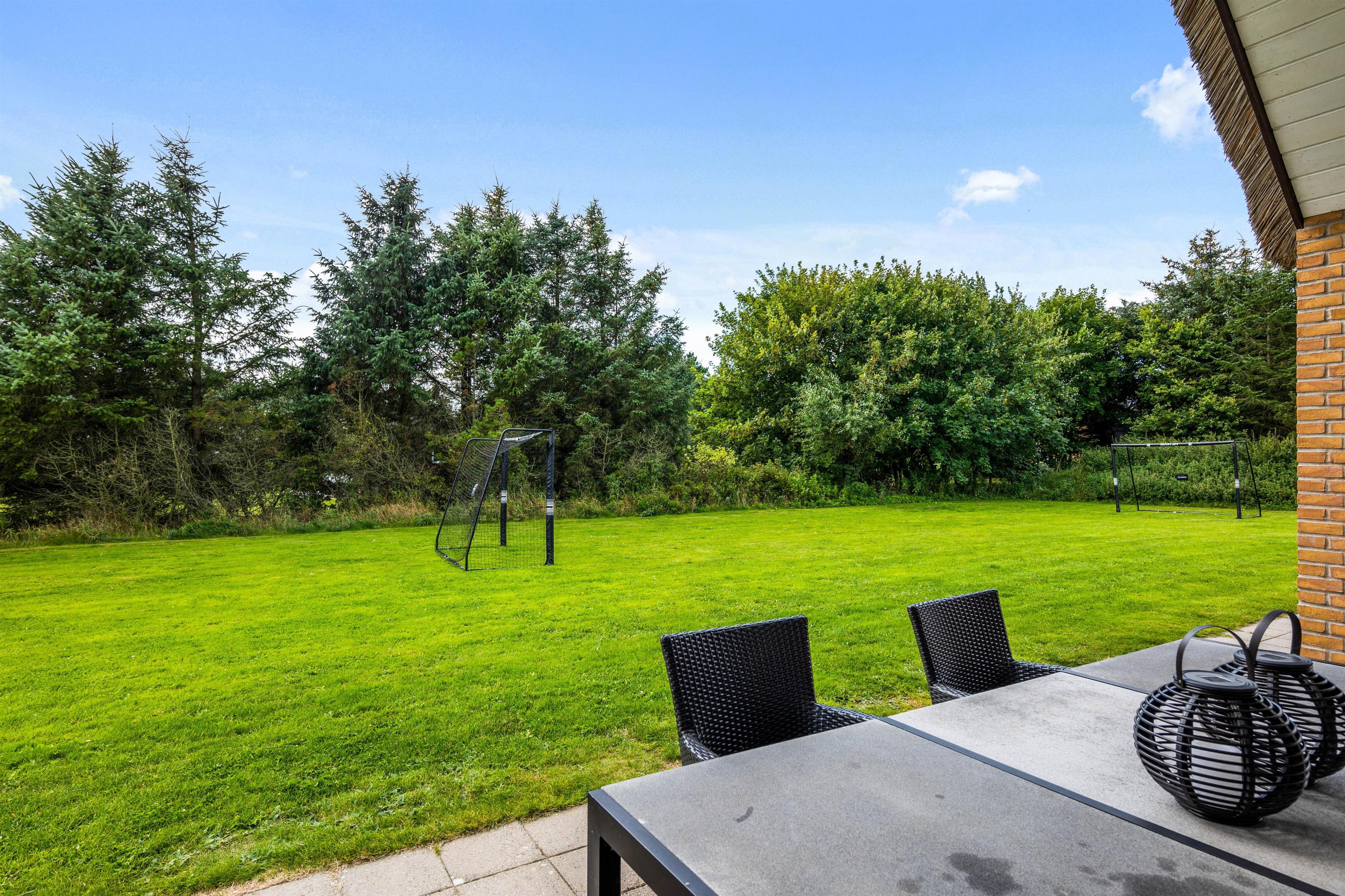 Feriehuset har flere skønne terrasser, hvor der kan findes både sol og læ det meste af dagen. Endvidere er der en 15 m2 overdækket terrasse. Grunden er en kombination af fri natur og græsplæne, som giver gode muligheder for boldspil og leg. For eksempel er der på grunden både gyngestativ, en fodboldbane og en beach volley-bane. Både hus og grund er særdeles børne- og hundevenlig.