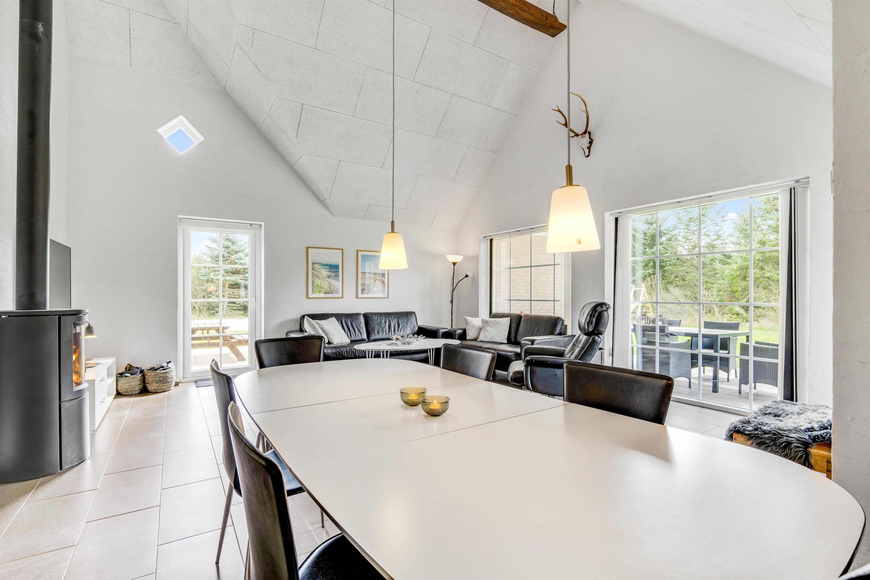 Stuen er smagfuldt indrettet og med dejligt flisegulv. Der er bl.a. et stort fladskærms-TV samt en DVD-afspiller. Her er desuden højt til loftet og lyst, hvilket er med til at skabe en dejlig stemning. Den gode og dejlige stemning kan suppleres med brændeovnen, der med sit knitrende flammehav kan tilføje masser af varme og hygge.