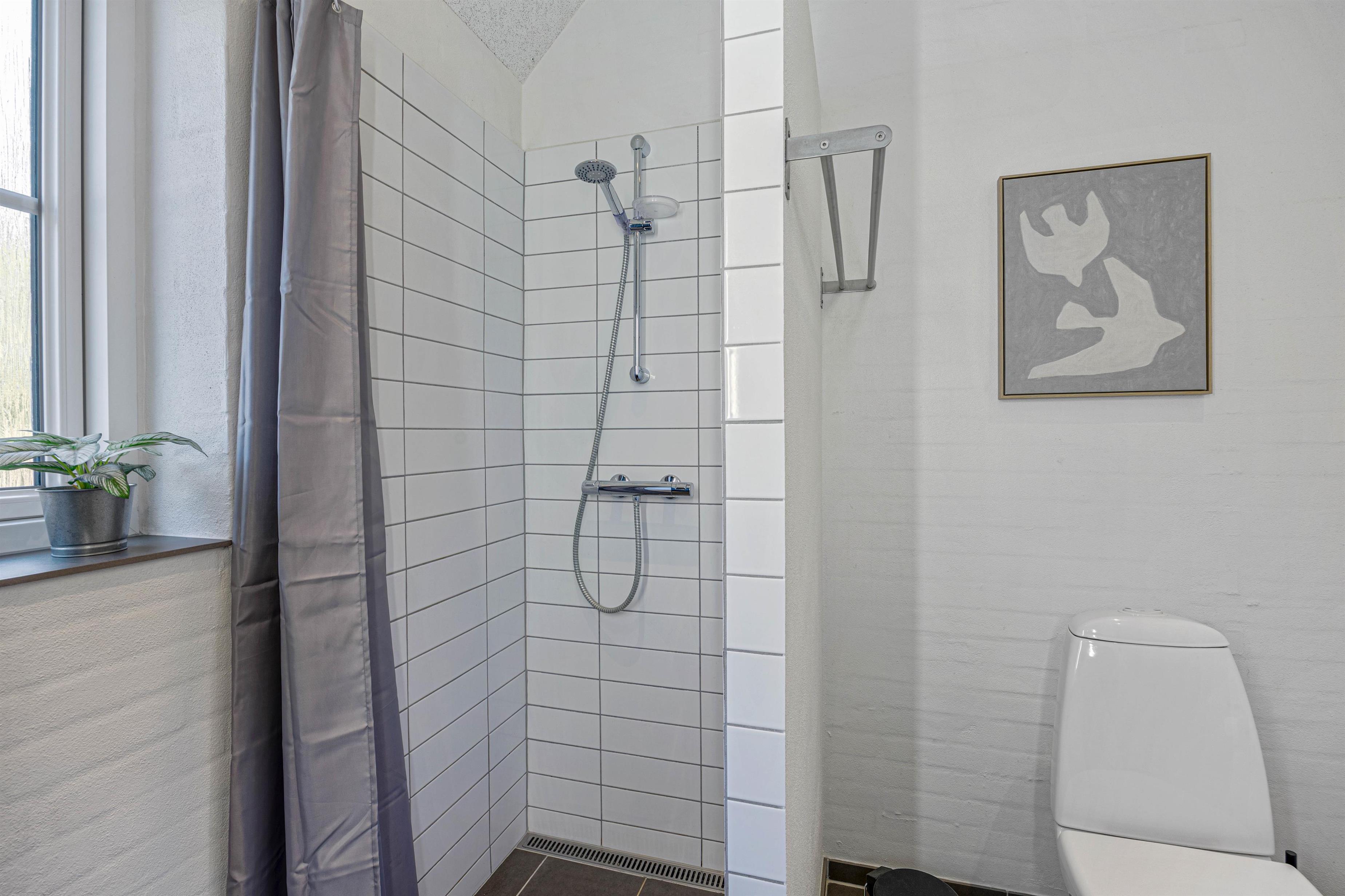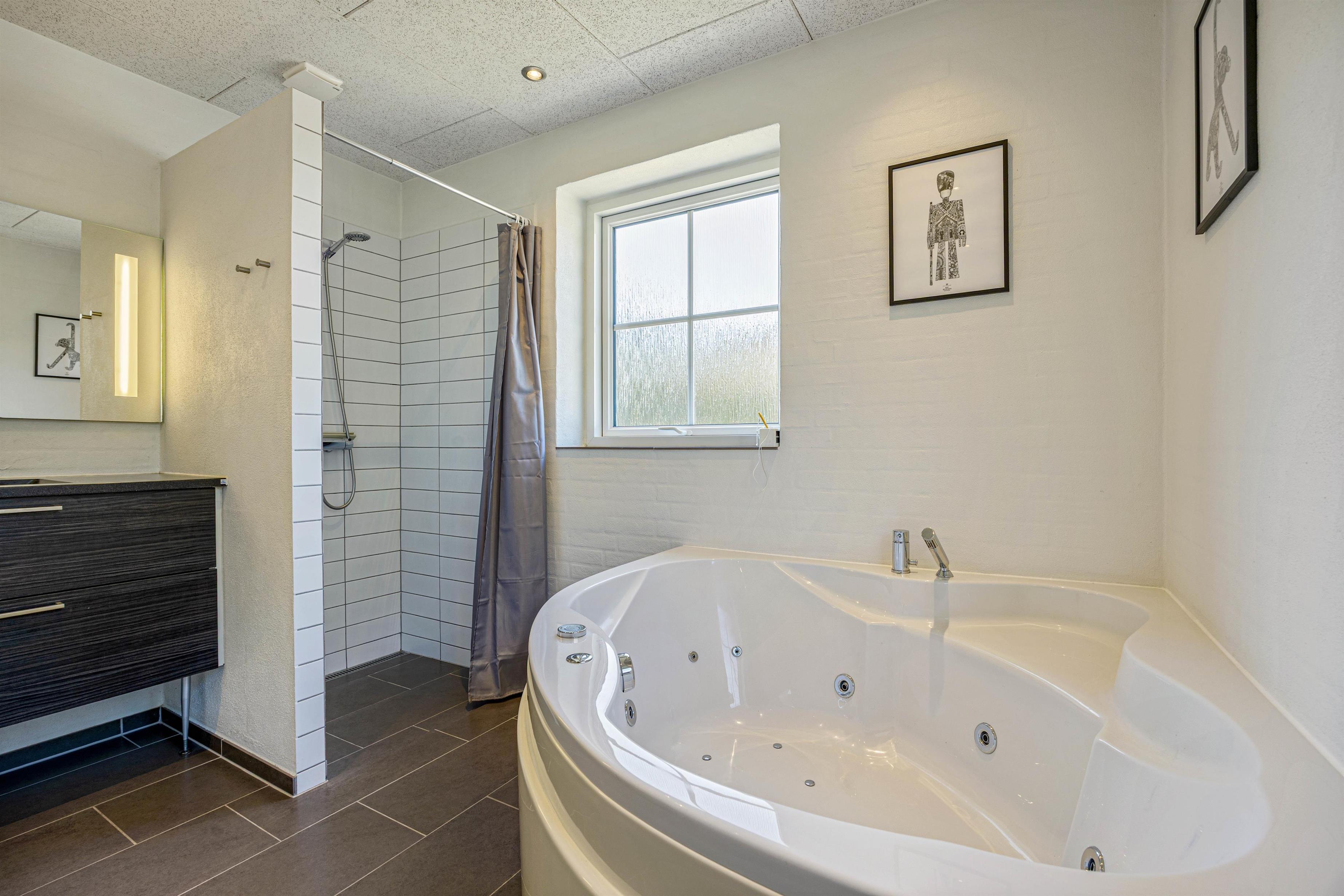 Begge badeværelser er indrettet med lækker bruseniche og gulvvarme, og på det store badeværelse finder I desuden et dejligt hjørnespabad. Sommerhuset er udstyret med vaskemaskine, tørretumbler og gratis trådløst internet.