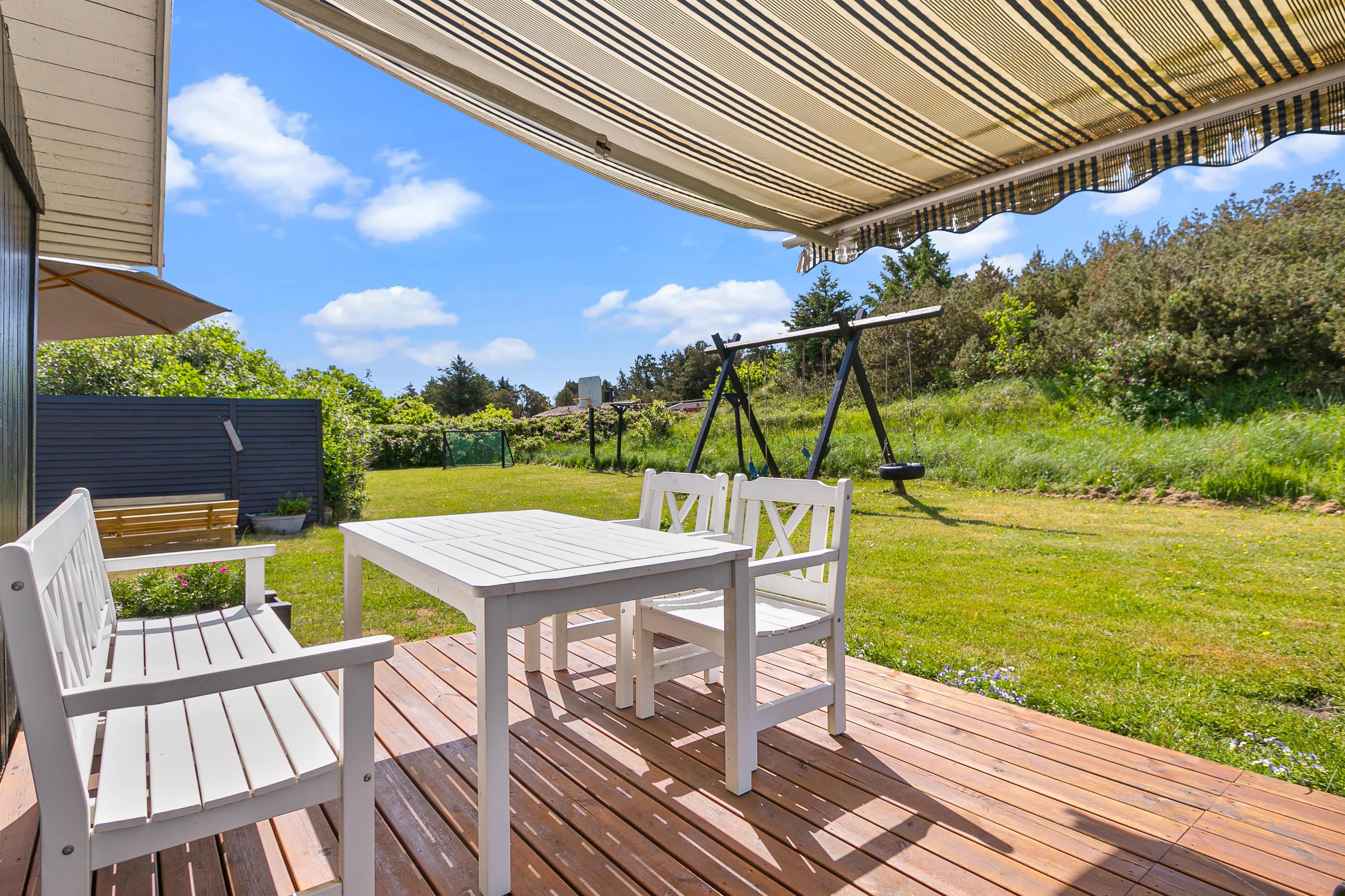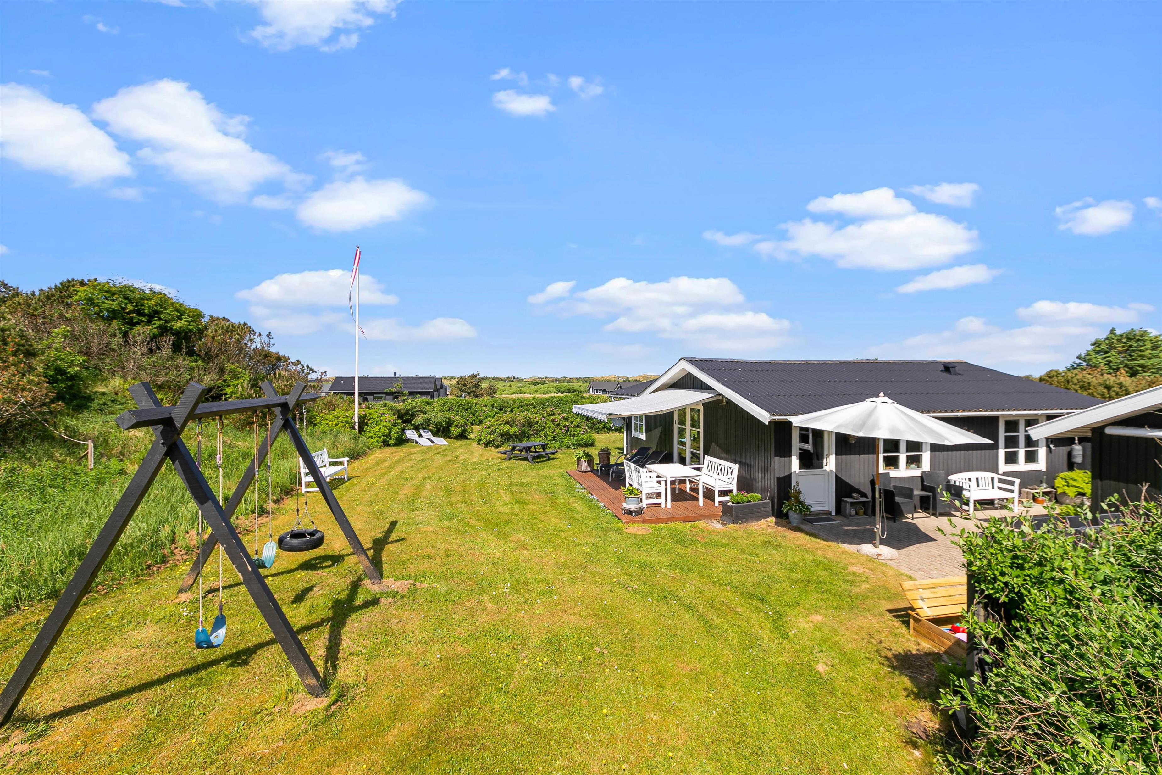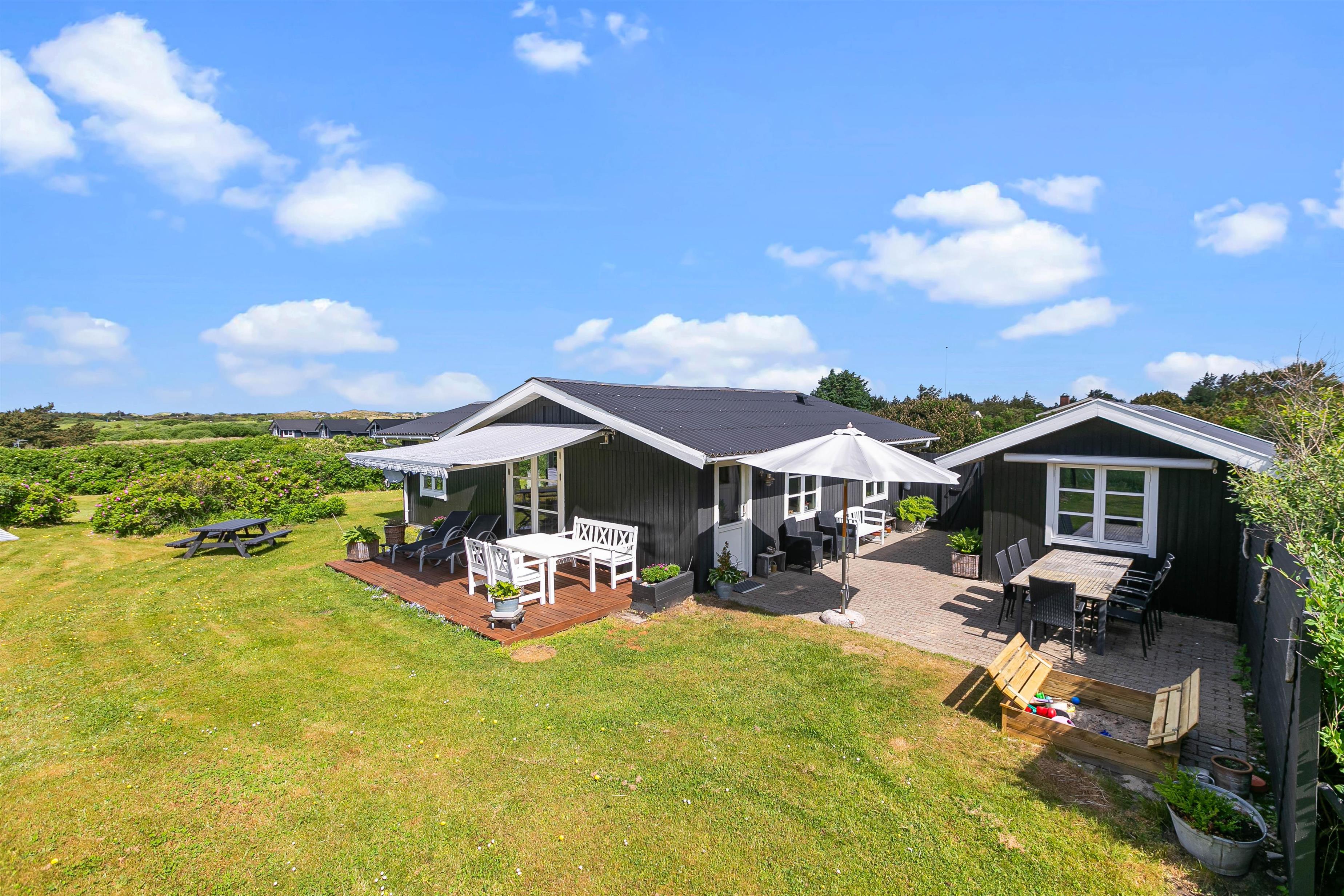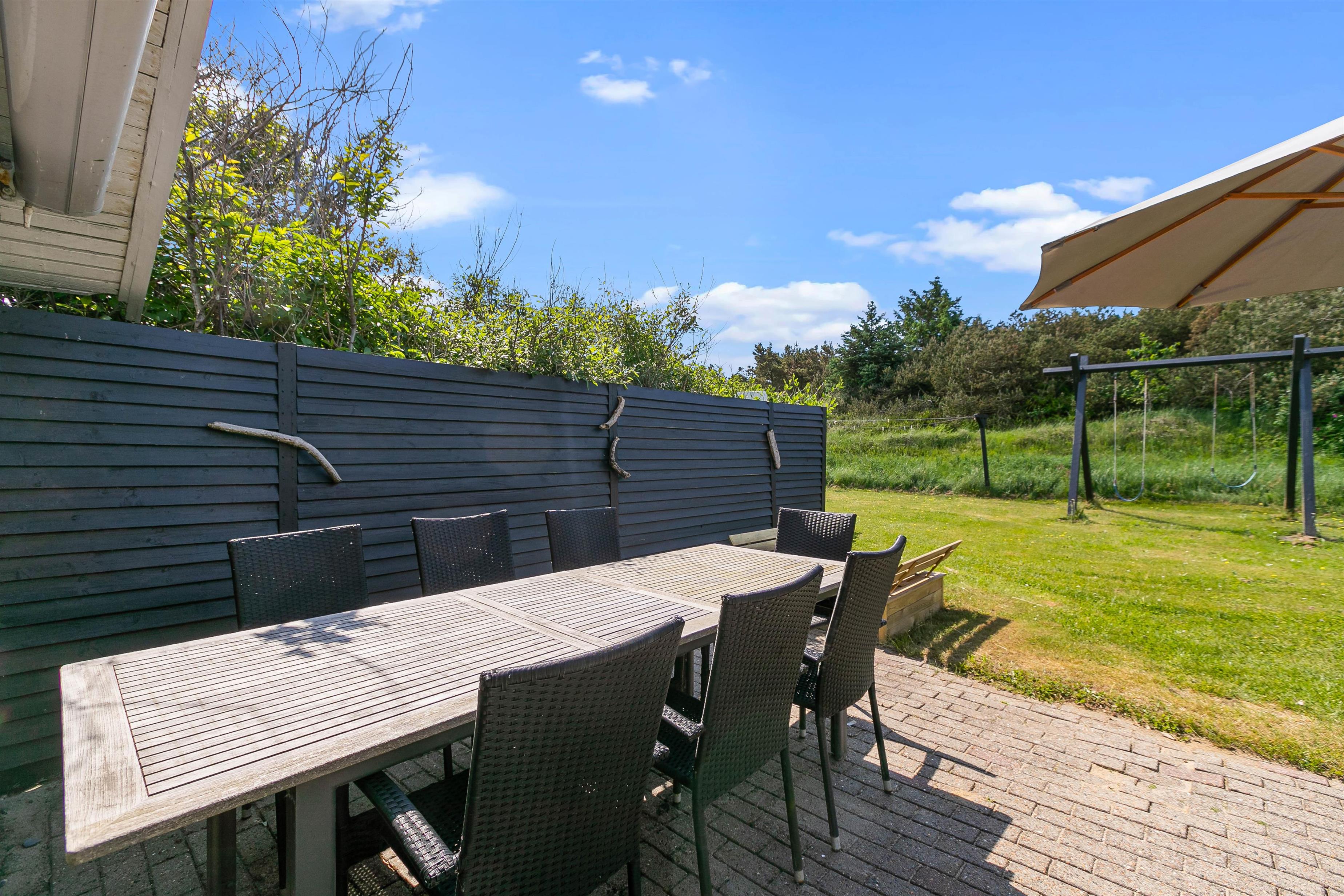 Sommerhusets ligger på en 1633 m2 stor naturgrund, så her er der derfor plads til at I kan slå jer løs og få brugt en masse energi. På grunden finder I også en gynge og en sandkasse, hvilket der helt sikkert vil glæde jeres børn. Imens børnene leger i haven og nyder det gode ferievejr, kan I sidde på træterrassen og nyde en kold drink. I har også mulighed for at tænde op for sommerhusets tilhørende grill, som står på stenterrassen, hvor I sammen kan tilberede et lækkert måltid mad.
