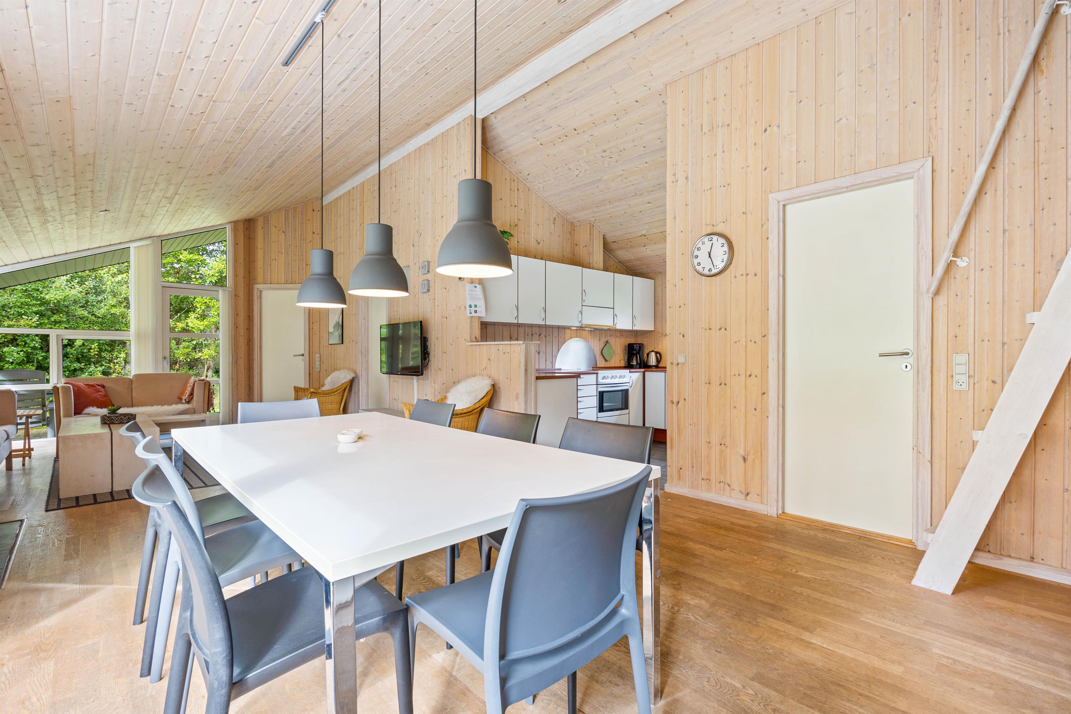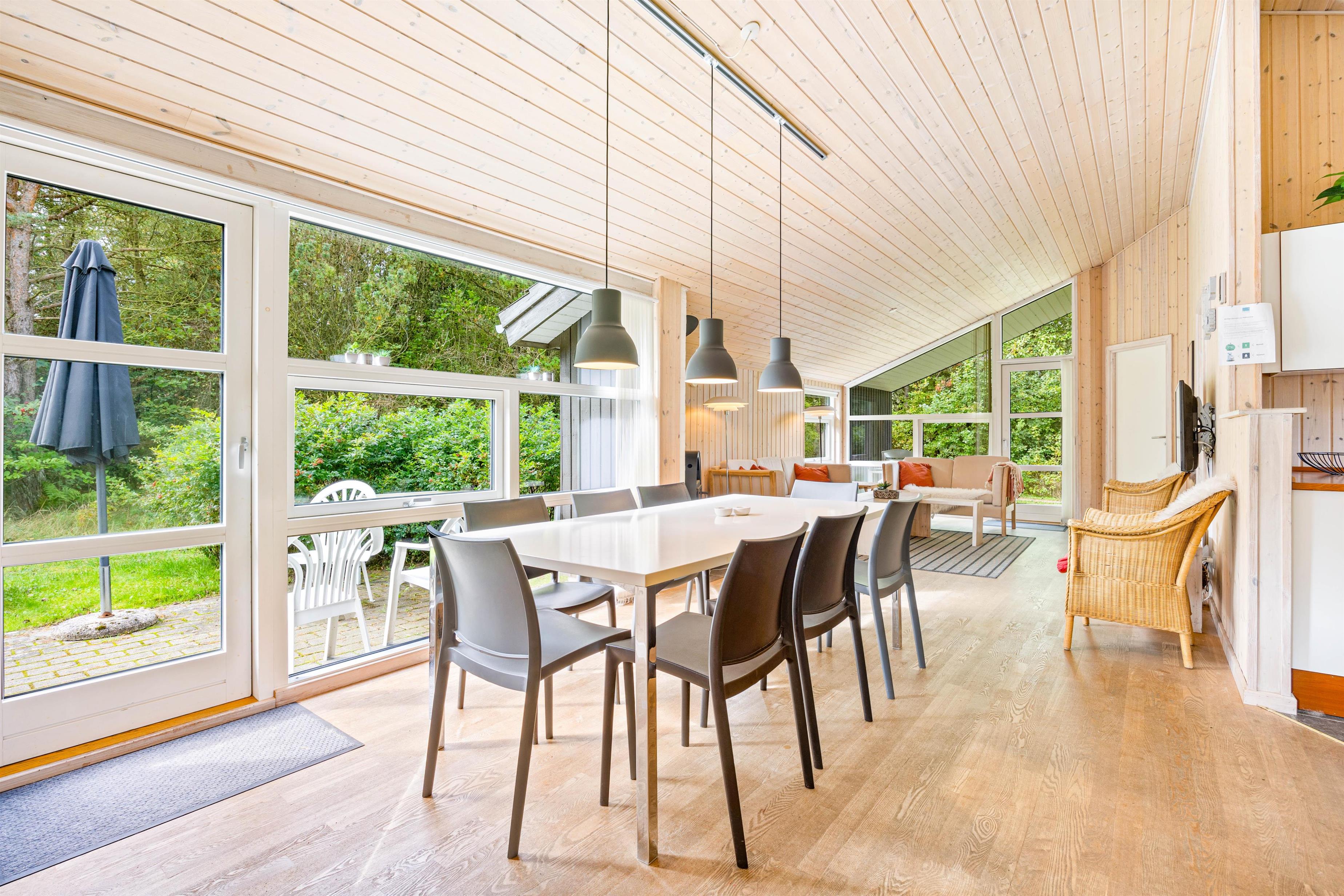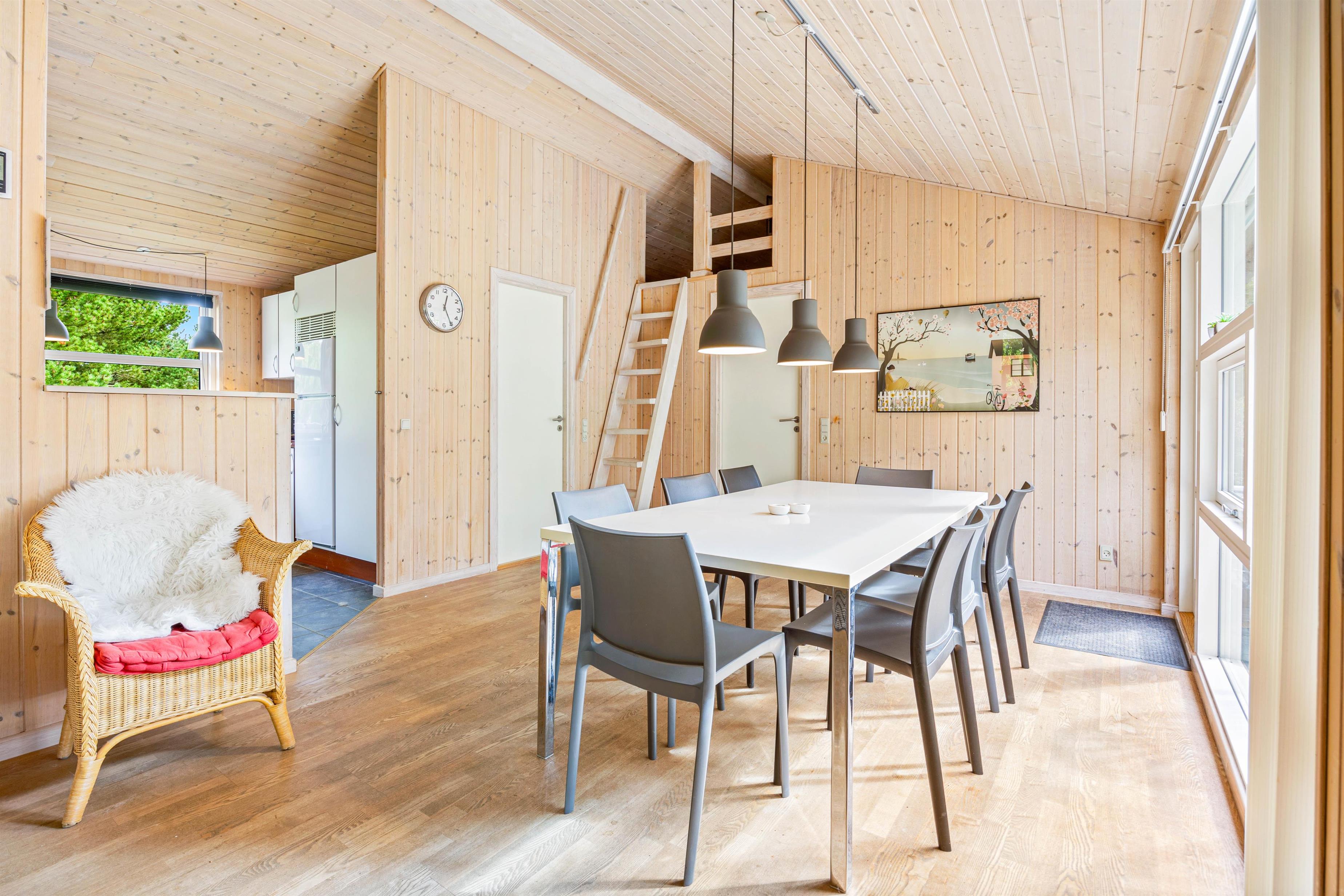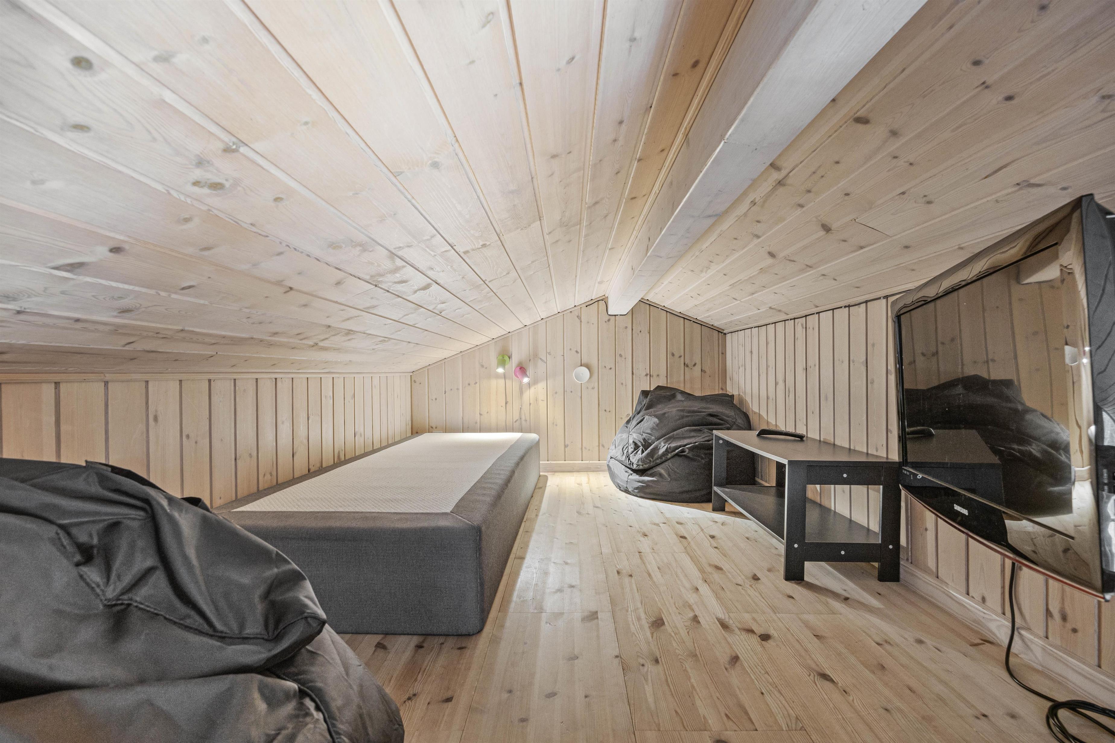 Sommerhuset har en hyggelig indretning, der skaber en varm og hjemlig atmosfære. De lyse trægulve og loft til kip bidrager til den charmerende stil, den åbne stue og køkkenalrum giver masser af plads til samvær og hygge.