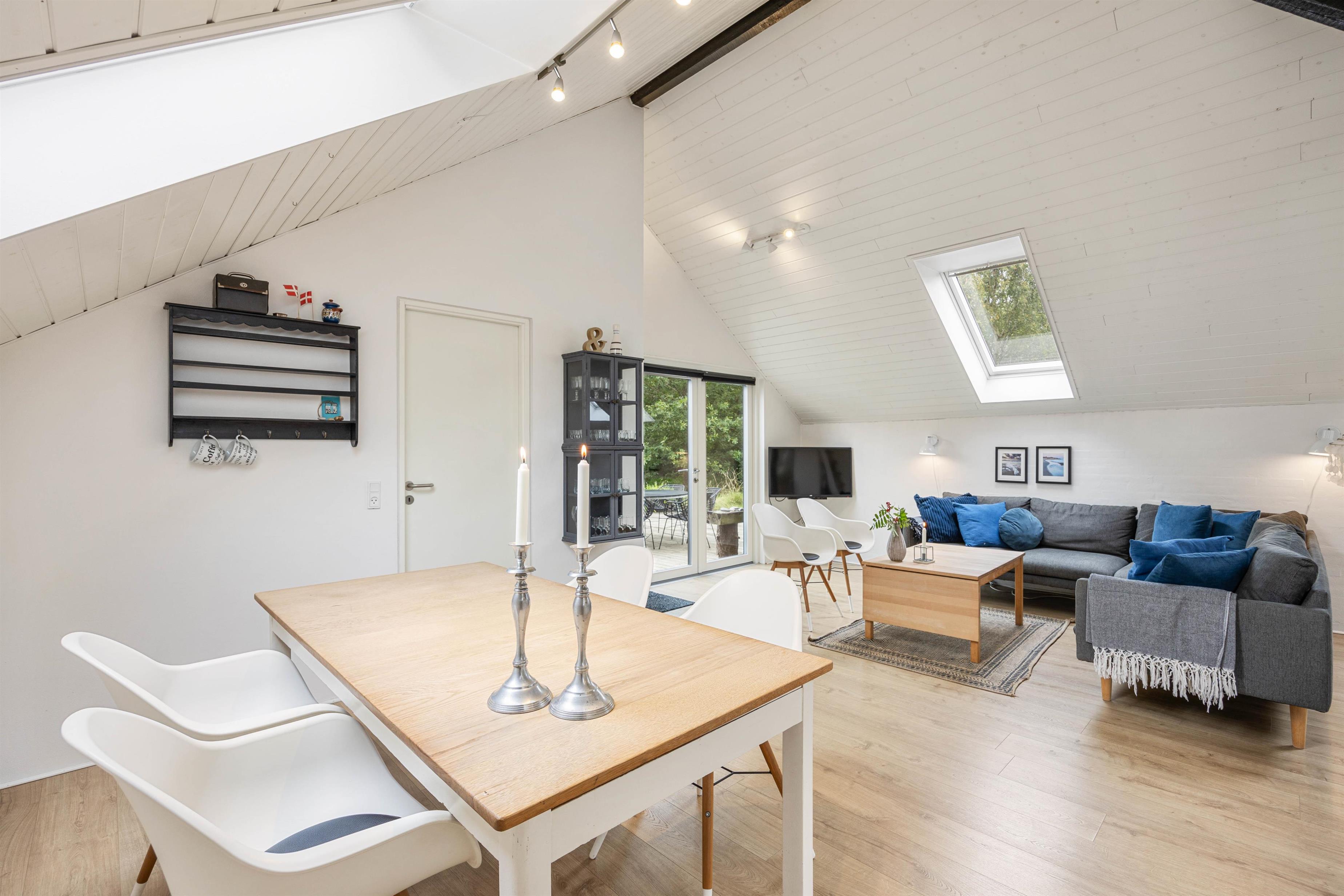 Sommerhusets hjerte er det åbne køkkenalrum, som forbinder køkkenet med opholds- og spisestuen. De høje lofter og indbyggede ovenlysvinduer, sørger for at der kommer masser at lys ind, og er medvirkende til at skabe en dejlig og rar atmosfære. Her kan I tilbringe masser af tid sammen med familien eller vennerne. På de lidt køligere dage, er det oplagt at tænde op for feriehusets brændeovn, og nyde varmen sprede sig ude i rummet. Har I ikke gang i brændeovnen, har I mulighed for at benytte jer af den energibesparende luft-til-luft varmepumpe, som bidrager til et behageligt indeklima, hele året rundt.