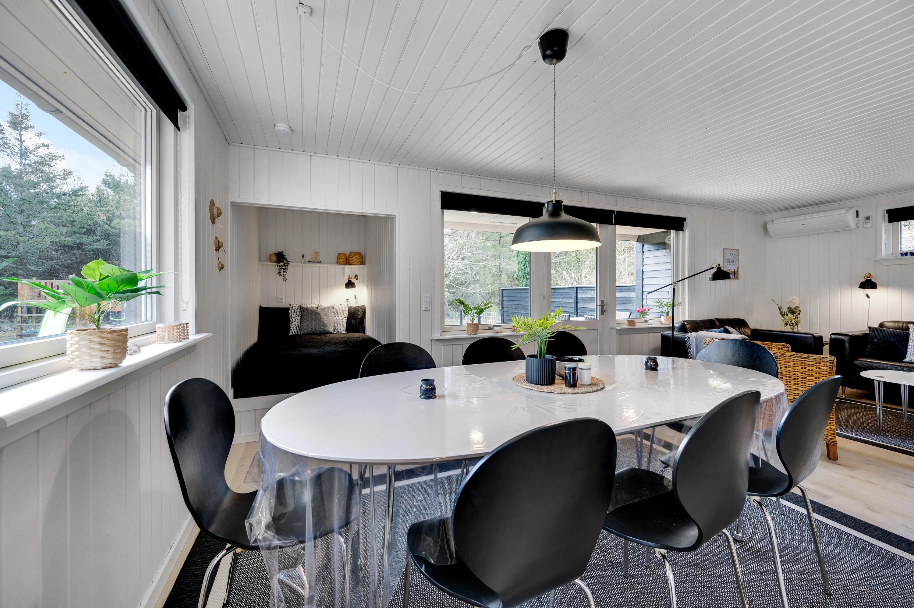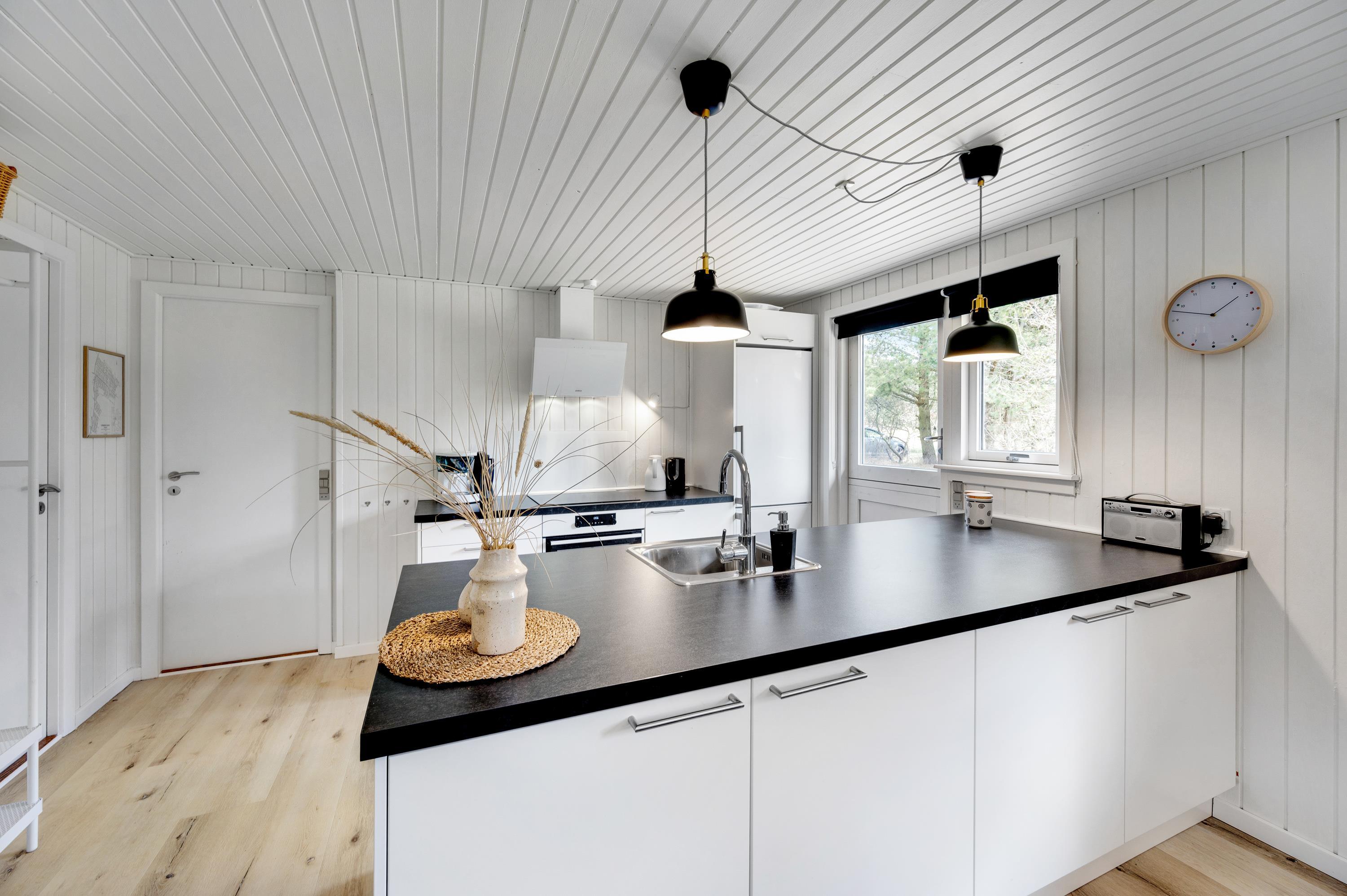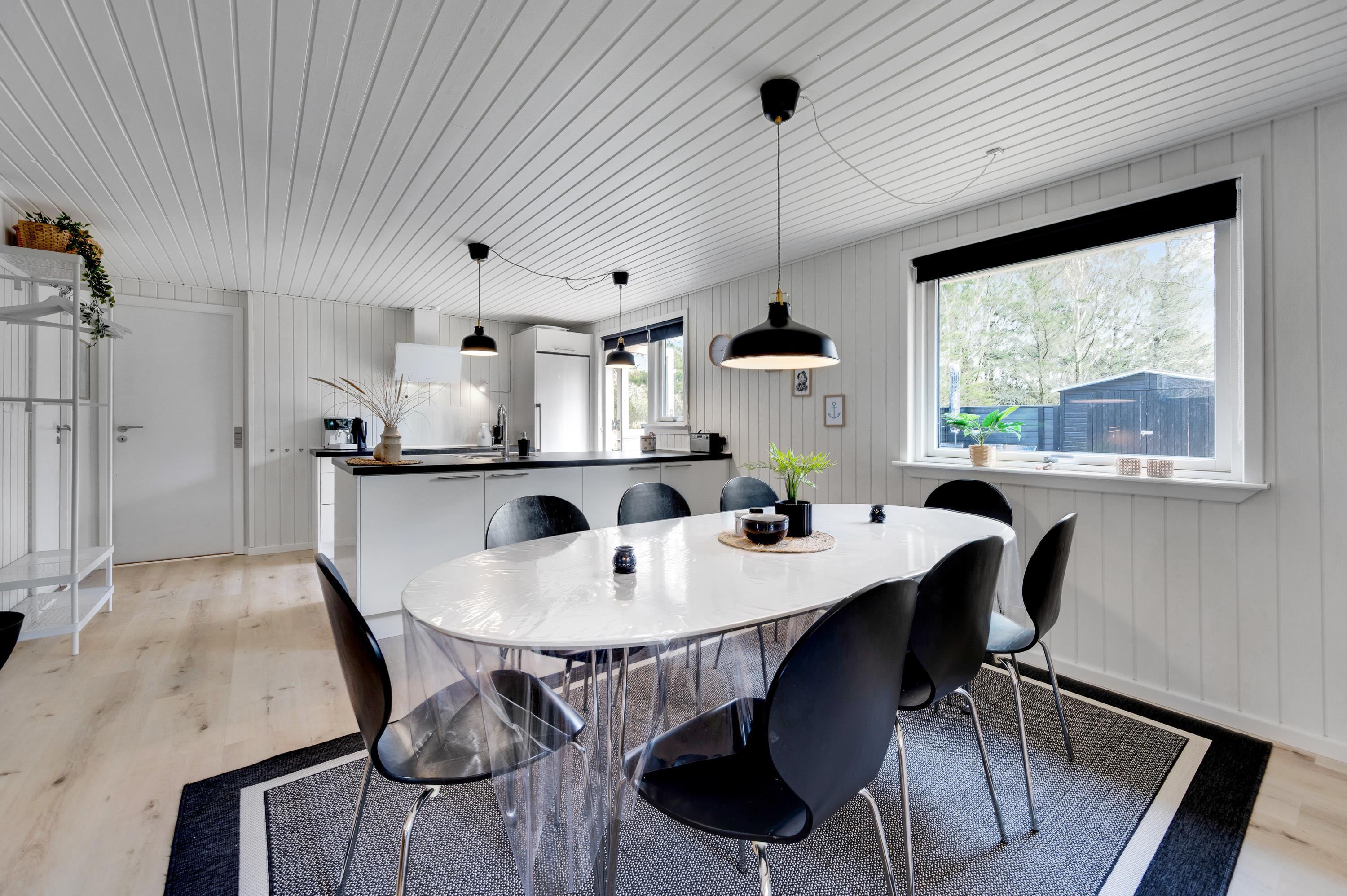 Feriens samlingspunkt bliver helt sikkert det åbne alrum, der samler stue, spiseafdeling og køkken i ét. Her er der lagt op til masser af skønne feriestunder i godt selskab – måske med et spil kort rundt om spisebordet eller en filmaften på sofaen, mens brændeovnen knitrer i baggrunden?