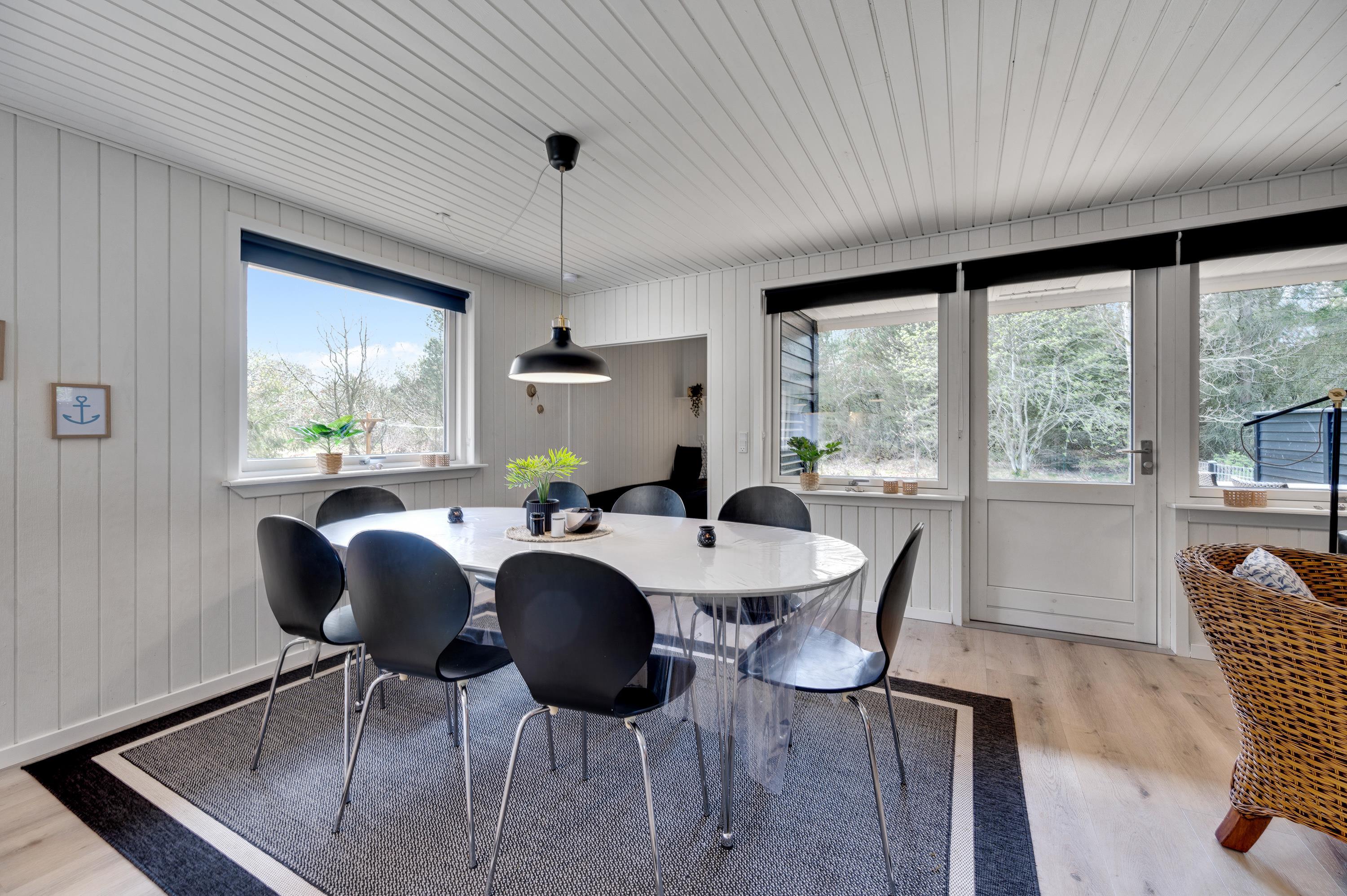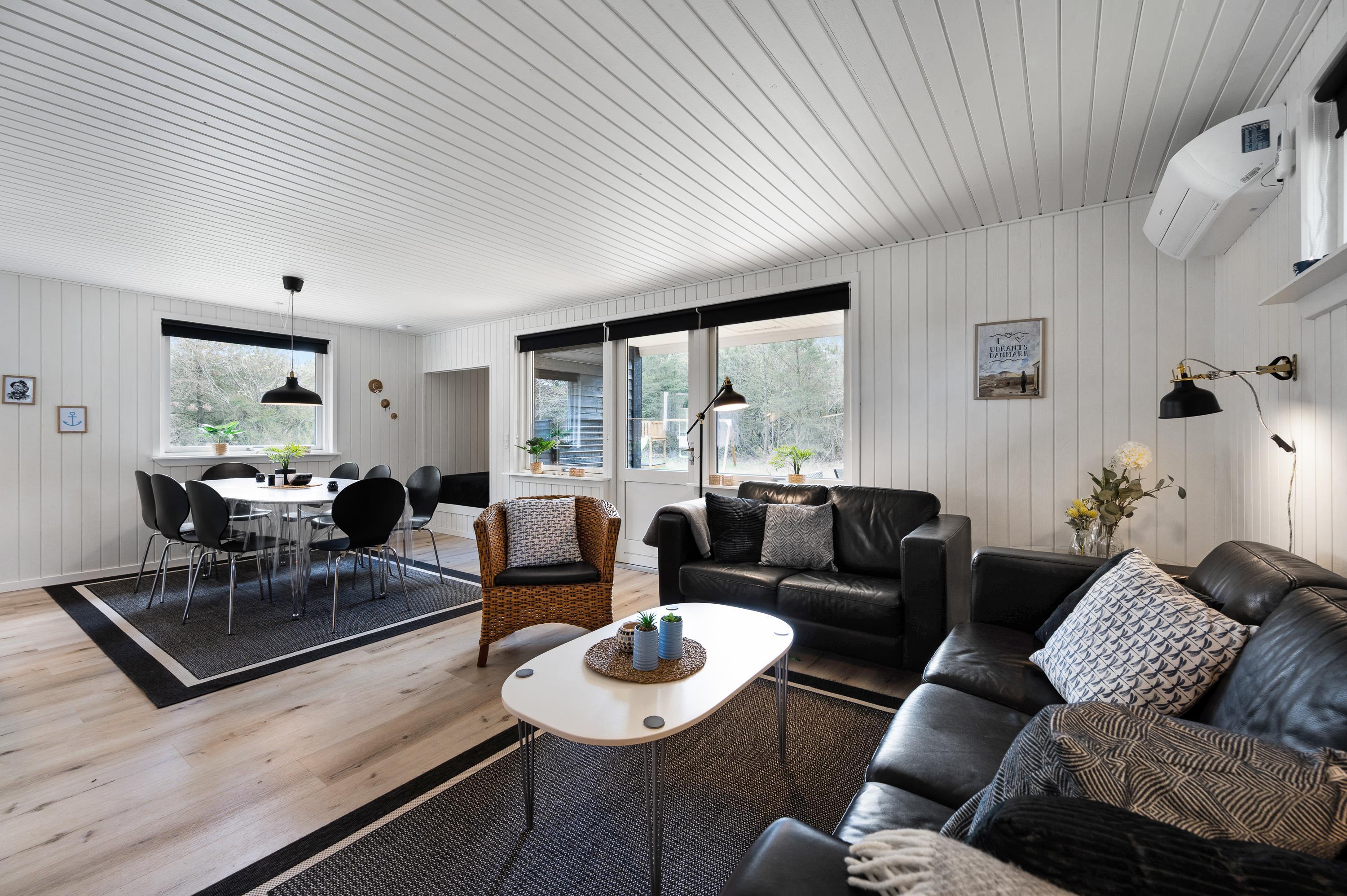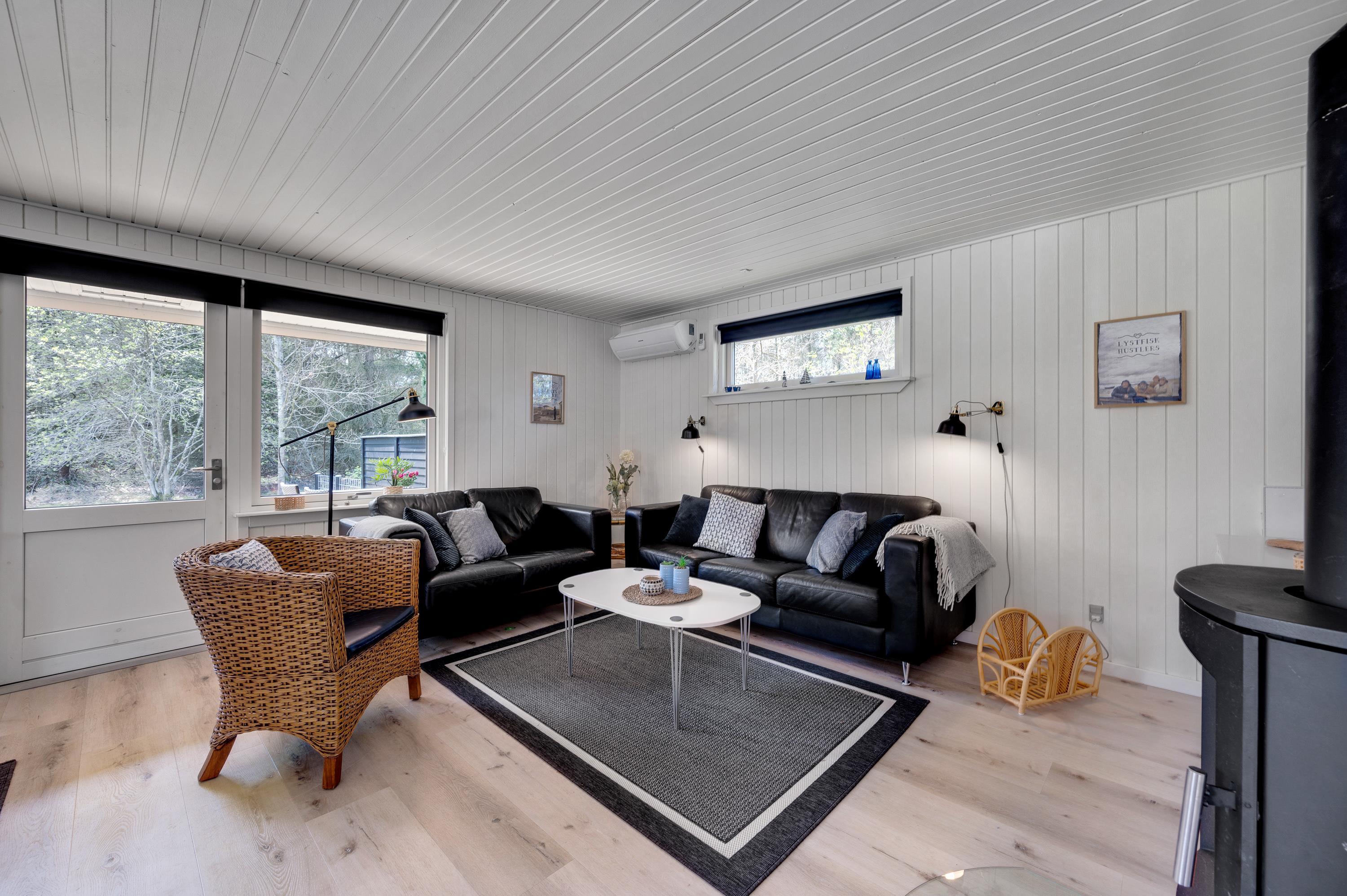 Feriens samlingspunkt bliver helt sikkert det åbne alrum, der samler stue, spiseafdeling og køkken i ét. Her er der lagt op til masser af skønne feriestunder i godt selskab – måske med et spil kort rundt om spisebordet eller en filmaften på sofaen, mens brændeovnen knitrer i baggrunden?