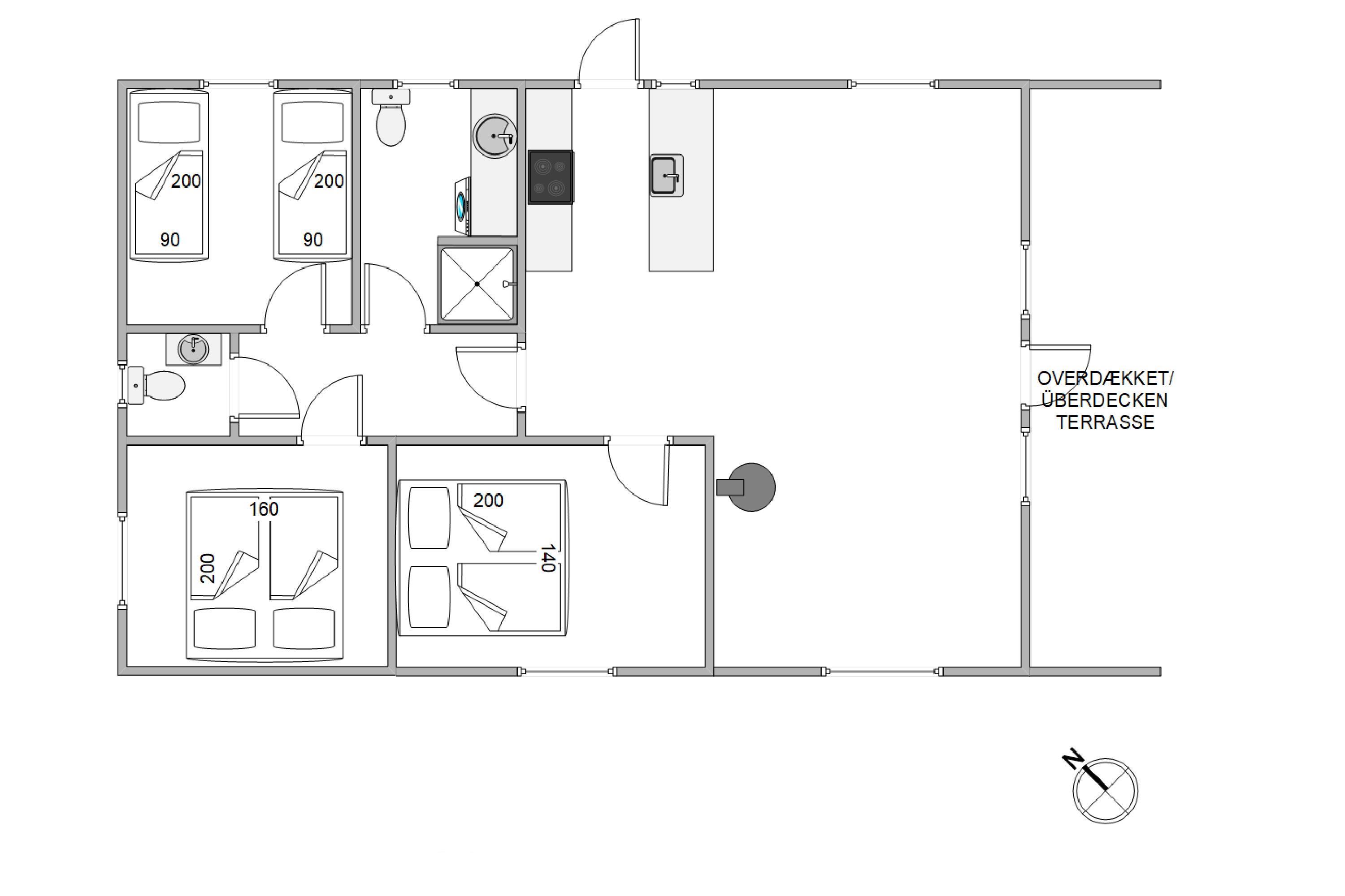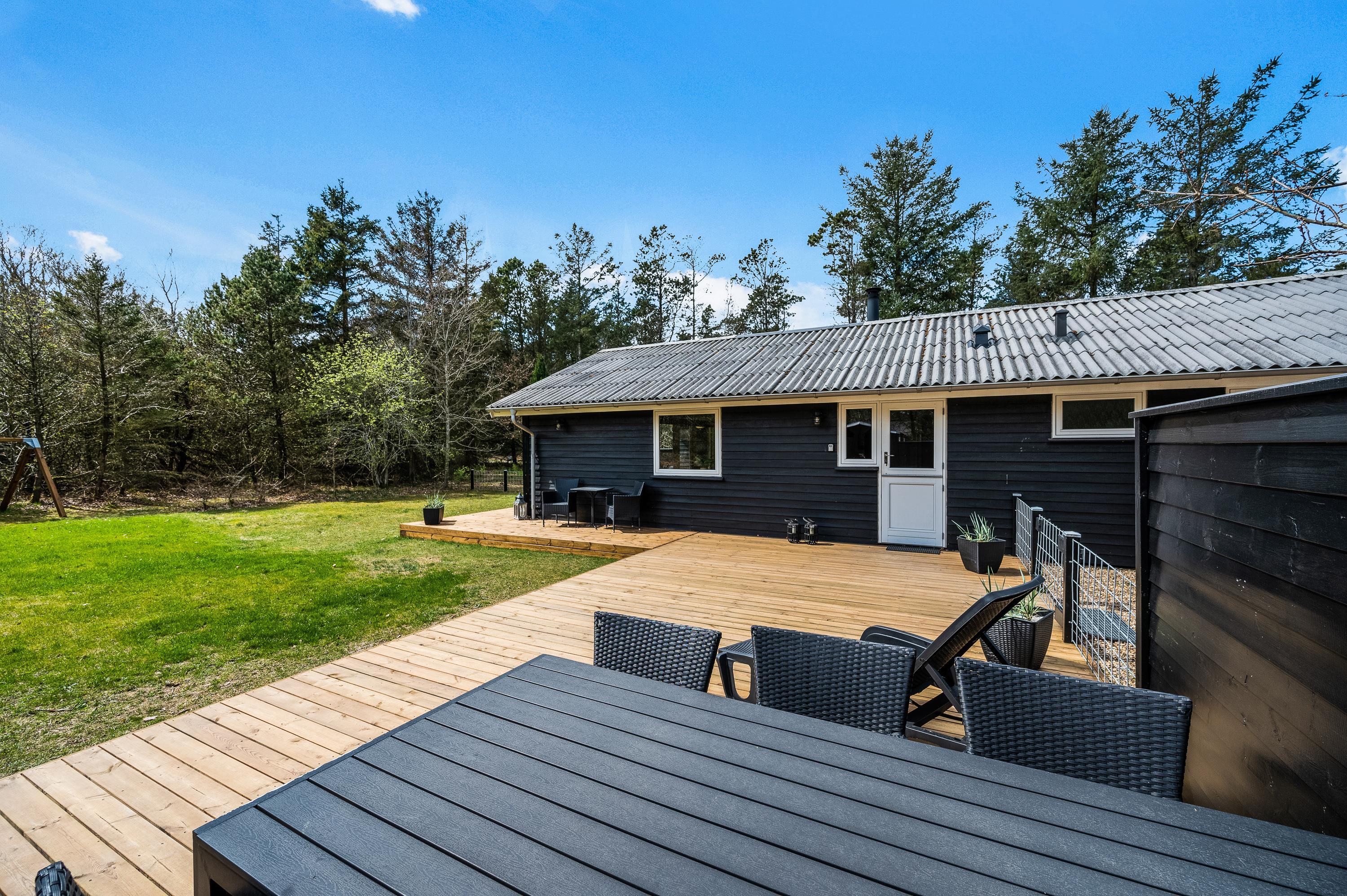 Fra køkkenet og stuen kommer I ud på sommerhusets gode træterrasser. Den ene terrasse er afskærmet, mens den anden både er afskærmet og overdækket, så lige meget om I er til fuld sol eller skyggehygge, finder I et behageligt spot her.