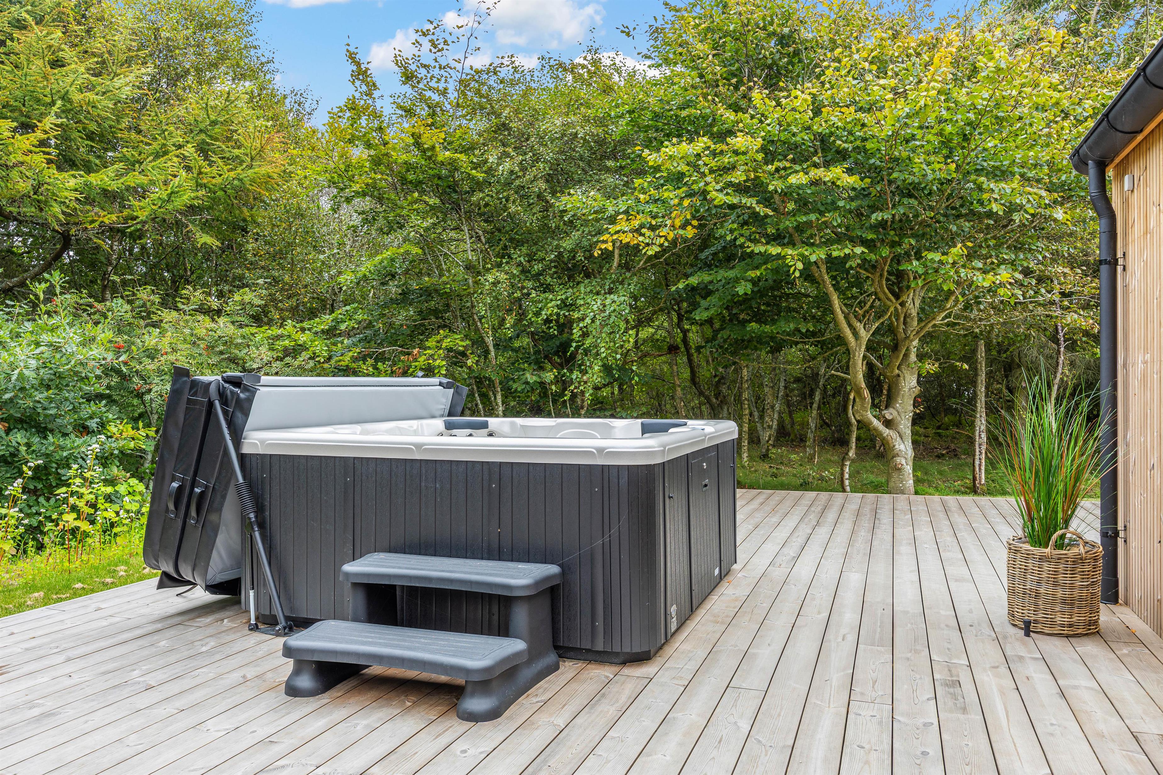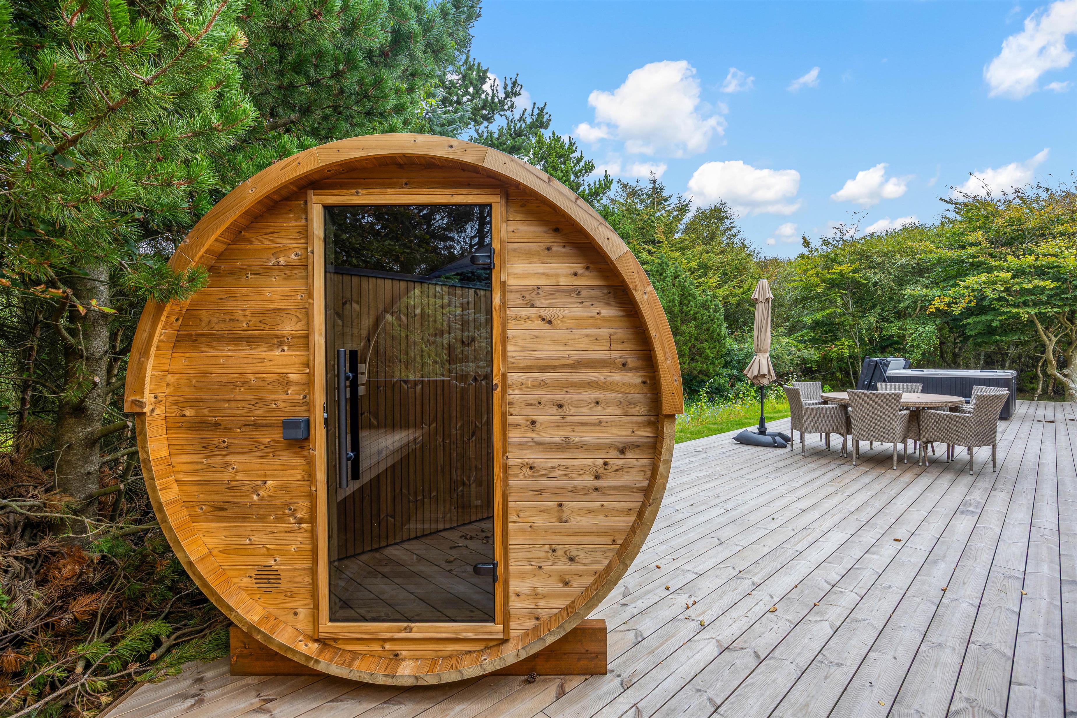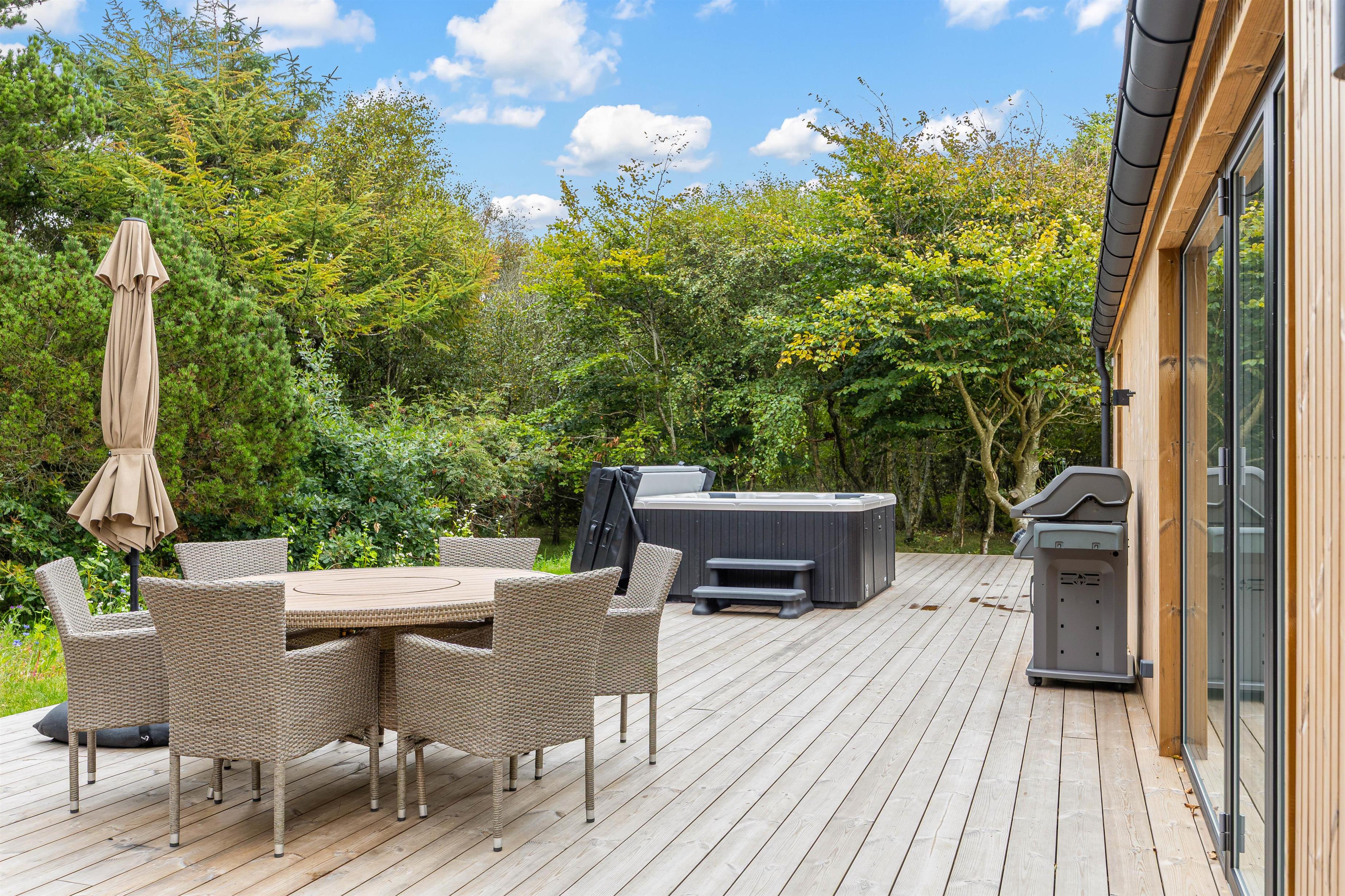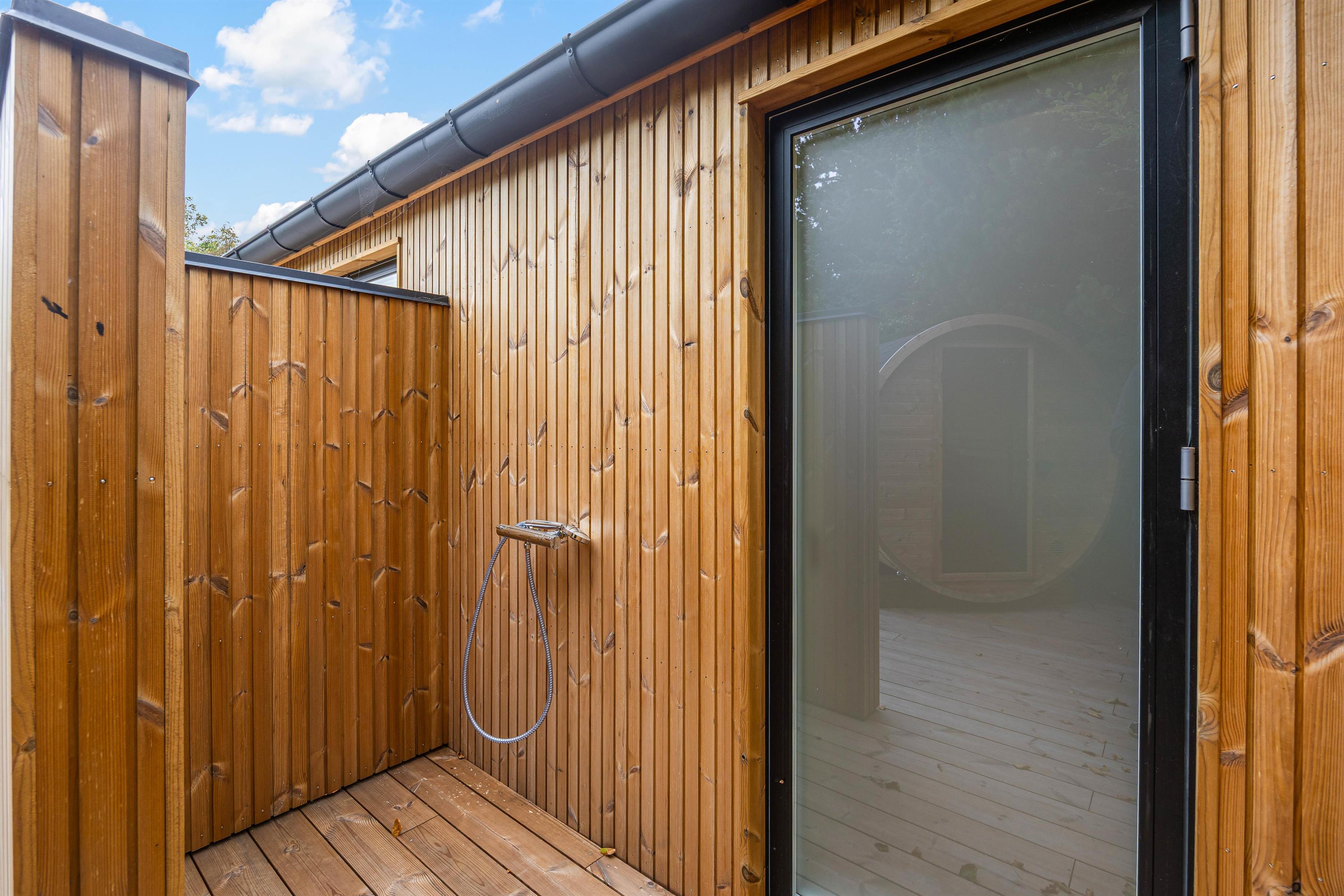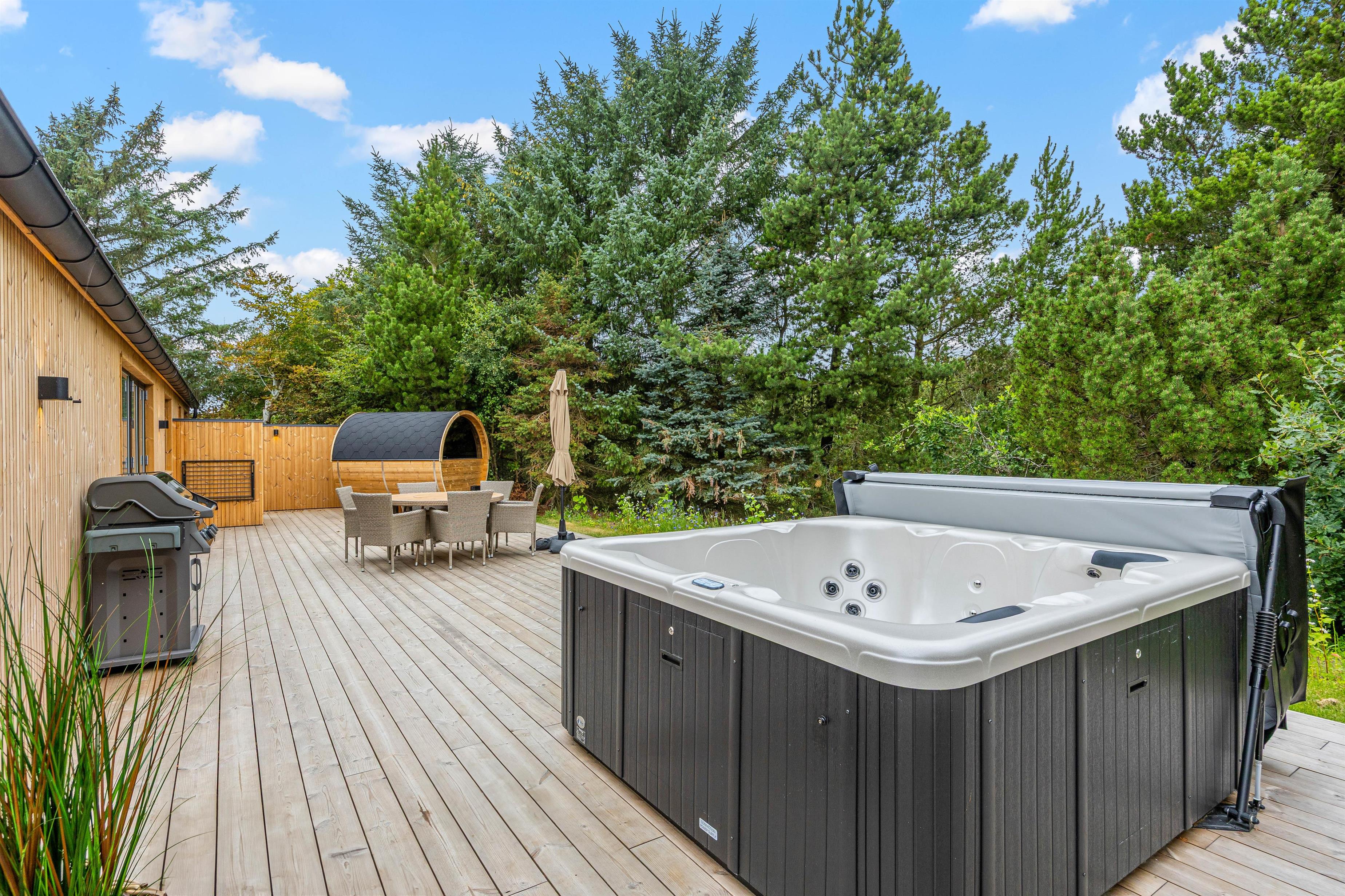 Udearealet omkring dette dejlige feriehus lader intet tilbage at ønske. Tilbring solrige dage på den åbne terrasse, eller træk jer tilbage til den afskærmede eller overdækkede terrasse, som giver jer privatliv og beskyttelse mod det skiftende vejr. Græsplænen indbyder til leg og afslapning, mens havemøblerne giver en ideel mulighed for at nyde den friske luft. Brug det udendørs spabad til at slappe af efter en oplevelsesrig dag, eller nyd en stund i udesaunaen – og bare mærk, at I har ferie. En forfriskende udebruser, der er tilgængelig hele året, afrunder wellness-oplevelsen.