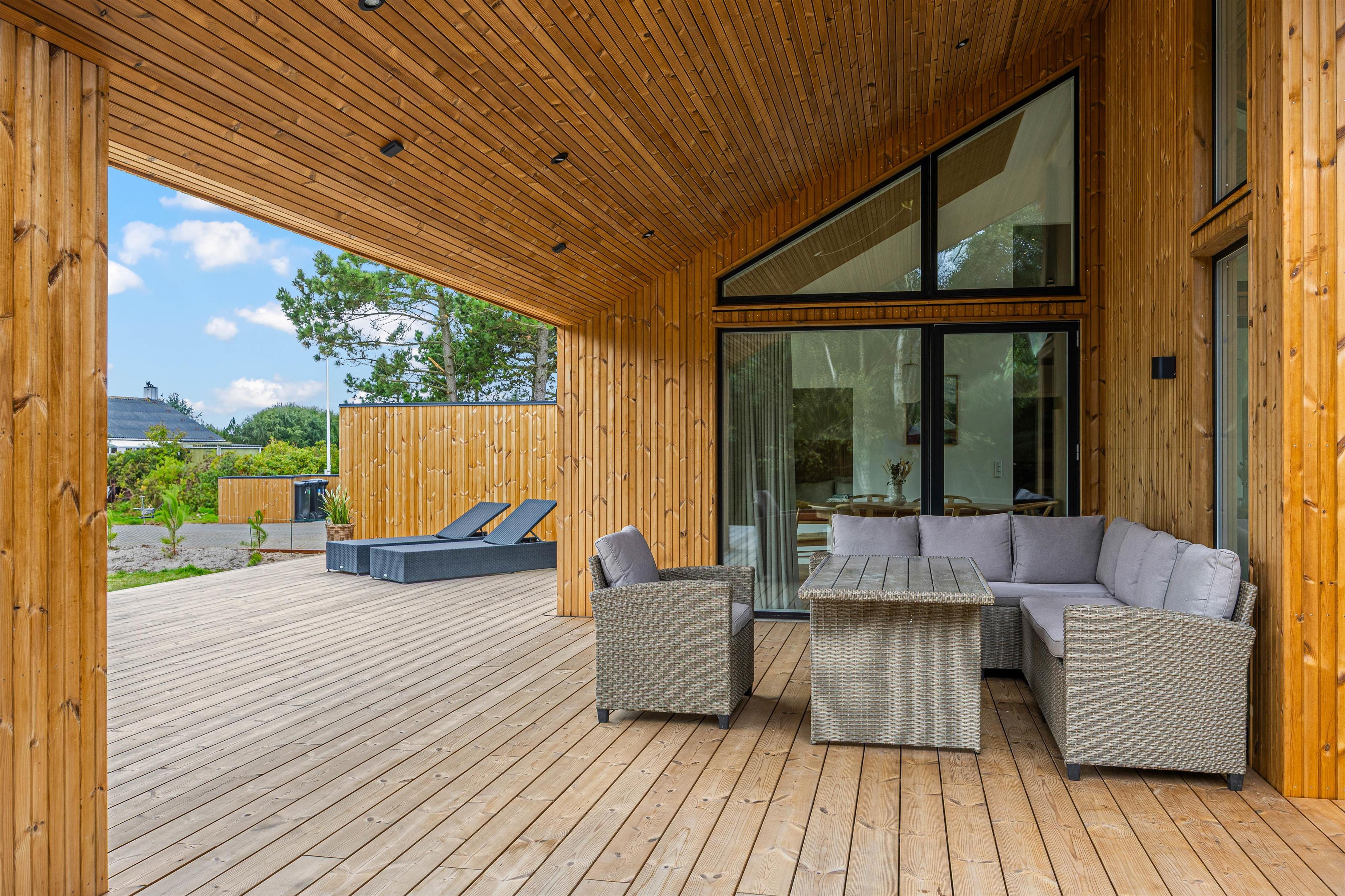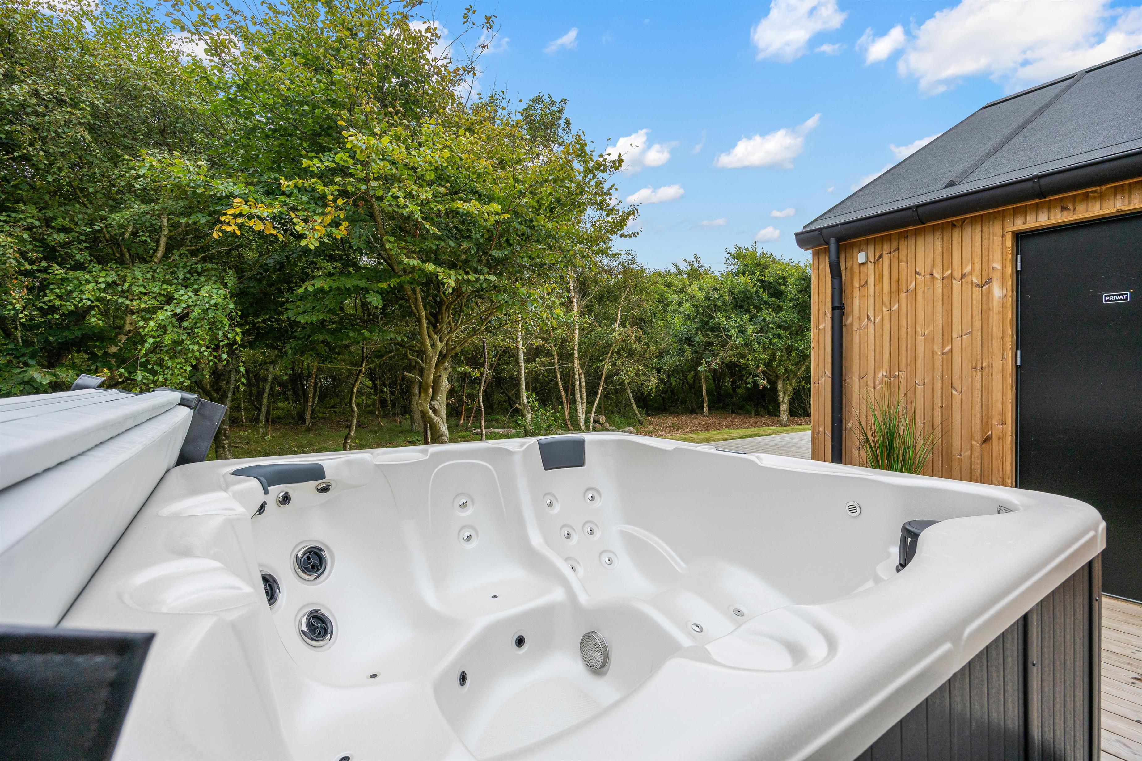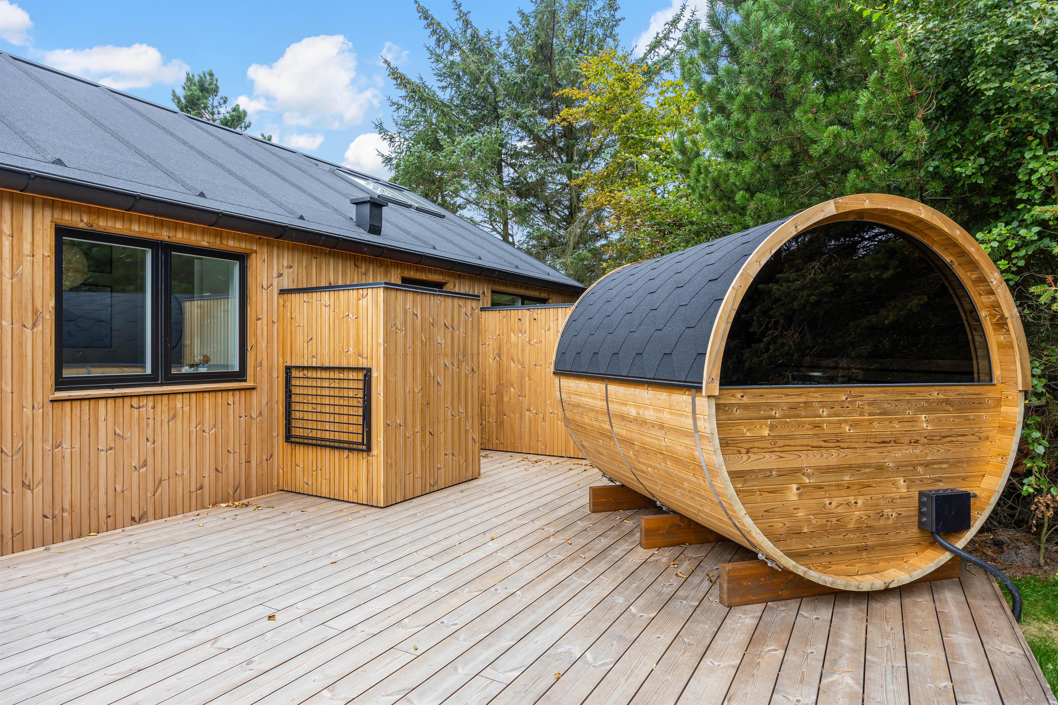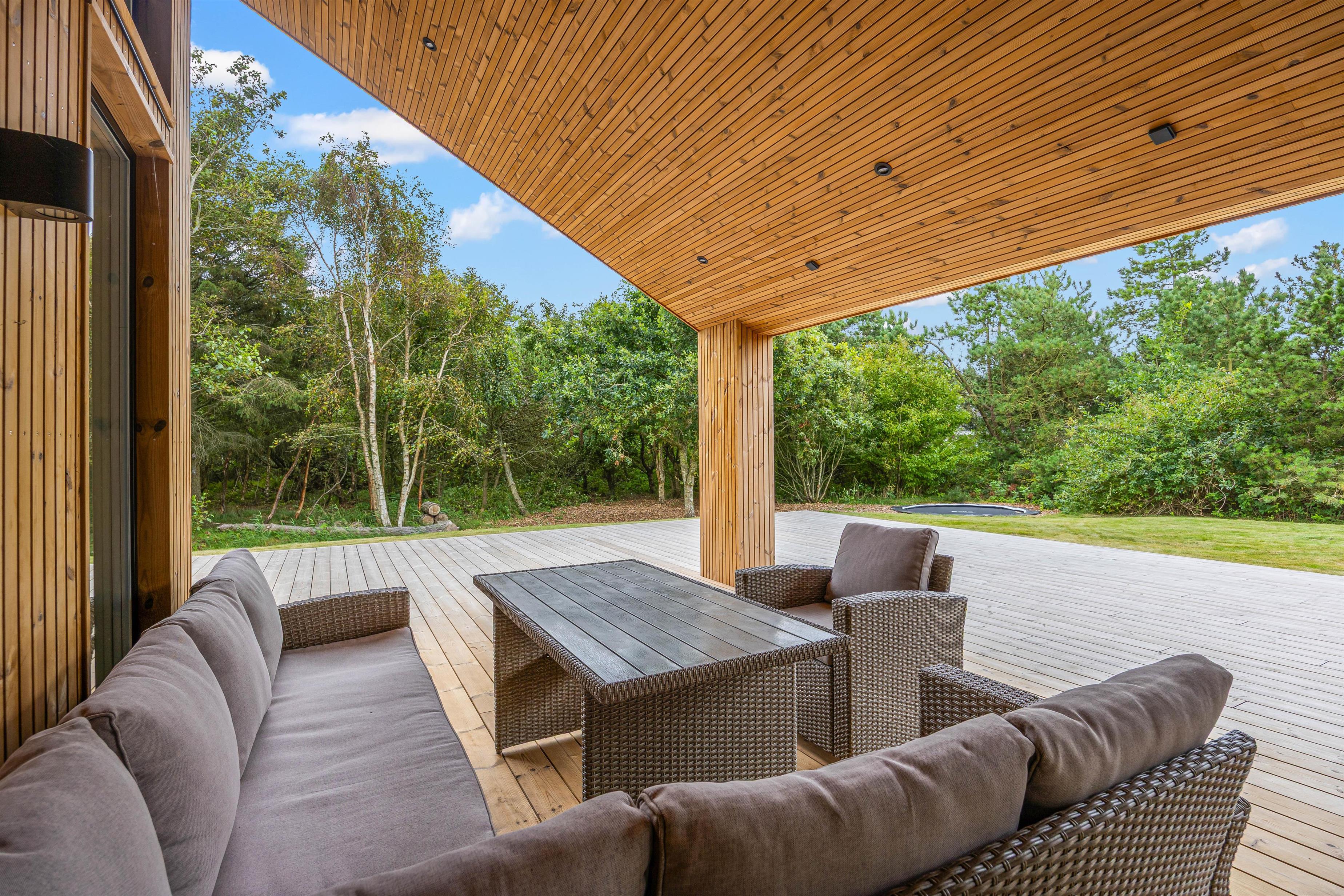 Udearealet omkring dette dejlige feriehus lader intet tilbage at ønske. Tilbring solrige dage på den åbne terrasse, eller træk jer tilbage til den afskærmede eller overdækkede terrasse, som giver jer privatliv og beskyttelse mod det skiftende vejr. Græsplænen indbyder til leg og afslapning, mens havemøblerne giver en ideel mulighed for at nyde den friske luft. Brug det udendørs spabad til at slappe af efter en oplevelsesrig dag, eller nyd en stund i udesaunaen – og bare mærk, at I har ferie. En forfriskende udebruser, der er tilgængelig hele året, afrunder wellness-oplevelsen.