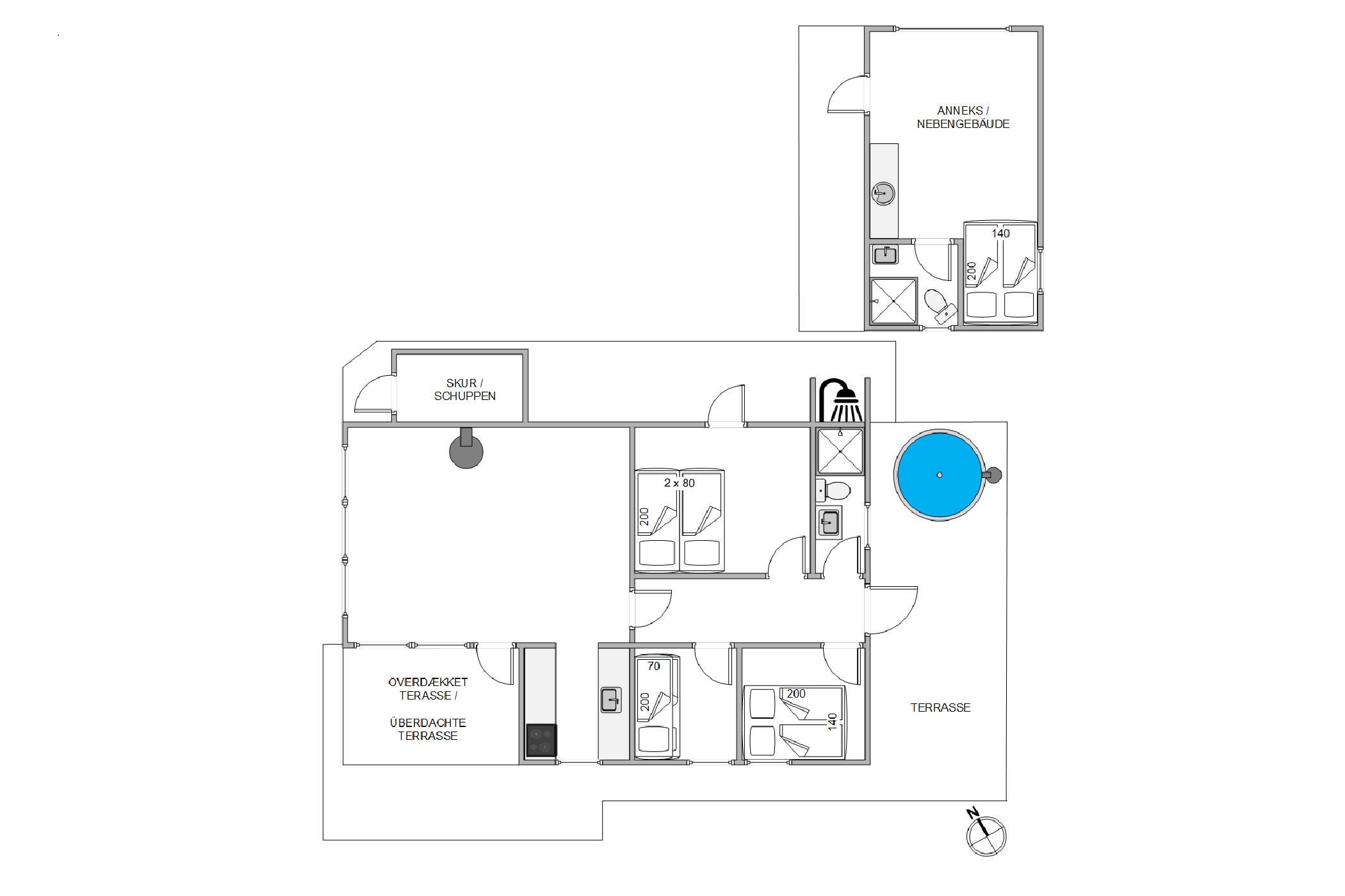 Det 75 kvadratmeter store sommerhus er indrettet med 3 gode soveværelser, hvor I kan få jeres skønhedssøvn på ferien og blive klar til de kommende feriedage i Søndervig. Derudover er der 1 badeværelse med gulvvarme i selve sommerhuset, så der hverken bliver kø eller kolde tæer fra morgenstunden.