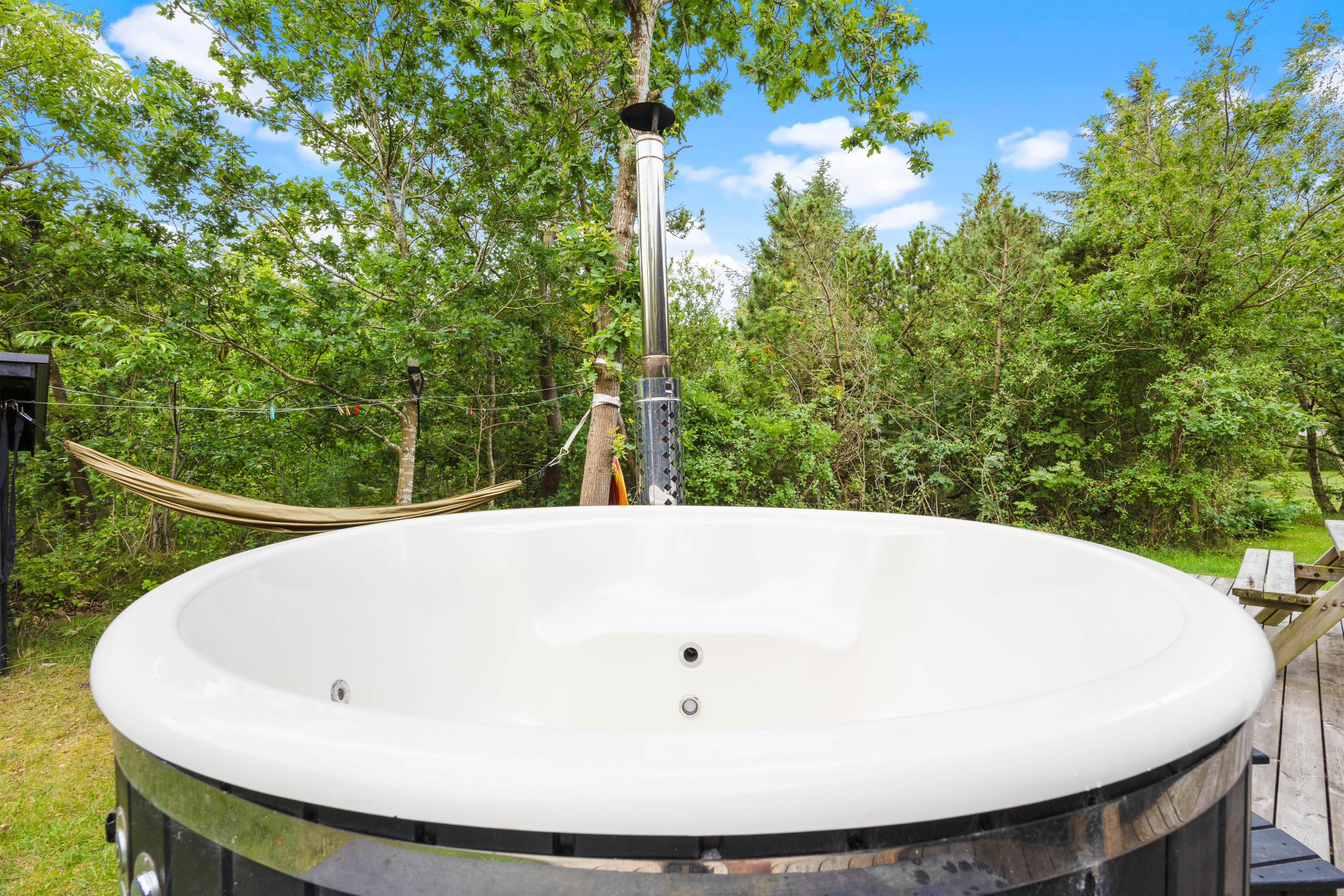 Sommerhusets udeområde byder desuden på et vildmarksbad, hvor I virkelig kan få slappet af på ferien. Det er simpelthen helt fantastisk at sidde i det varme vand under åben himmel og bare nyde ferien. Derudover er der også en udebruser, så I kan blive skyllet efter en tur ved stranden. I kan bruge udebruseren fra april til november måned.