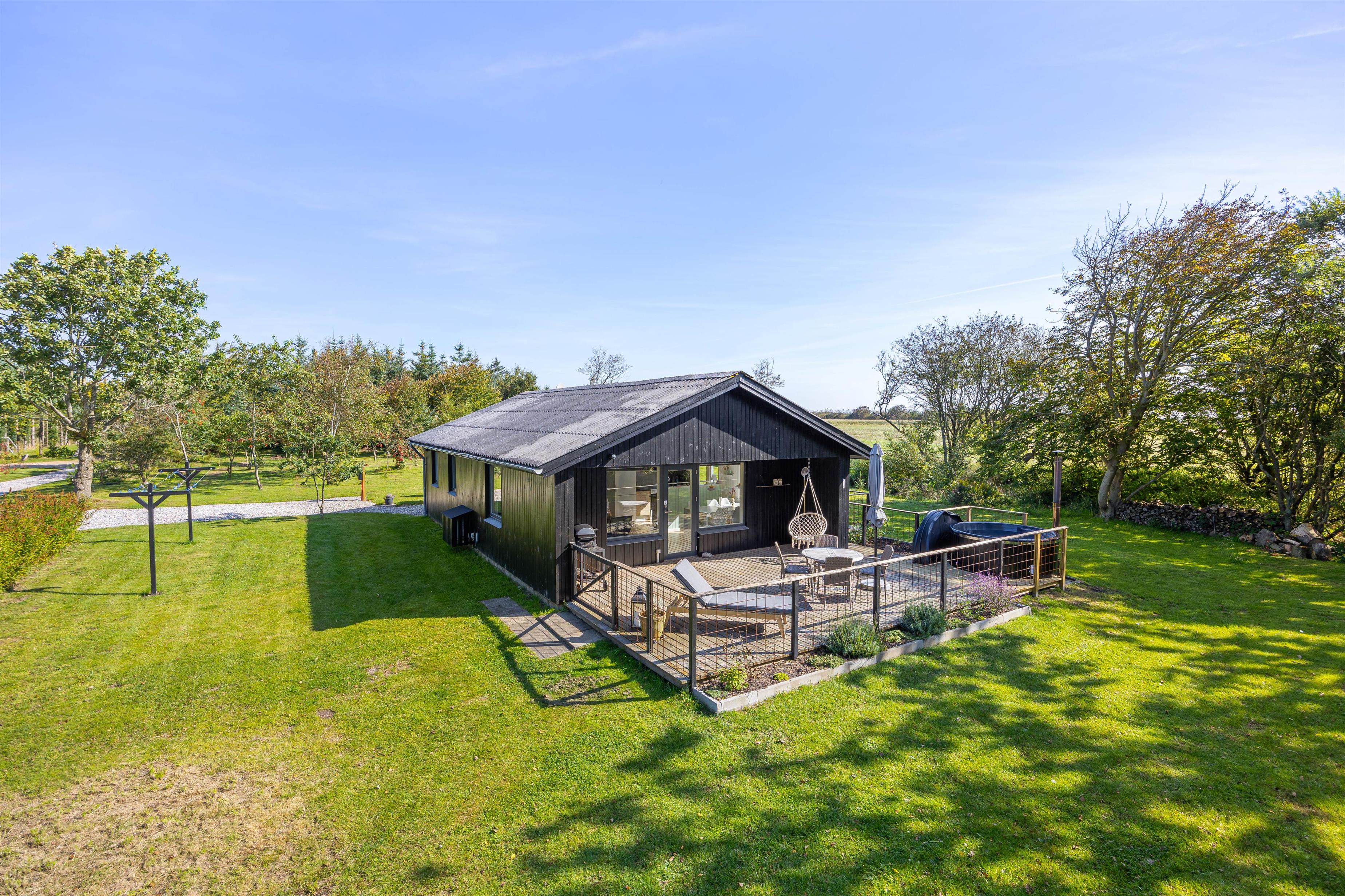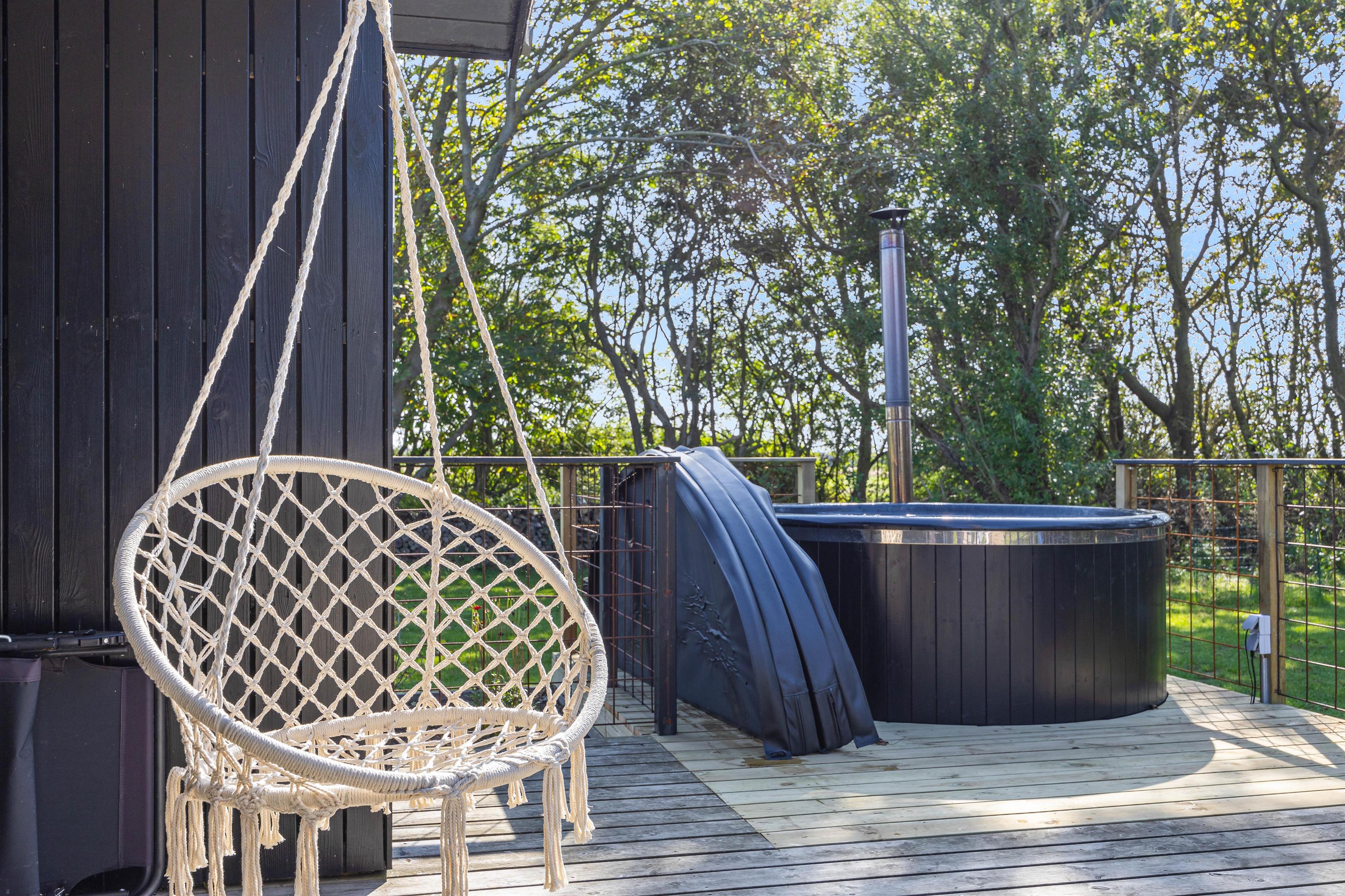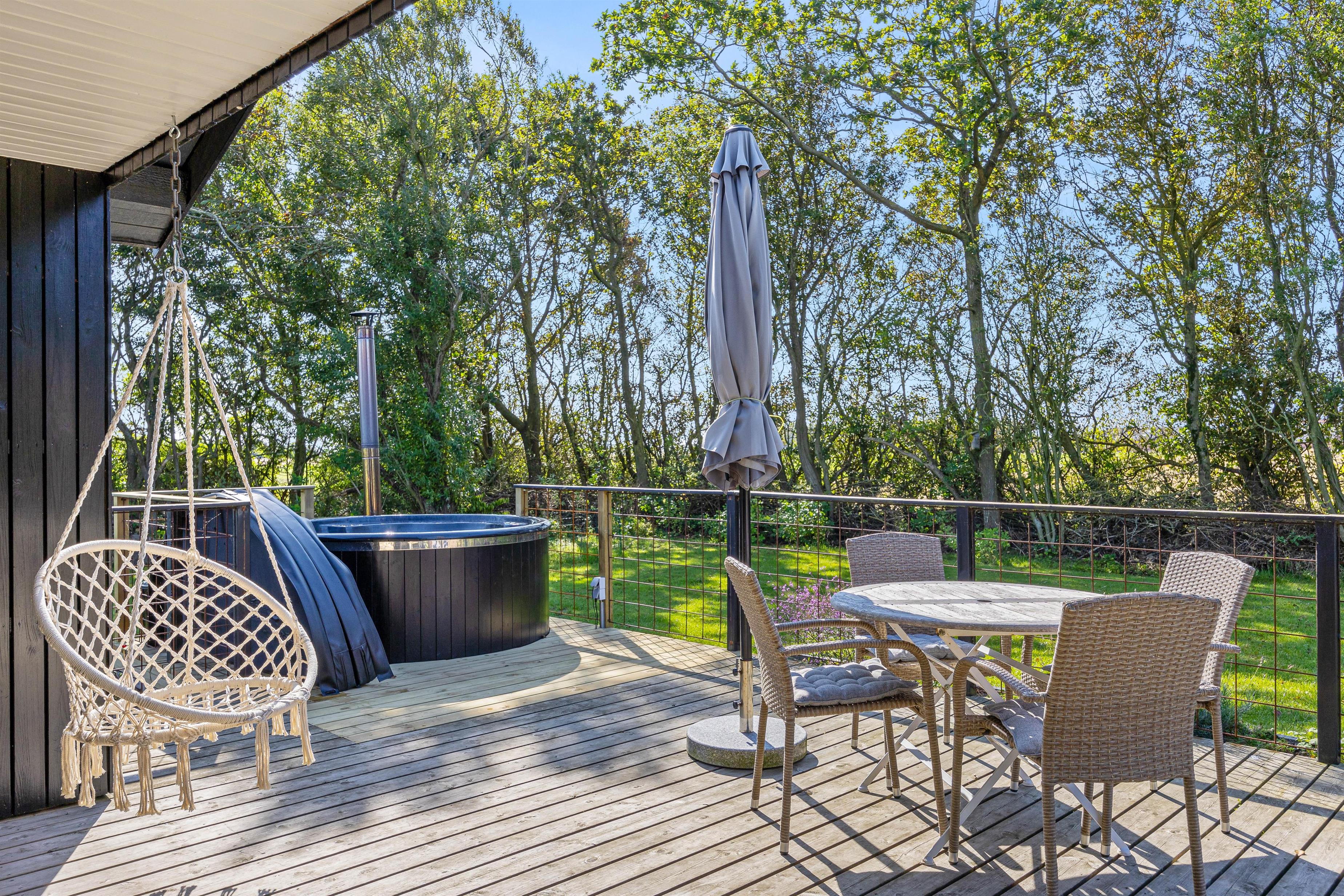 På den lukkede træterrasse står havemøbler og grill klar, når solen kigger frem i de varme måneder. Her kan I trygt lade børnene få fri leg, imens træer og buske sørger for god afskærmning, så I kan sidde i fred og ro og nyde morgenkaffen og den friske luft. På de lidt køligere dage, eller sene aftener er det oplagt at hoppe i badetøjet, og hoppe en tur i vildmarksbadet. Her har I mulighed for at nyde vandets varme, slappe helt af og bare nyde, at I har ferie.