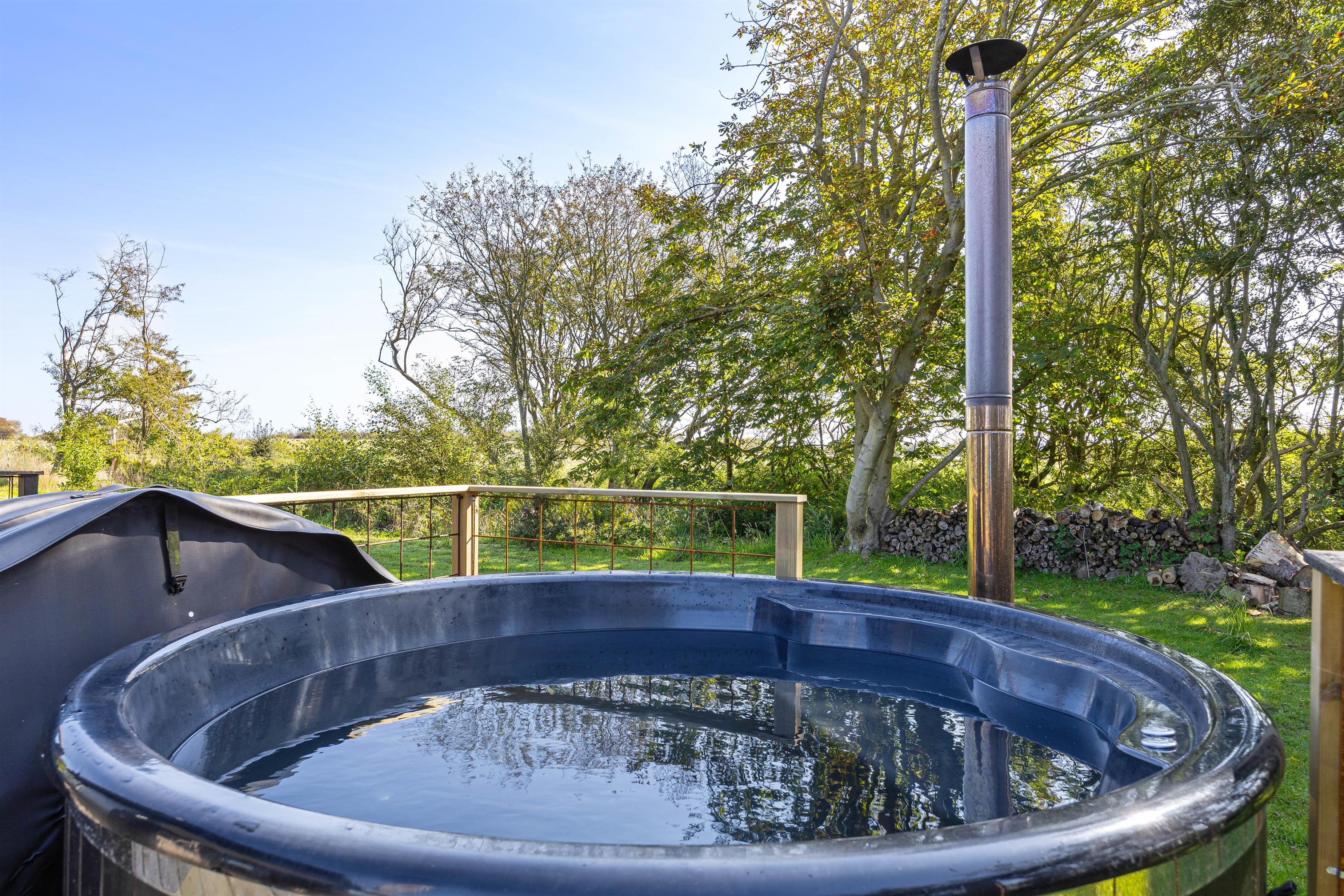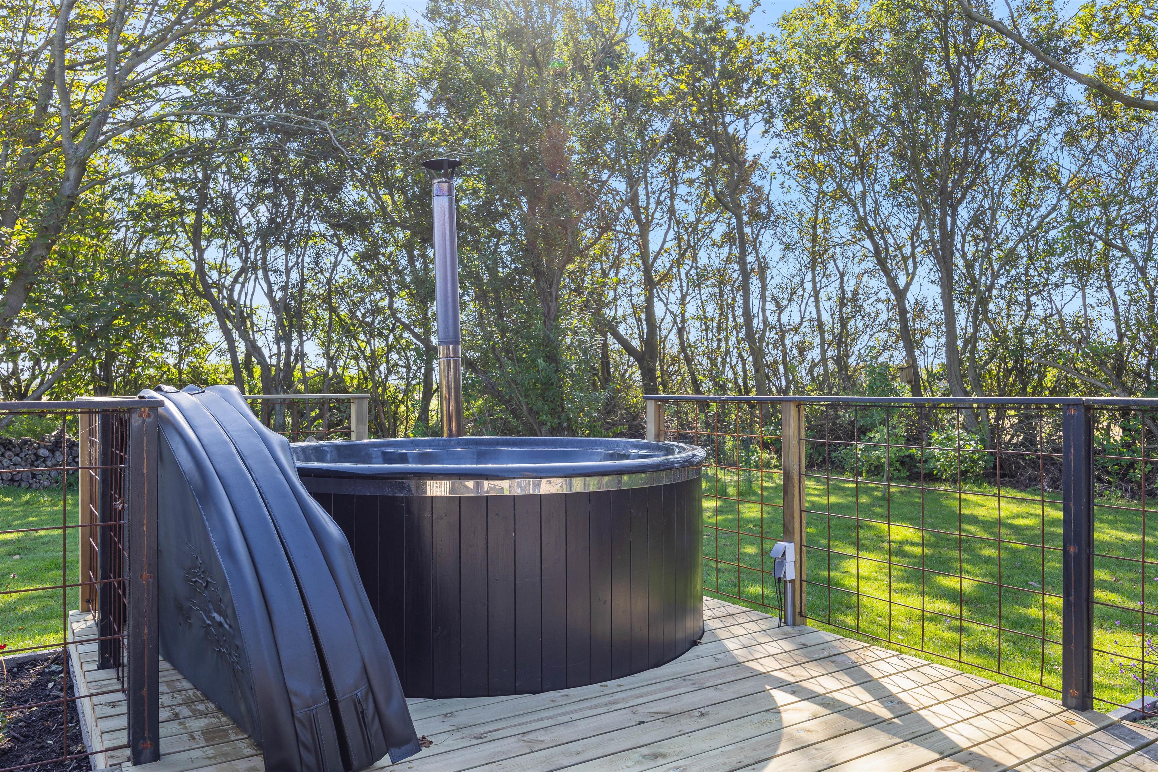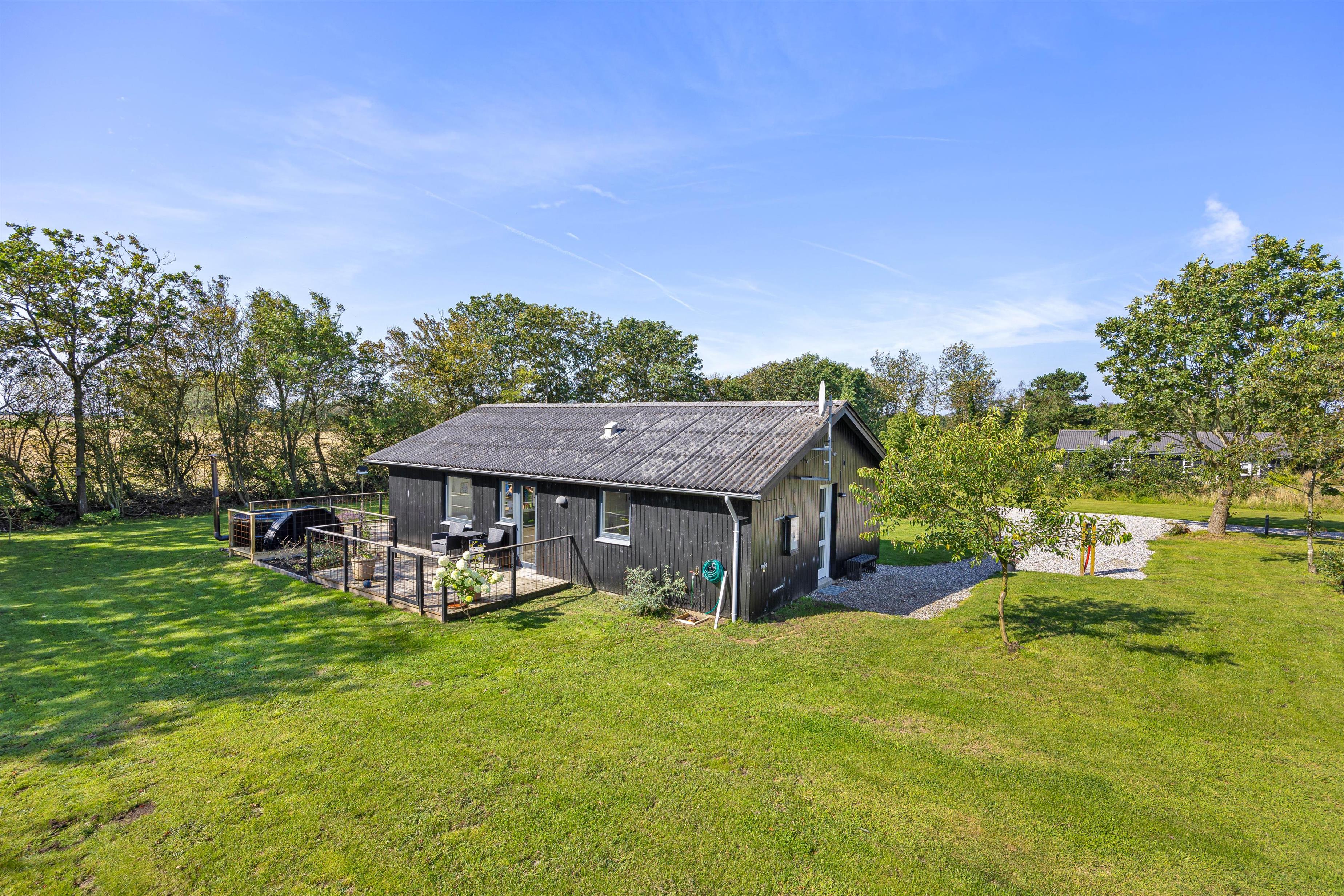 På den lukkede træterrasse står havemøbler og grill klar, når solen kigger frem i de varme måneder. Her kan I trygt lade børnene få fri leg, imens træer og buske sørger for god afskærmning, så I kan sidde i fred og ro og nyde morgenkaffen og den friske luft. På de lidt køligere dage, eller sene aftener er det oplagt at hoppe i badetøjet, og hoppe en tur i vildmarksbadet. Her har I mulighed for at nyde vandets varme, slappe helt af og bare nyde, at I har ferie.
