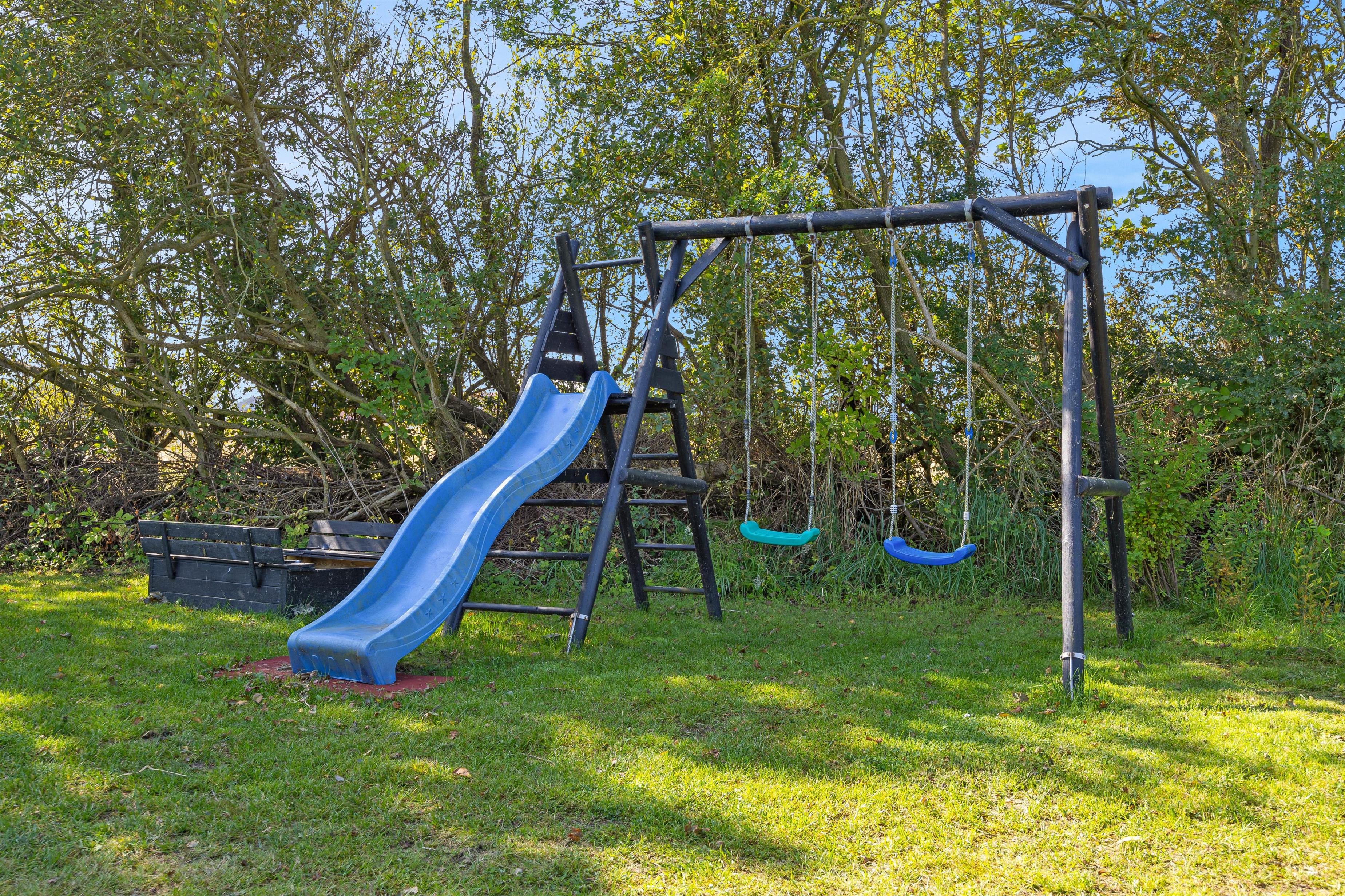 Dine børn kan lege og løbe rundt, så meget de vil, på den store naturgrund. En gynge, en sandkasse og endda en trampolin giver masser af sjov og motion. I mellemtiden kan I sætte jer godt til rette i haven og nyde freden og roen.