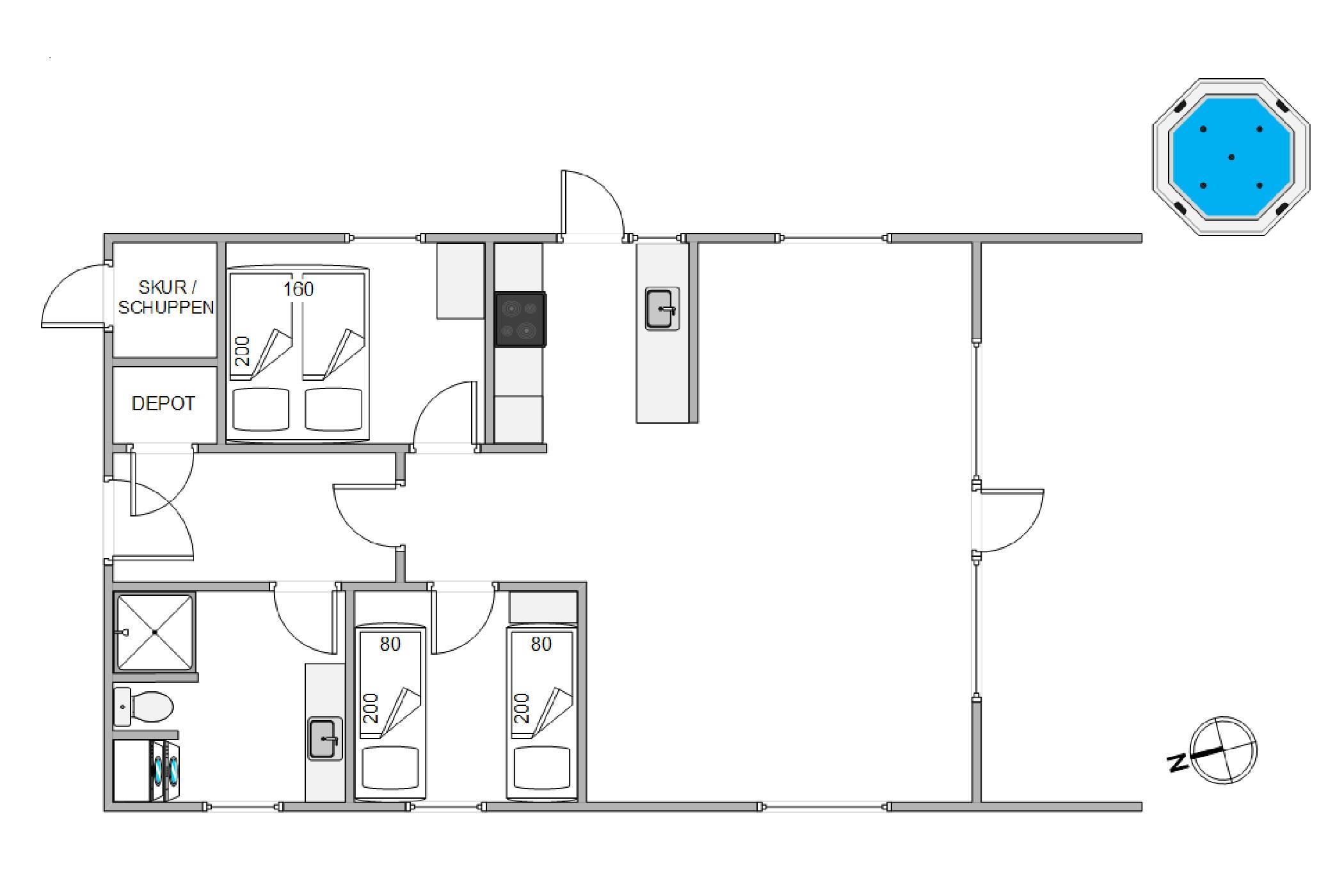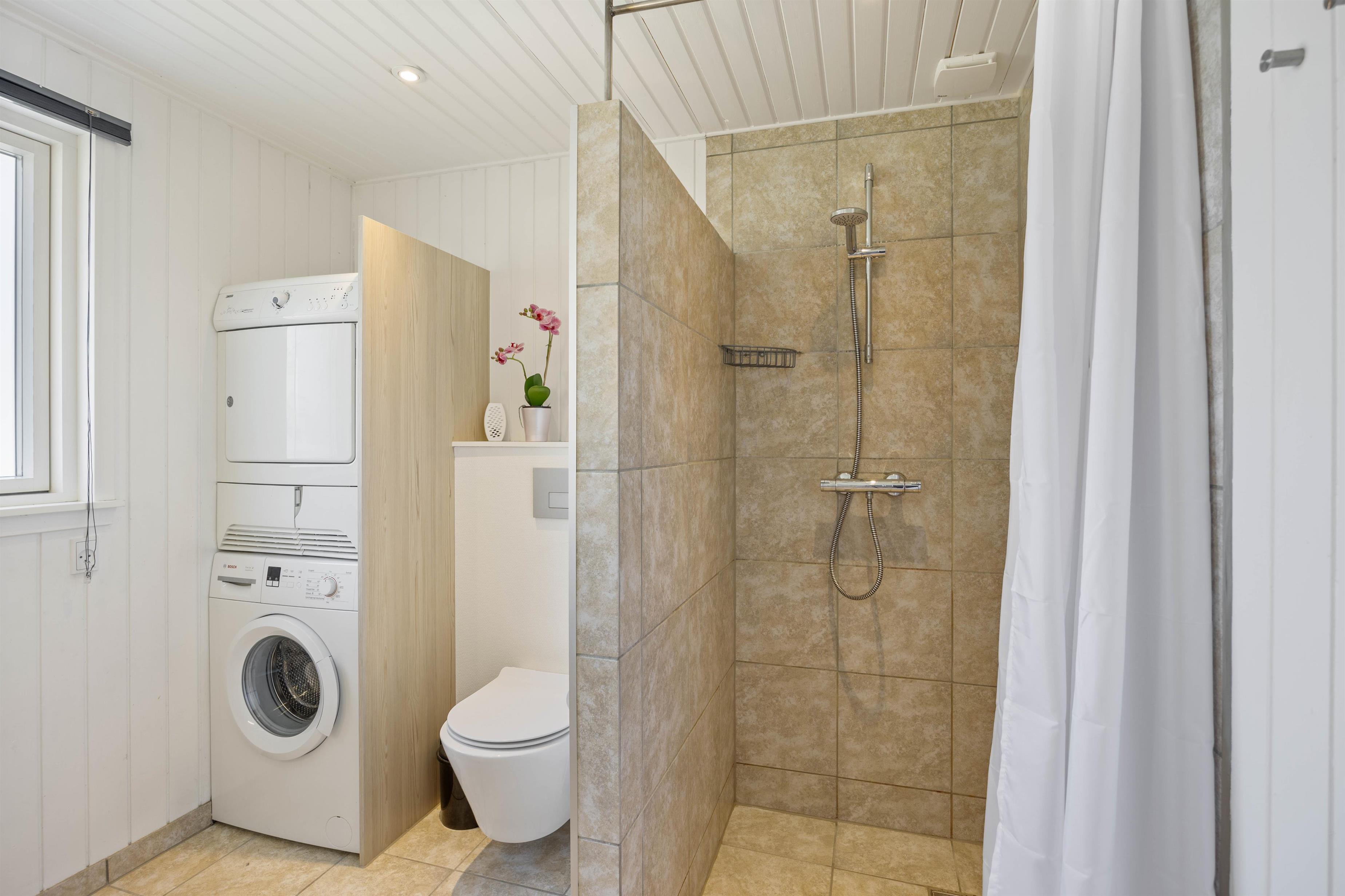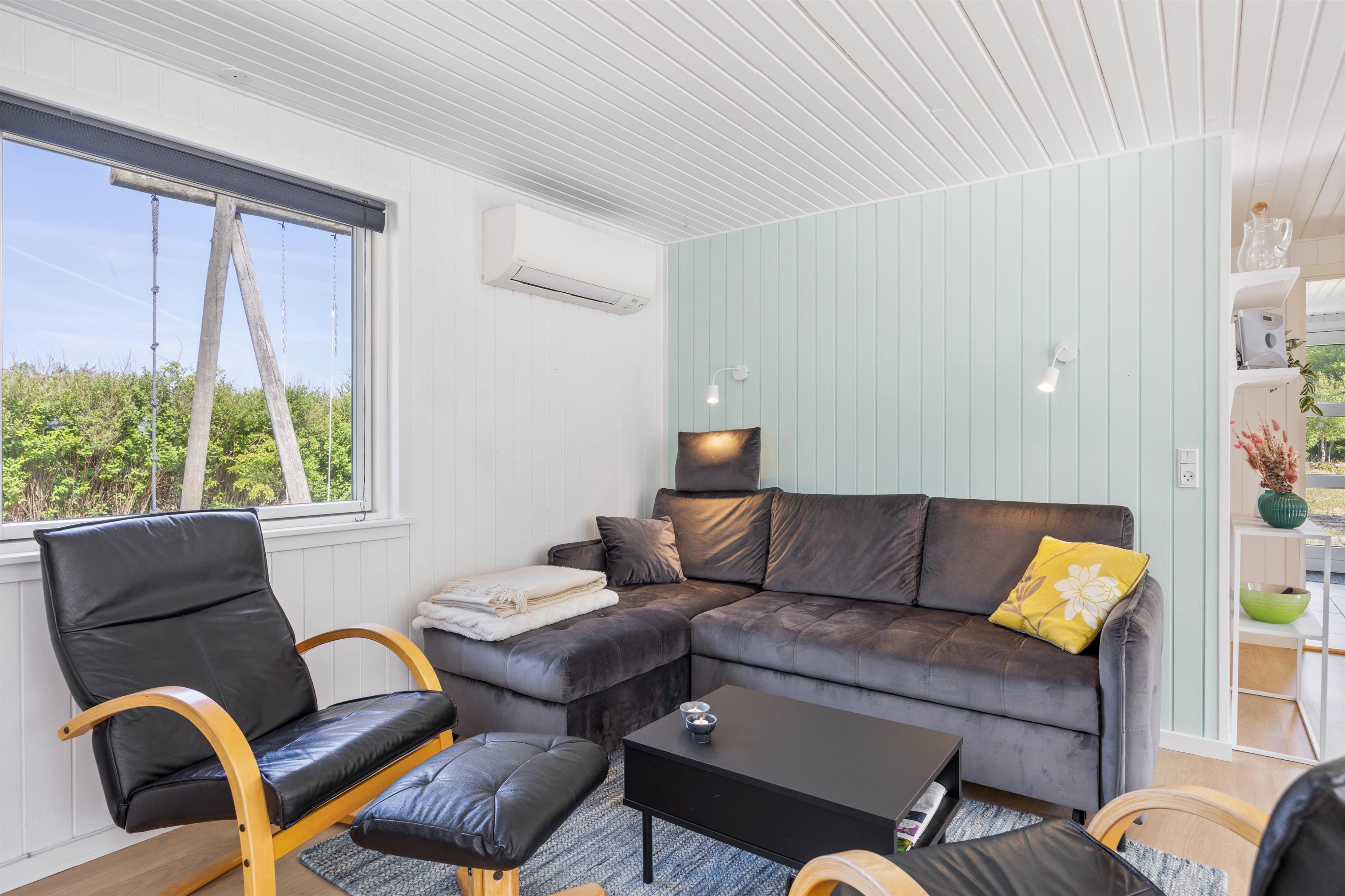 Feriehuset har to smagfuldt indrettede soveværelser. Det ene soveværelse har en dobbeltseng og det andet værelse er har to enkeltsenge. Badeværelset er udstyret med gulvvarme, som sikrer en behagelig følelse af velvære selv på køligere dage. En energibesparende luft-til-luft varmepumpe sørger for den rette rumtemperatur og et behageligt indeklima.