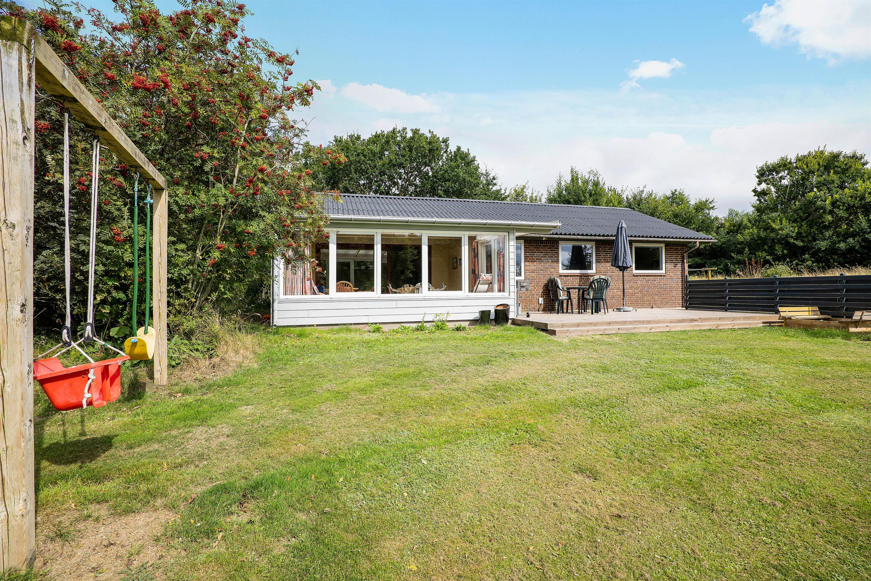 Et sommerhus med plads til børneleg i sandkasse og på gyngestativ