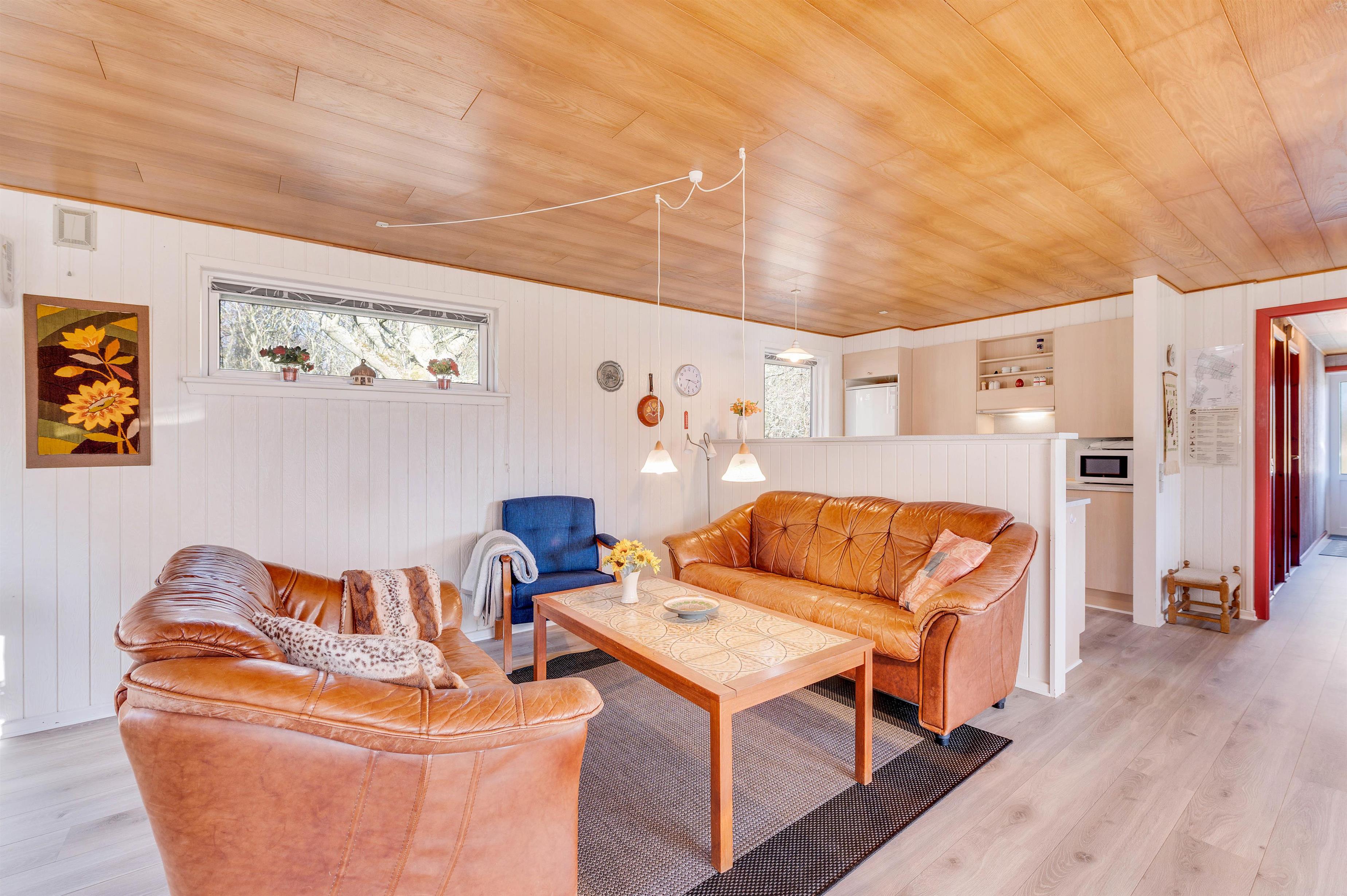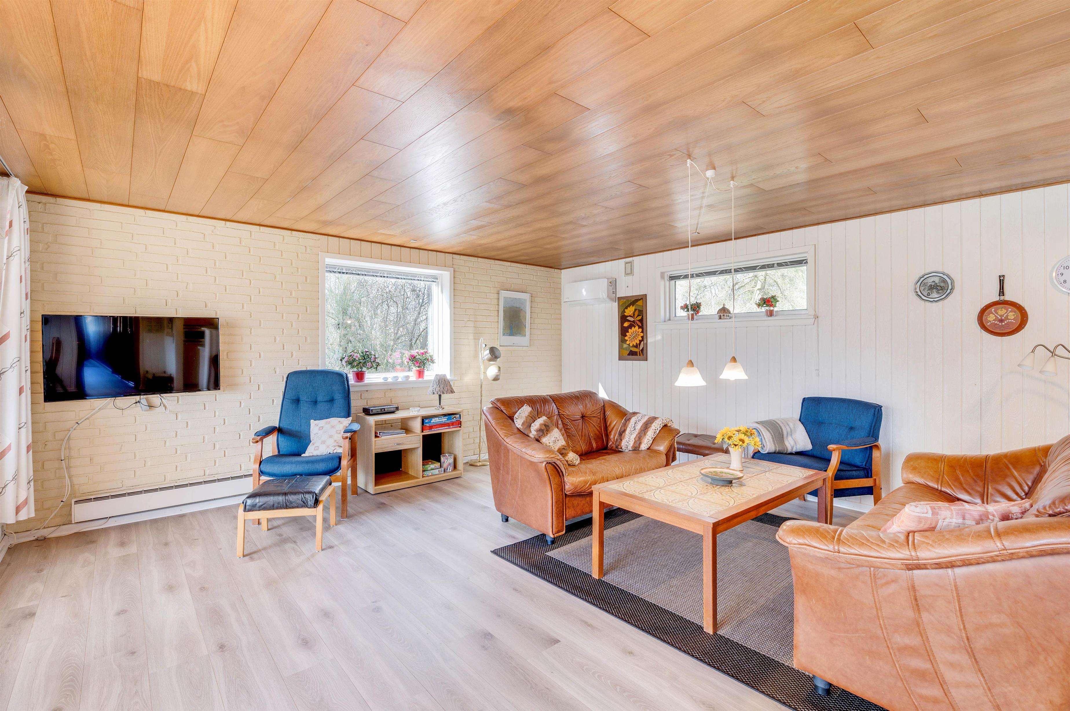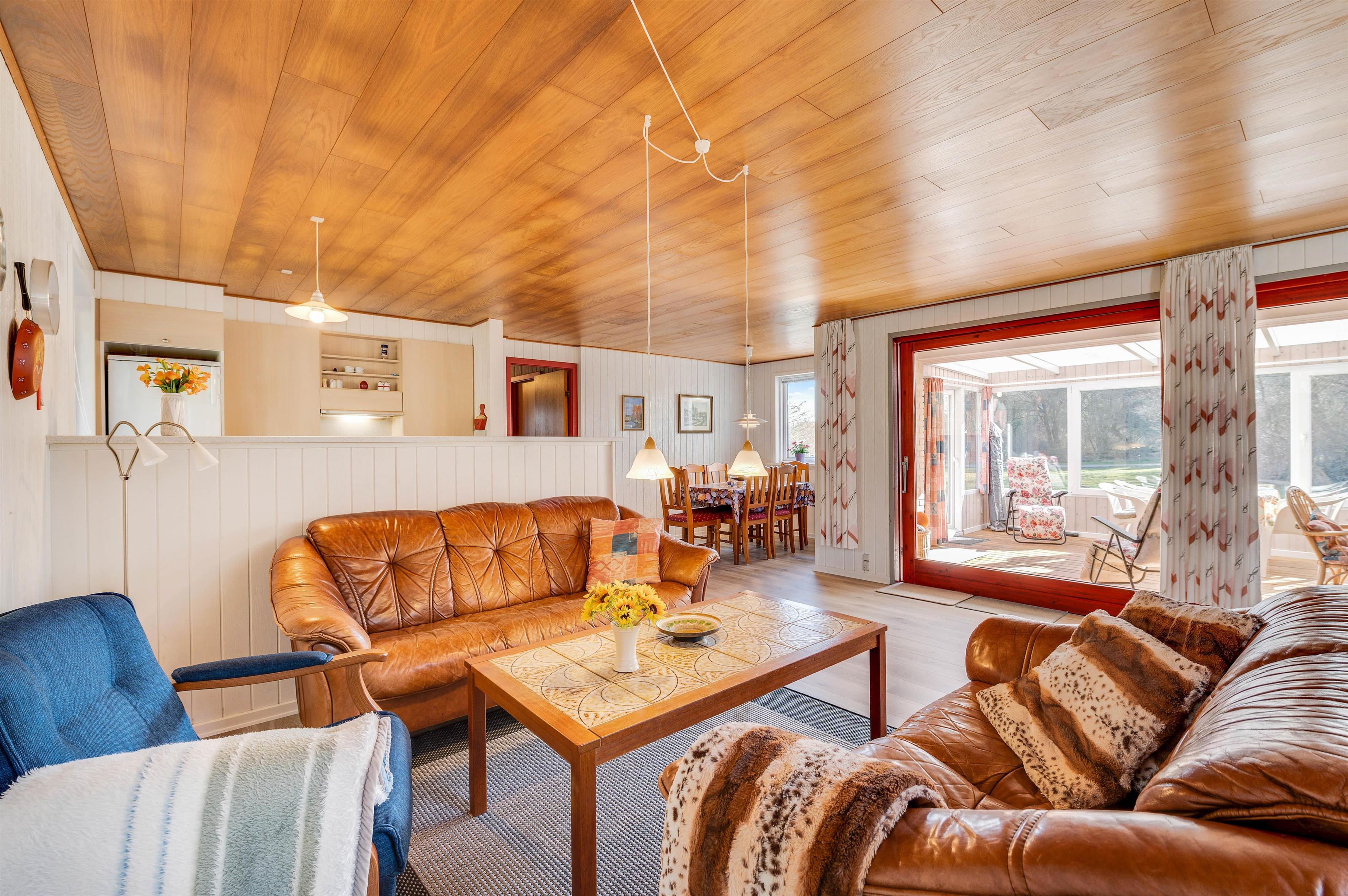 Det charmerende sommerhus i Lodbjerg Hede er indbegrebet af hyggelig sommerhusstemning. Her kan I slappe af i de bløde sofaer, der kalder på at blive indtaget til boglæsning eller en lille lur. Sofagruppen har direkte udsyn til den hyggelige udestue, der er ideel til at nyde morgenens første kop kaffe.
