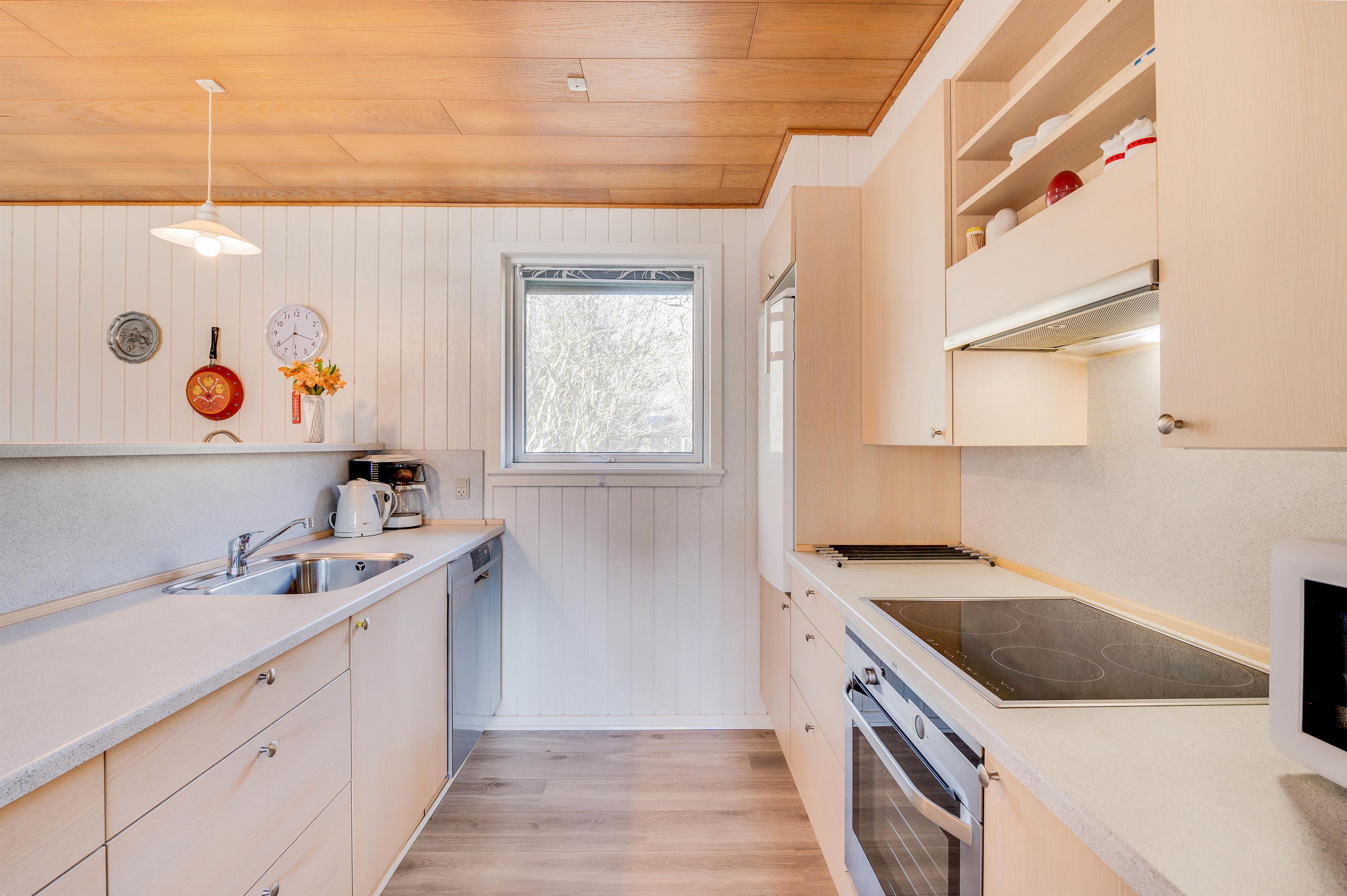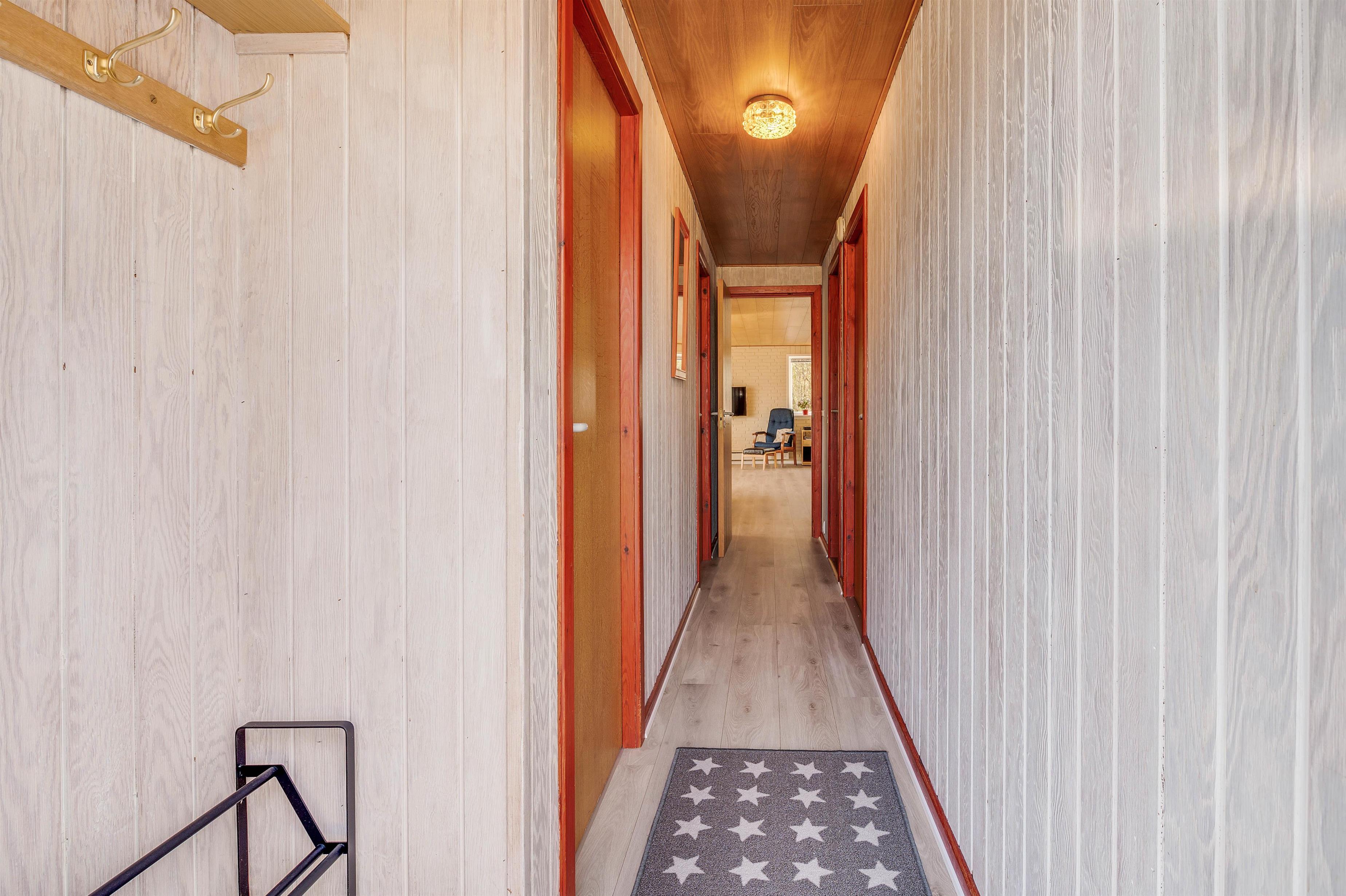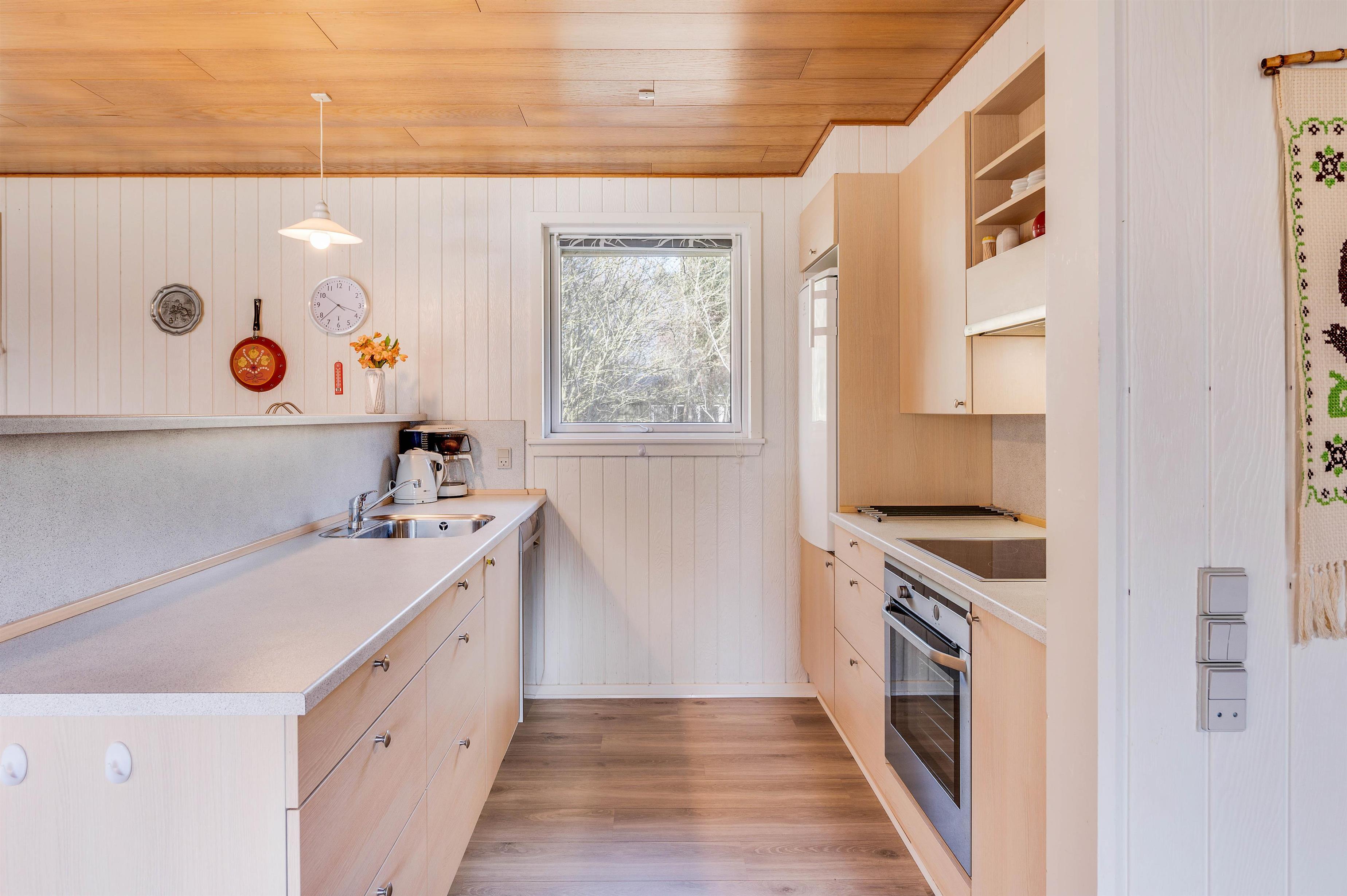 Vægge såvel som loft er beklædt med paneler, der bidrager til en rolig og huleagtig atmosfære, som vil bekomme de fleste vel. Huset føles trygt og roligt, og jeres puls vil formentlig dykke et par slag under jeres ophold her.
